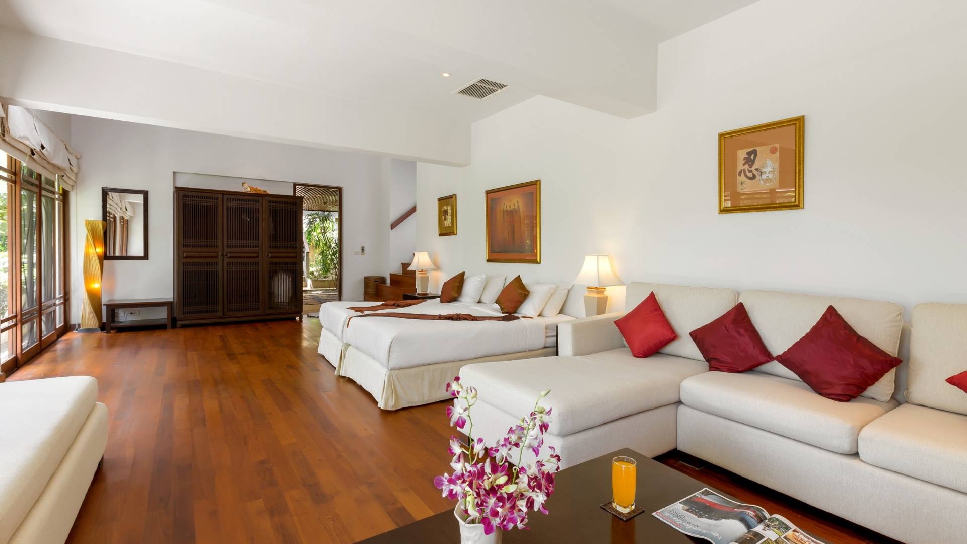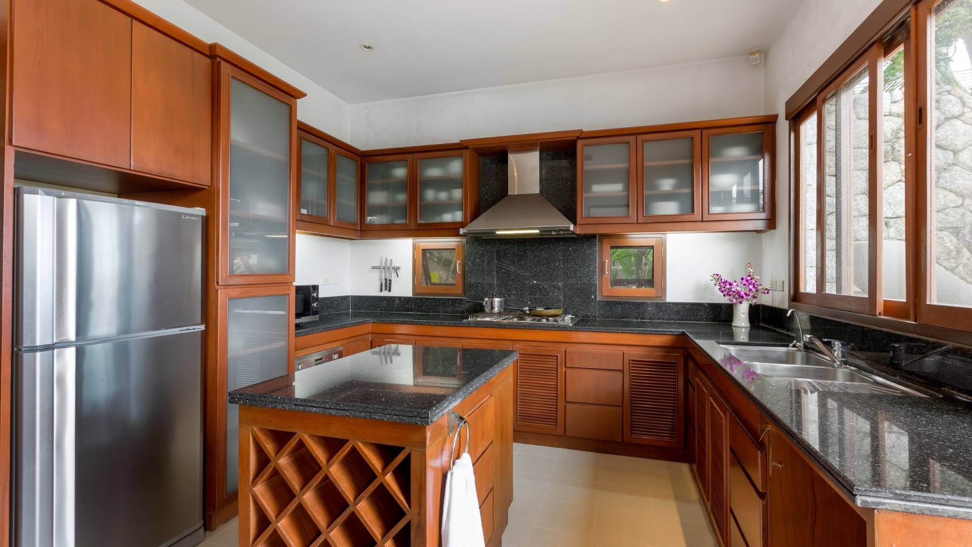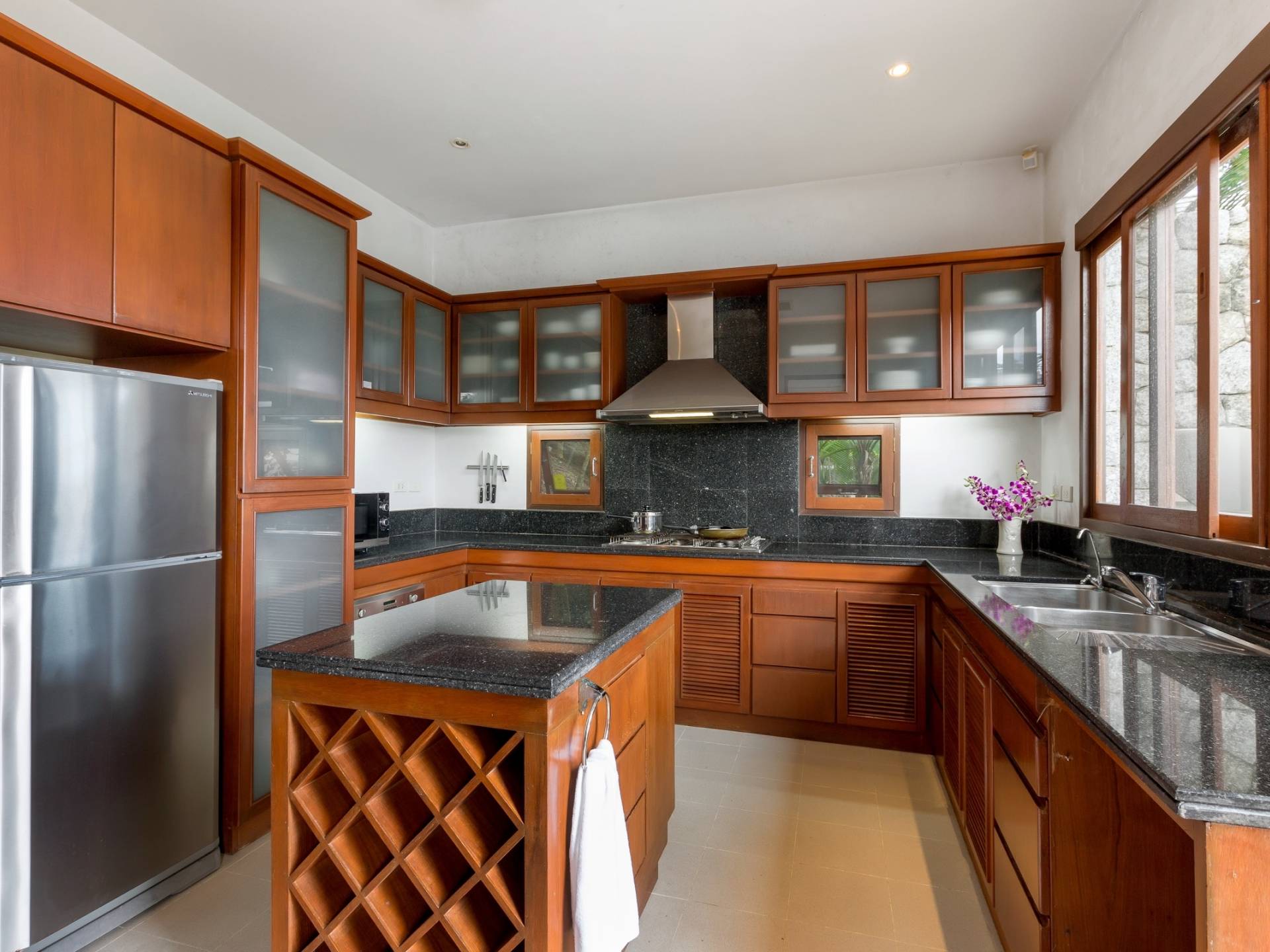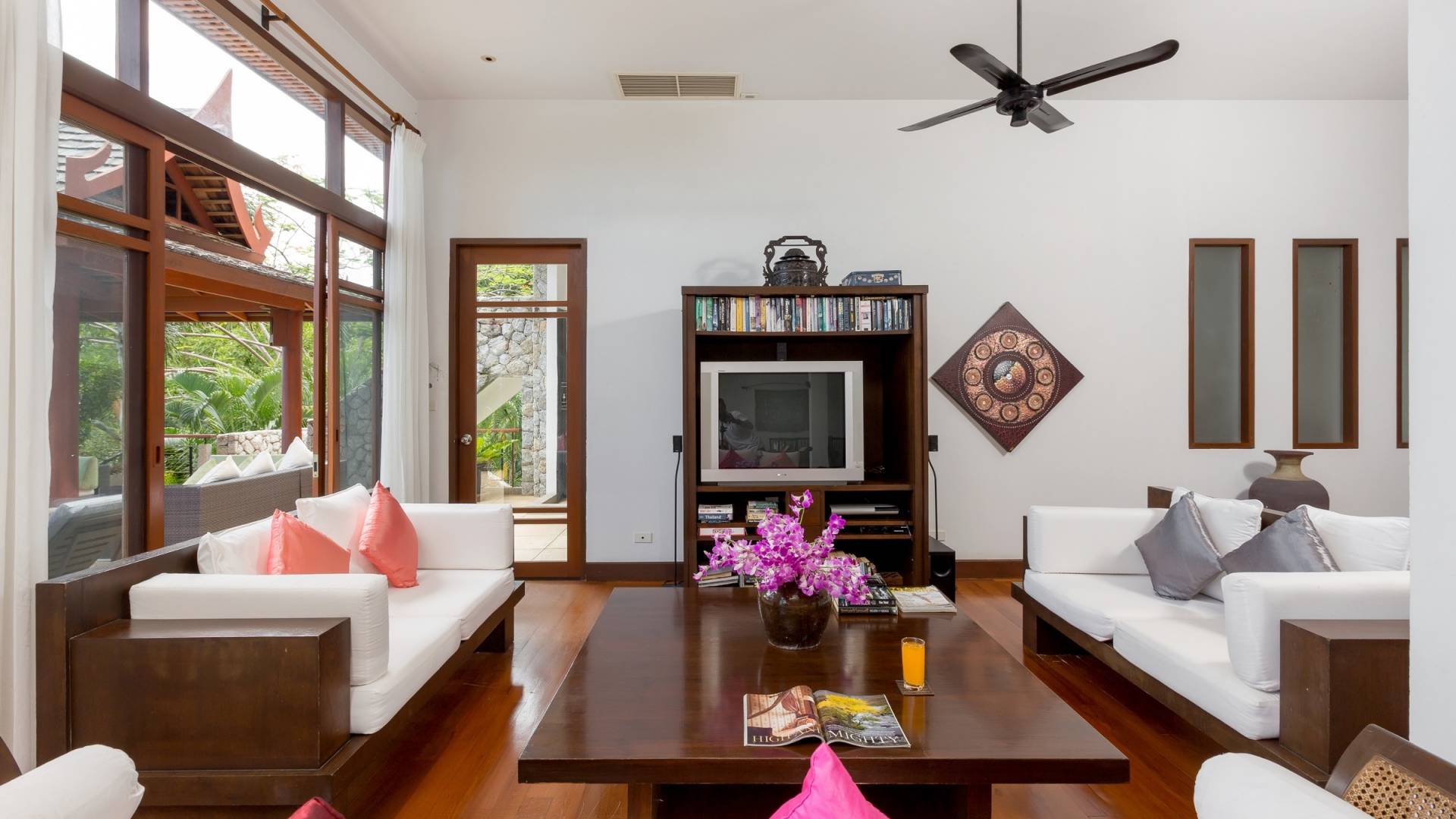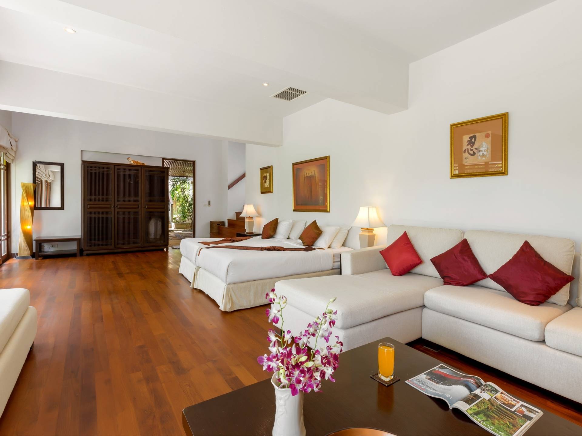 Un étage supplémentaire comprend une grande chambre/salle polyvalente idéale pour les enfants et bénéficiant d'une vue sur la mer et dispose d'une petite terrasse ainsi que d'une salle de bain privée (pas attenante). Les lits jumeaux peuvent être rapprochés pour former un lit king-size et deux lits pliants sont disponibles pour les enfants supplémentaires. Le grand espace de vie avec un plafond exceptionnellement haut et une étendue de verre dans les portes s'ouvre sur la terrasse et donne une merveilleuse sensation d'espace et de lumière. Une grande table à manger à une extrémité peut facilement accueillir 10 personnes. Le coin salon comprend des canapés et des chaises confortables disposés autour d'une grande table basse. Un système audio Bose télécommandé à la pointe de la technologie est relié au home cinéma, avec une télévision satellite grand écran avec une large gamme de chaînes, DVD, magnétoscope et CD. L'éclairage informatisé spécialisé vous permet de créer la bonne ambiance à toute heure du jour ou de la nuit sur simple pression d'un bouton. La climatisation entièrement contrôlable vous permet d'obtenir la température idéale, bien qu'avec toutes les portes ouvertes, vous puissiez profiter d'une brise merveilleuse. Le visiophone permet ici de parler aux visiteurs à la porte et de l'ouvrir pour eux. Juste à côté, la cuisine de style occidental entièrement équipée est le quartier de la bonne. Conçu pour donner une intimité totale aux invités, cet espace dispose d'une cuisine de bonne et d'une buanderie séparée.