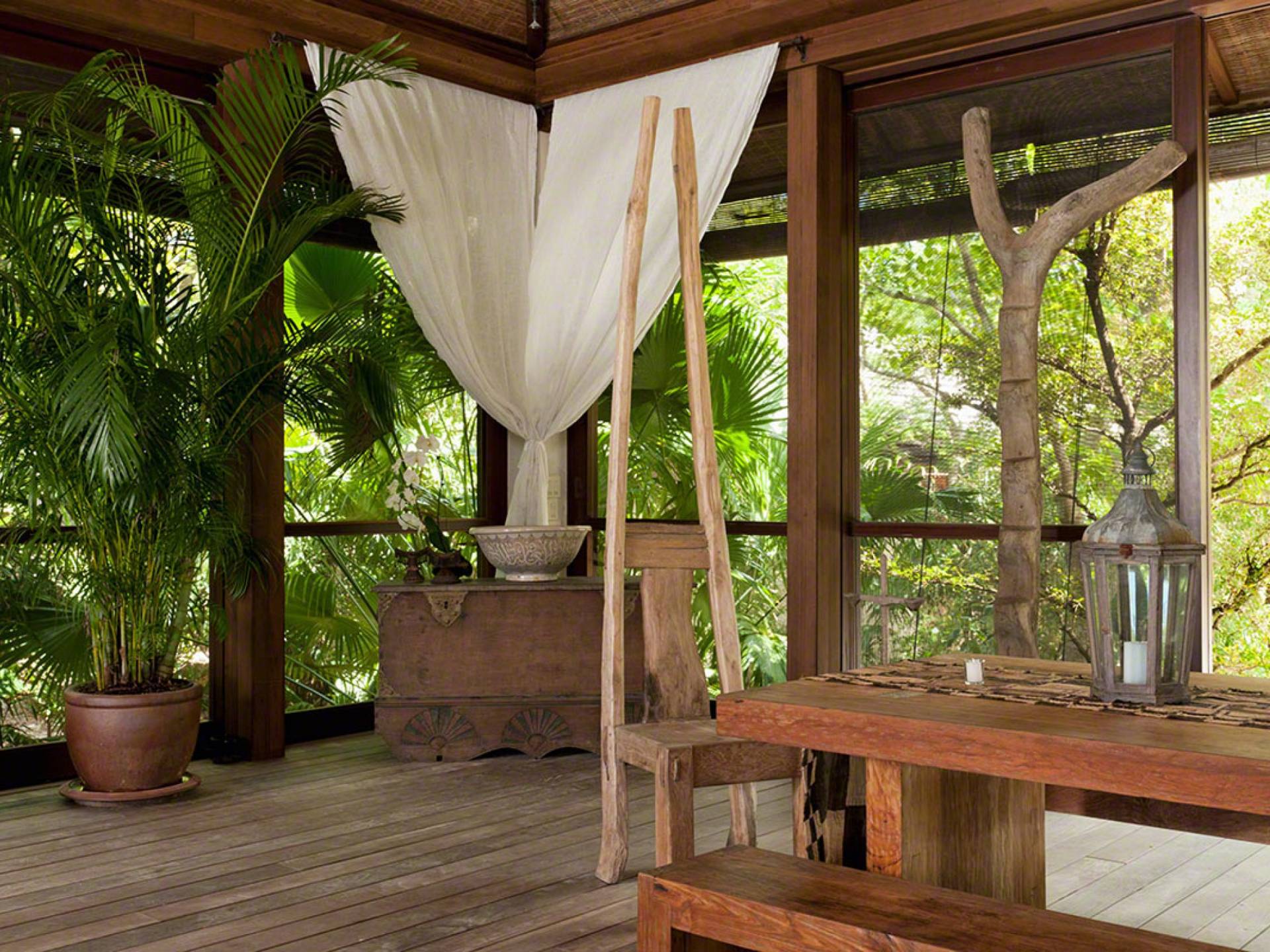 La maison principale du sanctuaire est une villa insulaire sereine avec près de 9 000 pieds carrés d'espace au sol. L'intérieur a été créé par la célèbre designer new-yorkaise Donna Karan et présente des murs lambrissés de cèdre, des meubles en teck, des sols en noyer et des salles de bains en pierre calcaire, ainsi que des antiquités et des ornements des voyages de Karan.
