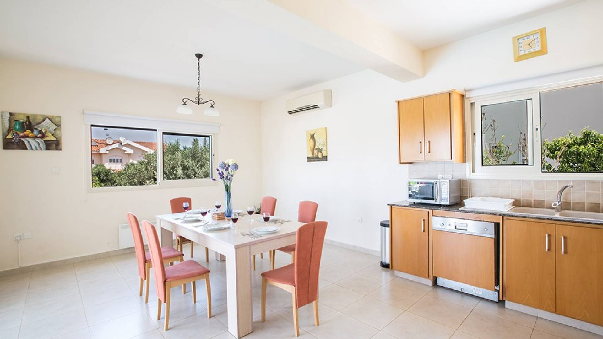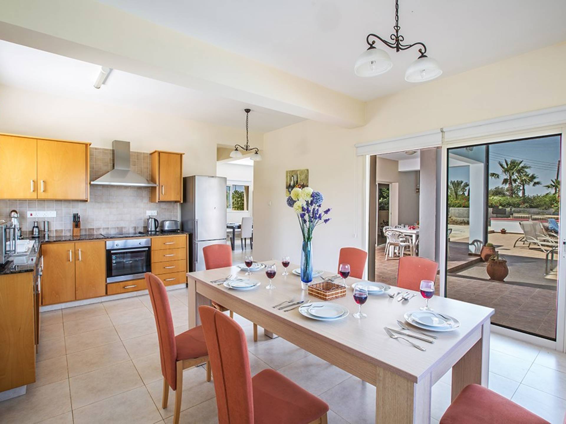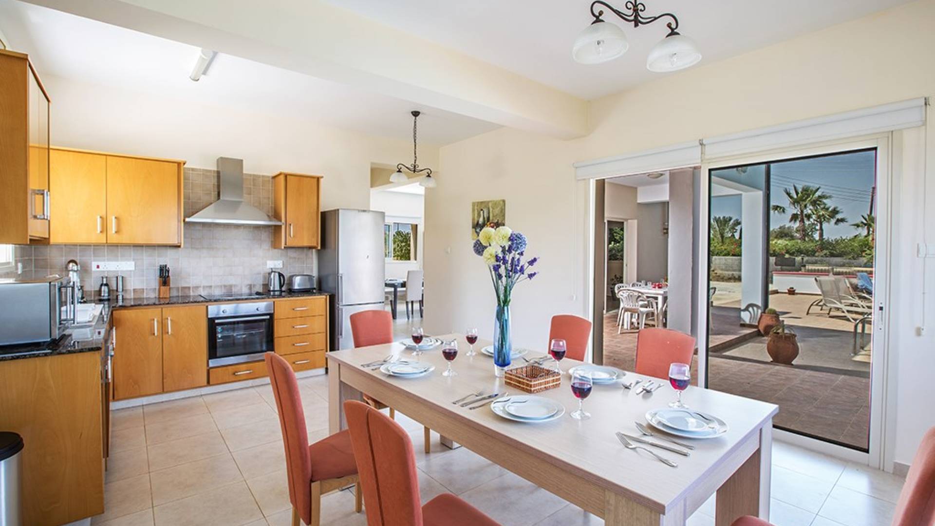 Entrando nella villa, troverai un ampio soggiorno, una zona pranzo e una cucina separata con una zona pranzo aggiuntiva e ampie porte finestre che conducono al giardino. Il soggiorno dispone di un comodo divano ad angolo in pelle, TV widescreen con satellite, caminetto e porte che conducono al giardino e alla piscina. La sala da pranzo qui può ospitare 6 persone. L'ampia cucina è dotata di tutti gli elettrodomestici necessari per il vostro confortevole soggiorno con angolo cottura e c'è un tavolo da pranzo anche qui per ospitare 6 persone. Troverai anche un W/C su questo piano e un piccolo ripostiglio con lavatrice