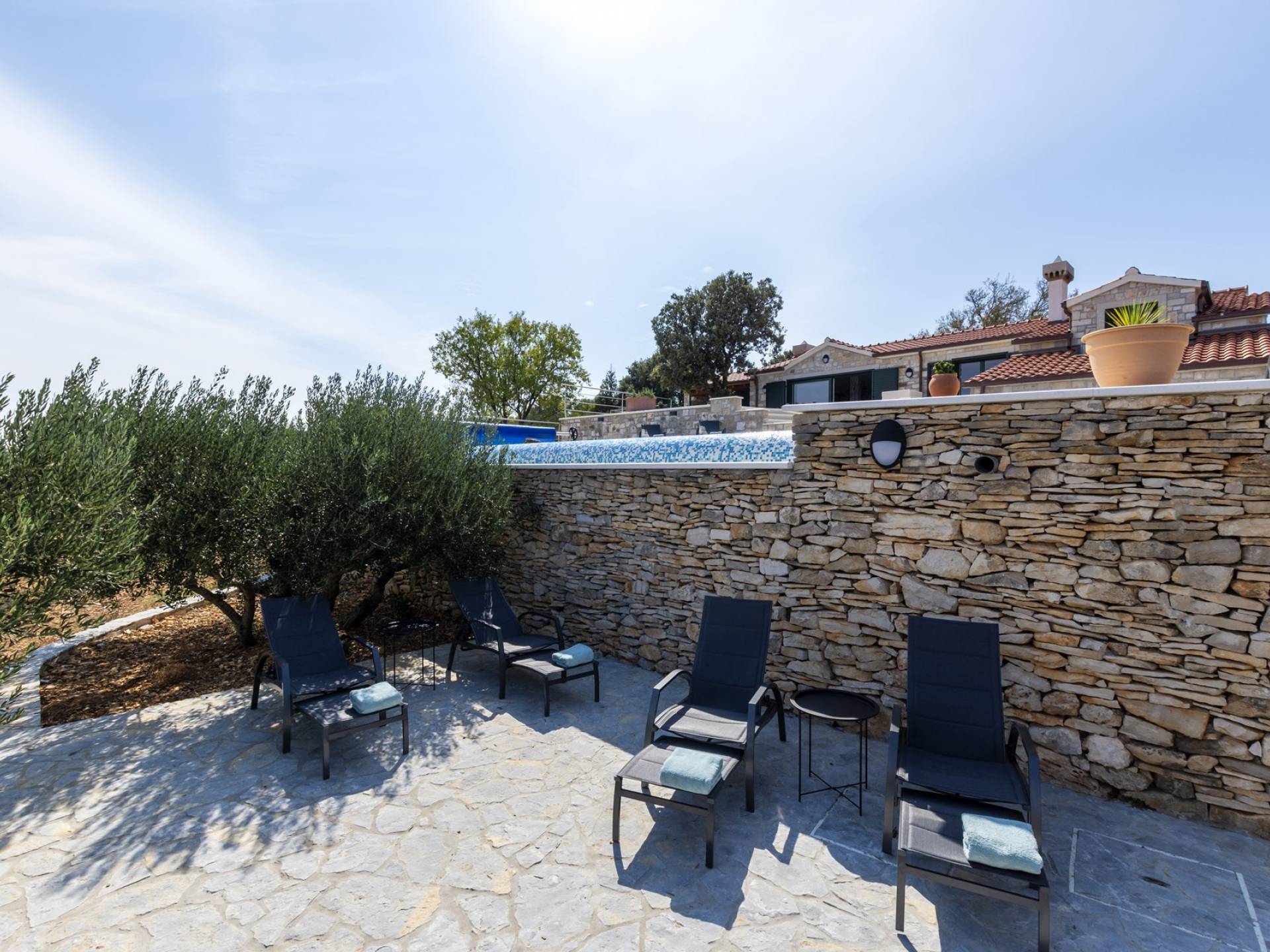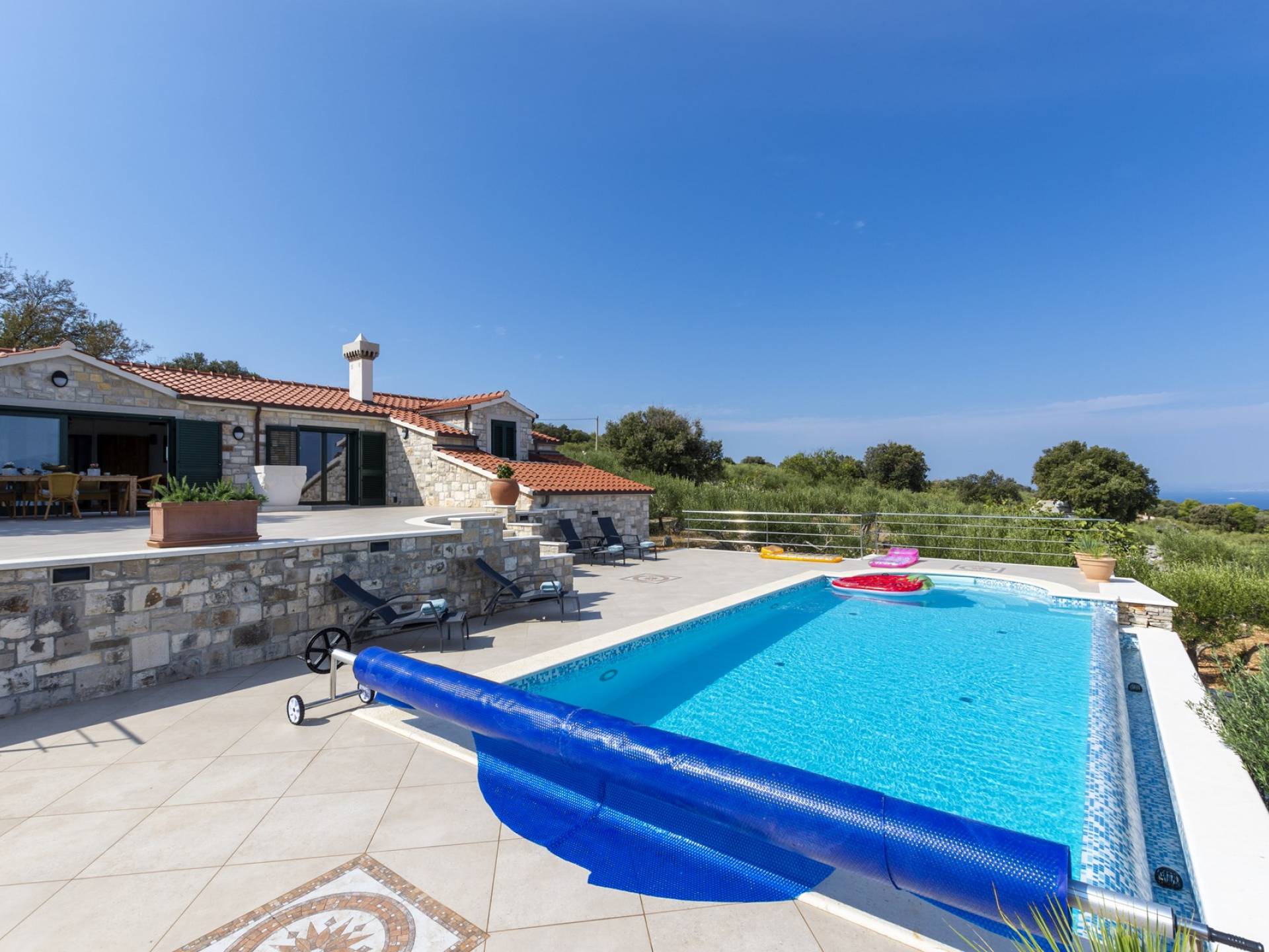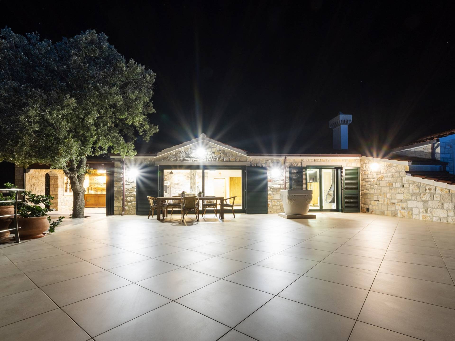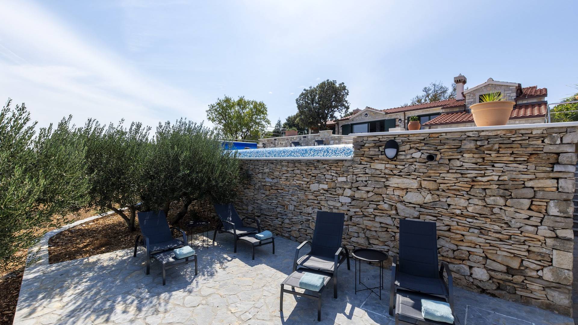 L'esterno della villa presenta una fusione equilibrata tra l'ambiente naturale e l'architettura mediterranea. La villa si trova in una posizione tranquilla e silenziosa, circondata da un bellissimo giardino paesaggistico e uliveti, quindi puoi rilassarti completamente mentre nuoti e prendi il sole in una piscina privata della villa. Per un totale edonismo, c'è una cucina estiva all'aperto con zona pranzo e salotto a tua disposizione.
