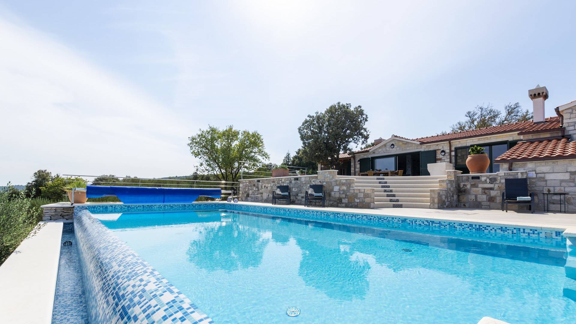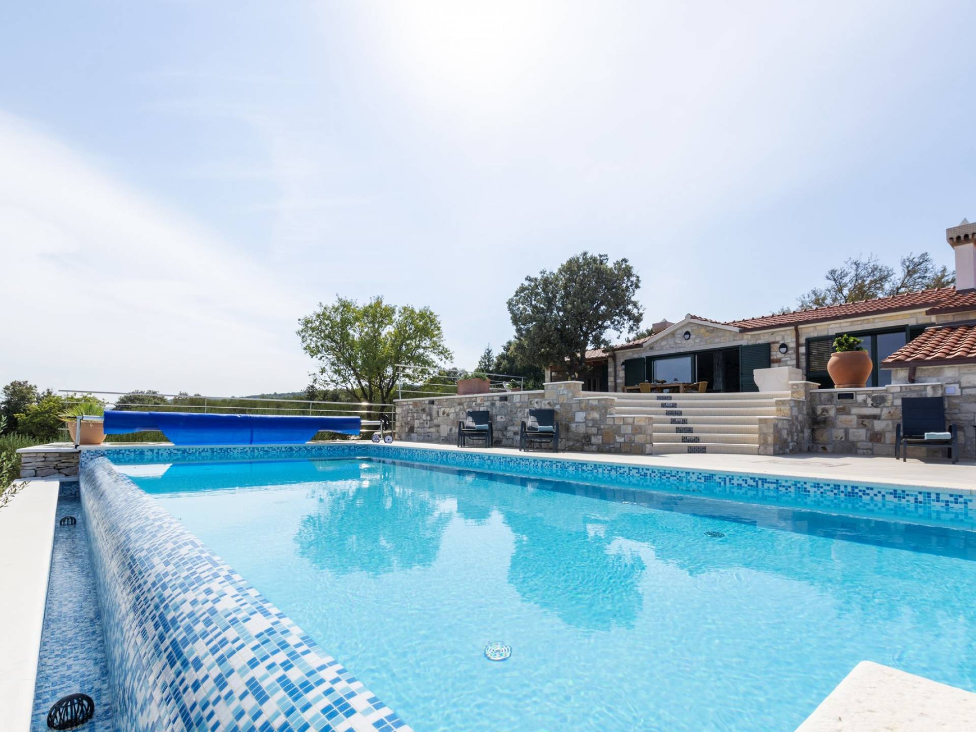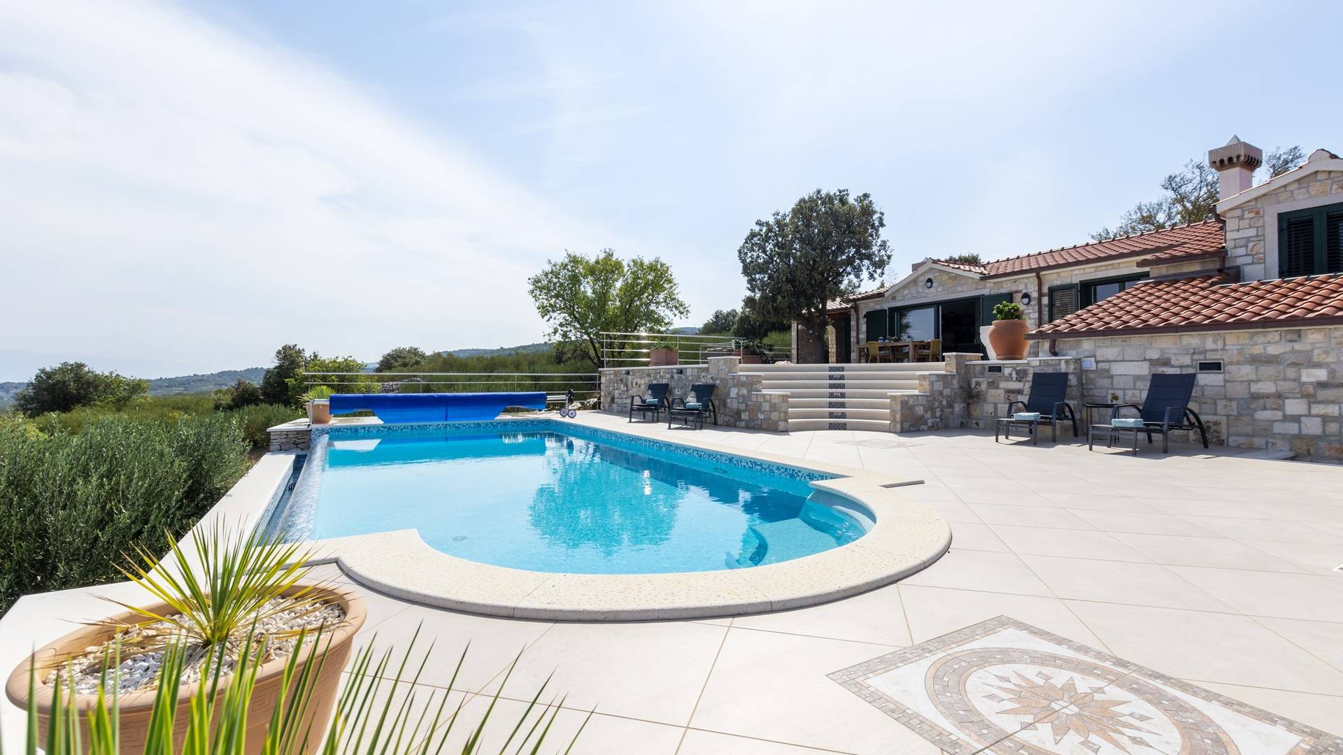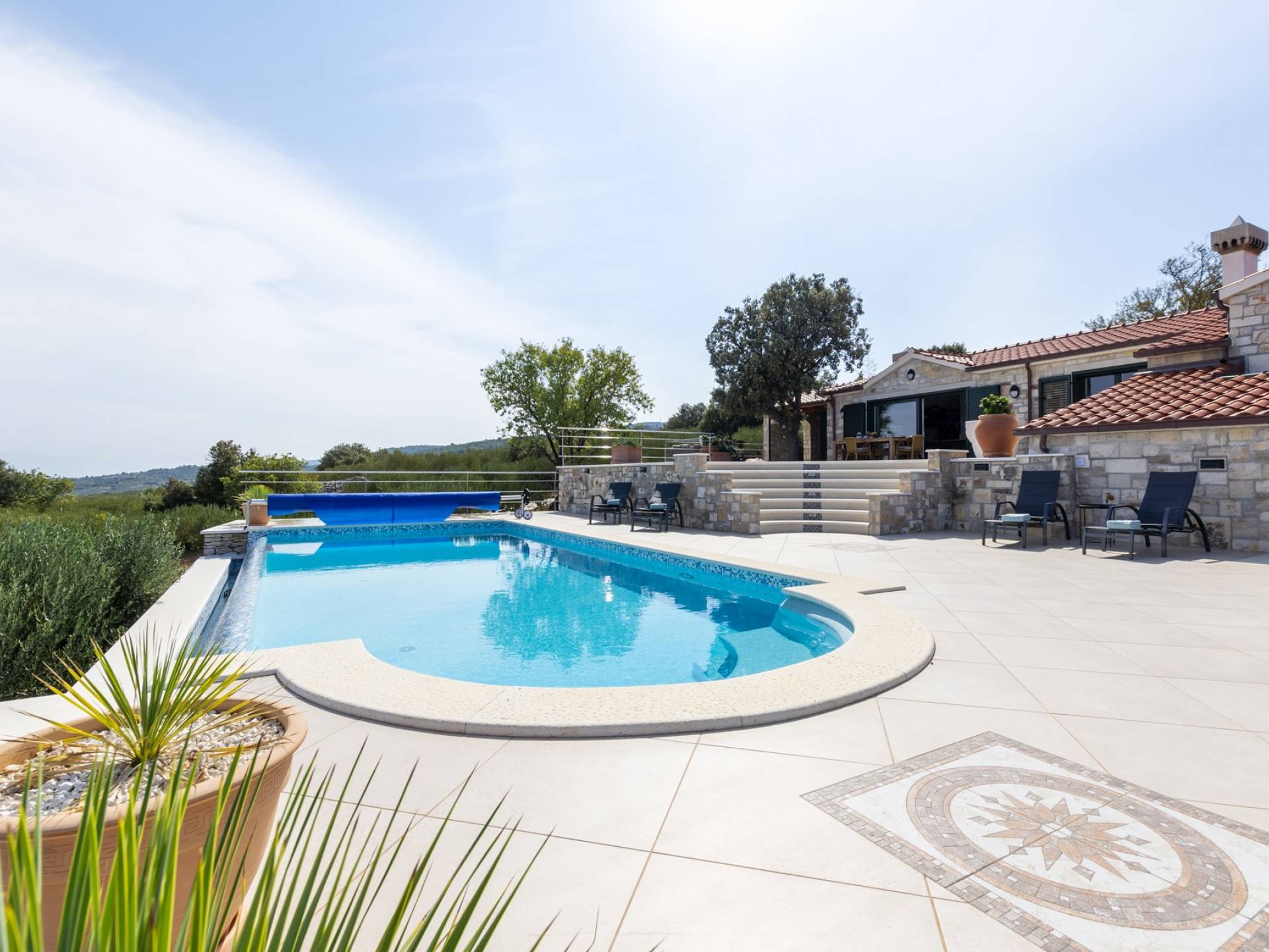 L'esterno della villa presenta una fusione equilibrata tra l'ambiente naturale e l'architettura mediterranea. La villa si trova in una posizione tranquilla e silenziosa, circondata da un bellissimo giardino paesaggistico e uliveti, quindi puoi rilassarti completamente mentre nuoti e prendi il sole in una piscina privata della villa. Per un totale edonismo, c'è una cucina estiva all'aperto con zona pranzo e salotto a tua disposizione.