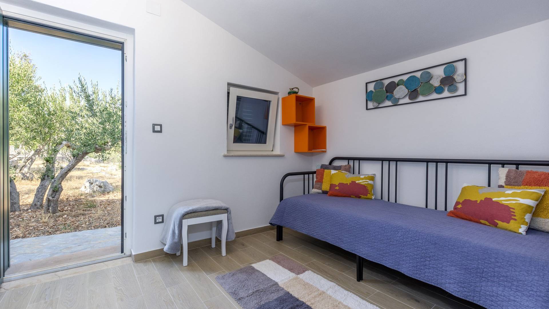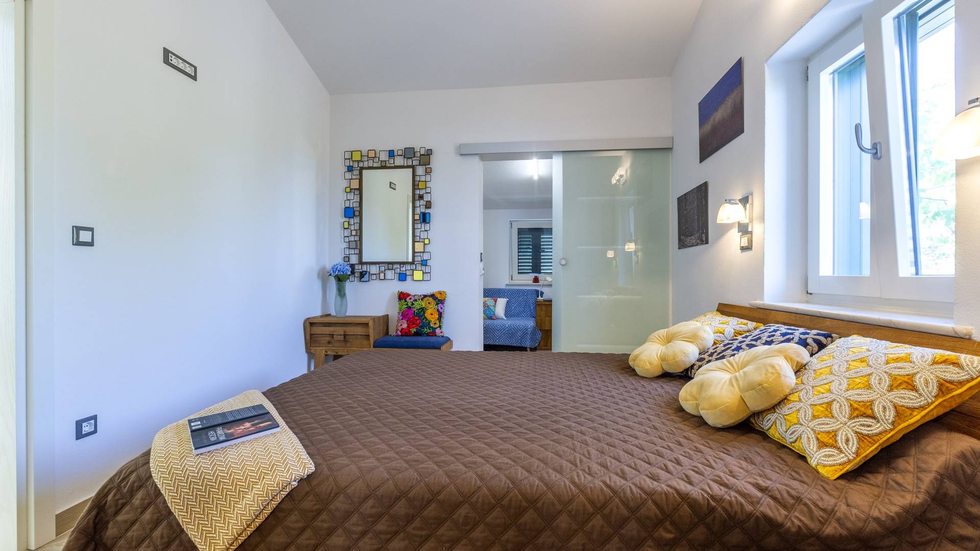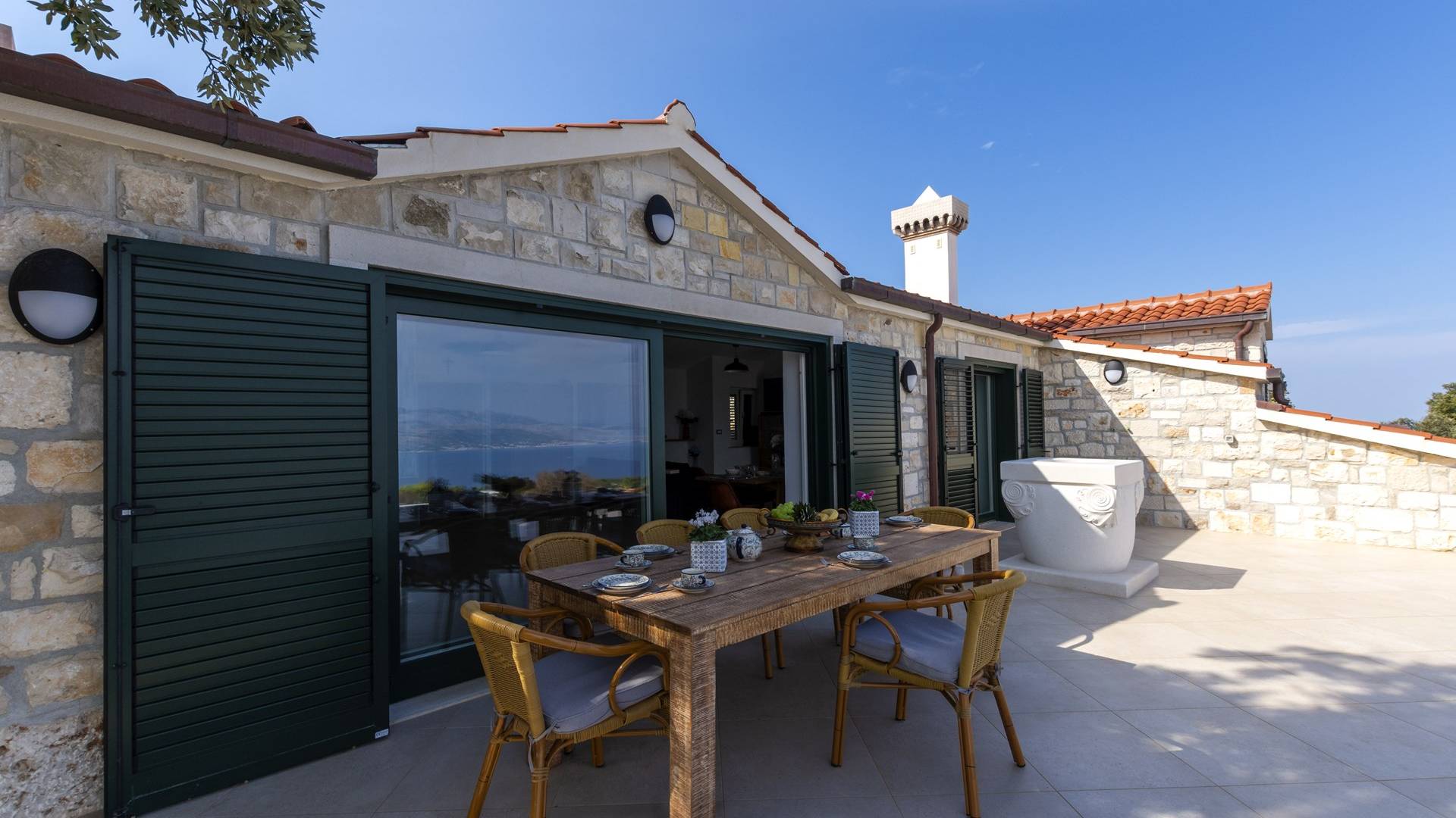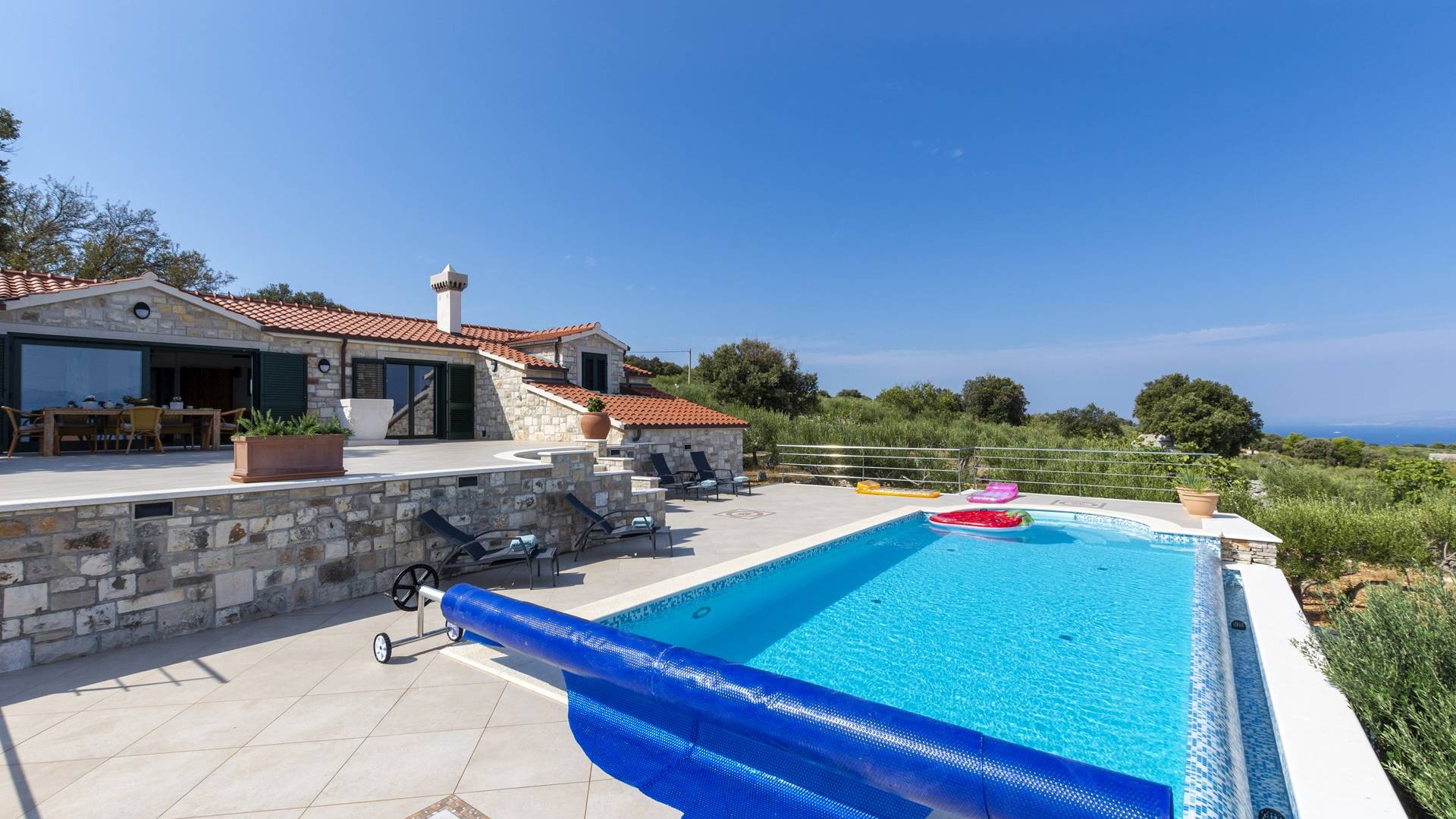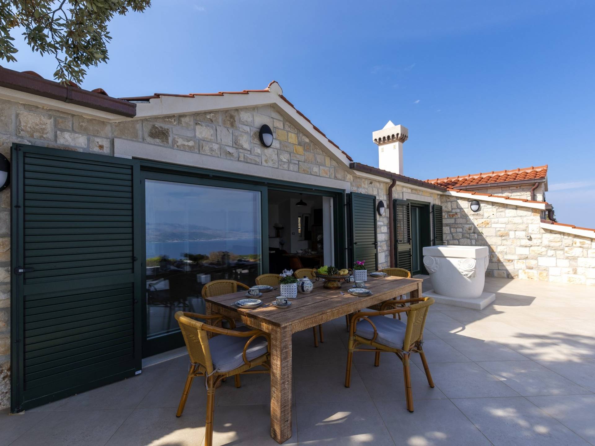 L'interno di questa affascinante villa è una perfetta miscela di lusso moderno con un tocco di elementi rustici. Questa villa a un piano comprende una cucina open space con sala da pranzo e soggiorno con vista sulla splendida natura dell'isola di Brač e sul mare. Dotata di vari elettrodomestici di alta qualità, preparare i pasti in questa cucina sarà un'esperienza gioiosa e creativa. Ci sono anche due camere matrimoniali arredate con gusto, con letti aggiuntivi e due bagni. La restante camera matrimoniale, bagno e spogliatoio si trovano al piano seminterrato con uscita su un bellissimo giardino.