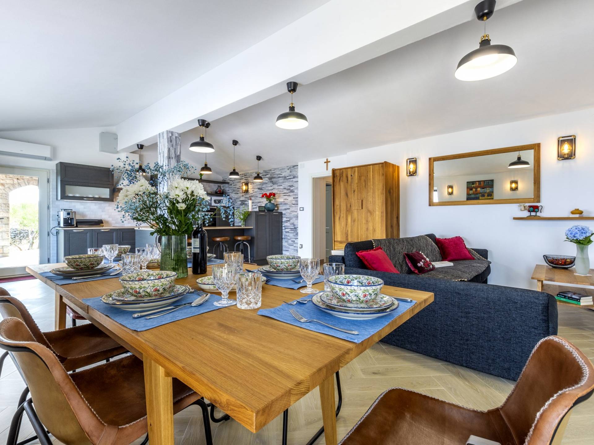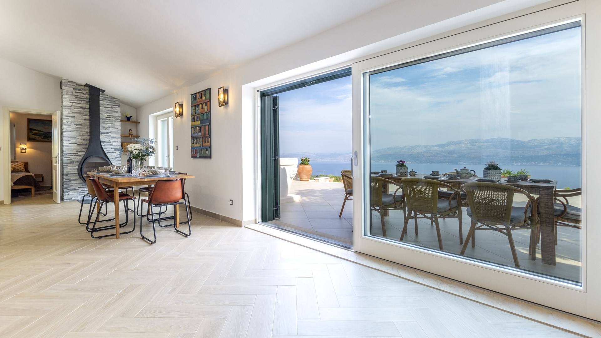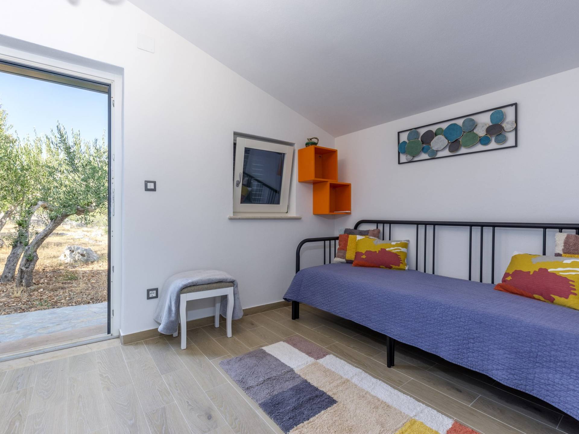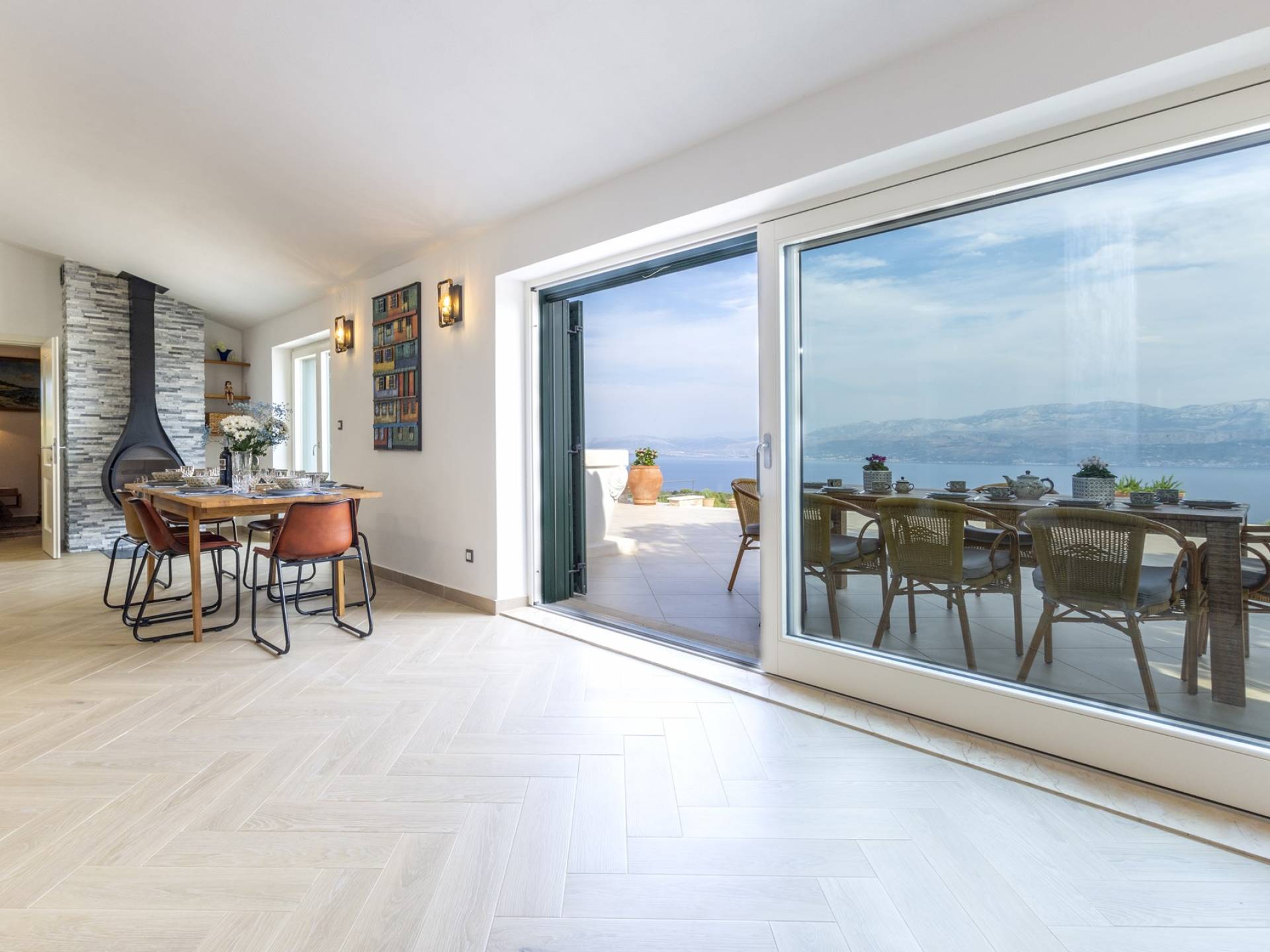 L'interno di questa affascinante villa è una perfetta miscela di lusso moderno con un tocco di elementi rustici. Questa villa a un piano comprende una cucina open space con sala da pranzo e soggiorno con vista sulla splendida natura dell'isola di Brač e sul mare. Dotata di vari elettrodomestici di alta qualità, preparare i pasti in questa cucina sarà un'esperienza gioiosa e creativa. Ci sono anche due camere matrimoniali arredate con gusto, con letti aggiuntivi e due bagni. La restante camera matrimoniale, bagno e spogliatoio si trovano al piano seminterrato con uscita su un bellissimo giardino.