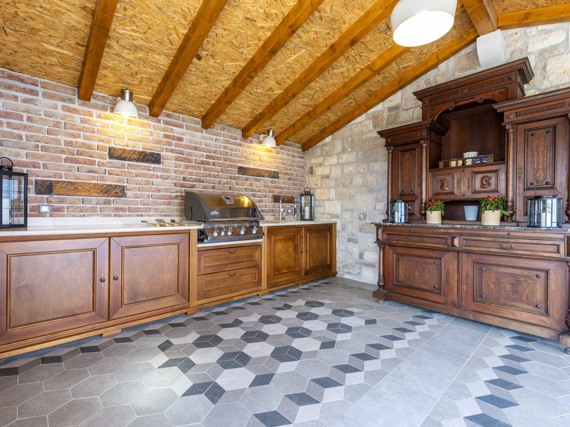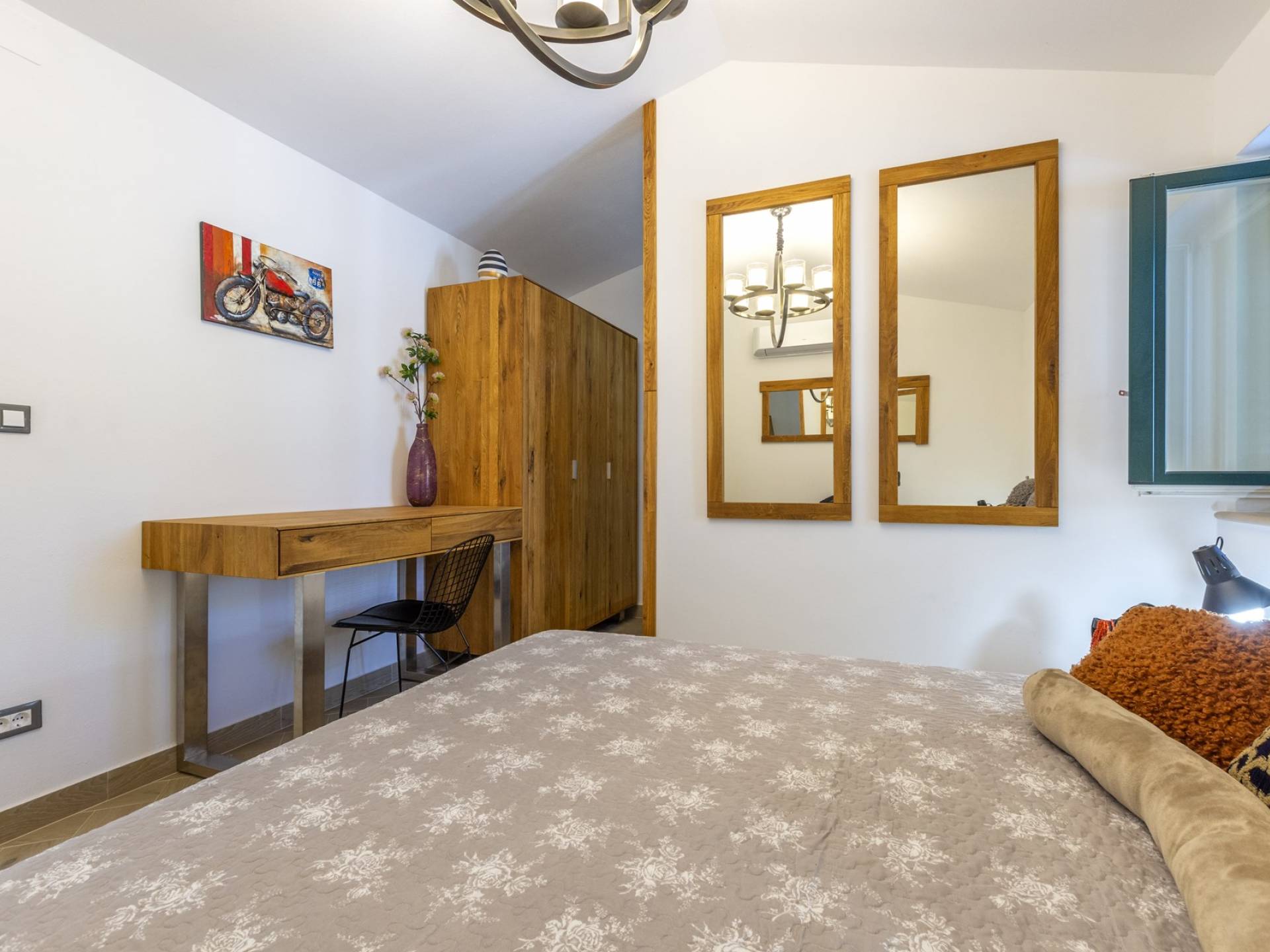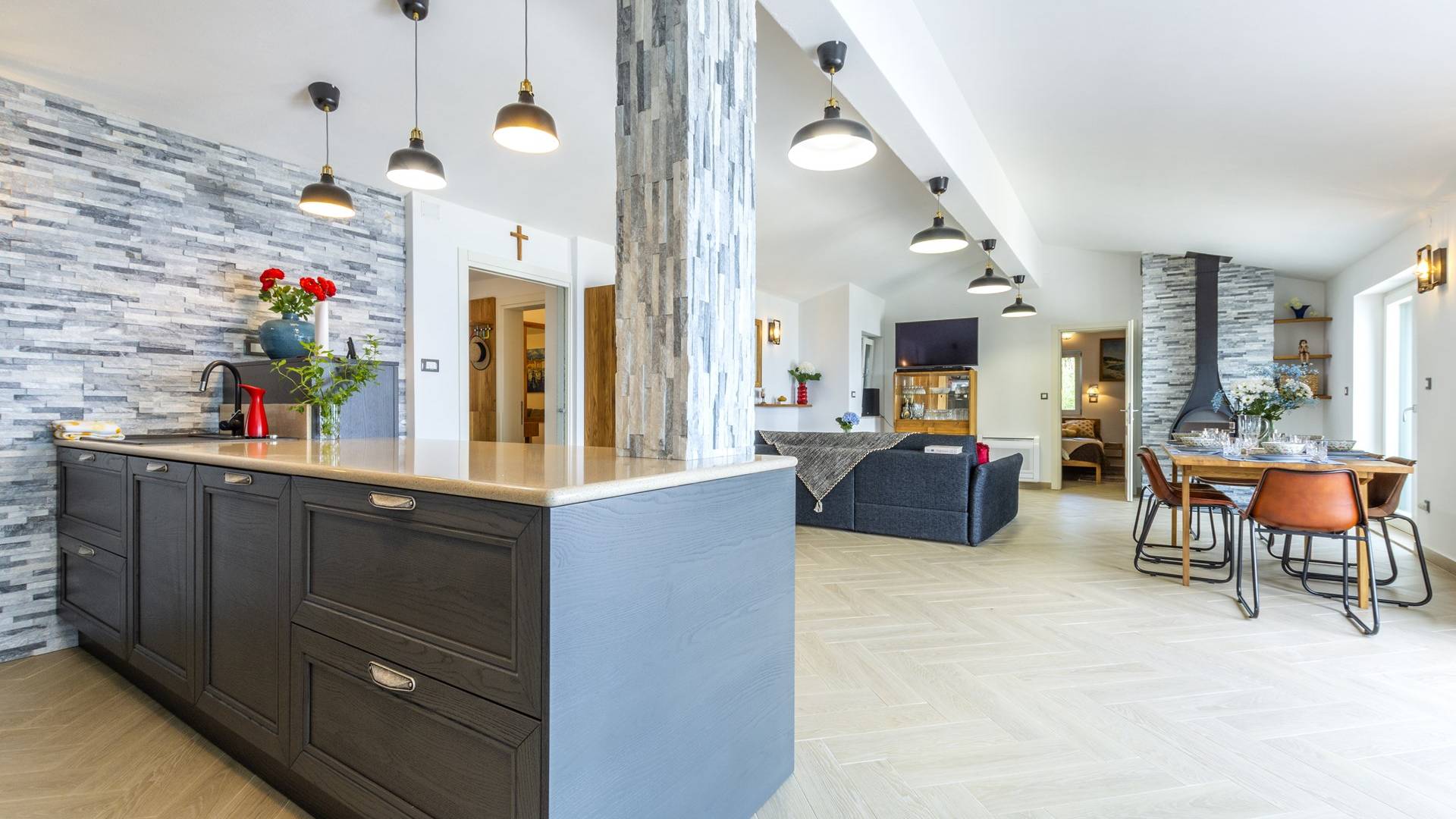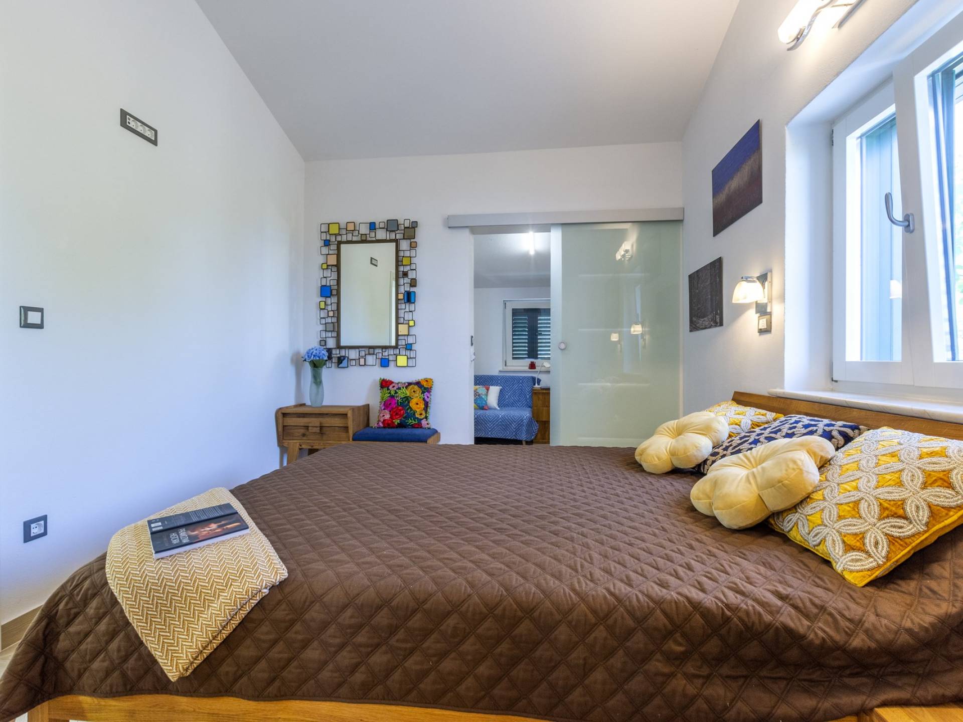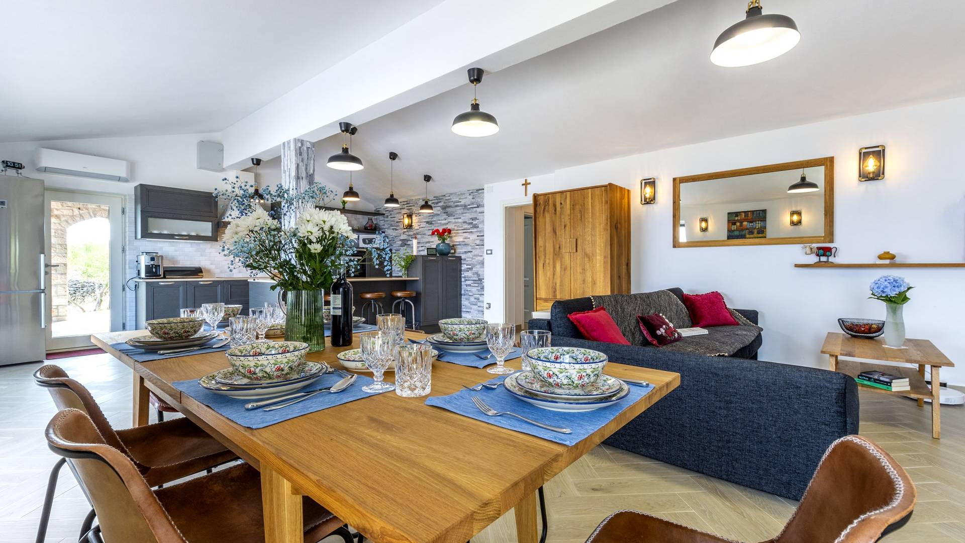L'interno di questa affascinante villa è una perfetta miscela di lusso moderno con un tocco di elementi rustici. Questa villa a un piano comprende una cucina open space con sala da pranzo e soggiorno con vista sulla splendida natura dell'isola di Brač e sul mare. Dotata di vari elettrodomestici di alta qualità, preparare i pasti in questa cucina sarà un'esperienza gioiosa e creativa. Ci sono anche due camere matrimoniali arredate con gusto, con letti aggiuntivi e due bagni. La restante camera matrimoniale, bagno e spogliatoio si trovano al piano seminterrato con uscita su un bellissimo giardino.