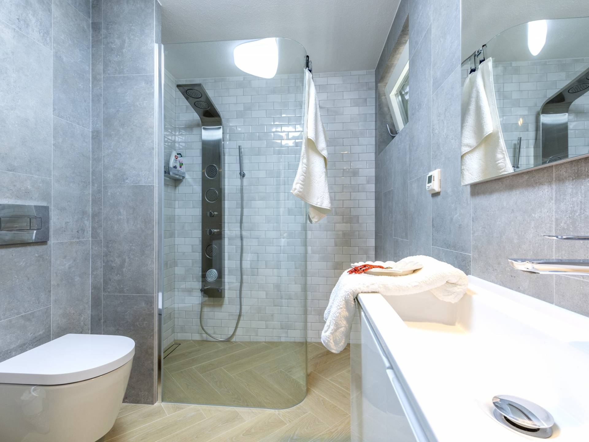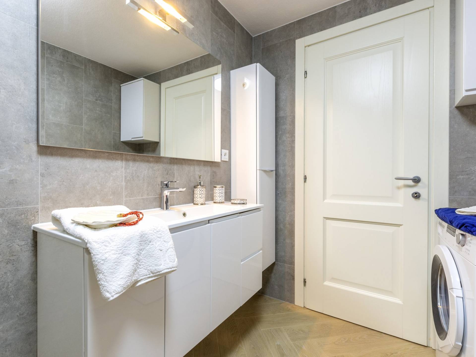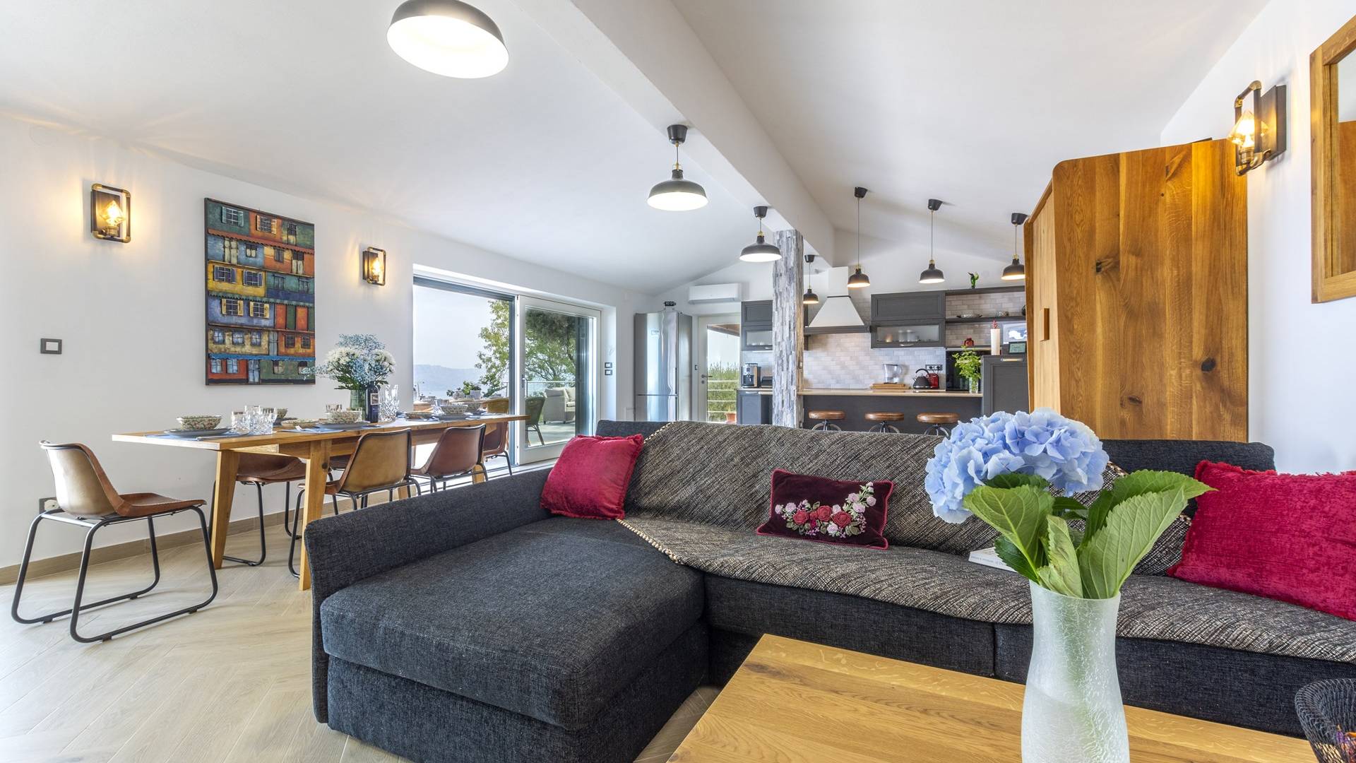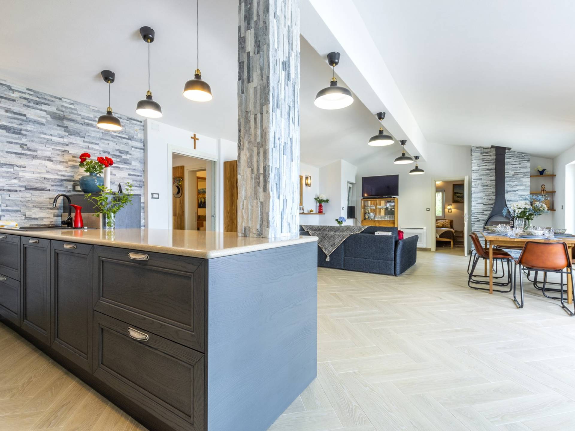 L'interno di questa affascinante villa è una perfetta miscela di lusso moderno con un tocco di elementi rustici. Questa villa a un piano comprende una cucina open space con sala da pranzo e soggiorno con vista sulla splendida natura dell'isola di Brač e sul mare. Dotata di vari elettrodomestici di alta qualità, preparare i pasti in questa cucina sarà un'esperienza gioiosa e creativa. Ci sono anche due camere matrimoniali arredate con gusto, con letti aggiuntivi e due bagni. La restante camera matrimoniale, bagno e spogliatoio si trovano al piano seminterrato con uscita su un bellissimo giardino.