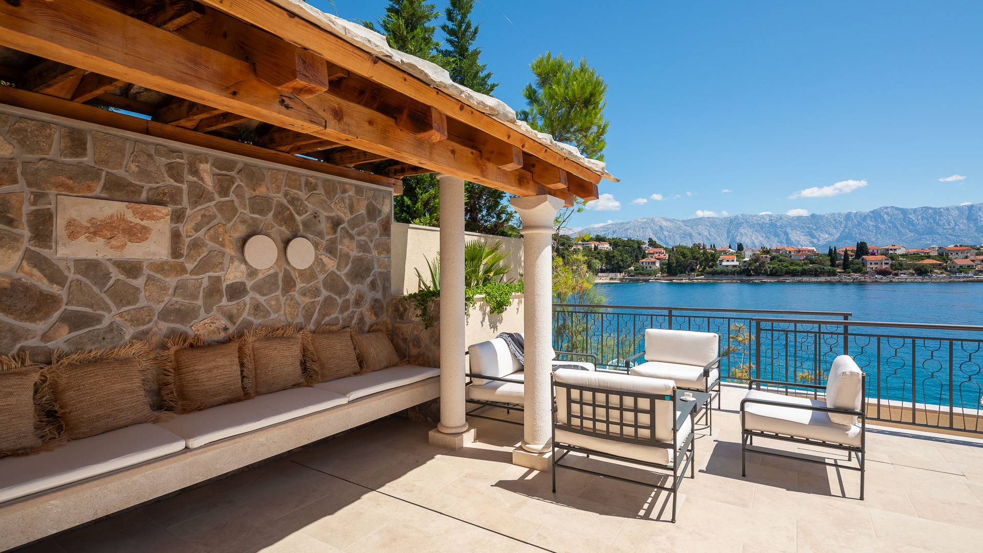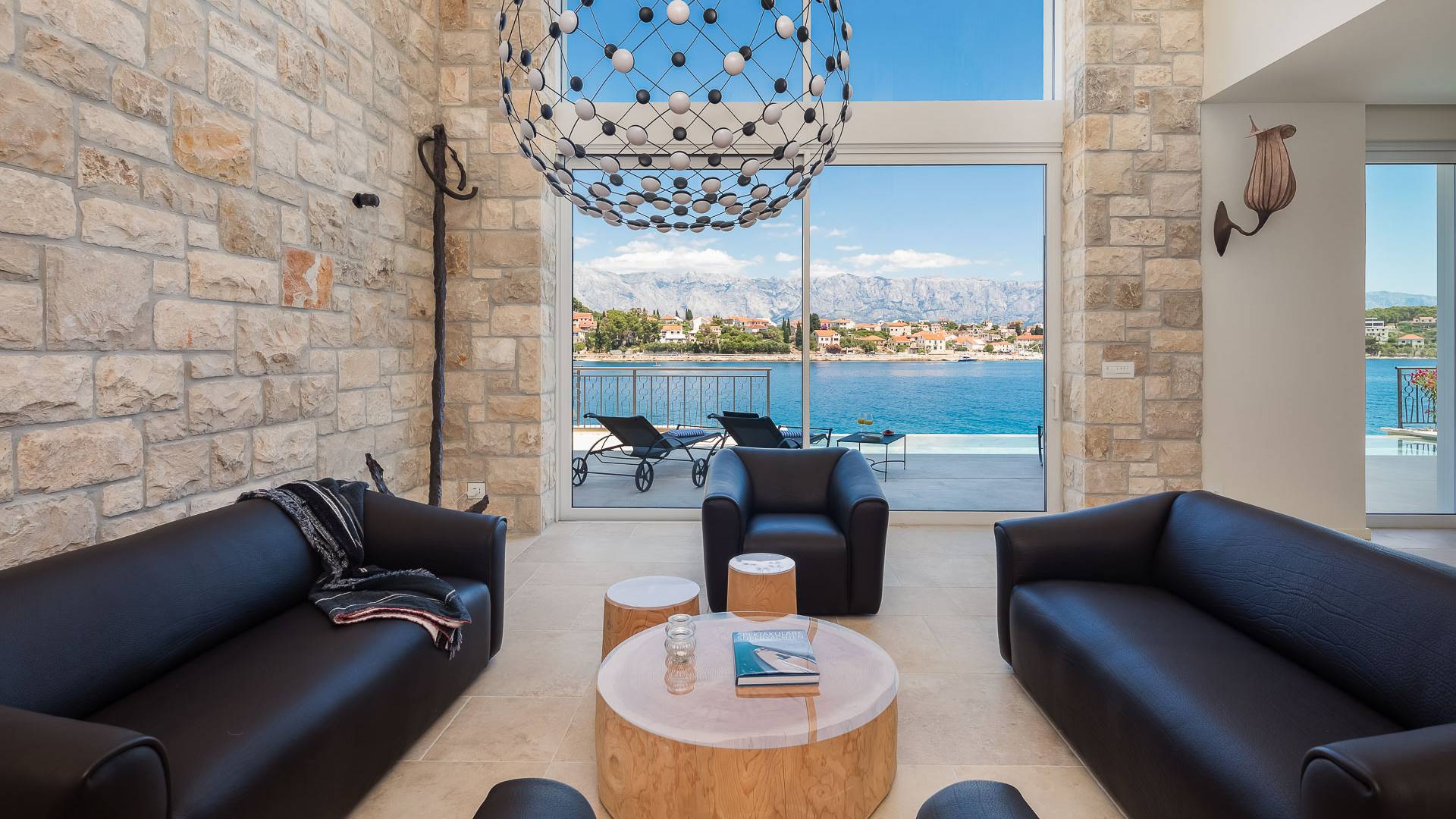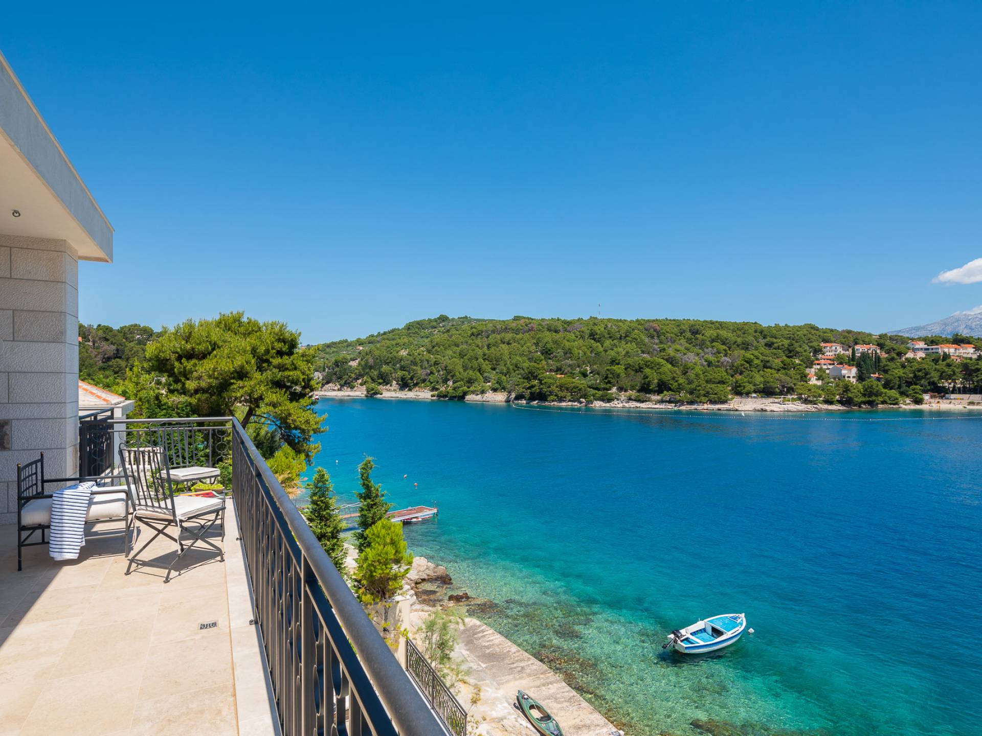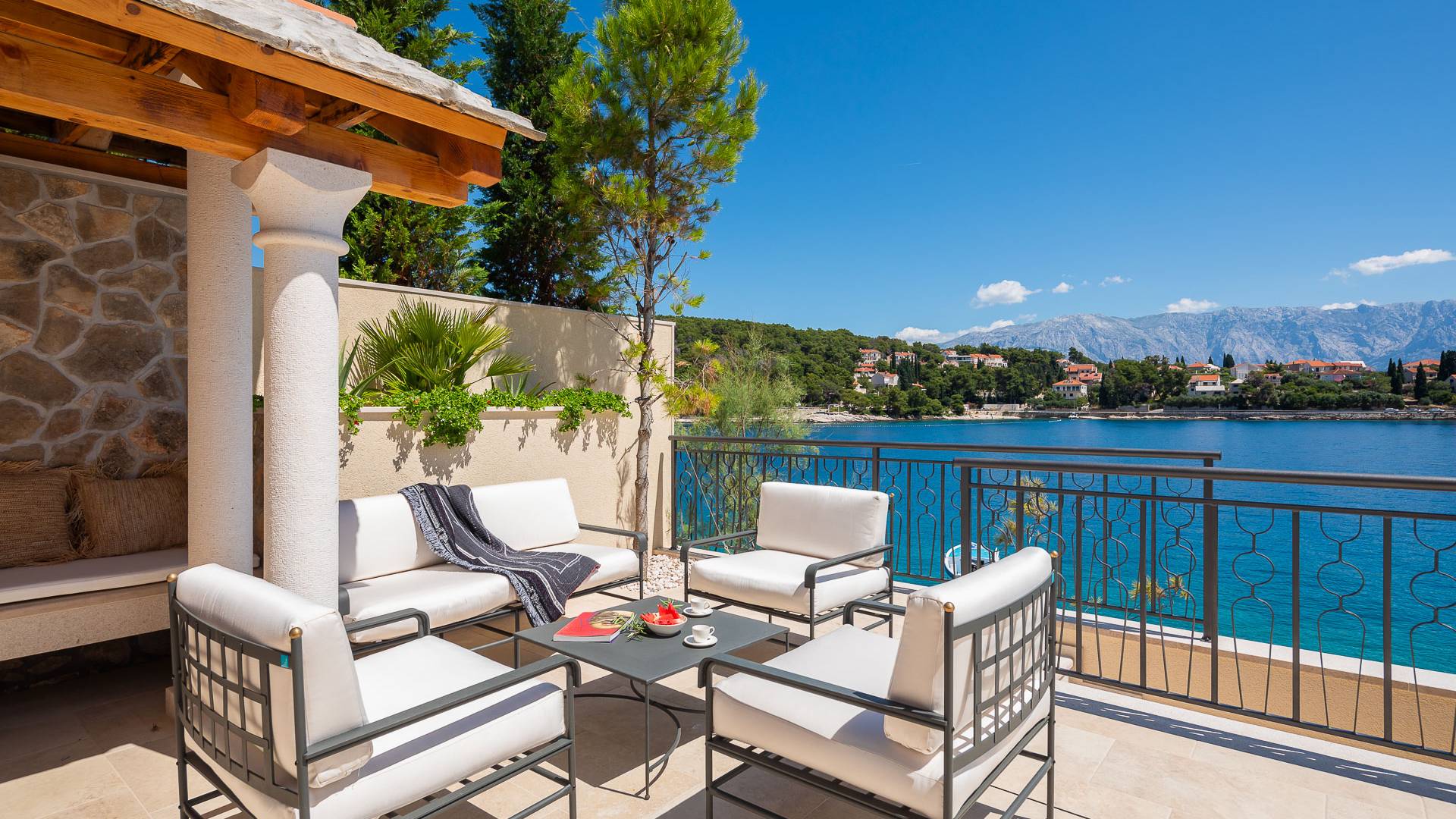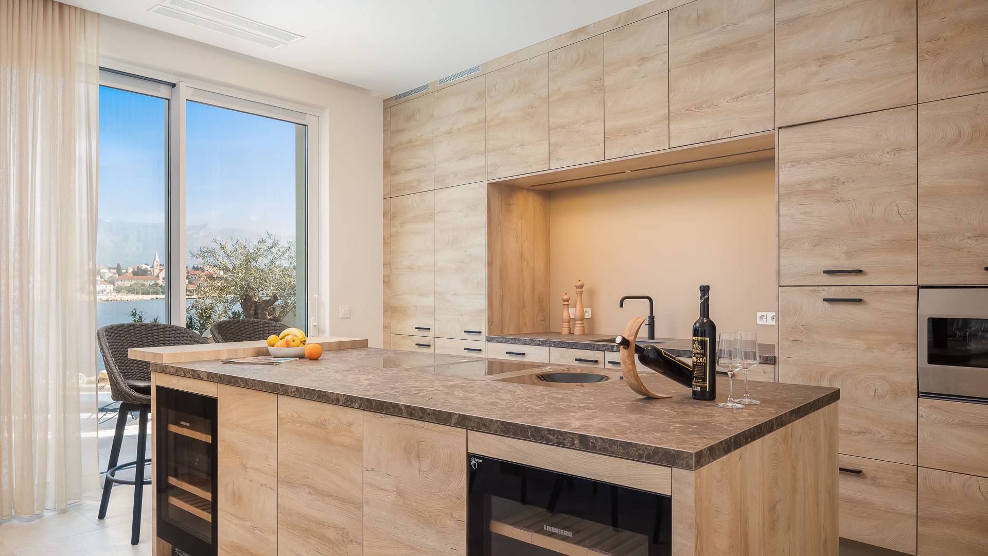Inside, you’ll find four spacious ensuite bedrooms with king-size beds, a professional-grade kitchen, a wine cellar, and a comfortable living room featuring a 6×4m panoramic window with spectacular views of Sumartin and the Biokovo Mountains . Per rilassamento e benessere, la villa include un