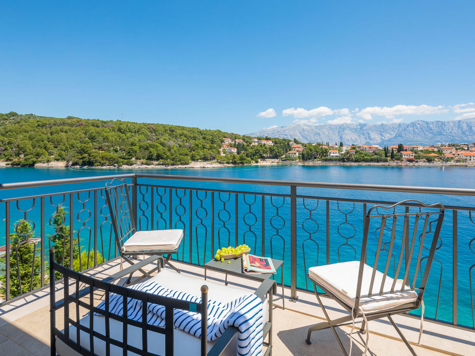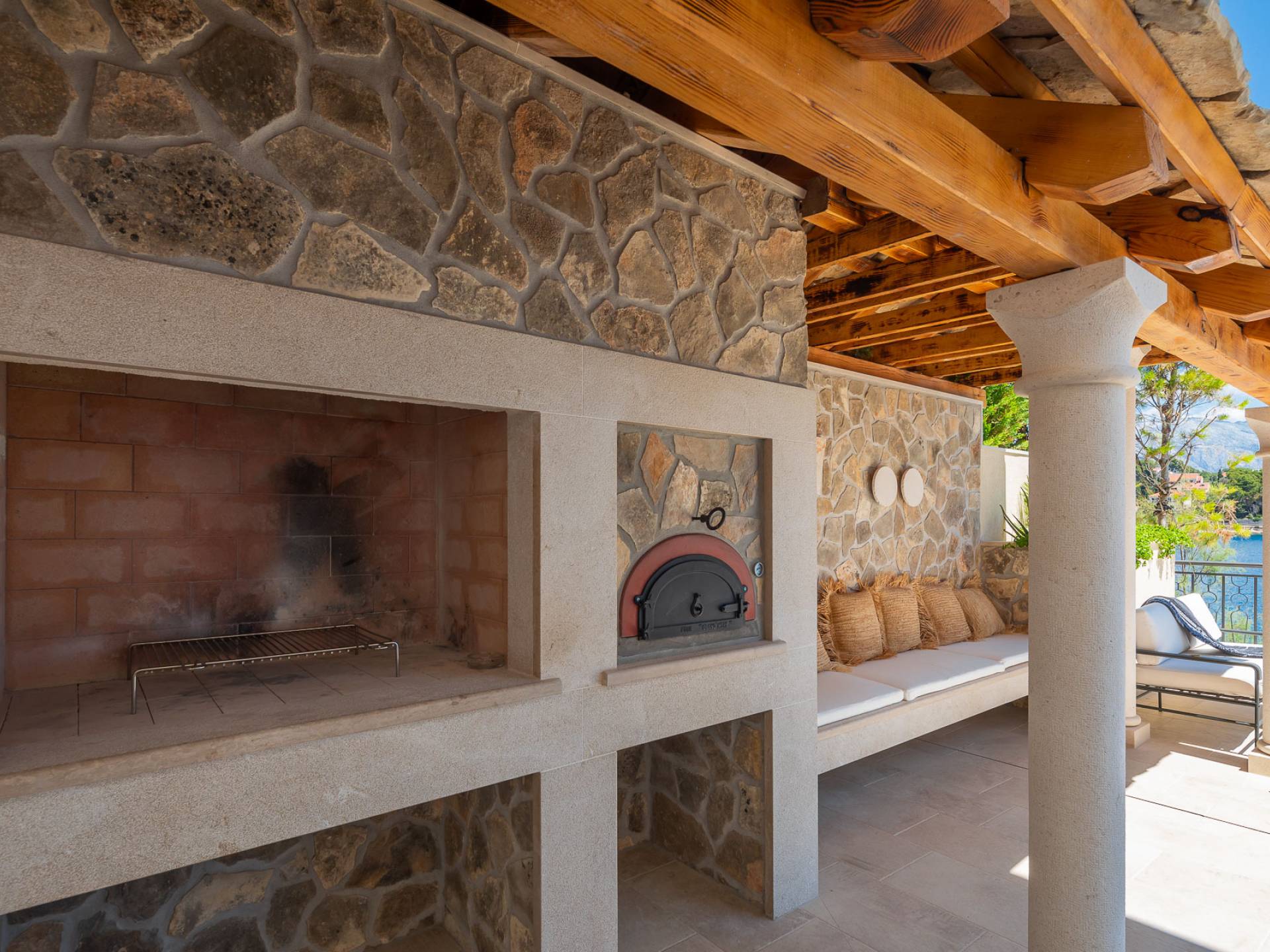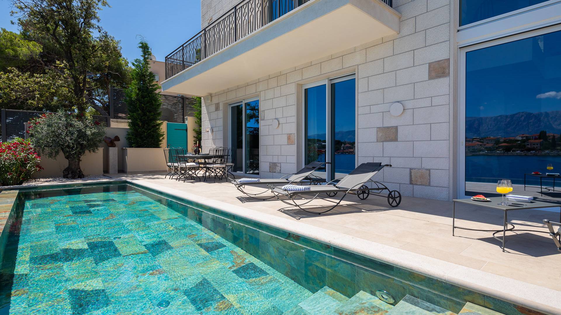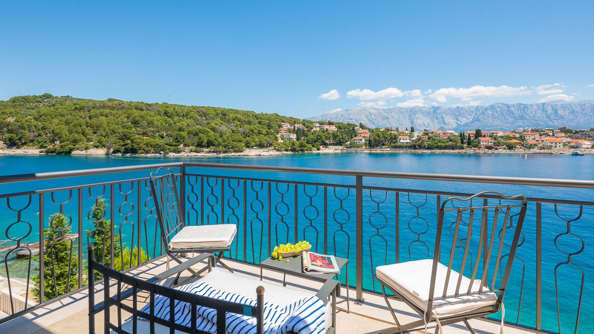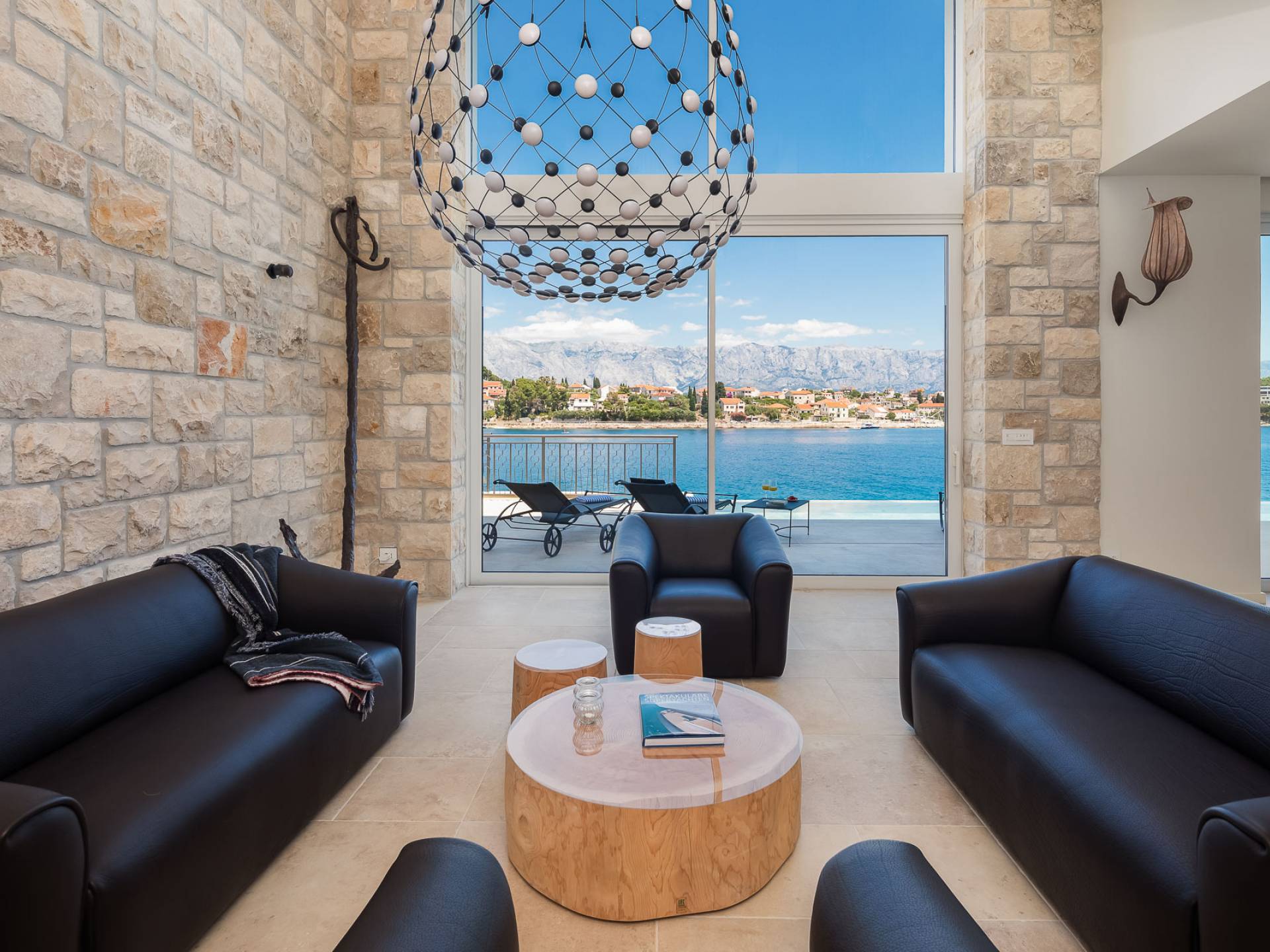 Inside, you’ll find four spacious ensuite bedrooms with king-size beds, a professional-grade kitchen, a wine cellar, and a comfortable living room featuring a 6×4m panoramic window with spectacular views of Sumartin and the Biokovo Mountains . Per rilassamento e benessere, la villa include un
