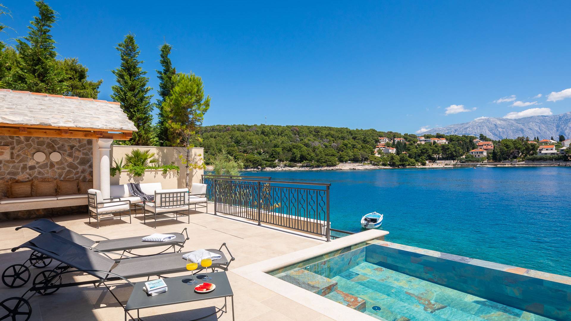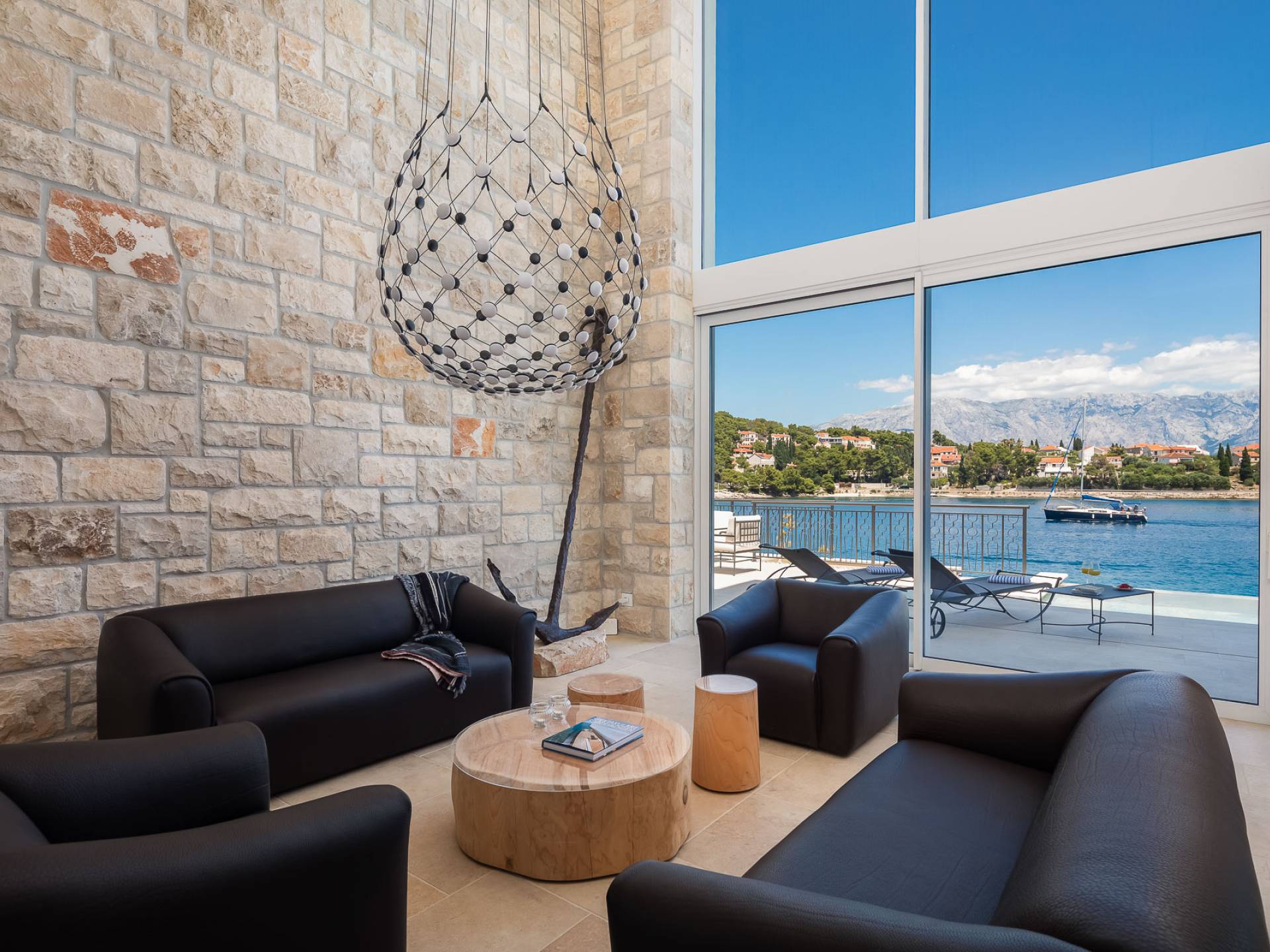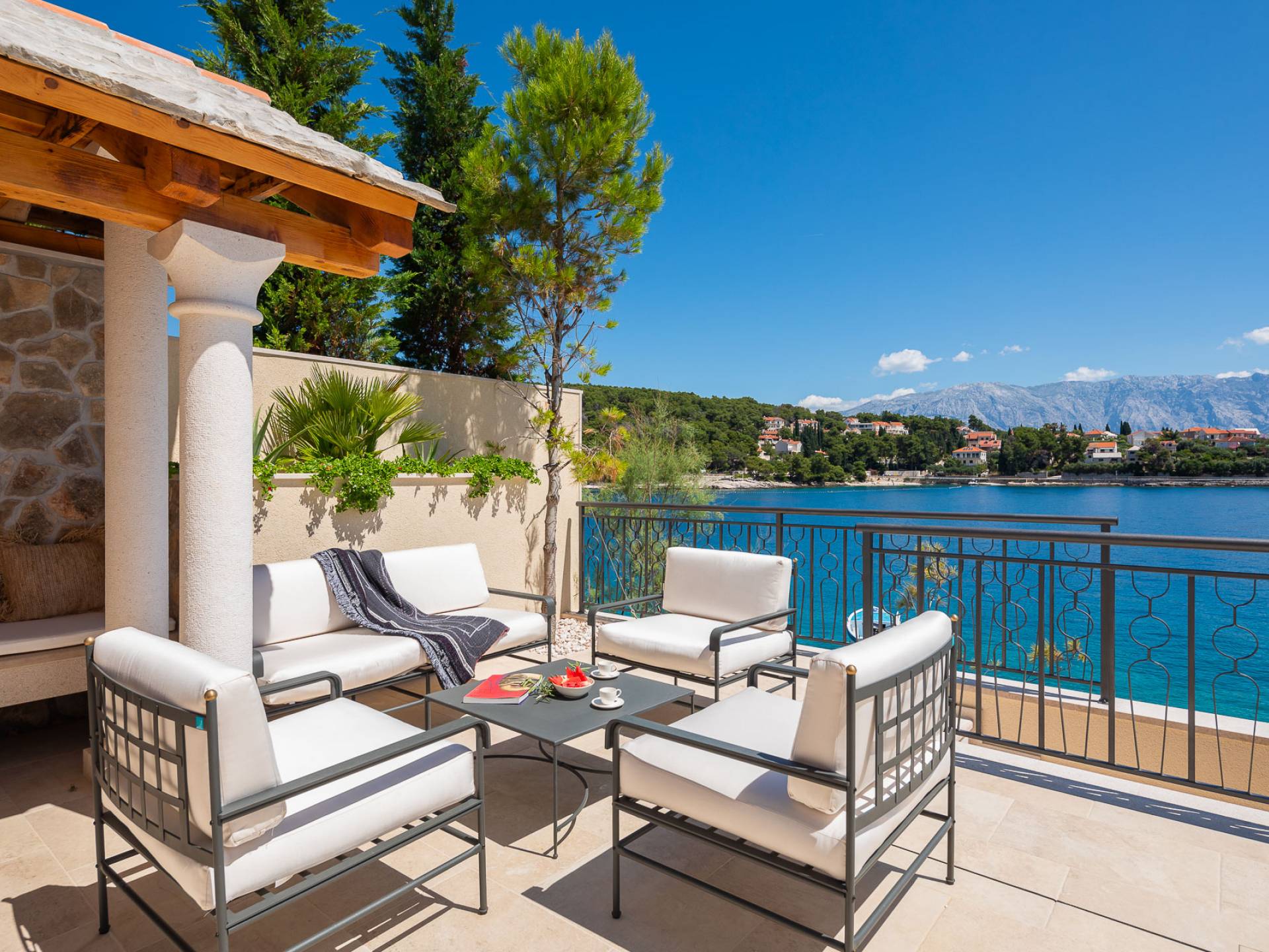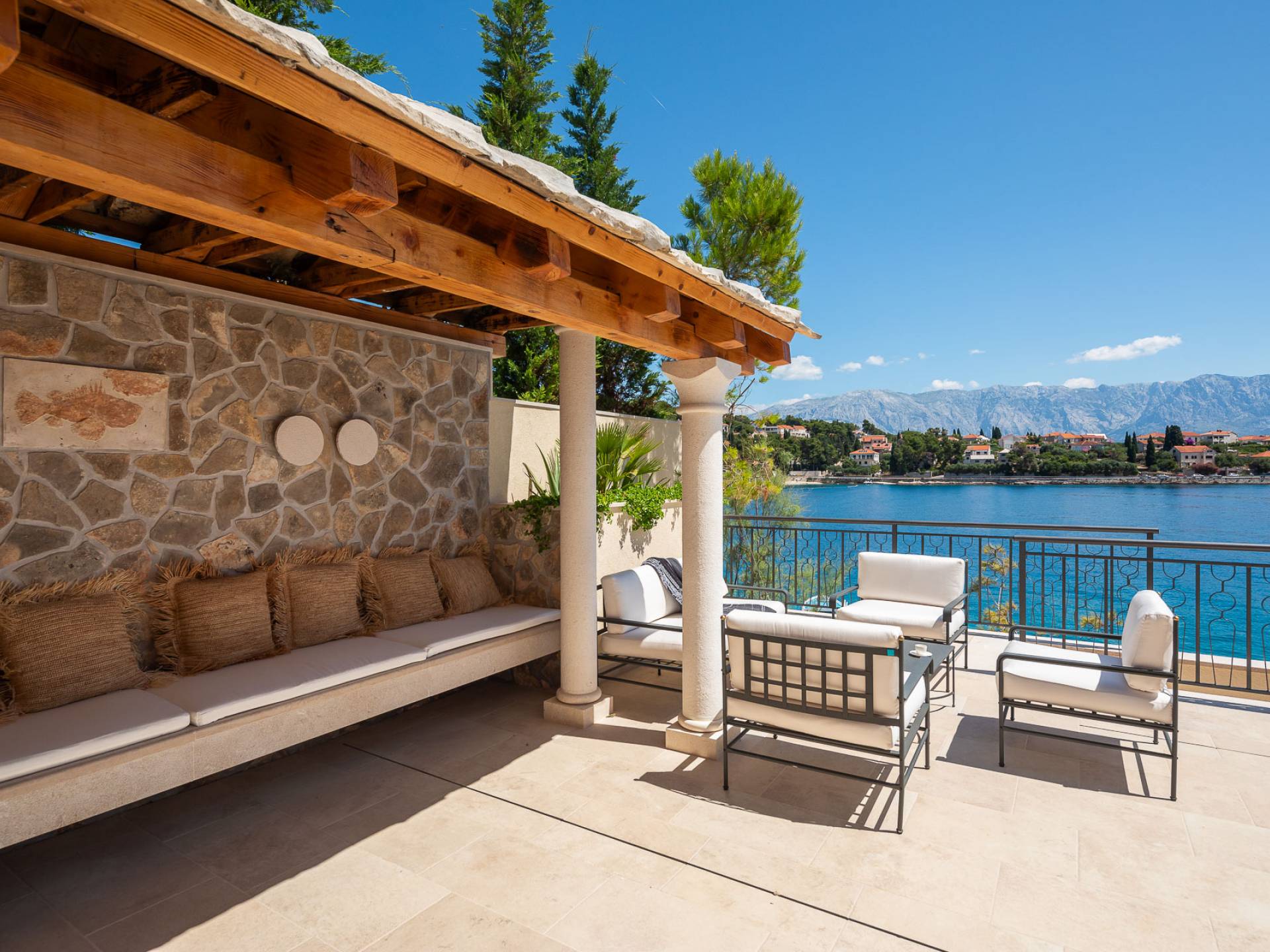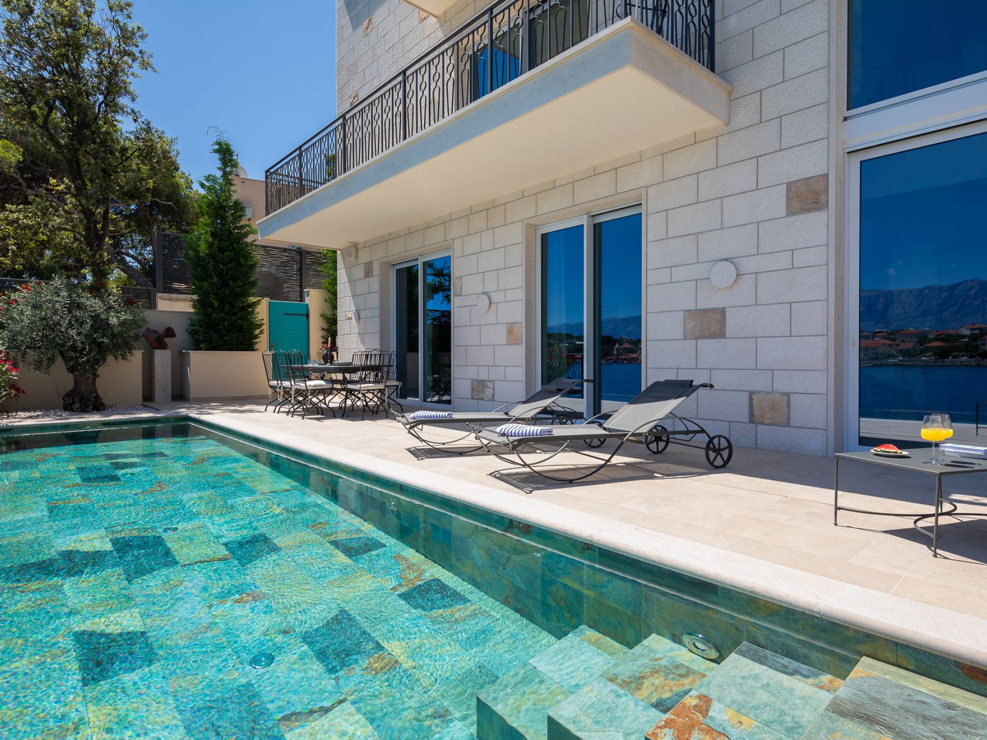 Inside, you’ll find four spacious ensuite bedrooms with king-size beds, a professional-grade kitchen, a wine cellar, and a comfortable living room featuring a 6×4m panoramic window with spectacular views of Sumartin and the Biokovo Mountains . Per rilassamento e benessere, la villa include un