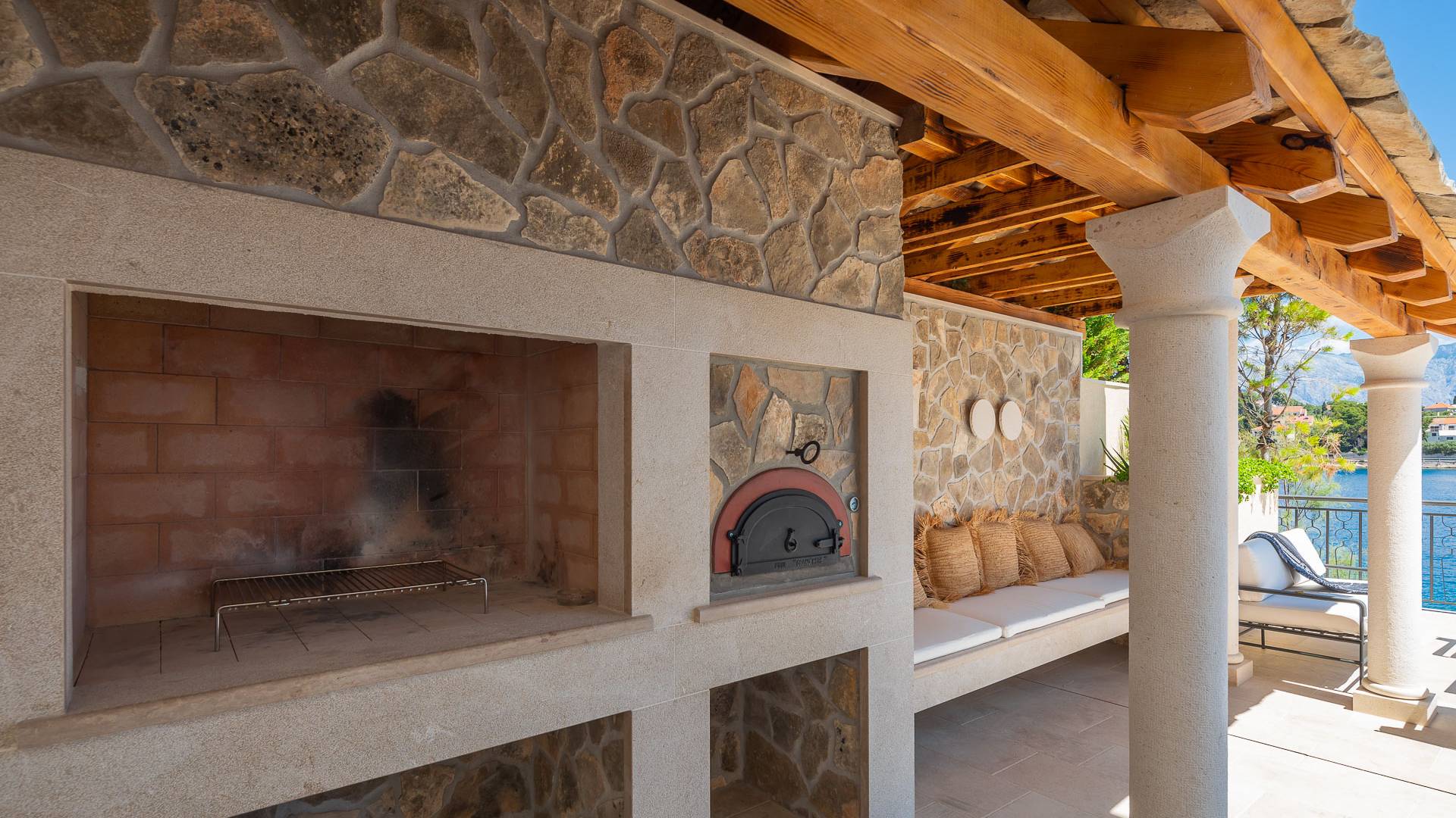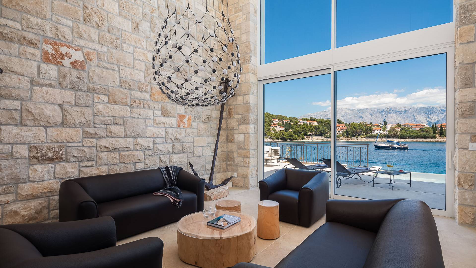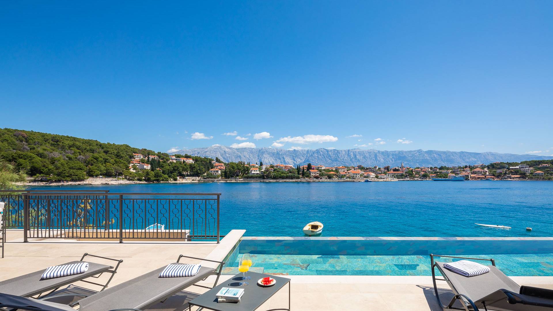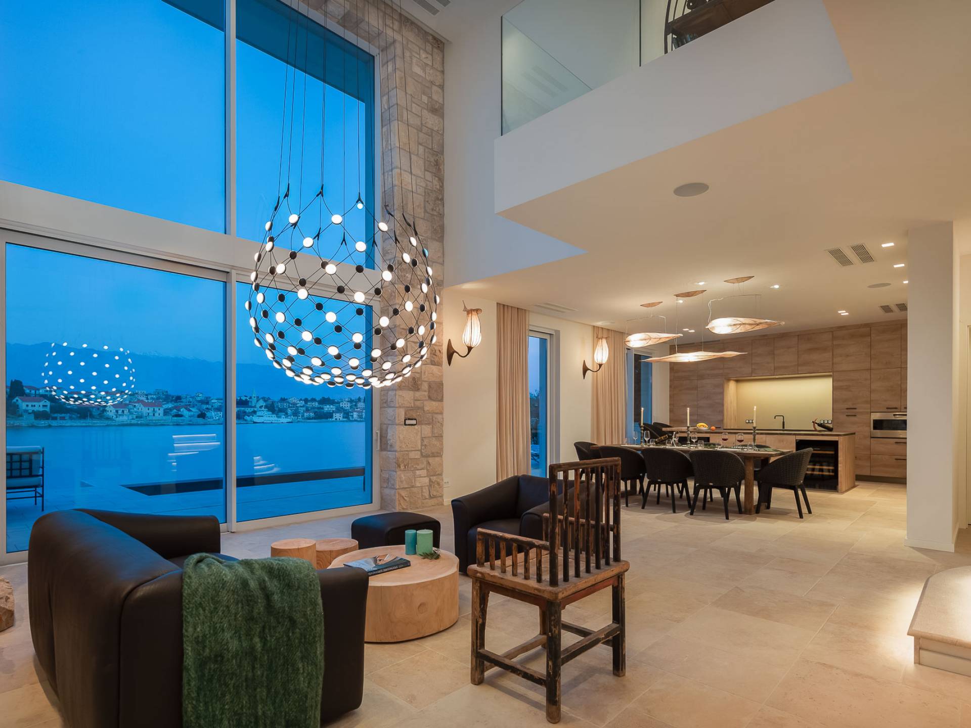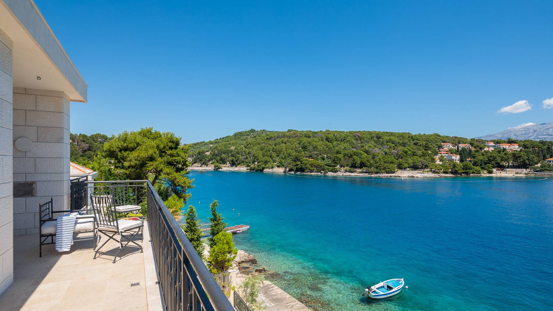 Inside, you’ll find four spacious ensuite bedrooms with king-size beds, a professional-grade kitchen, a wine cellar, and a comfortable living room featuring a 6×4m panoramic window with spectacular views of Sumartin and the Biokovo Mountains . Per rilassamento e benessere, la villa include un