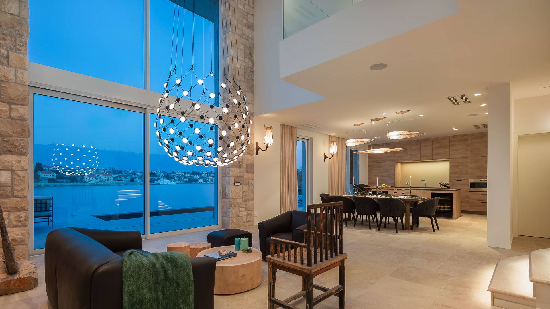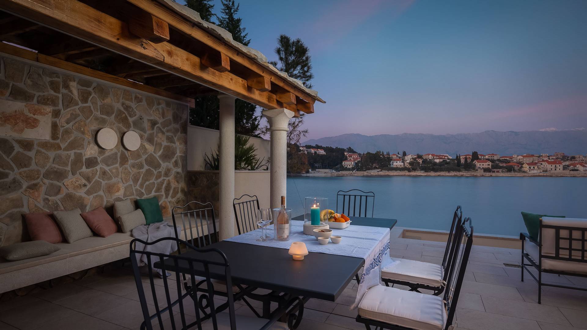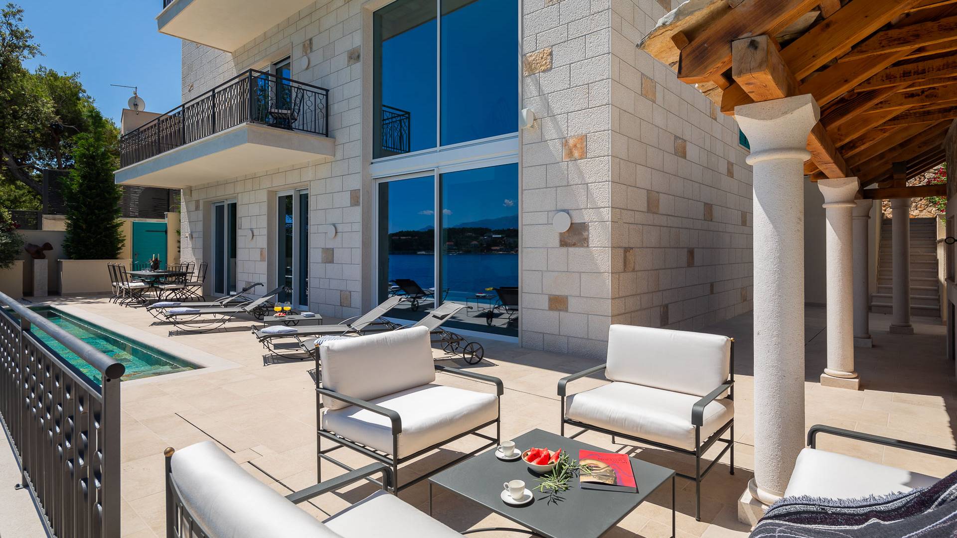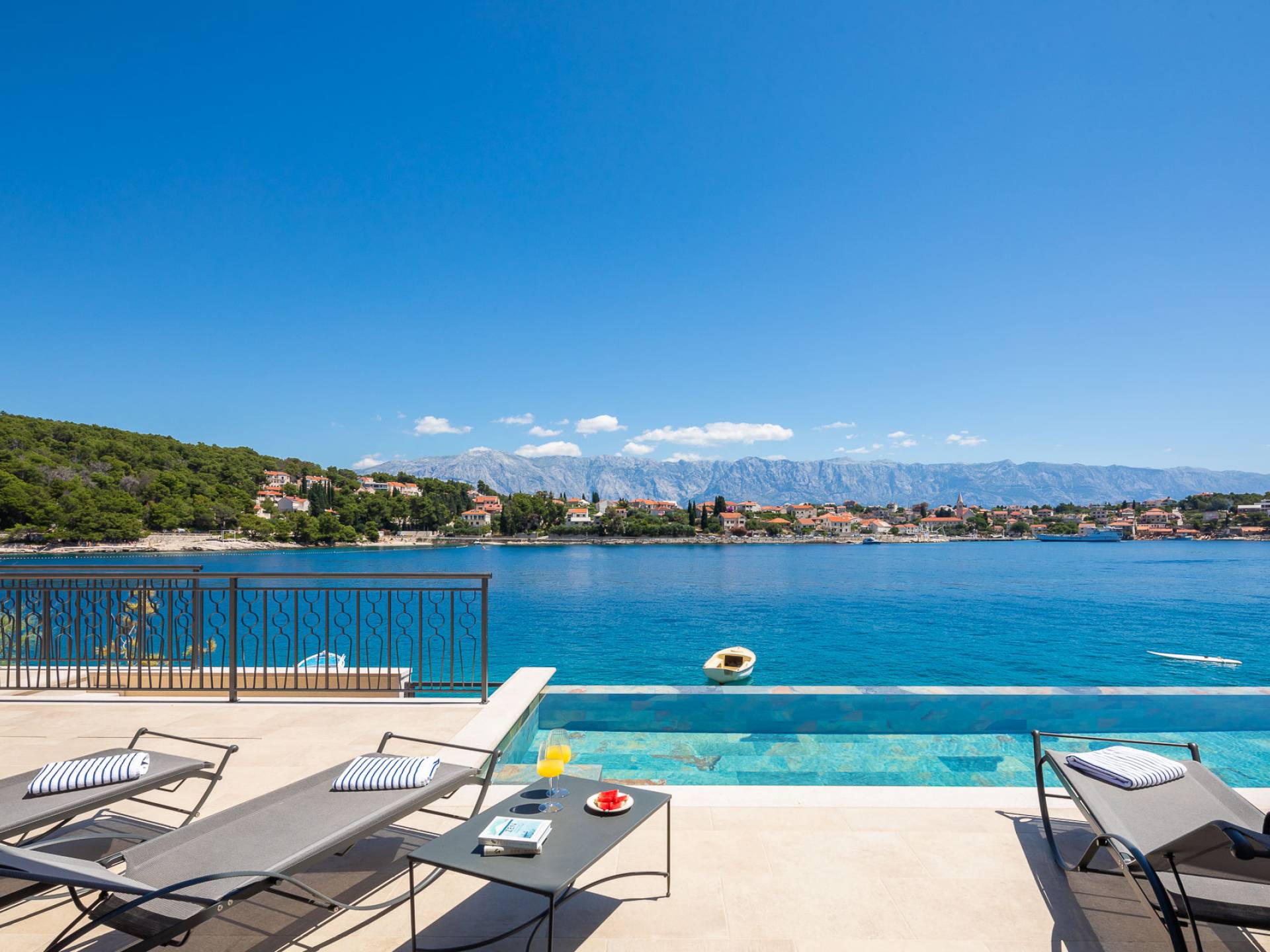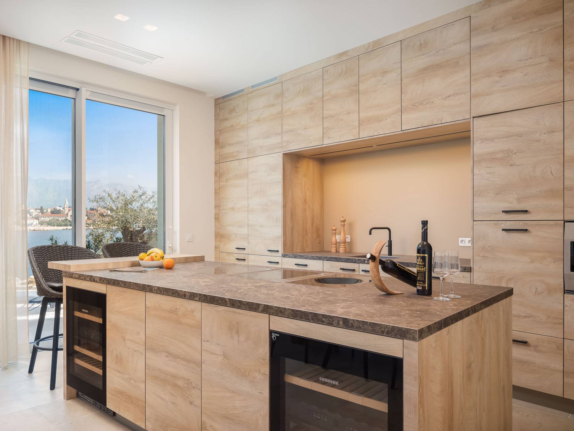 Inside, you’ll find four spacious ensuite bedrooms with king-size beds, a professional-grade kitchen, a wine cellar, and a comfortable living room featuring a 6×4m panoramic window with spectacular views of Sumartin and the Biokovo Mountains . Per rilassamento e benessere, la villa include un