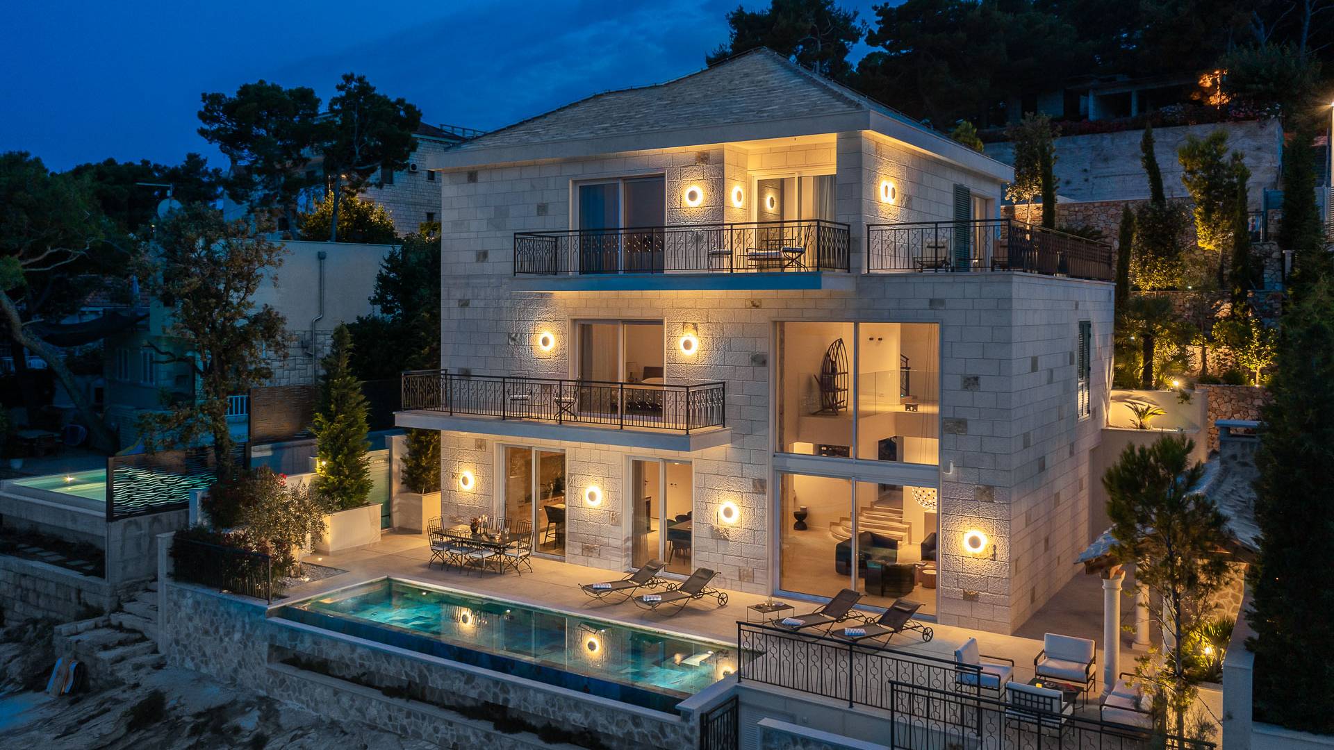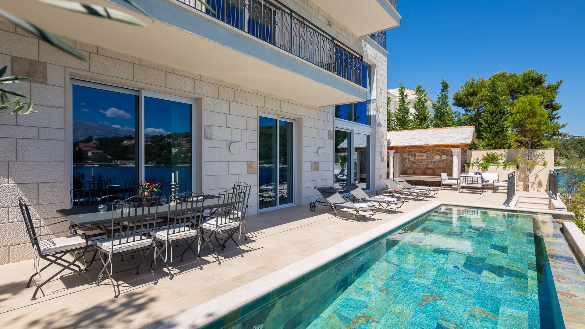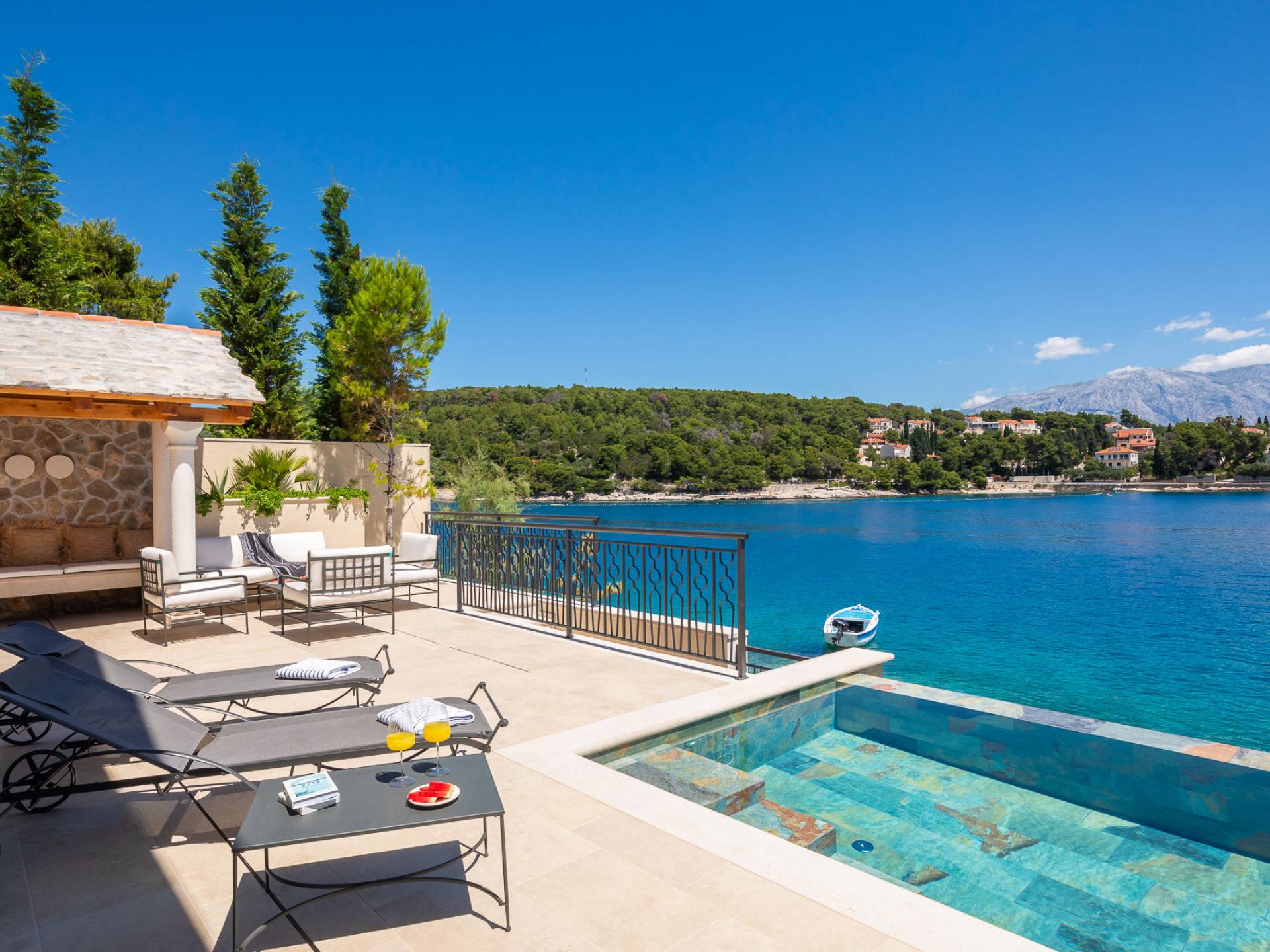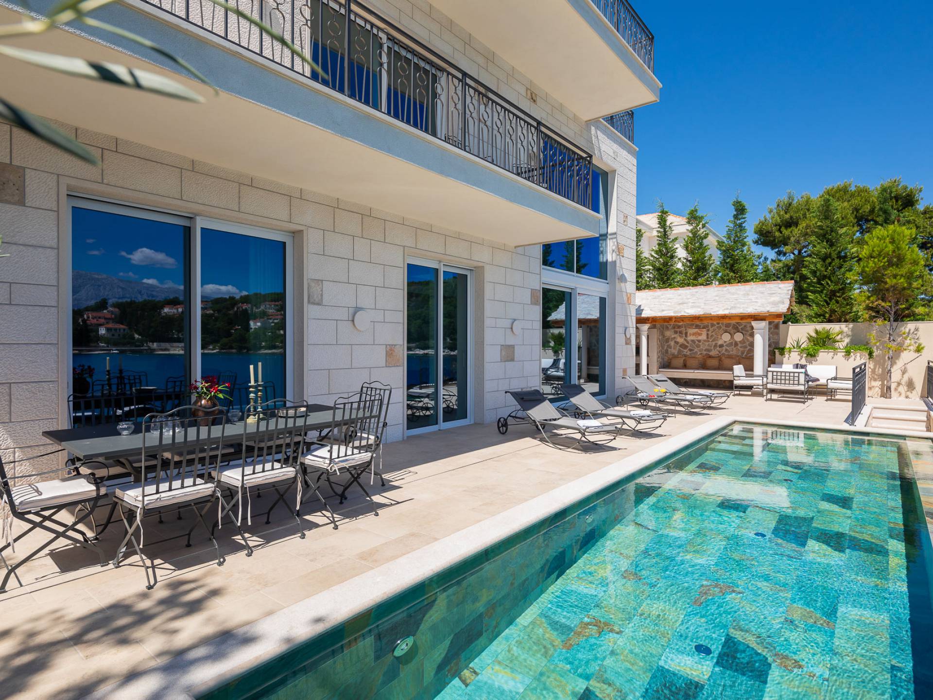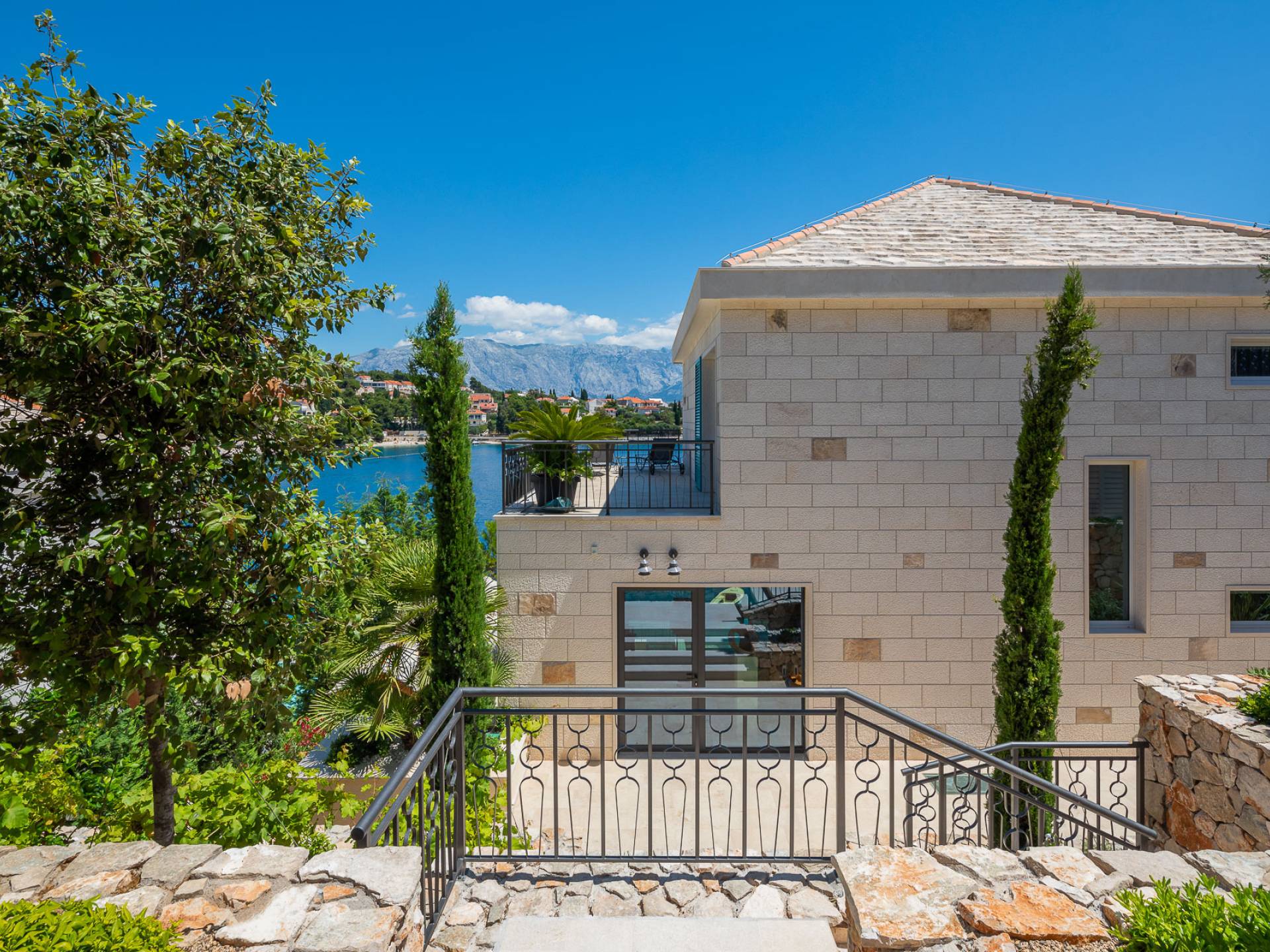 Inside, you’ll find four spacious ensuite bedrooms with king-size beds, a professional-grade kitchen, a wine cellar, and a comfortable living room featuring a 6×4m panoramic window with spectacular views of Sumartin and the Biokovo Mountains . Per rilassamento e benessere, la villa include un