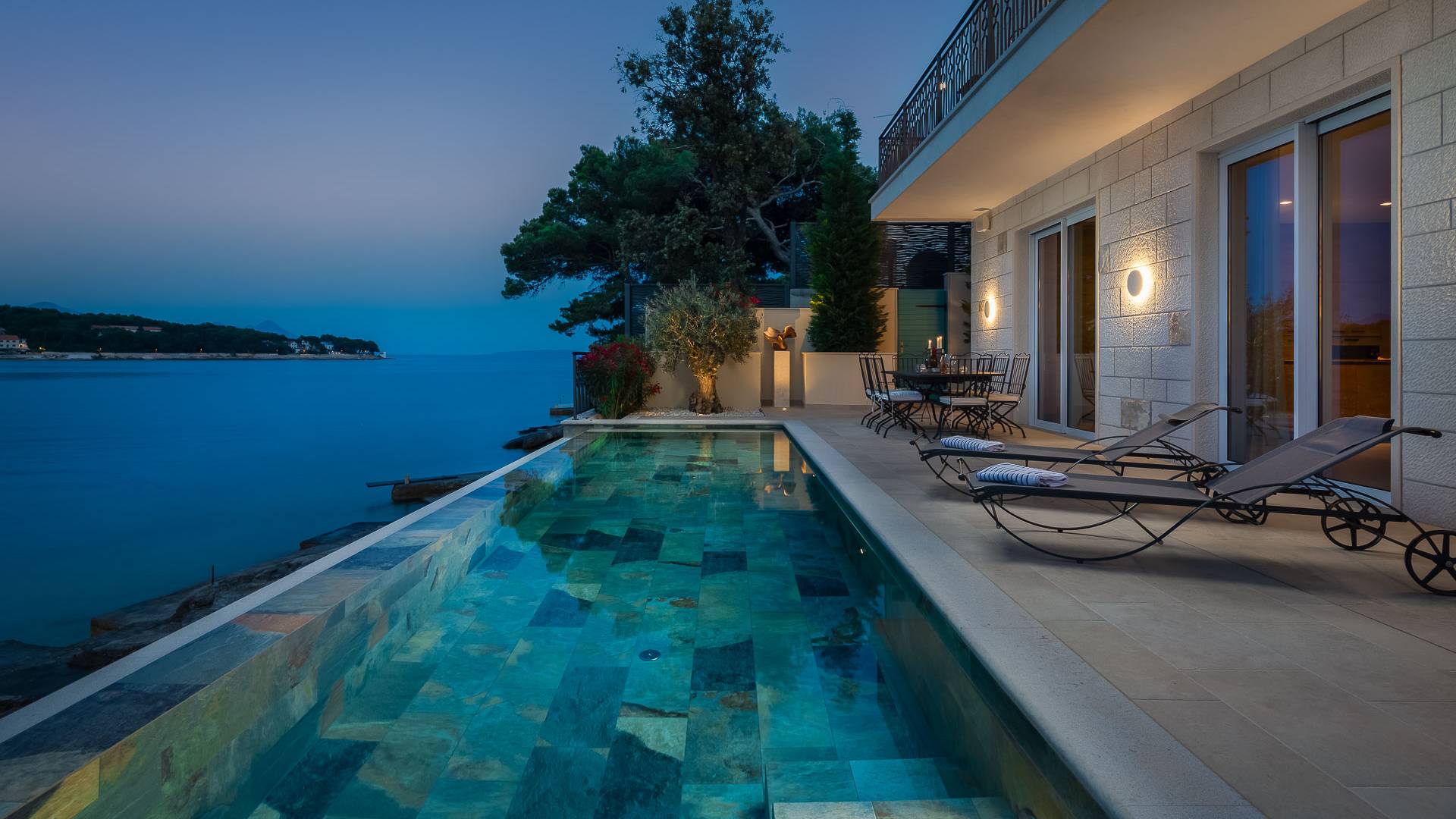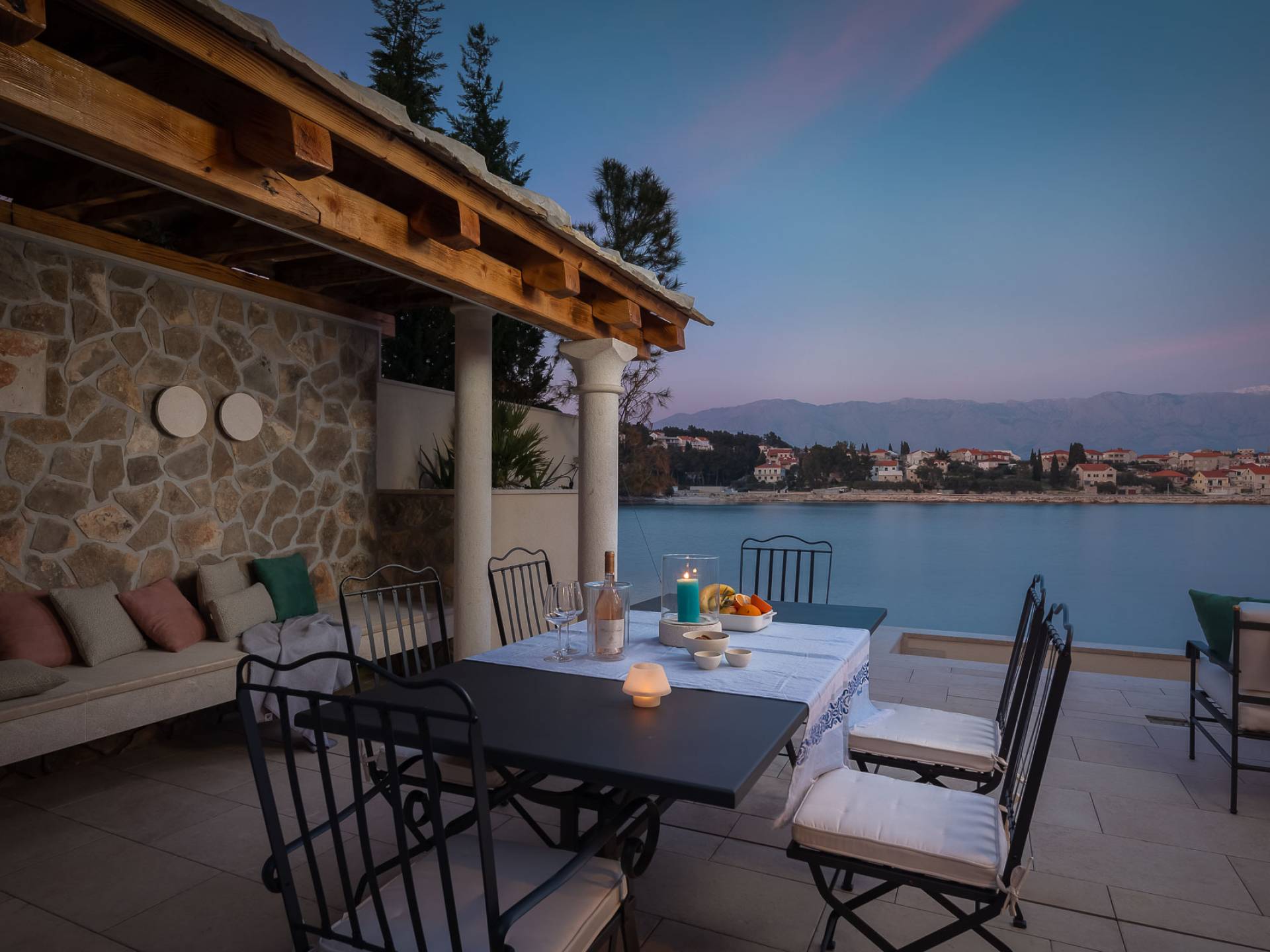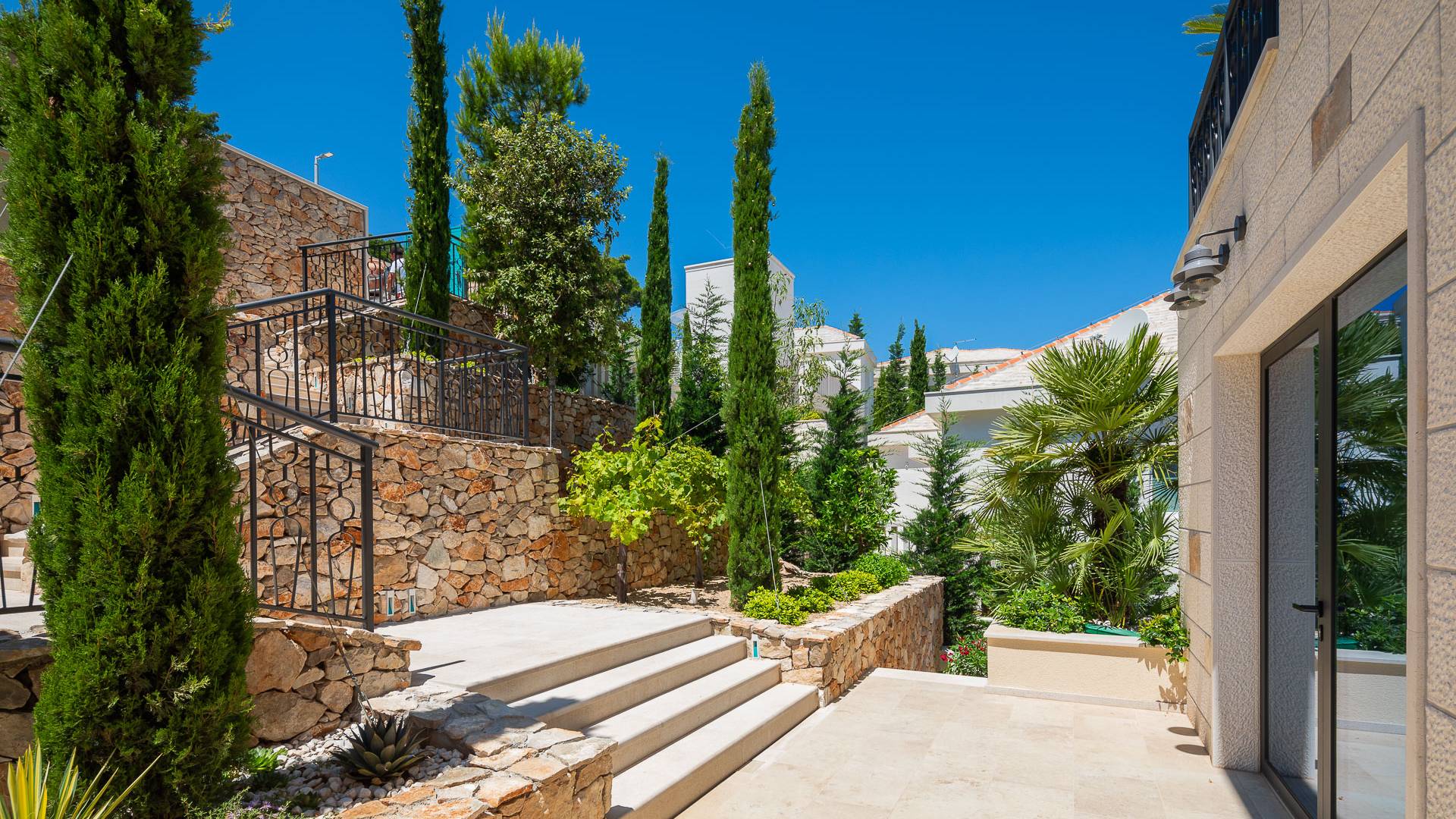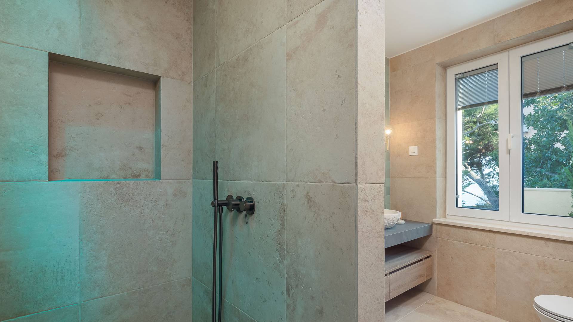 Inside, you’ll find four spacious ensuite bedrooms with king-size beds, a professional-grade kitchen, a wine cellar, and a comfortable living room featuring a 6×4m panoramic window with spectacular views of Sumartin and the Biokovo Mountains . Per rilassamento e benessere, la villa include un