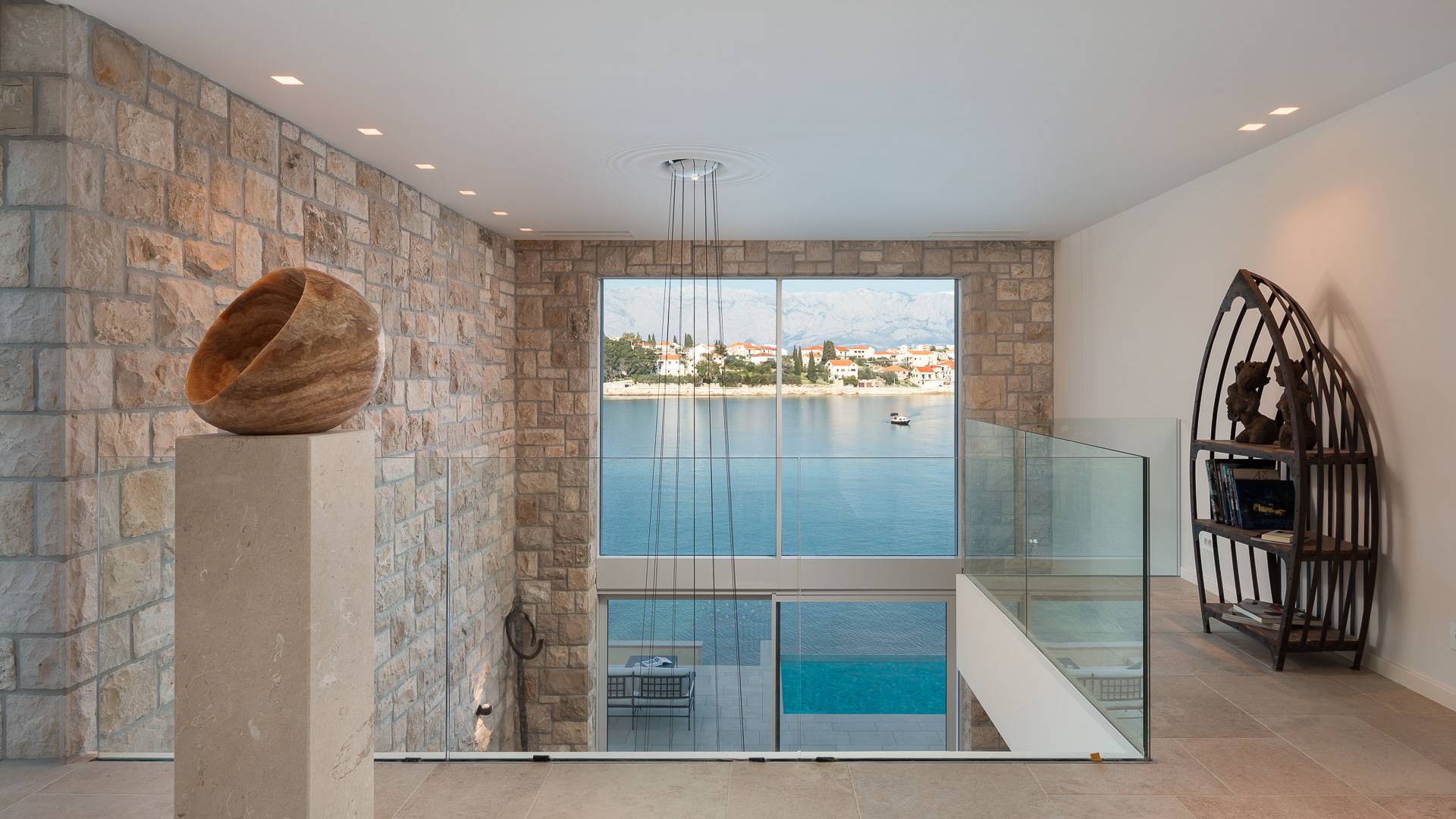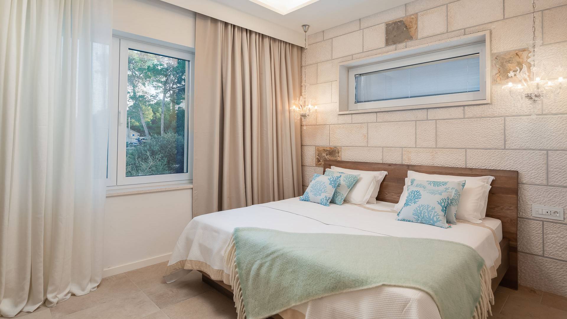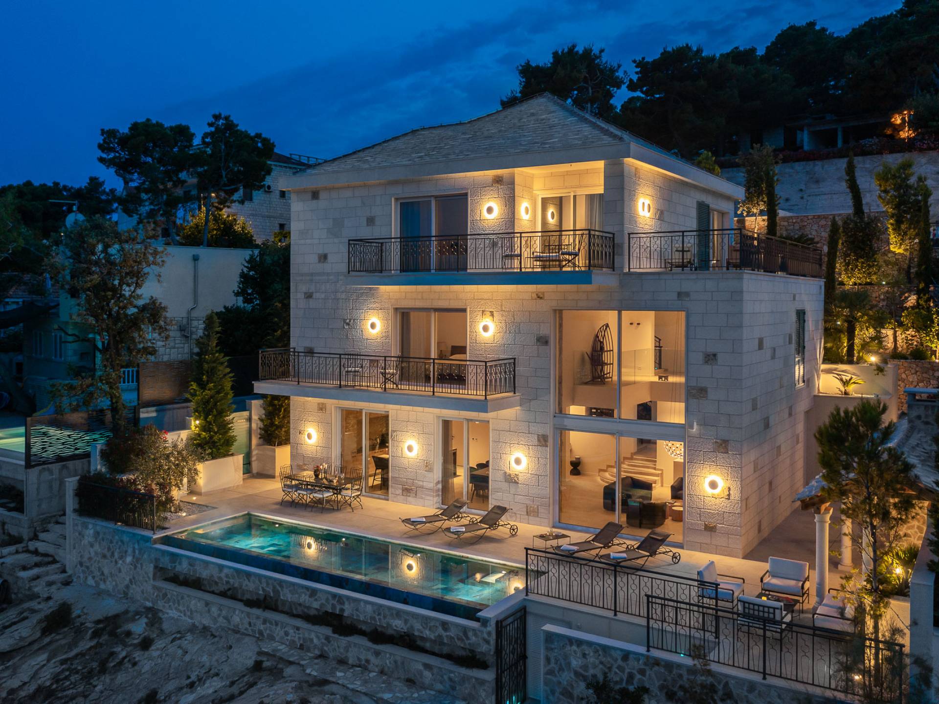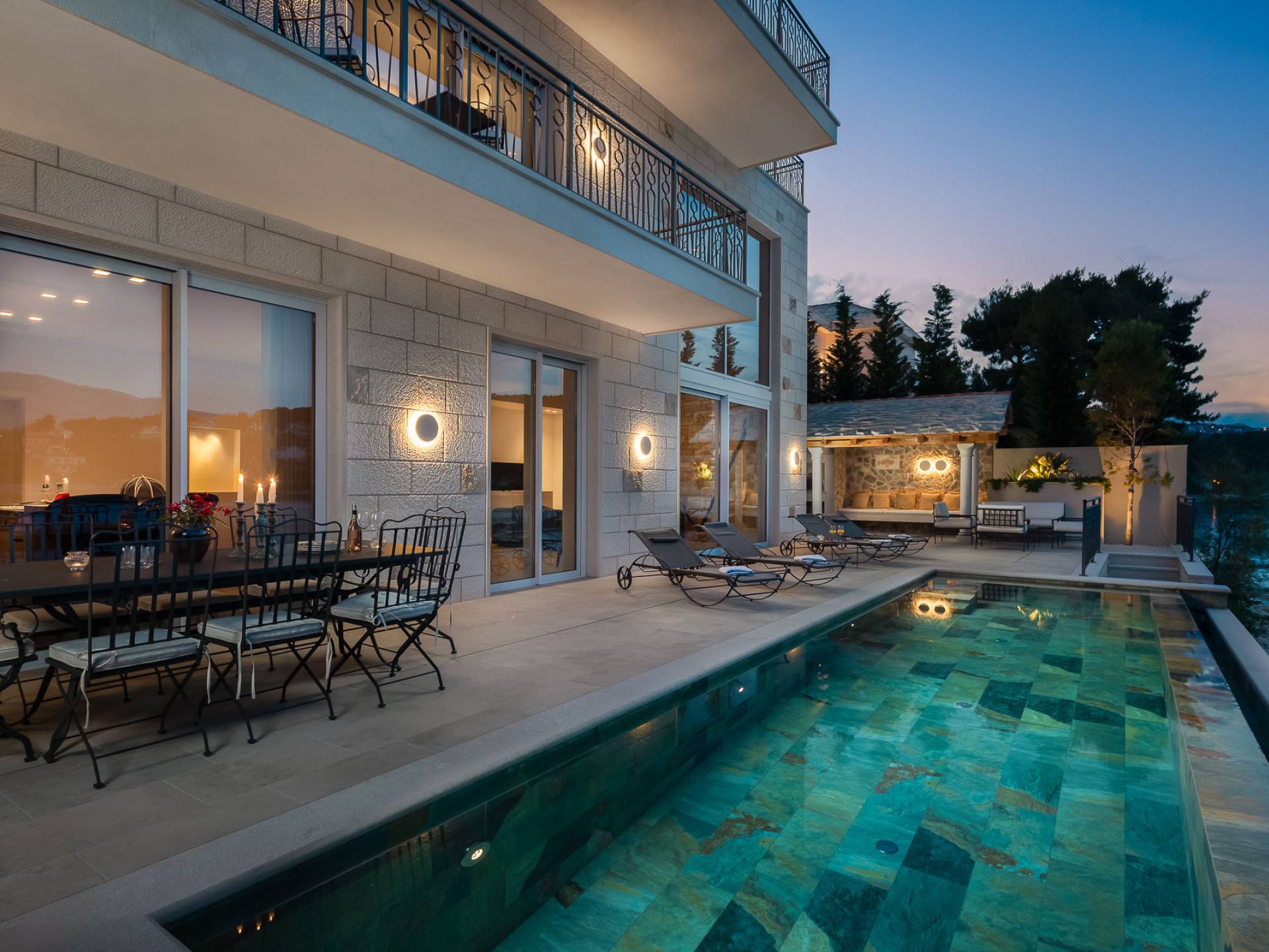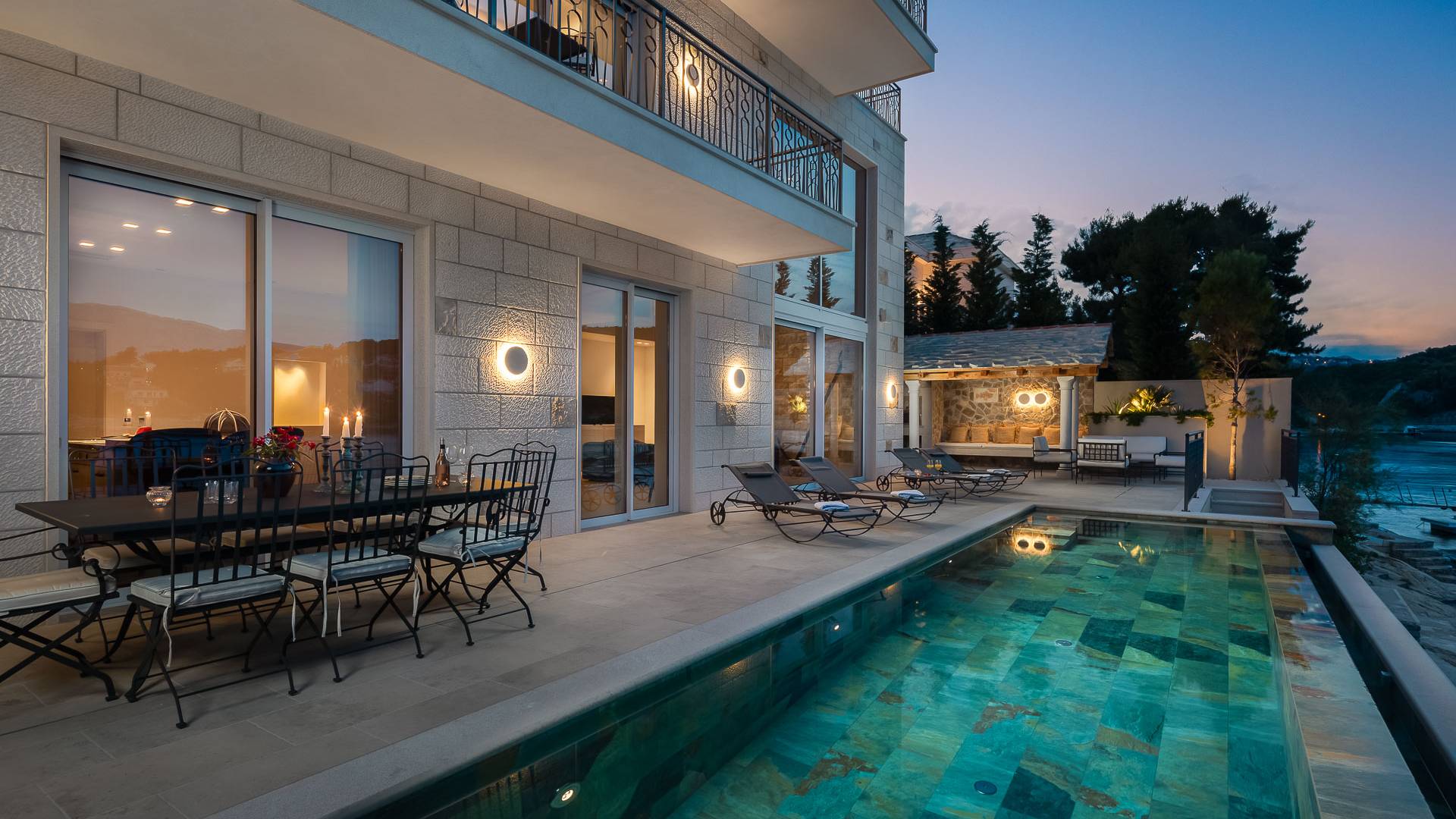 Inside, you’ll find four spacious ensuite bedrooms with king-size beds, a professional-grade kitchen, a wine cellar, and a comfortable living room featuring a 6×4m panoramic window with spectacular views of Sumartin and the Biokovo Mountains . Per rilassamento e benessere, la villa include un