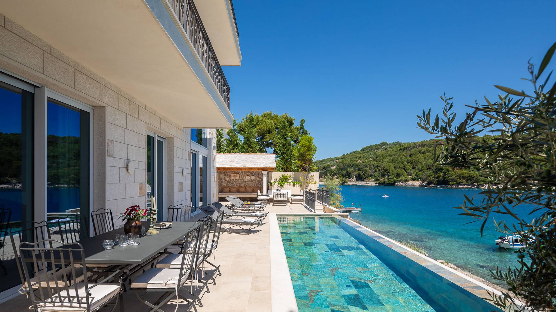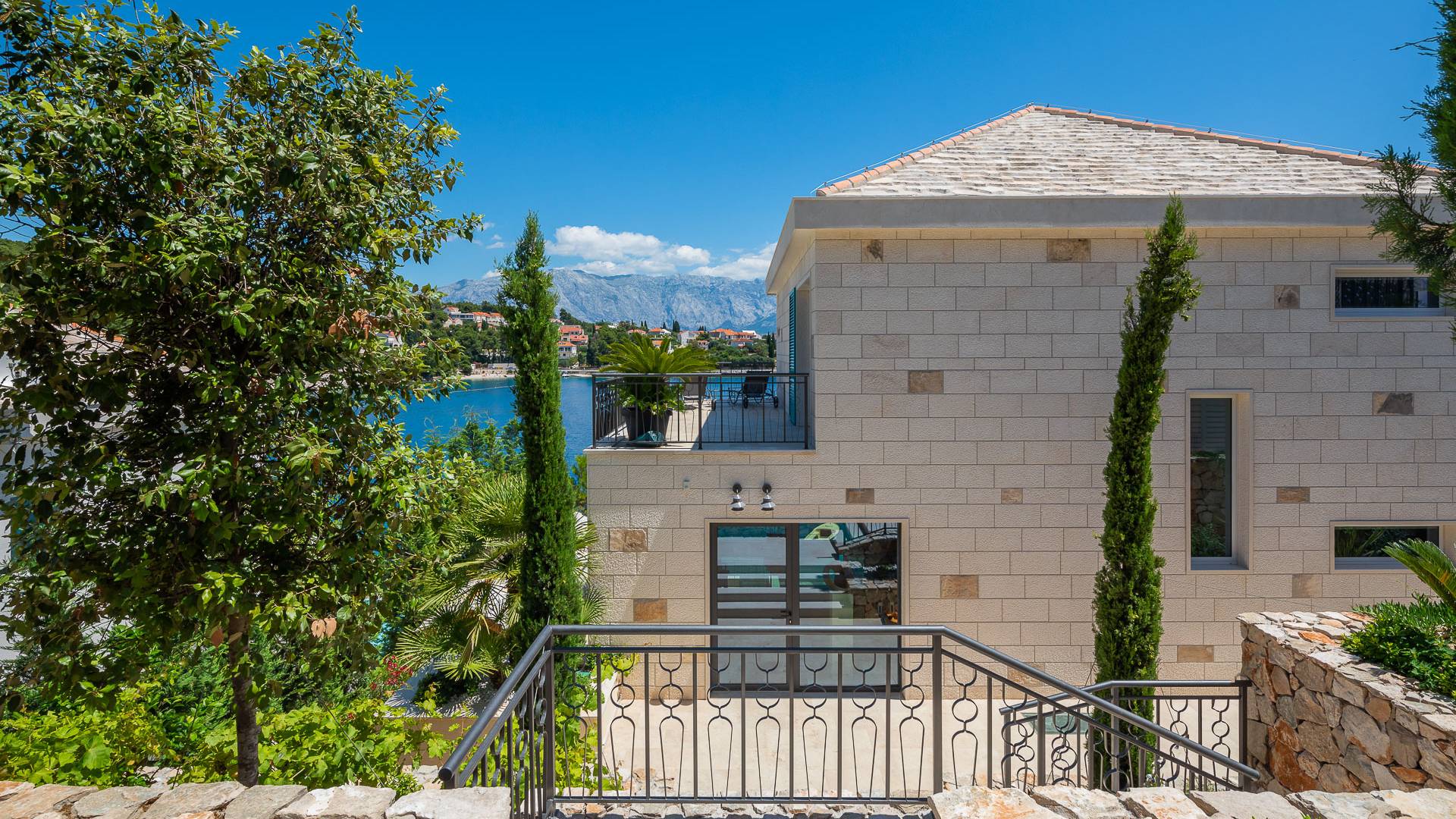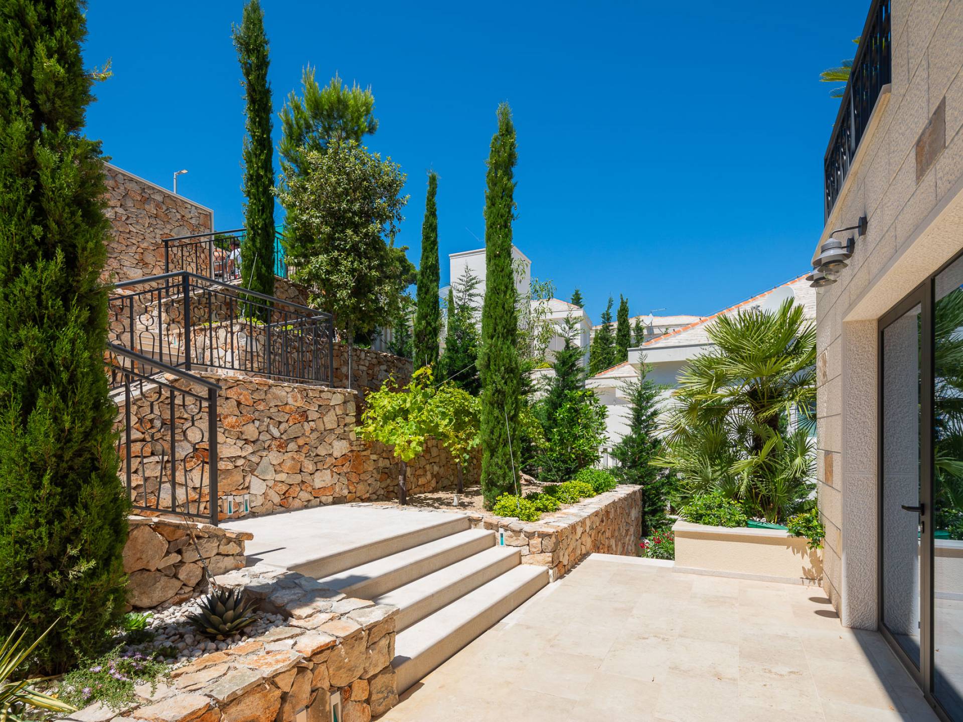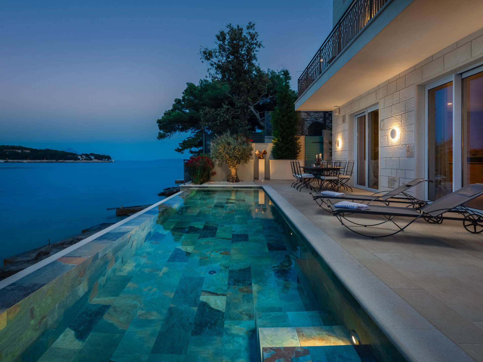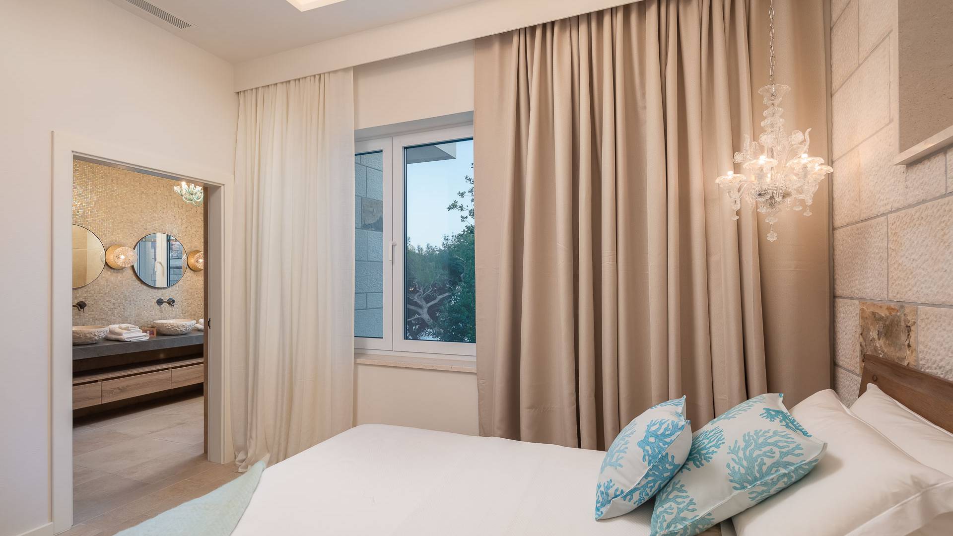 Inside, you’ll find four spacious ensuite bedrooms with king-size beds, a professional-grade kitchen, a wine cellar, and a comfortable living room featuring a 6×4m panoramic window with spectacular views of Sumartin and the Biokovo Mountains . Per rilassamento e benessere, la villa include un