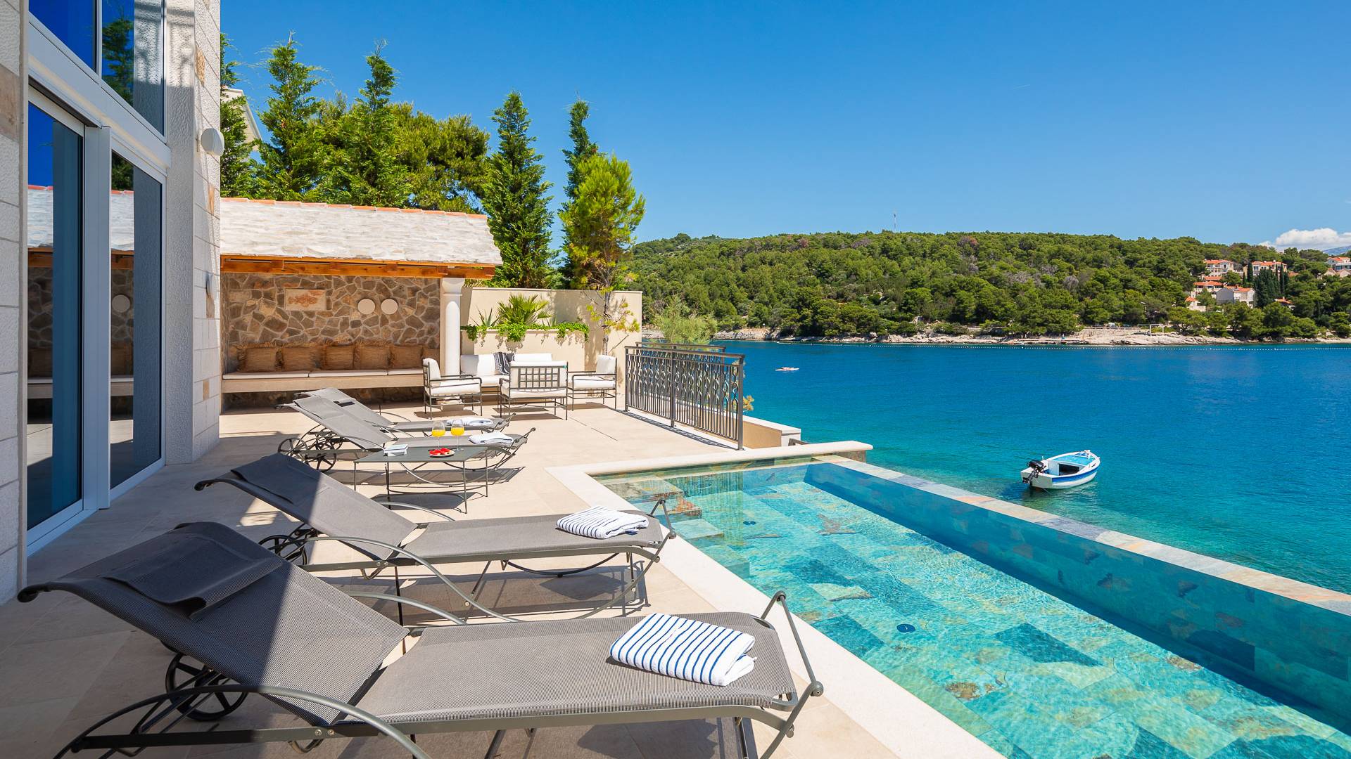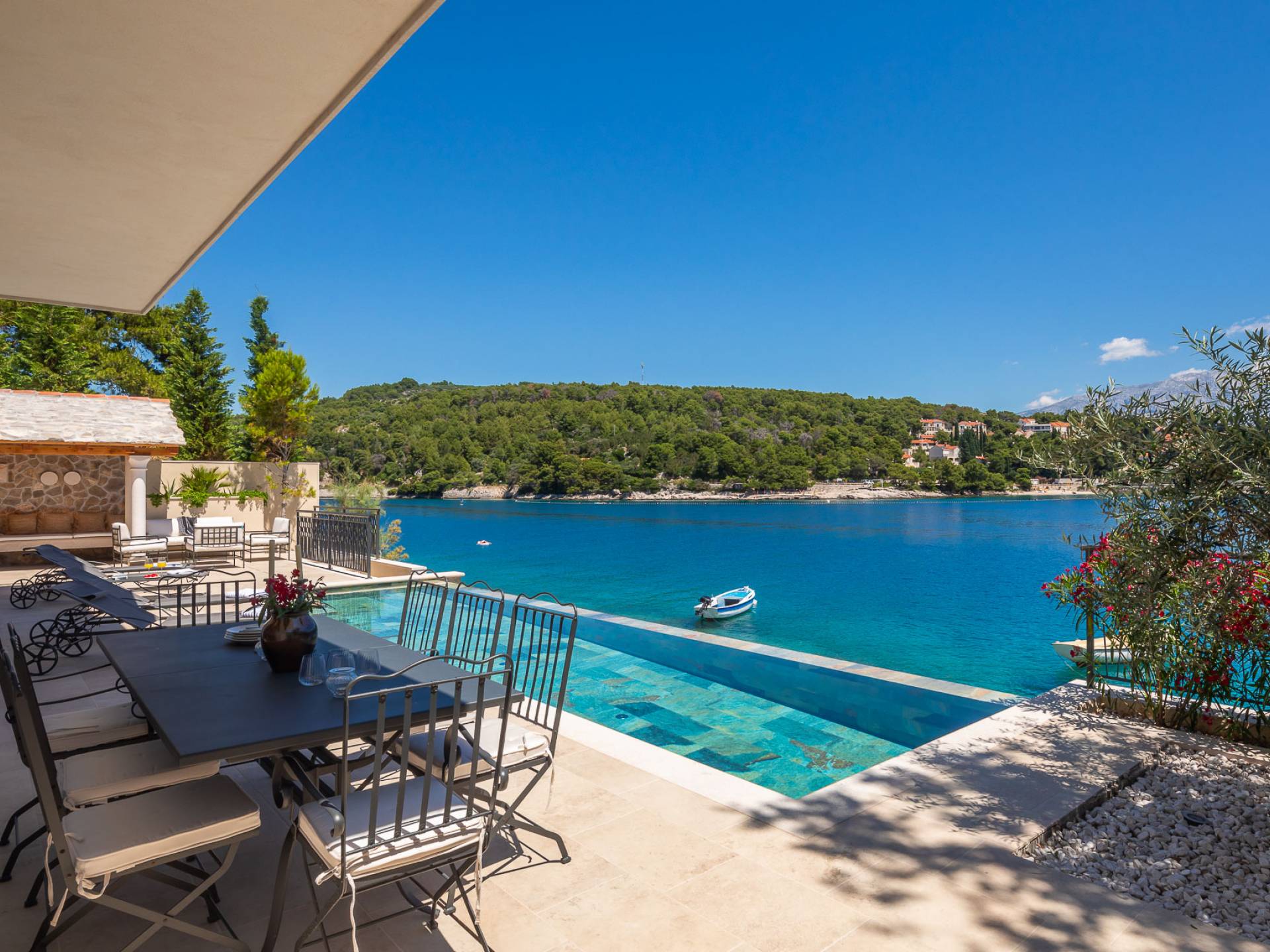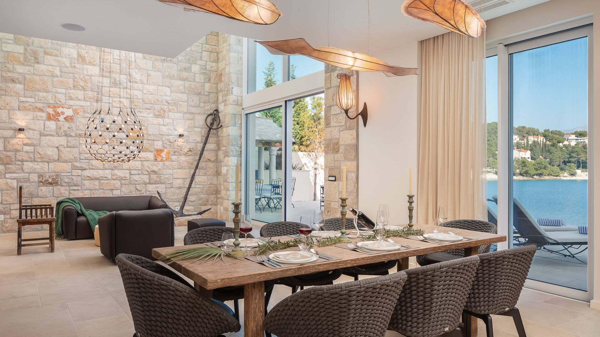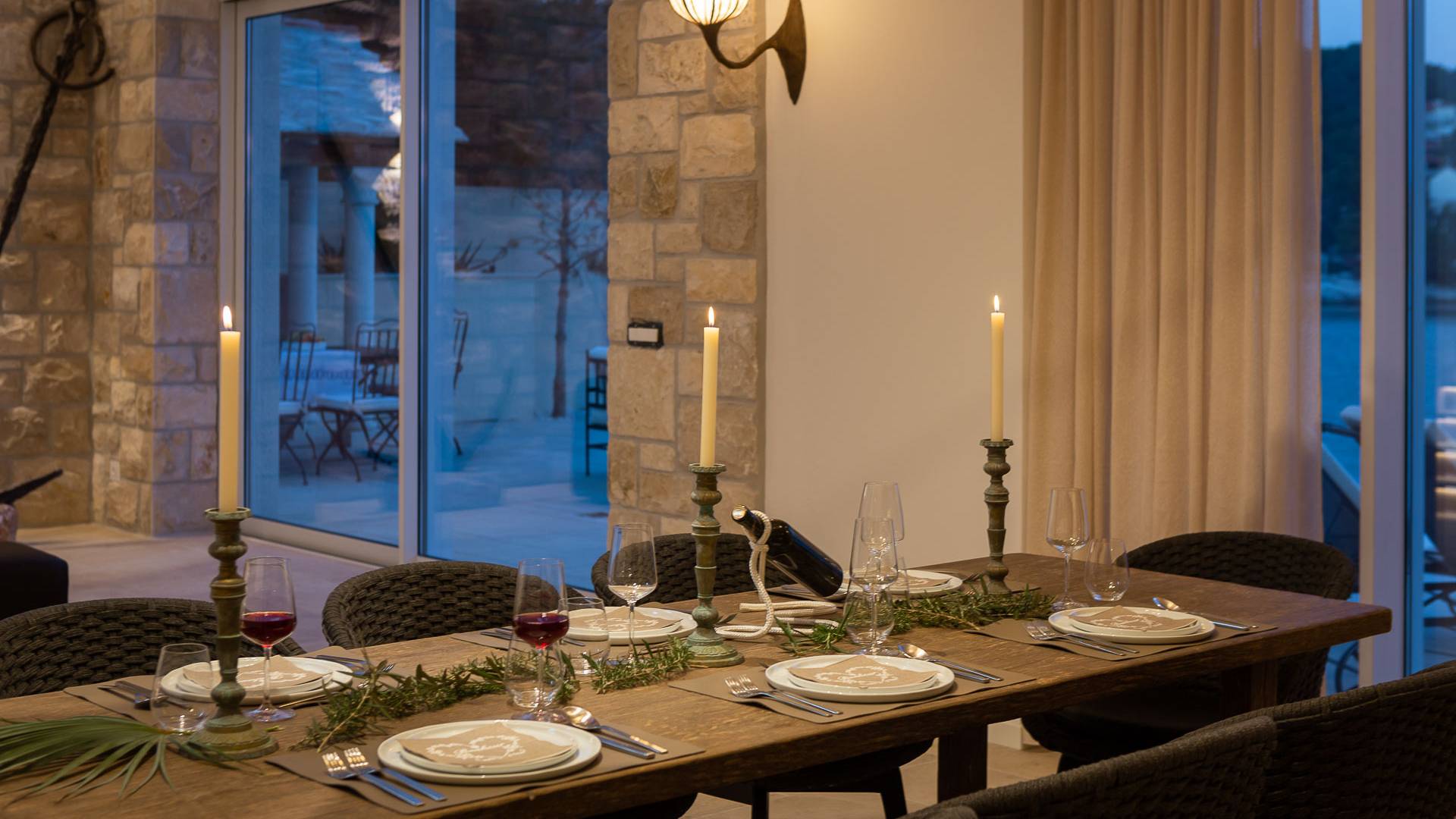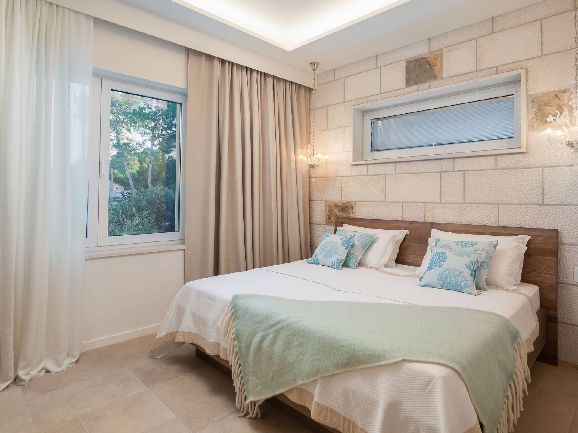 Inside, you’ll find four spacious ensuite bedrooms with king-size beds, a professional-grade kitchen, a wine cellar, and a comfortable living room featuring a 6×4m panoramic window with spectacular views of Sumartin and the Biokovo Mountains . Per rilassamento e benessere, la villa include un