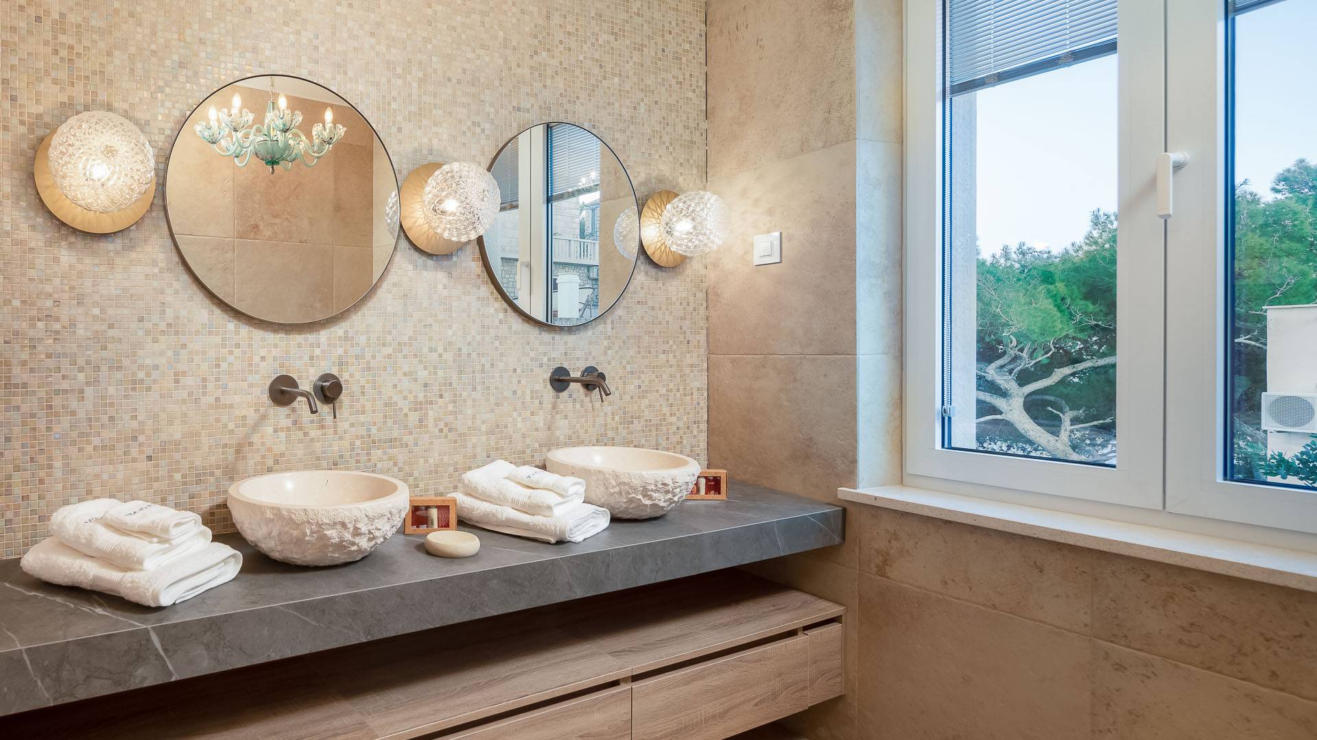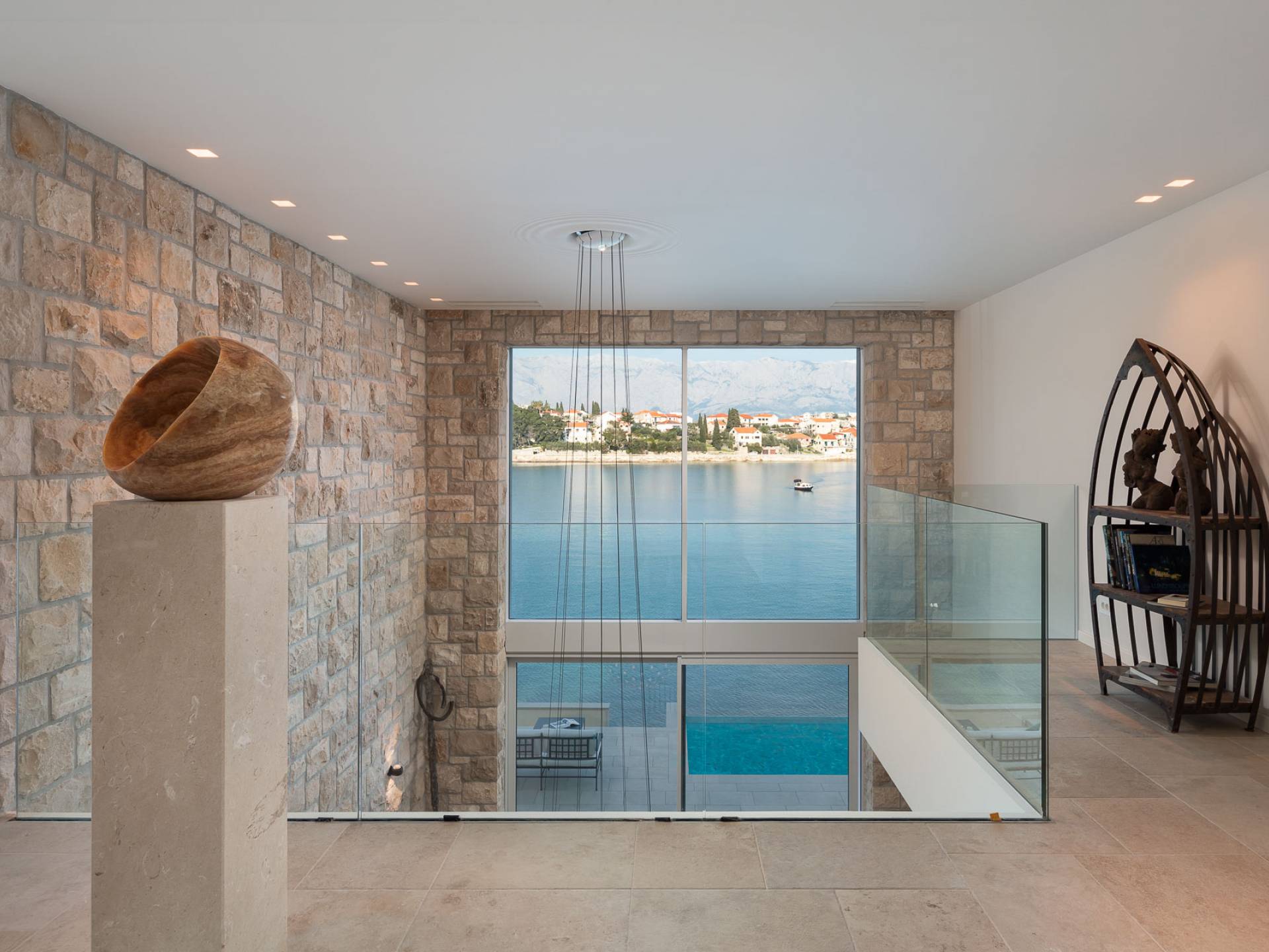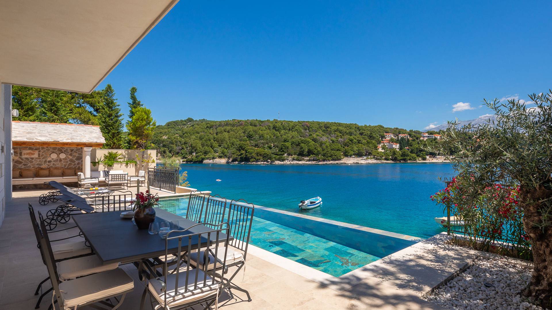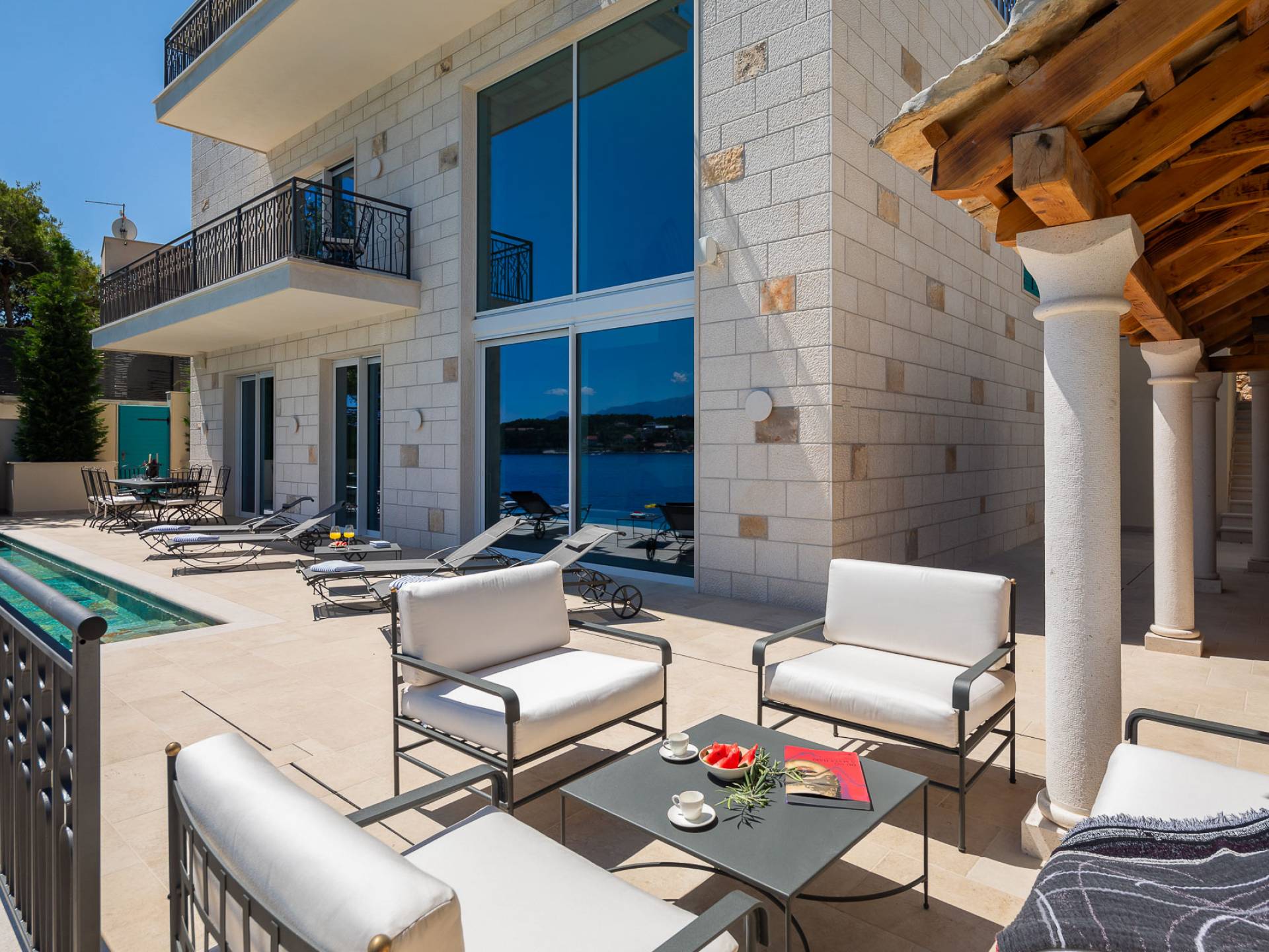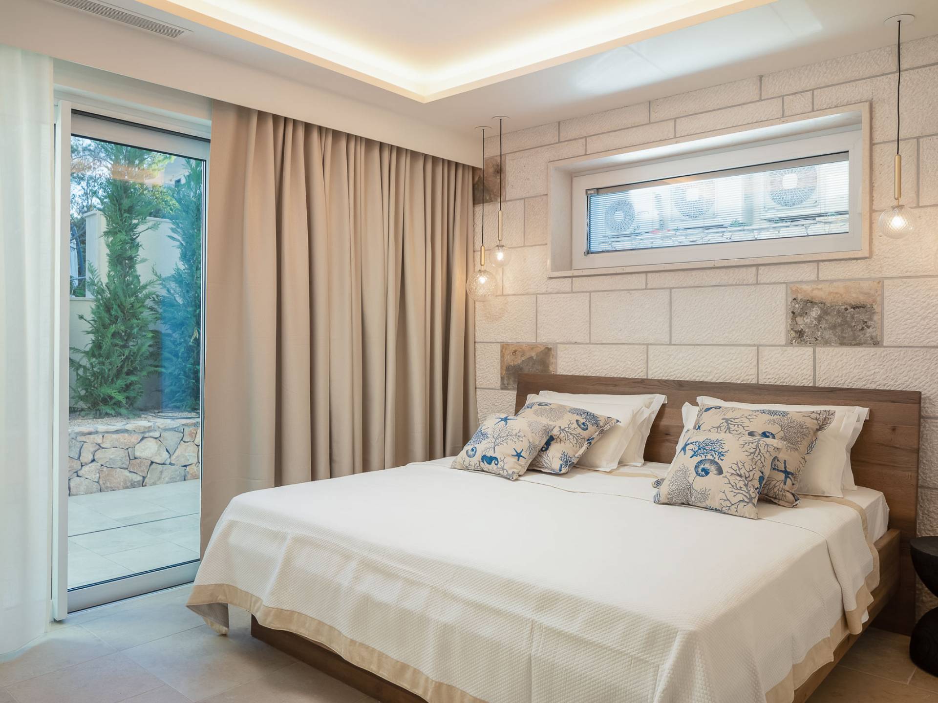 Inside, you’ll find four spacious ensuite bedrooms with king-size beds, a professional-grade kitchen, a wine cellar, and a comfortable living room featuring a 6×4m panoramic window with spectacular views of Sumartin and the Biokovo Mountains . Per rilassamento e benessere, la villa include un