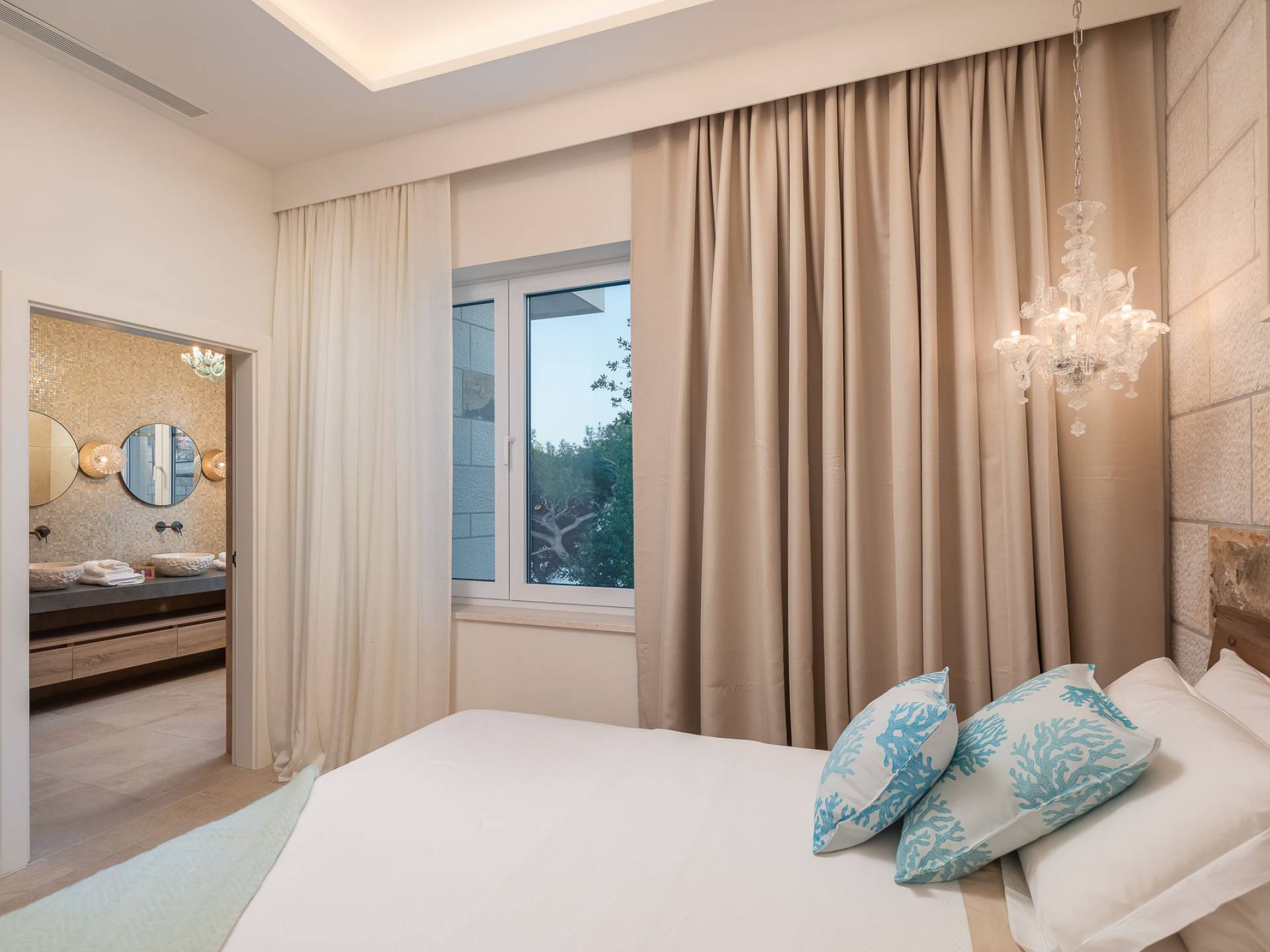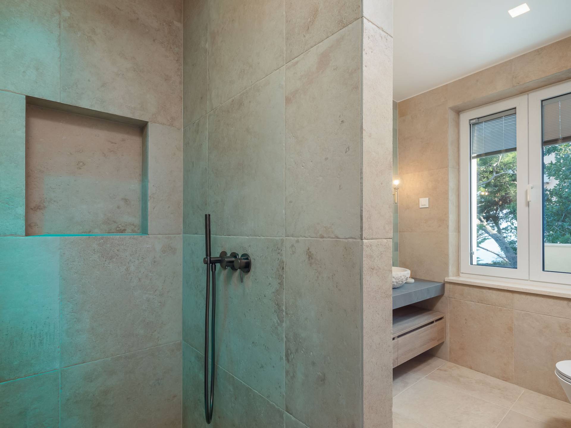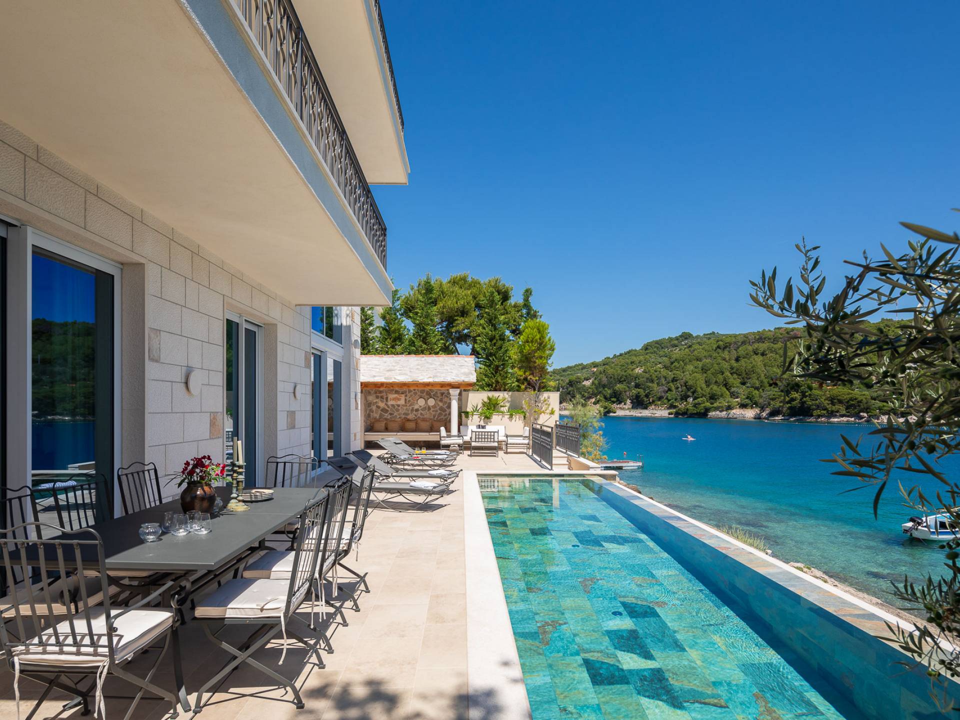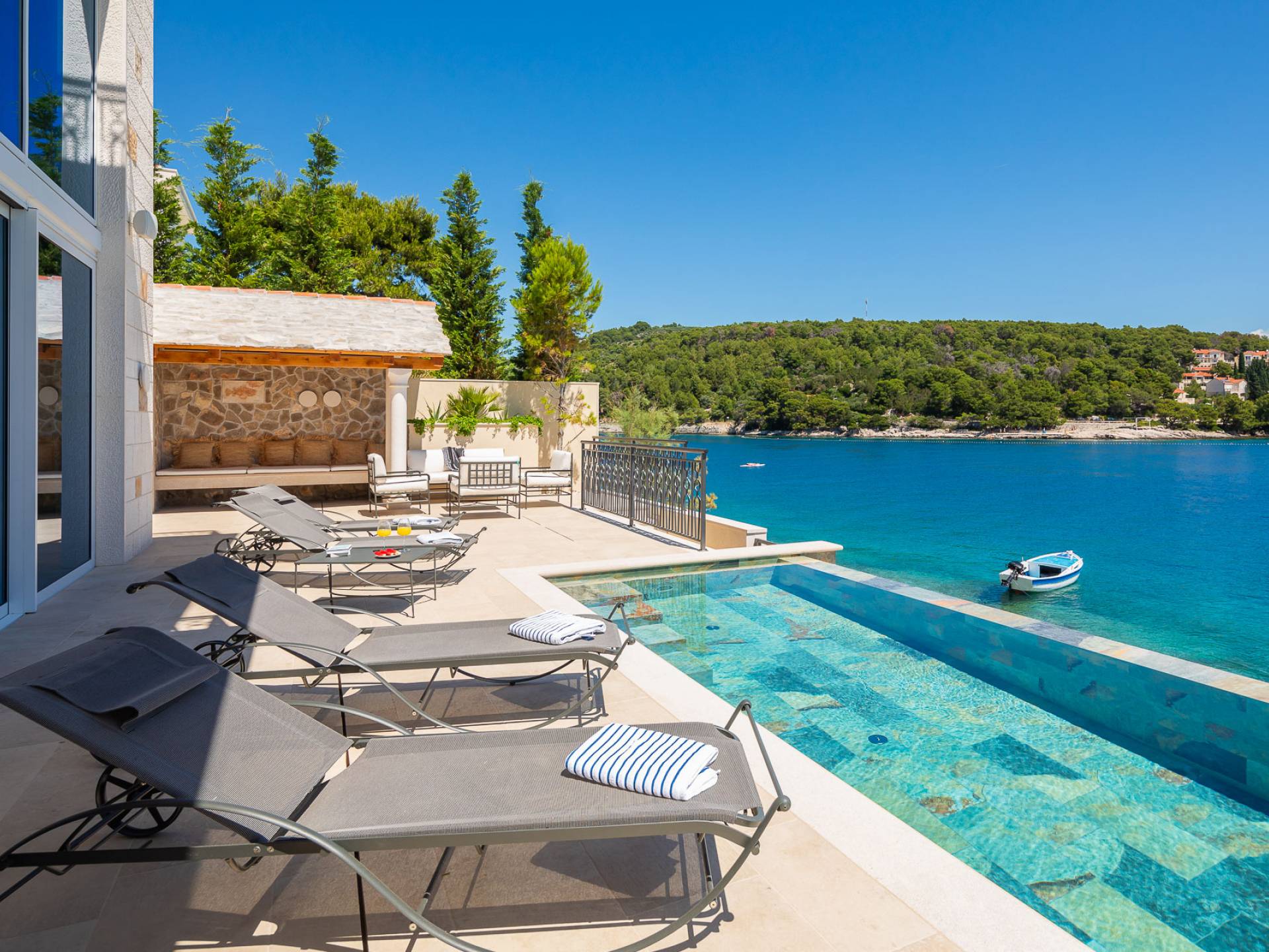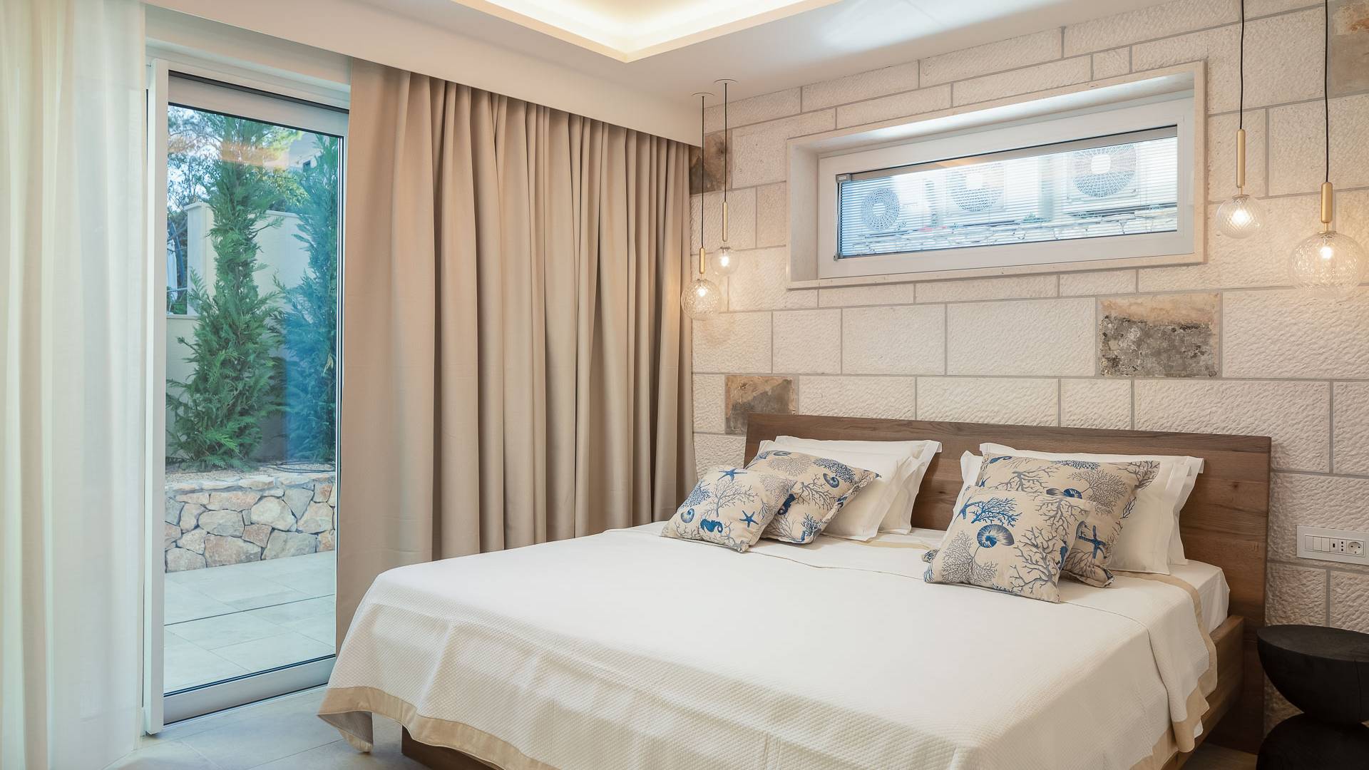 Inside, you’ll find four spacious ensuite bedrooms with king-size beds, a professional-grade kitchen, a wine cellar, and a comfortable living room featuring a 6×4m panoramic window with spectacular views of Sumartin and the Biokovo Mountains . Per rilassamento e benessere, la villa include un