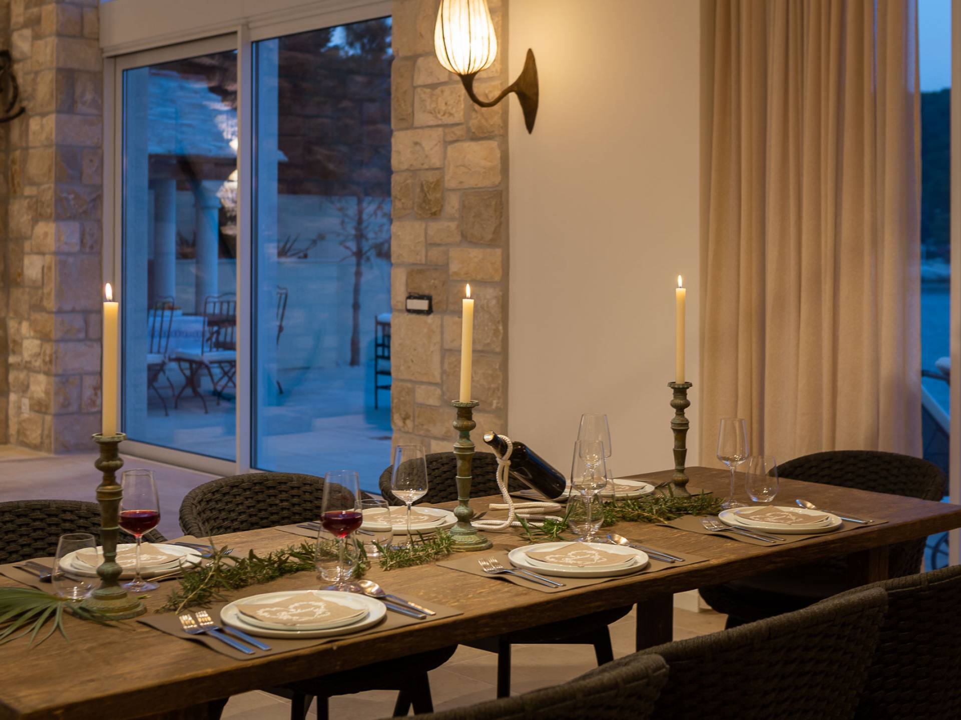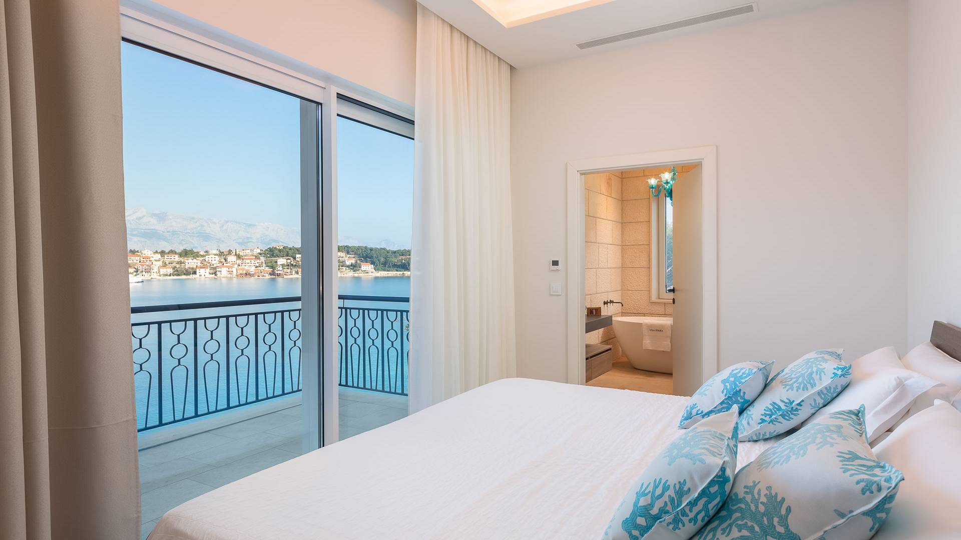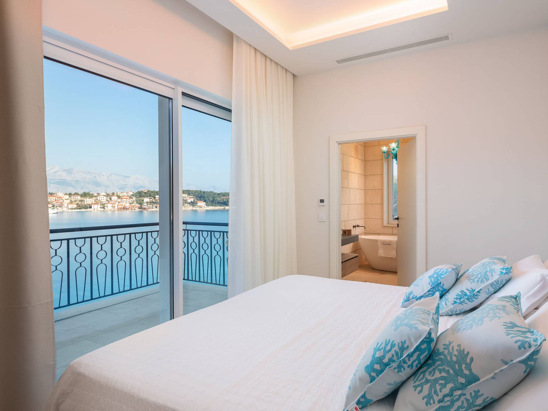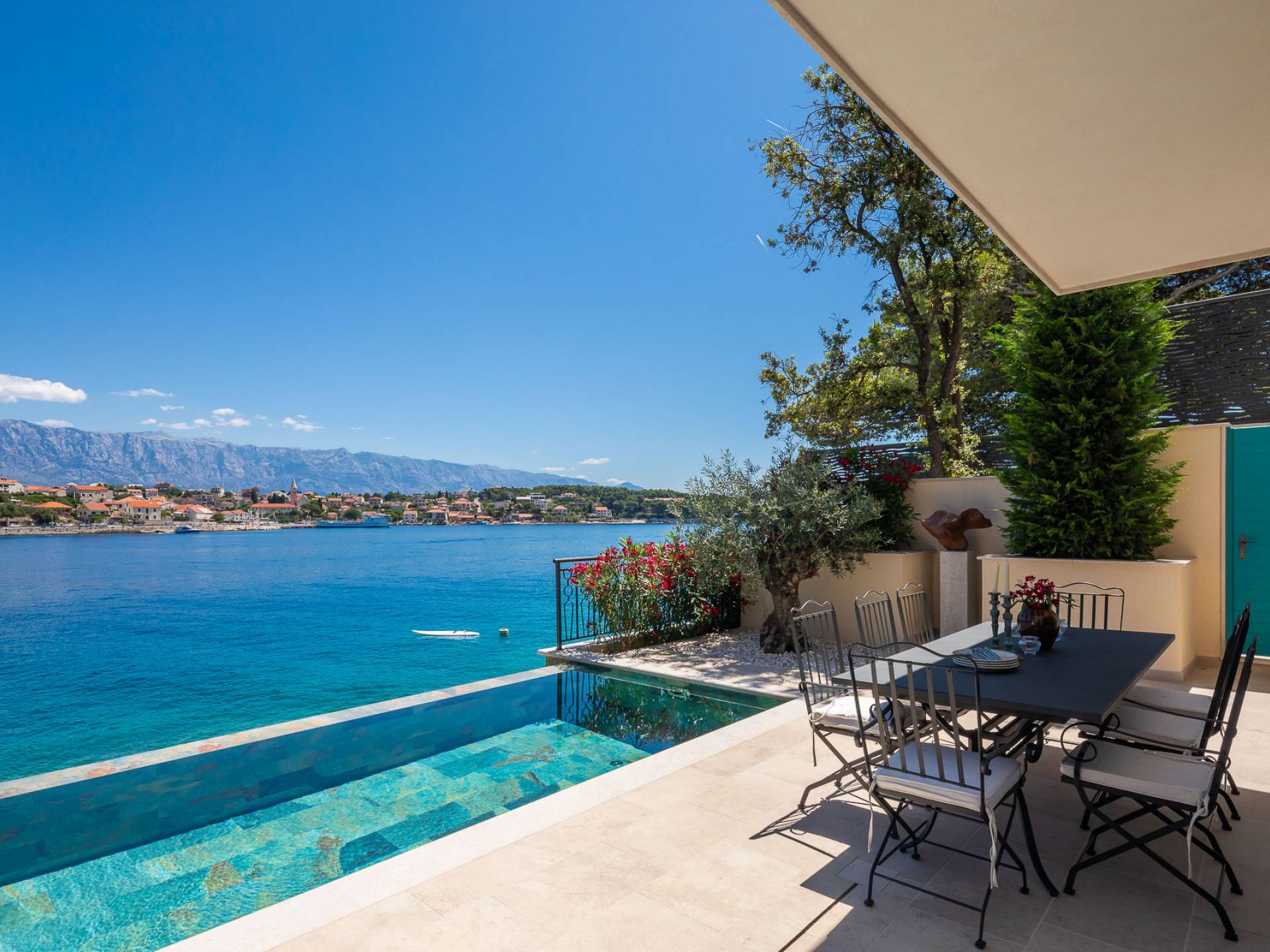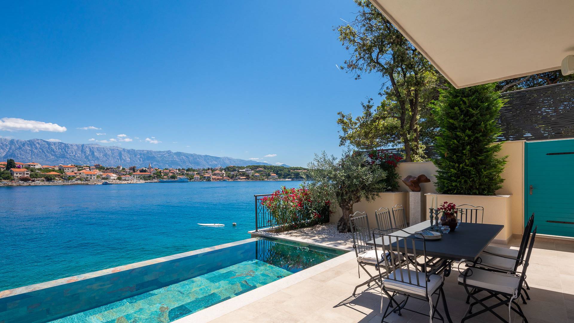Inside, you’ll find four spacious ensuite bedrooms with king-size beds, a professional-grade kitchen, a wine cellar, and a comfortable living room featuring a 6×4m panoramic window with spectacular views of Sumartin and the Biokovo Mountains . Per rilassamento e benessere, la villa include un