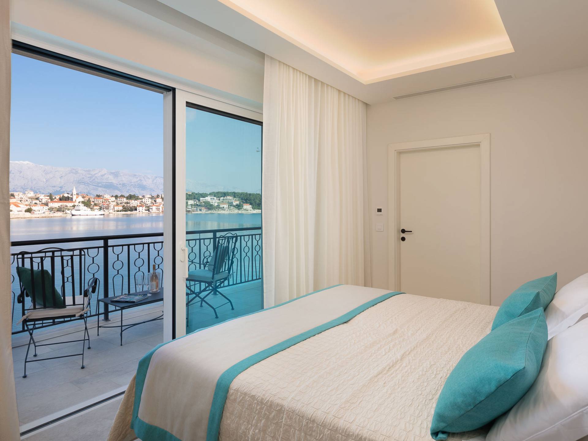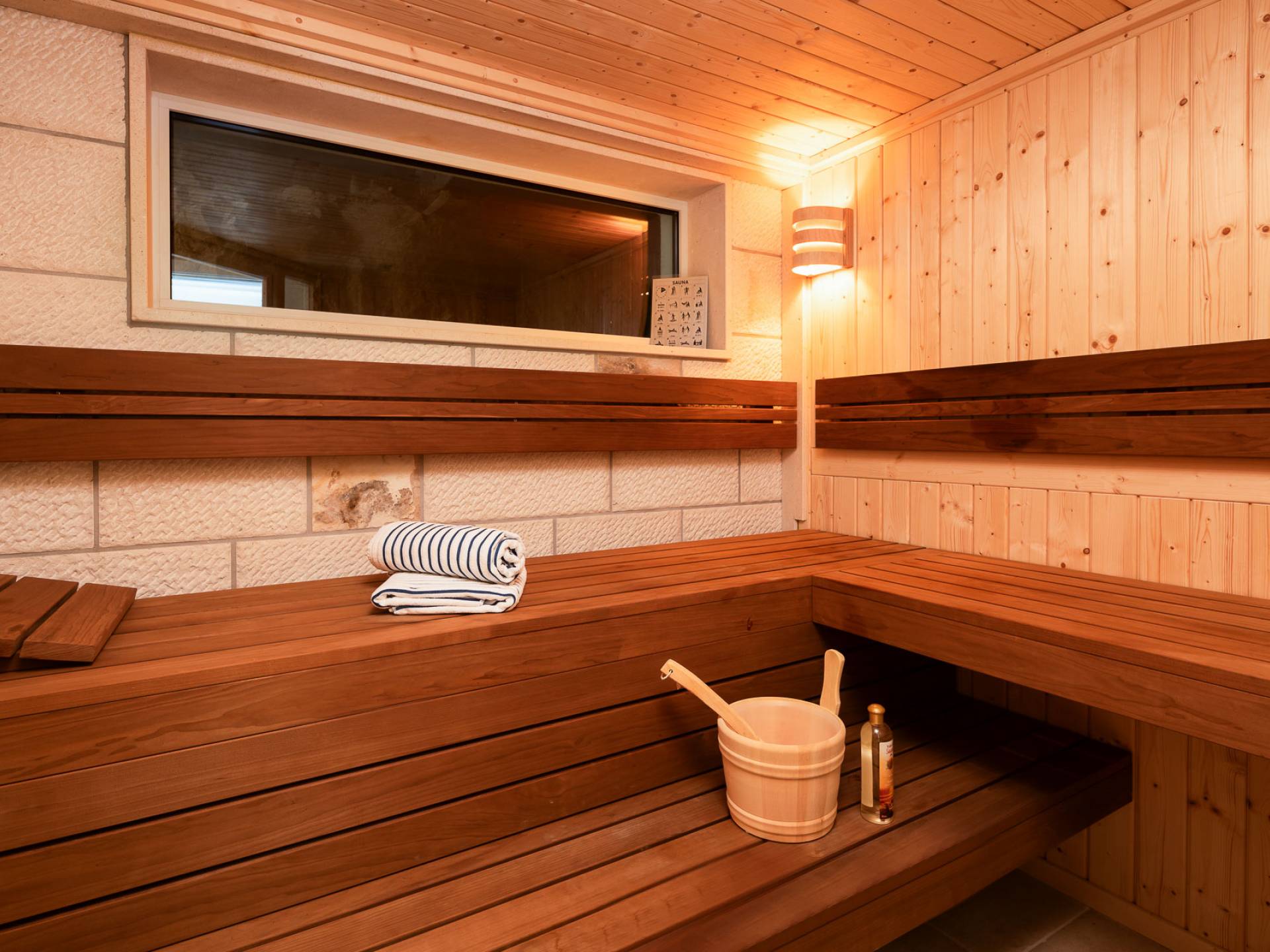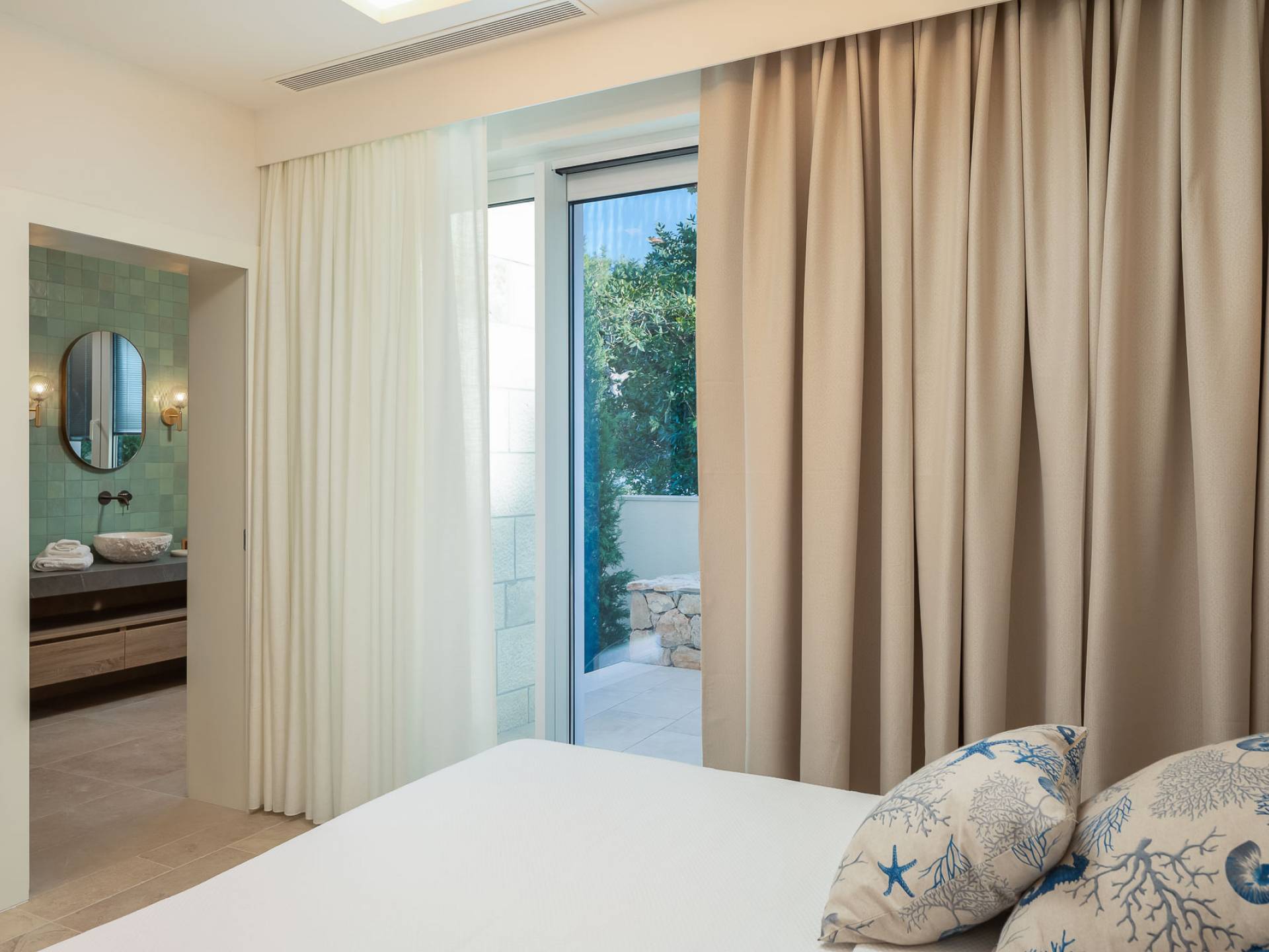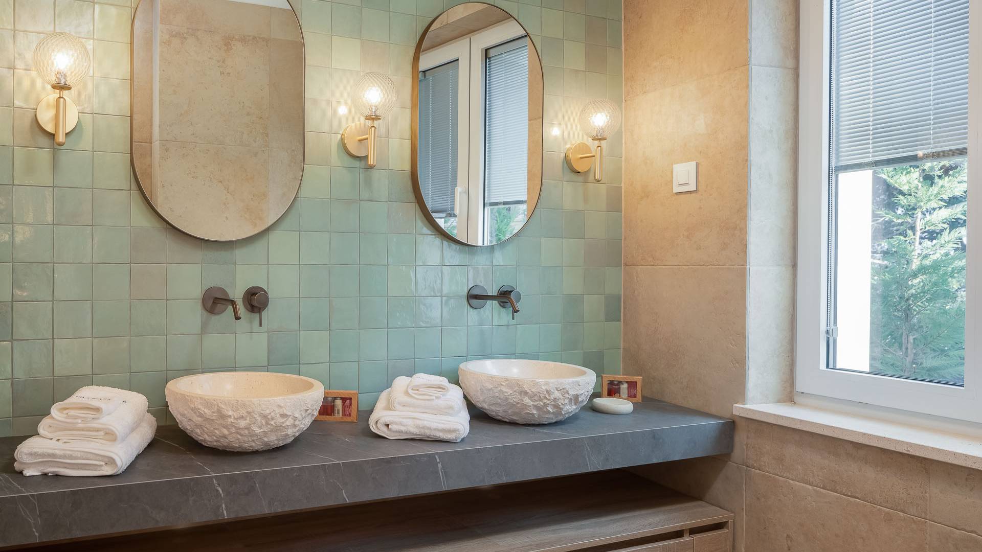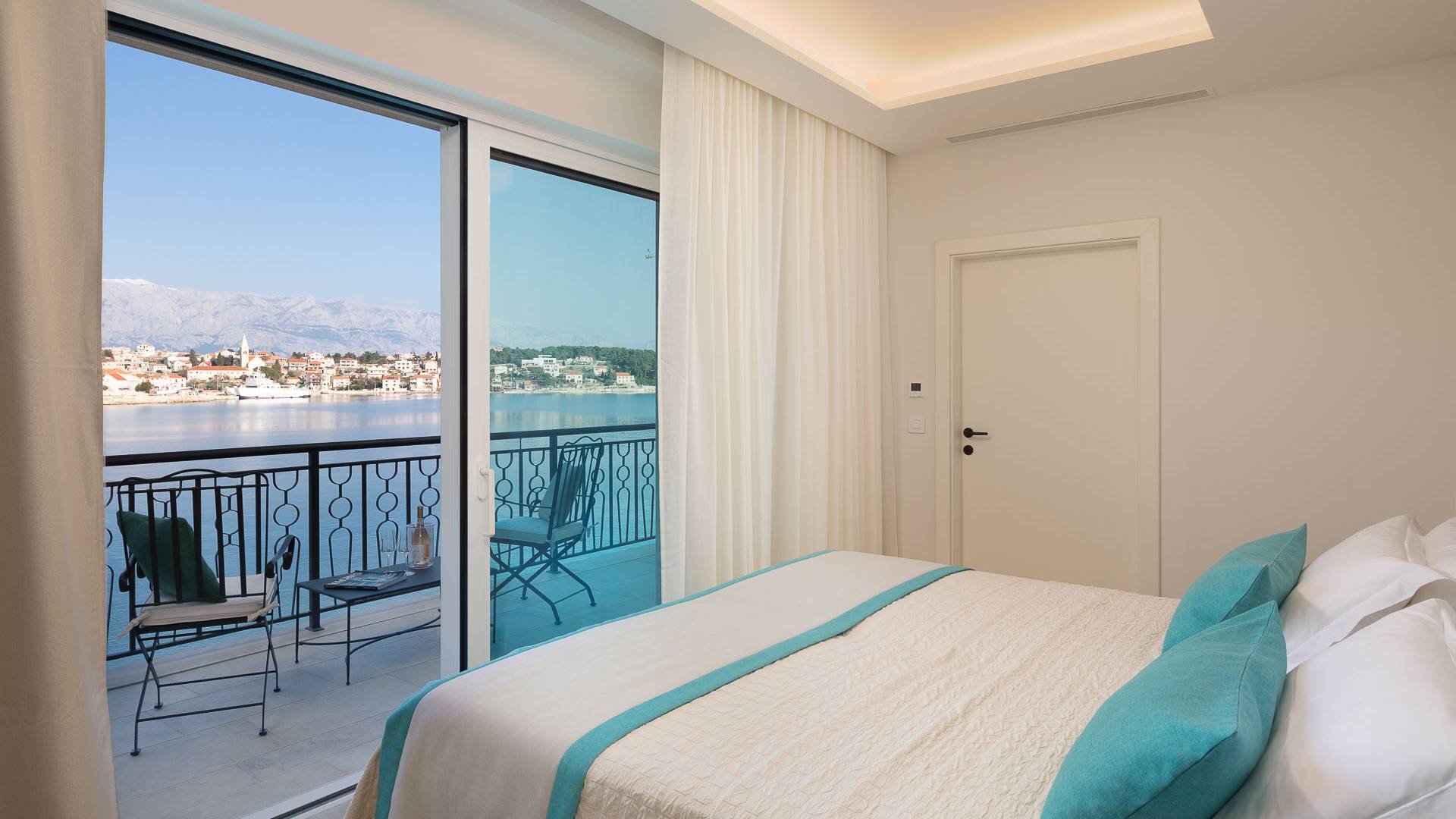 Inside, you’ll find four spacious ensuite bedrooms with king-size beds, a professional-grade kitchen, a wine cellar, and a comfortable living room featuring a 6×4m panoramic window with spectacular views of Sumartin and the Biokovo Mountains . Per rilassamento e benessere, la villa include un