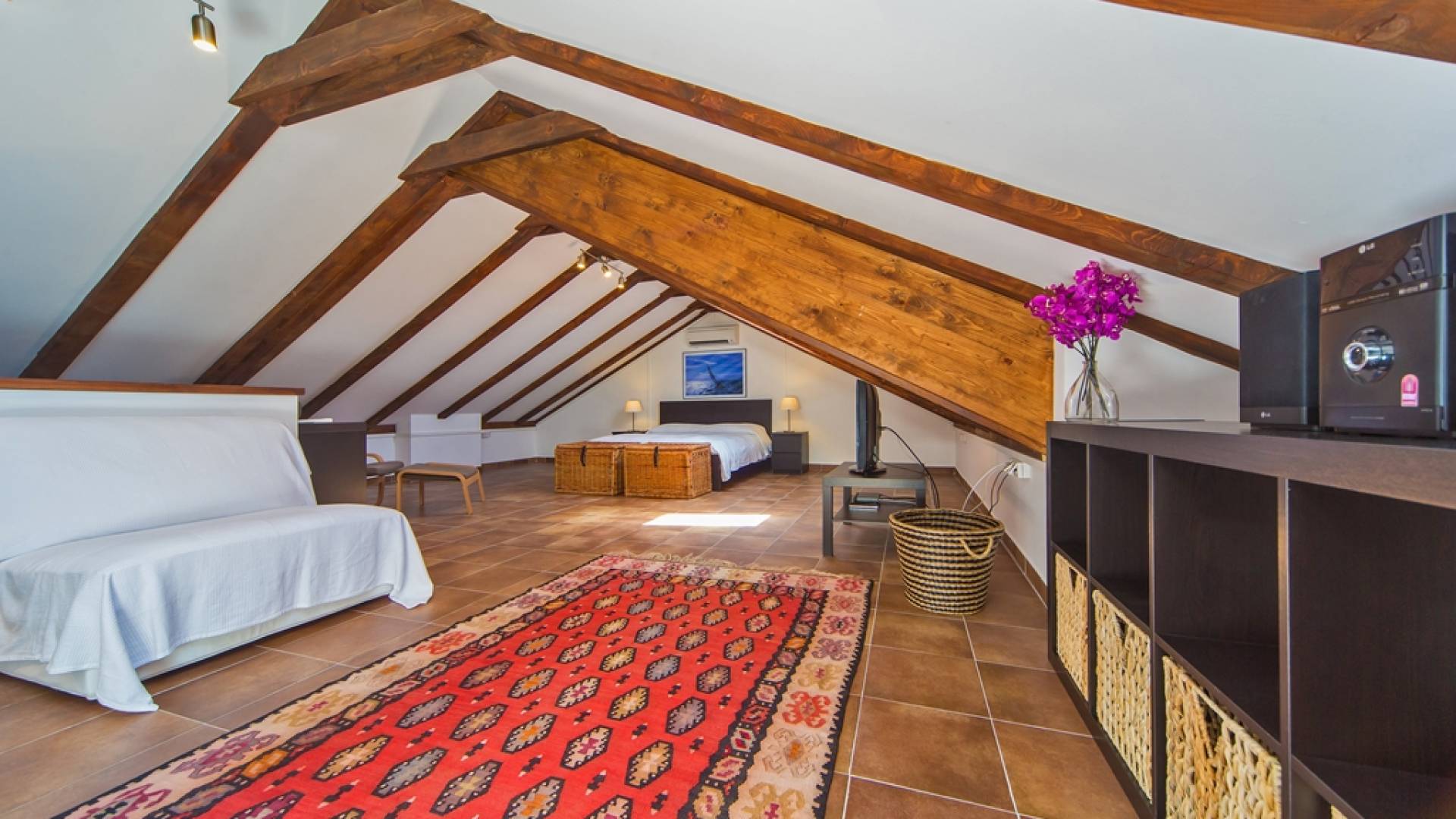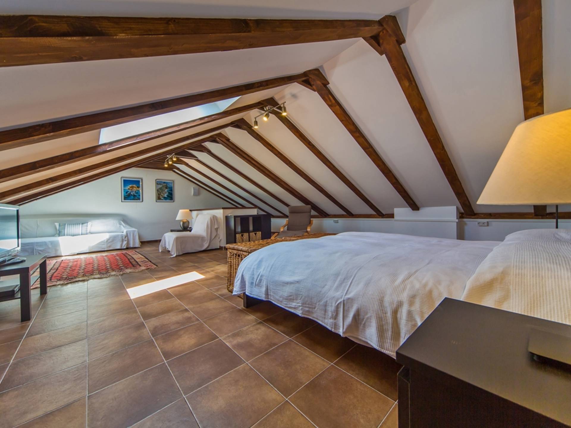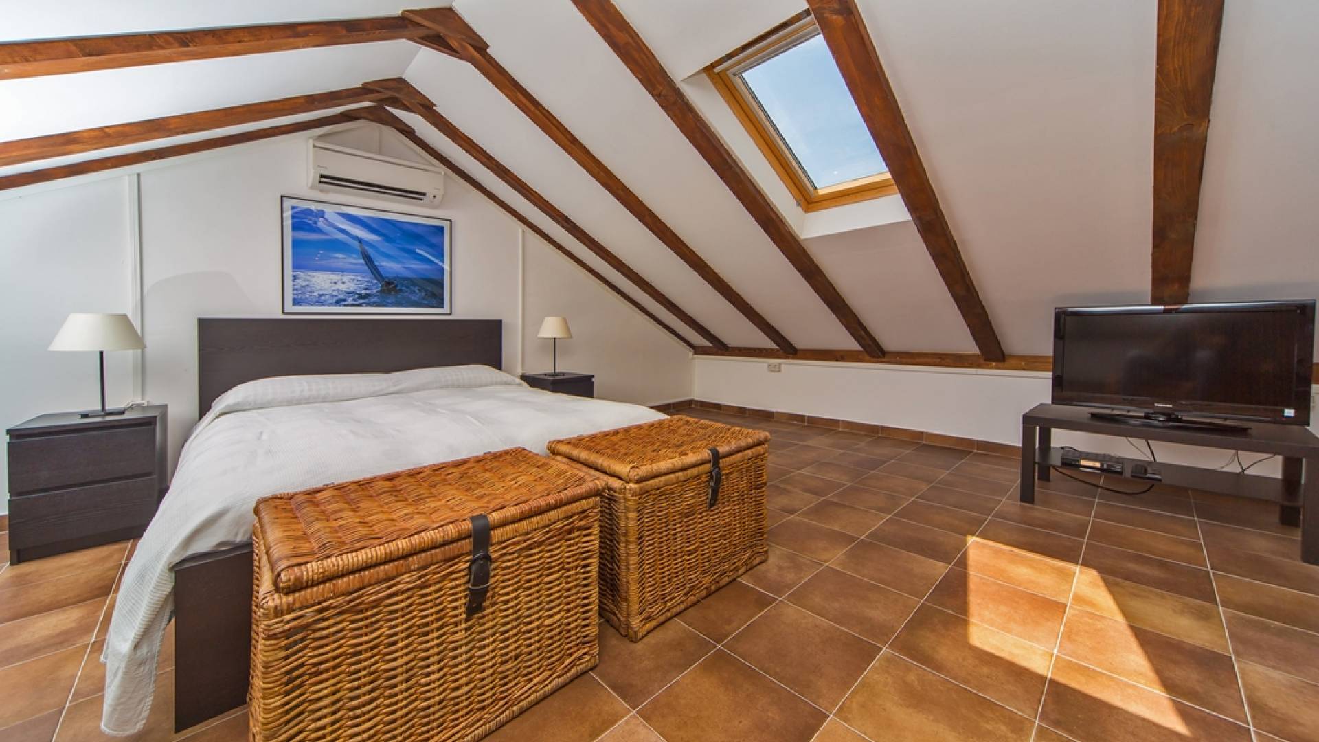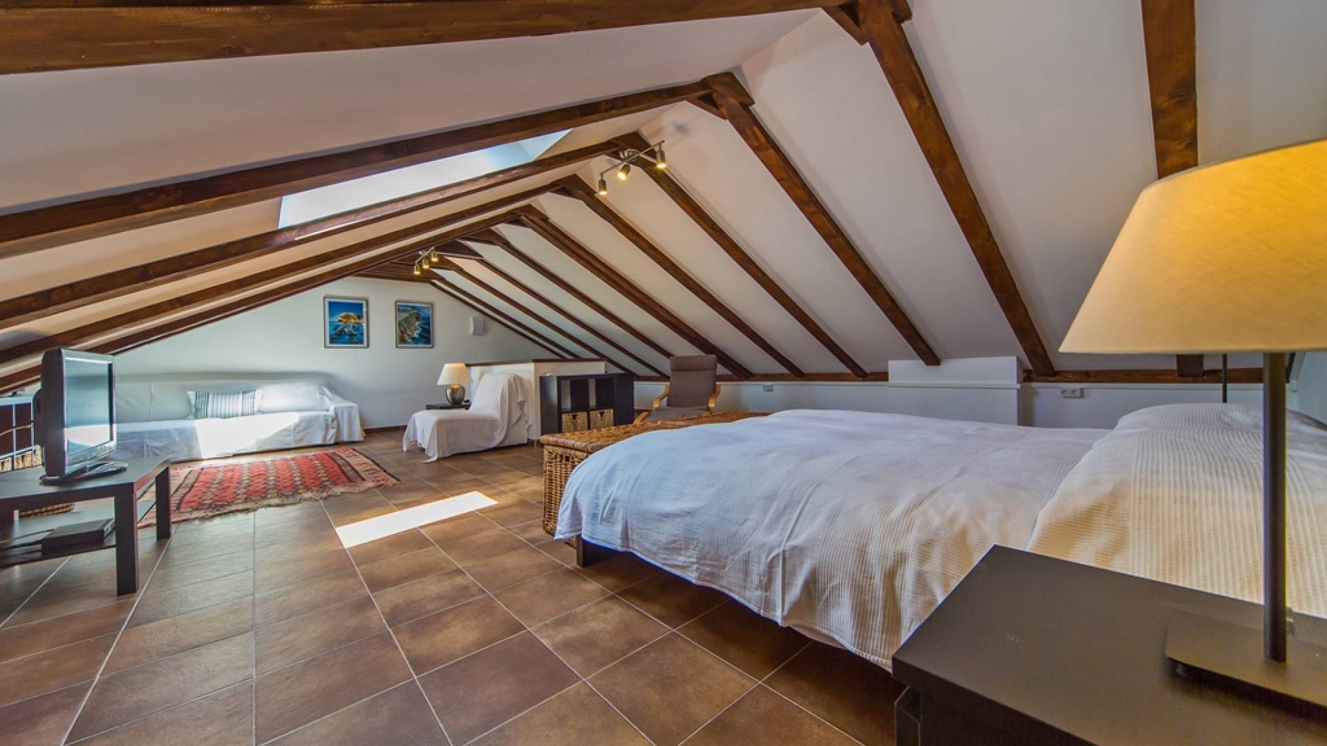 Il primo piano è composto da 3 camere da letto (una con letto matrimoniale e due con letti singoli, una delle quali offre anche due letti estraibili extra). Ci sono anche 2 bagni uno con doccia e l'altro con vasca full size. La terrazza antistante è arredata con comodi mobili da esterno e ombrelloni. La mansarda è stata mantenuta come un ampio open space con un letto matrimoniale da un lato e una zona giorno con un divano letto dall'altro. Il divano letto può essere convertito in un letto queen size.