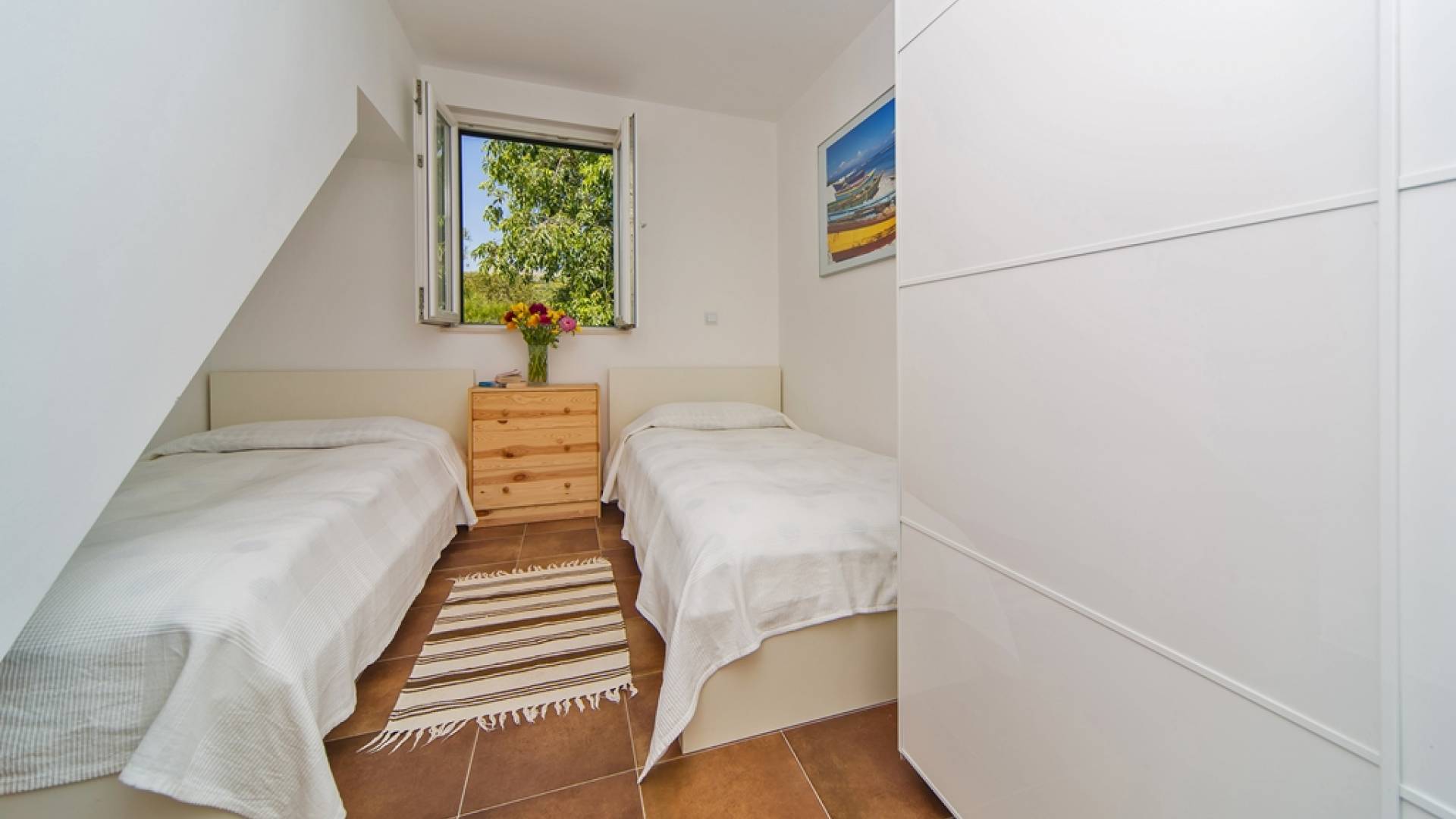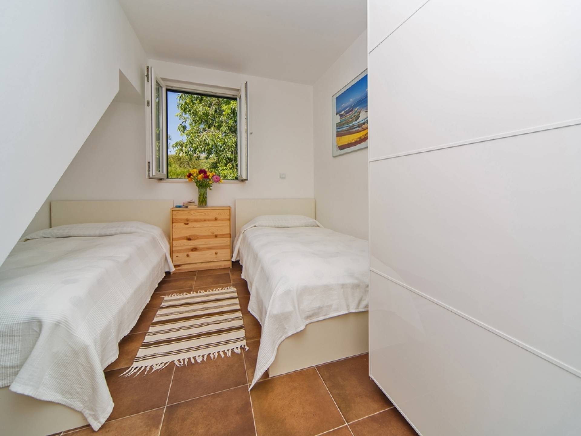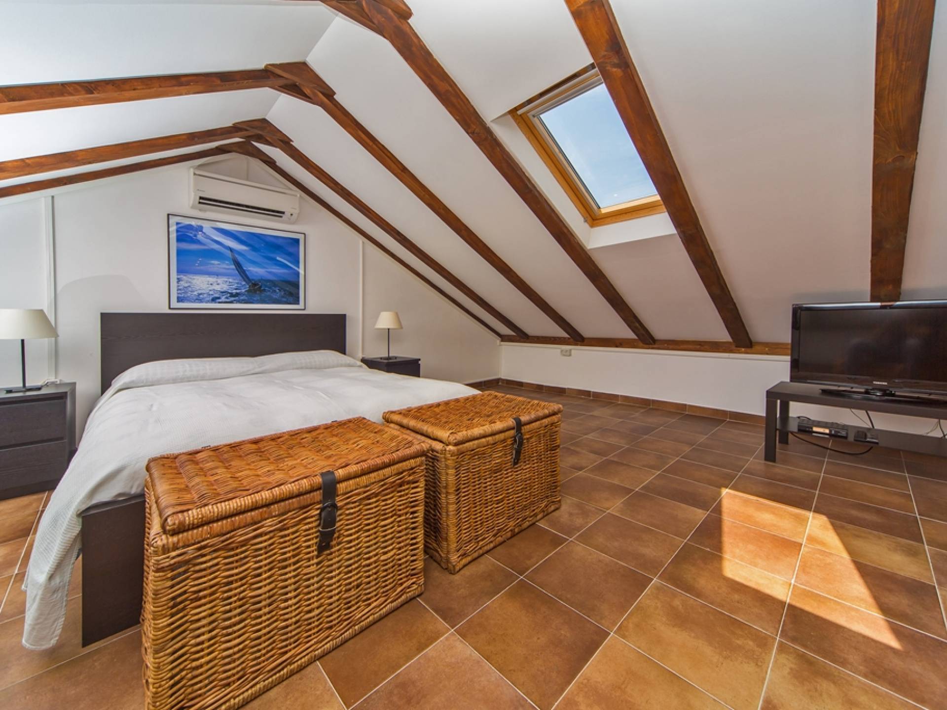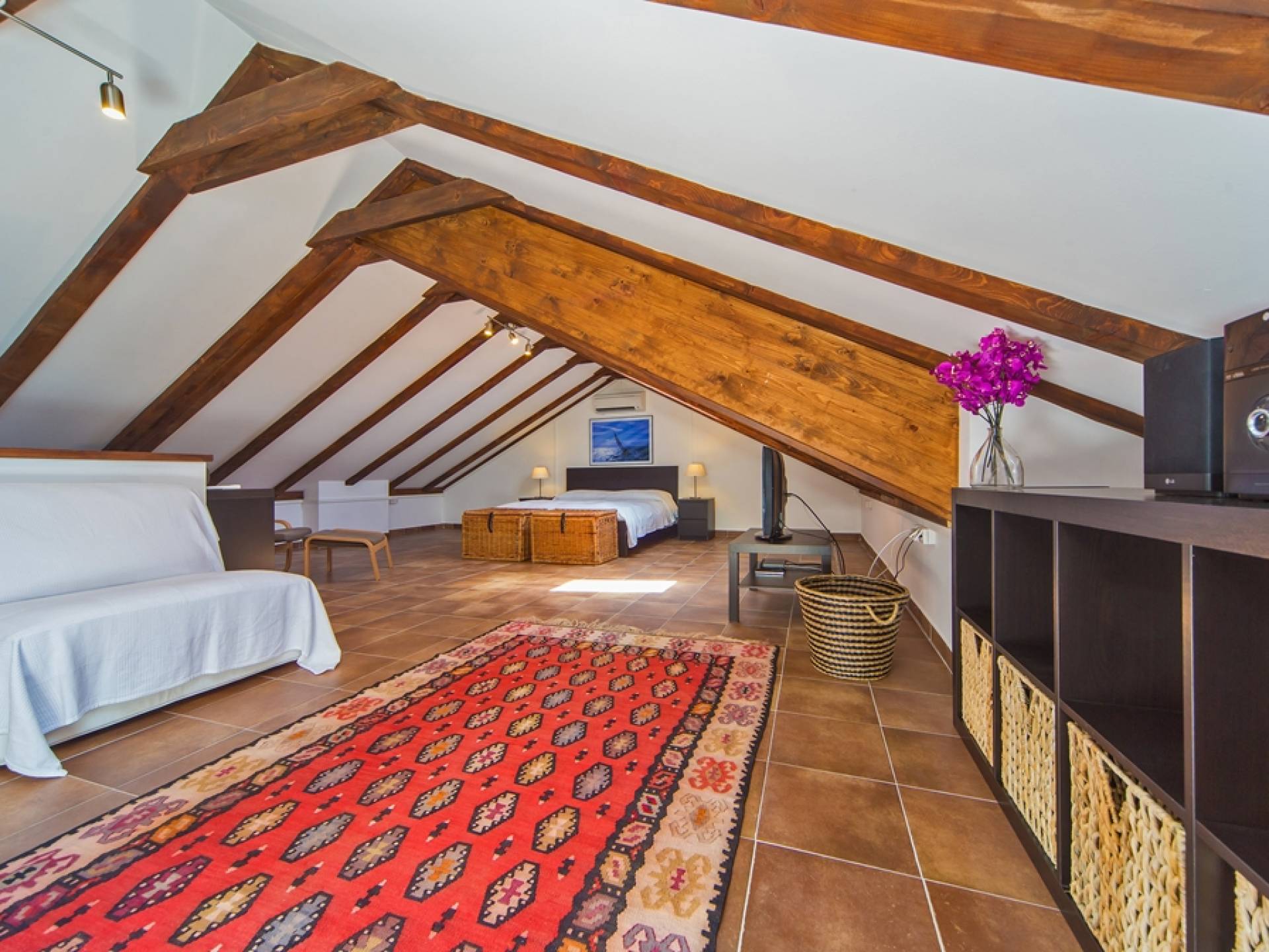 Il primo piano è composto da 3 camere da letto (una con letto matrimoniale e due con letti singoli, una delle quali offre anche due letti estraibili extra). Ci sono anche 2 bagni uno con doccia e l'altro con vasca full size. La terrazza antistante è arredata con comodi mobili da esterno e ombrelloni. La mansarda è stata mantenuta come un ampio open space con un letto matrimoniale da un lato e una zona giorno con un divano letto dall'altro. Il divano letto può essere convertito in un letto queen size.