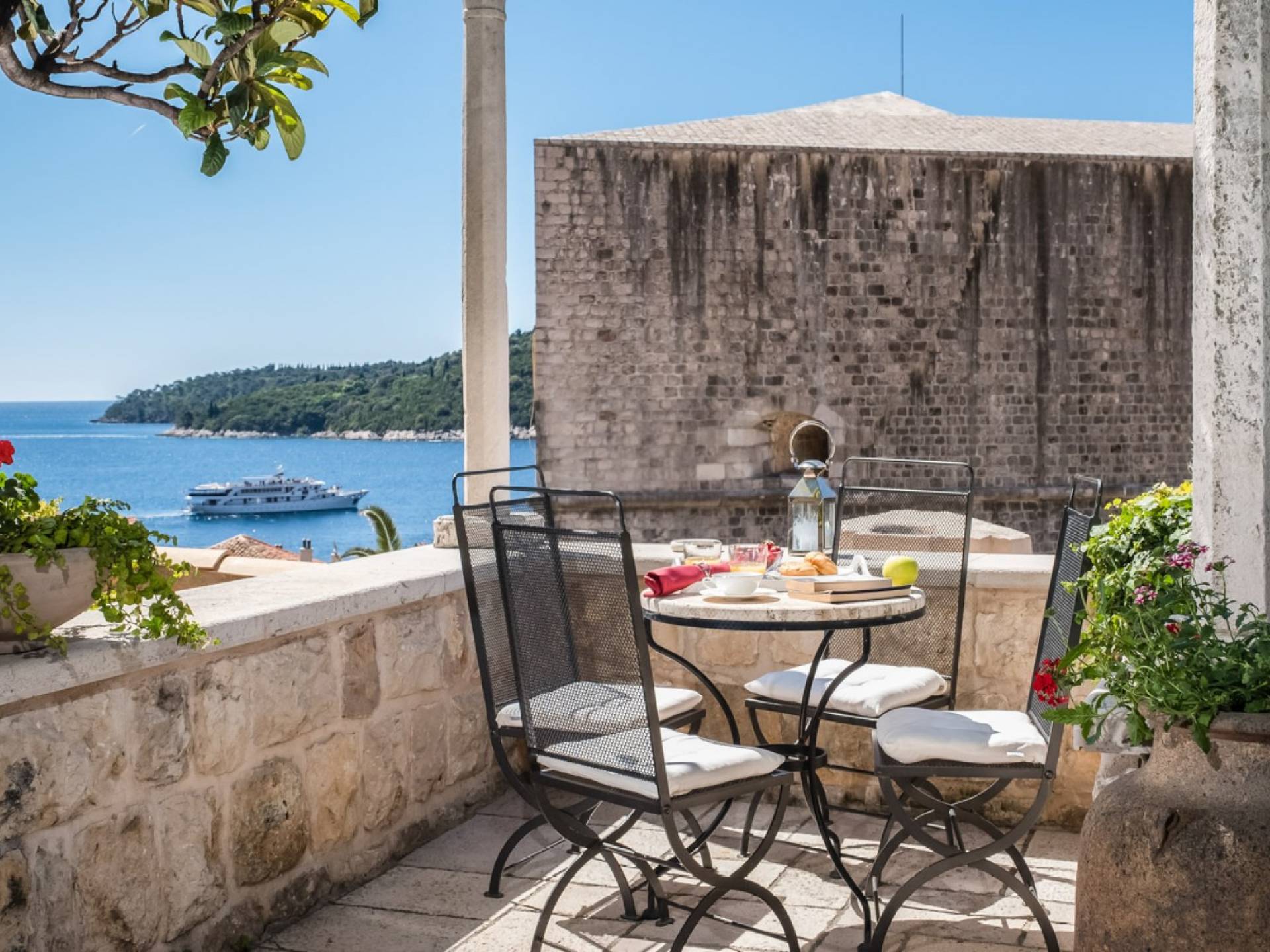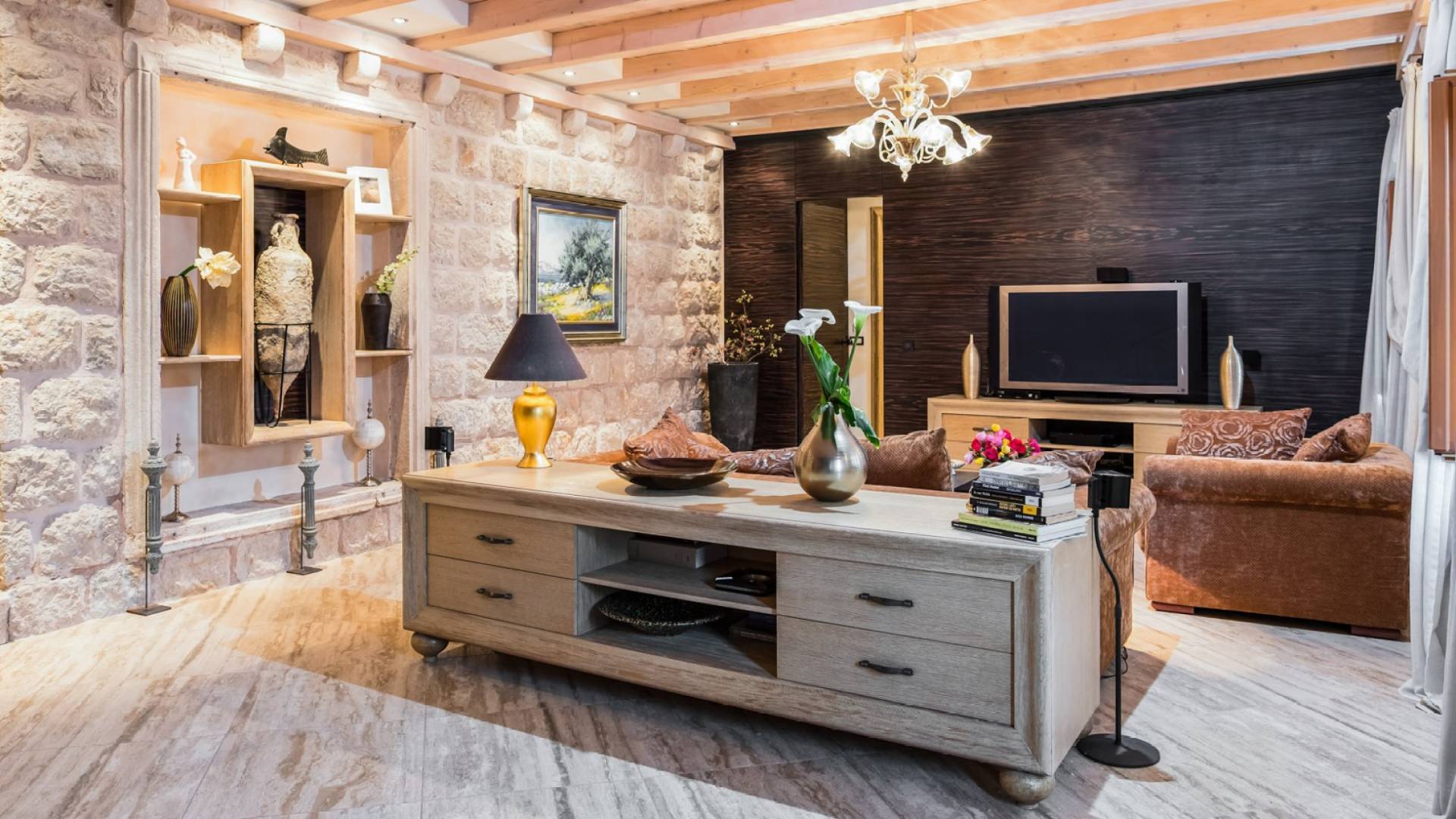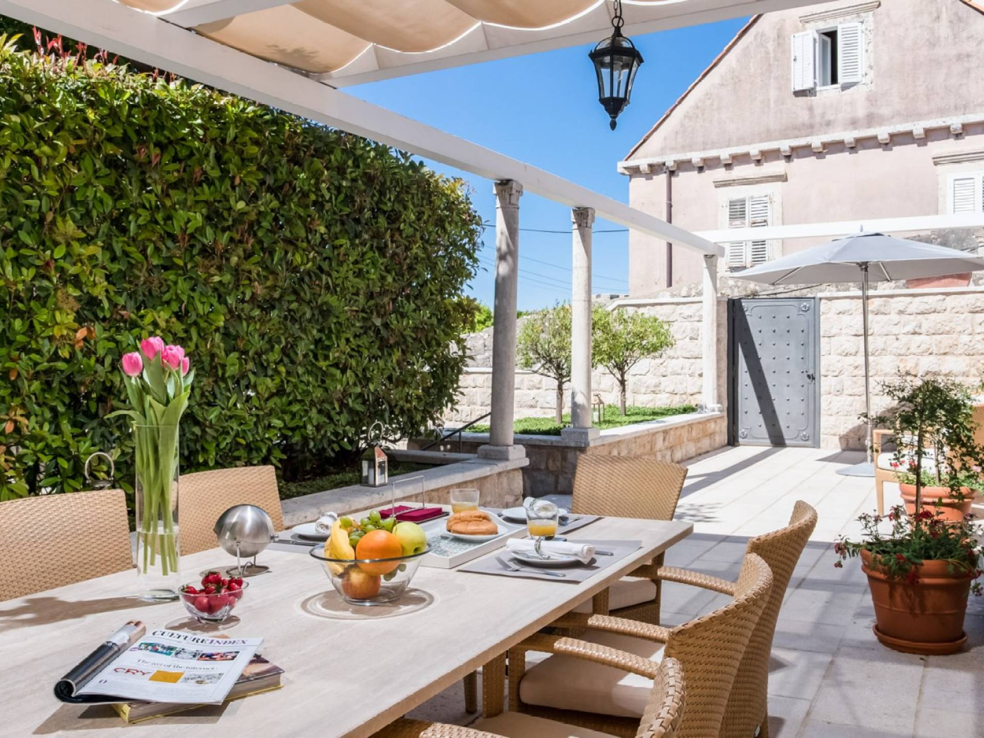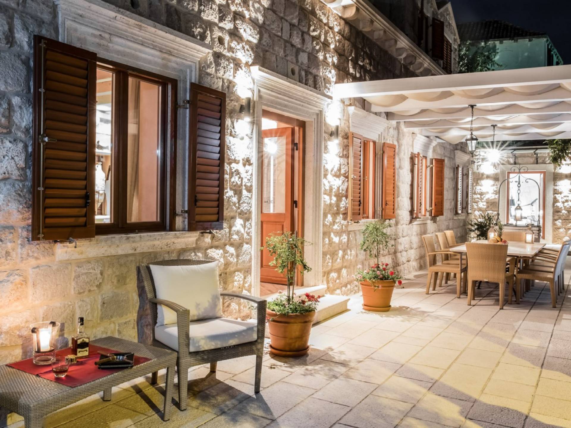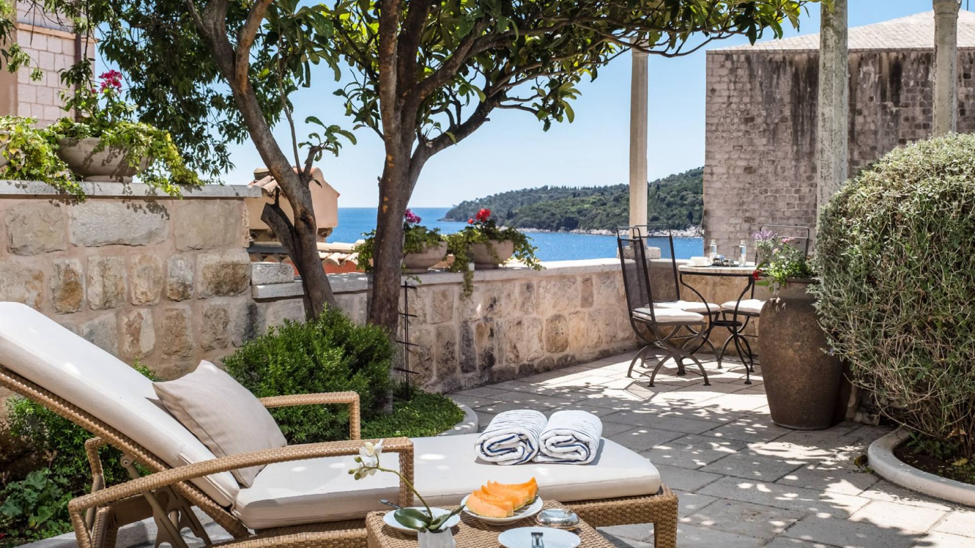 Dalla dependance, salendo alcuni gradini a sinistra, una delle caratteristiche più attraenti di questa Villa: l'intima terrazza da pranzo, con vista sulla fortezza, la punta orientale di Lokrum e una spruzzata dell'azzurro Adriatico. I tratti principali degli interni di Villa Muri di Dubrovnik includono una dose di raffinatezza classica, unita a pezzi d'arte selezionati e dettagli audaci e contemporanei. Quando entri dalla terrazza anteriore nel voluminoso salone con pareti in pietra arida, individua interessanti dipinti e anfore tra gli arredi.