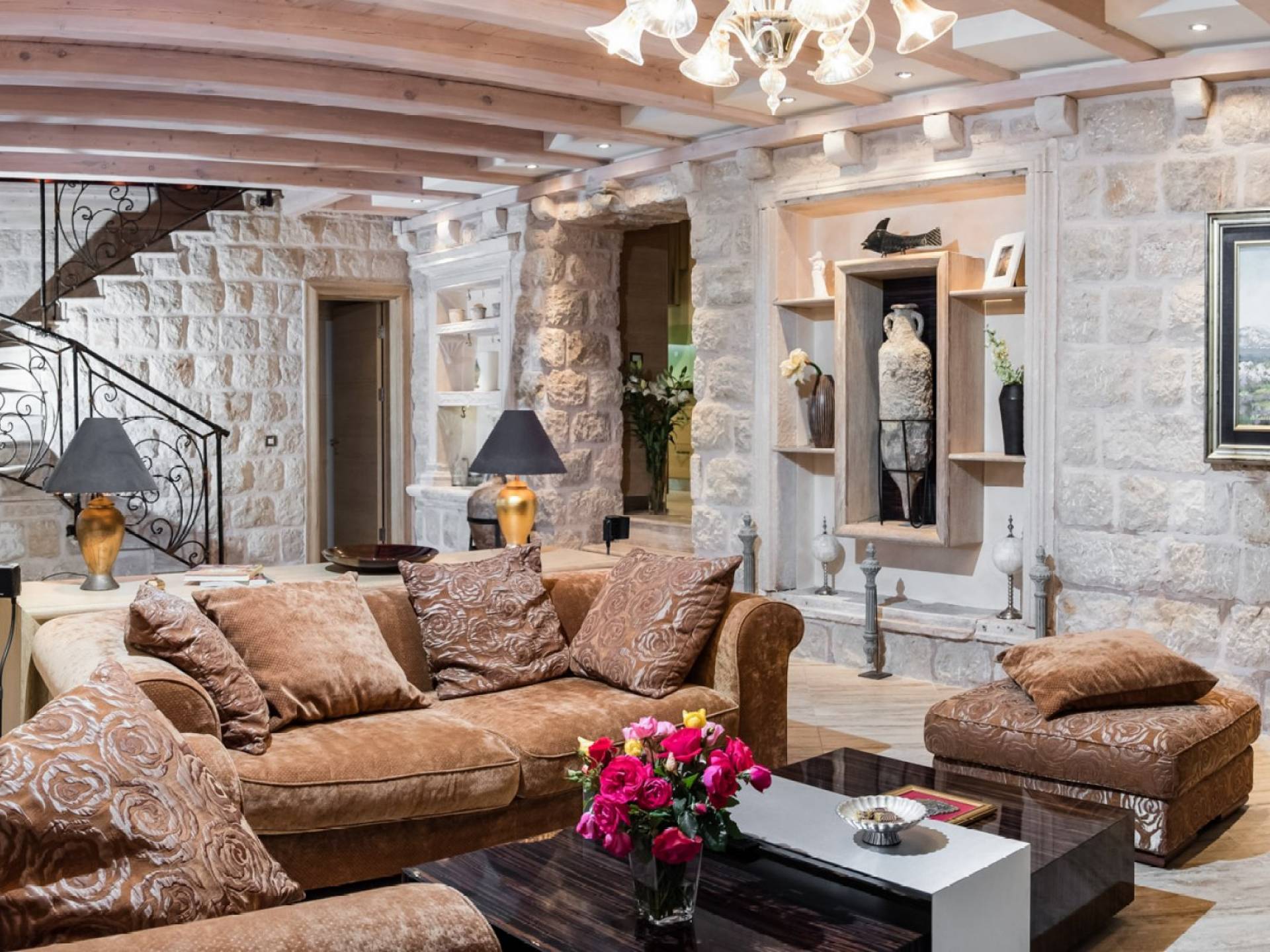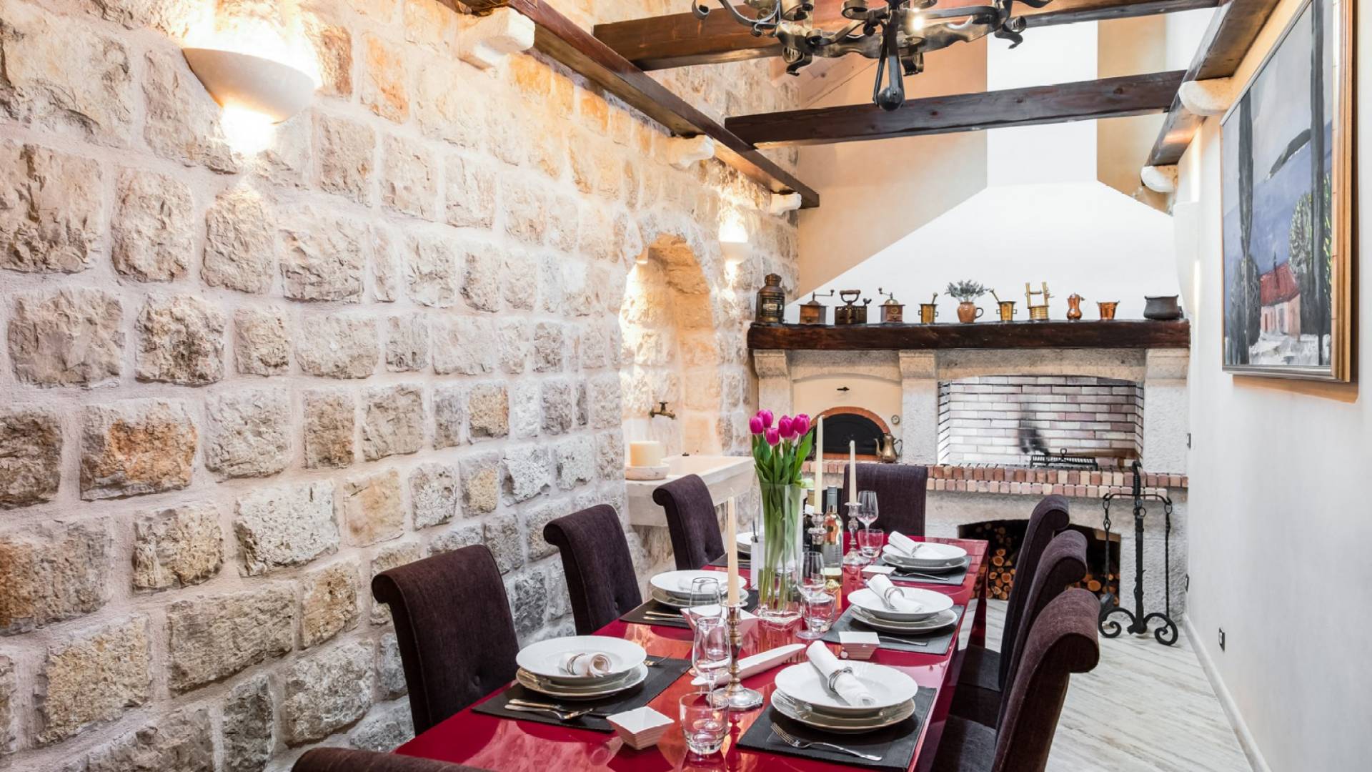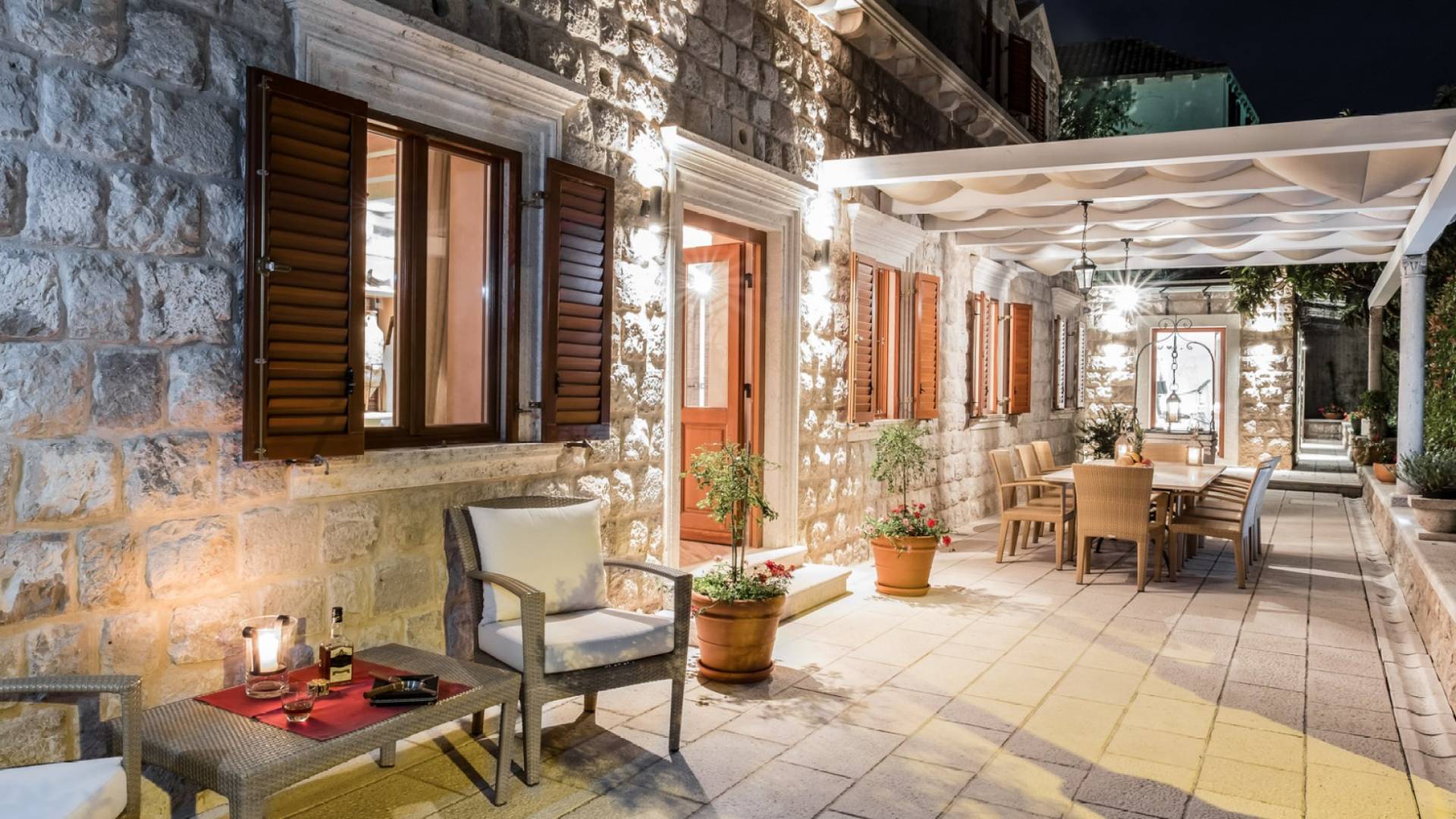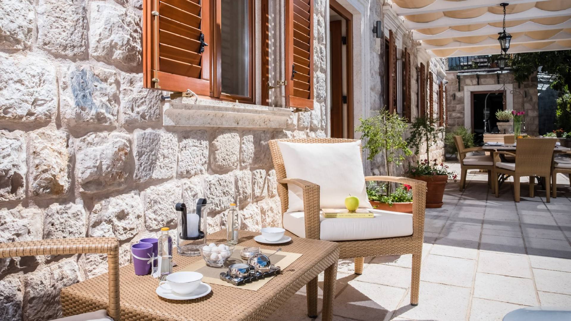 Dalla dependance, salendo alcuni gradini a sinistra, una delle caratteristiche più attraenti di questa Villa: l'intima terrazza da pranzo, con vista sulla fortezza, la punta orientale di Lokrum e una spruzzata dell'azzurro Adriatico. I tratti principali degli interni di Villa Muri di Dubrovnik includono una dose di raffinatezza classica, unita a pezzi d'arte selezionati e dettagli audaci e contemporanei. Quando entri dalla terrazza anteriore nel voluminoso salone con pareti in pietra arida, individua interessanti dipinti e anfore tra gli arredi.