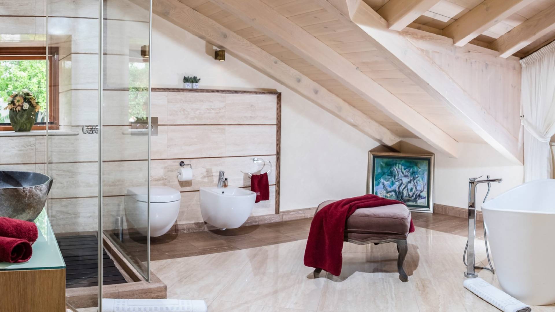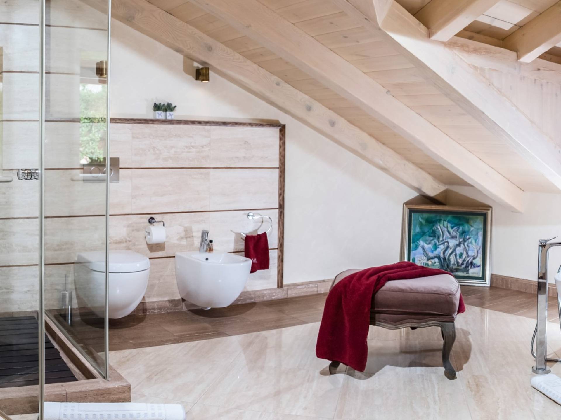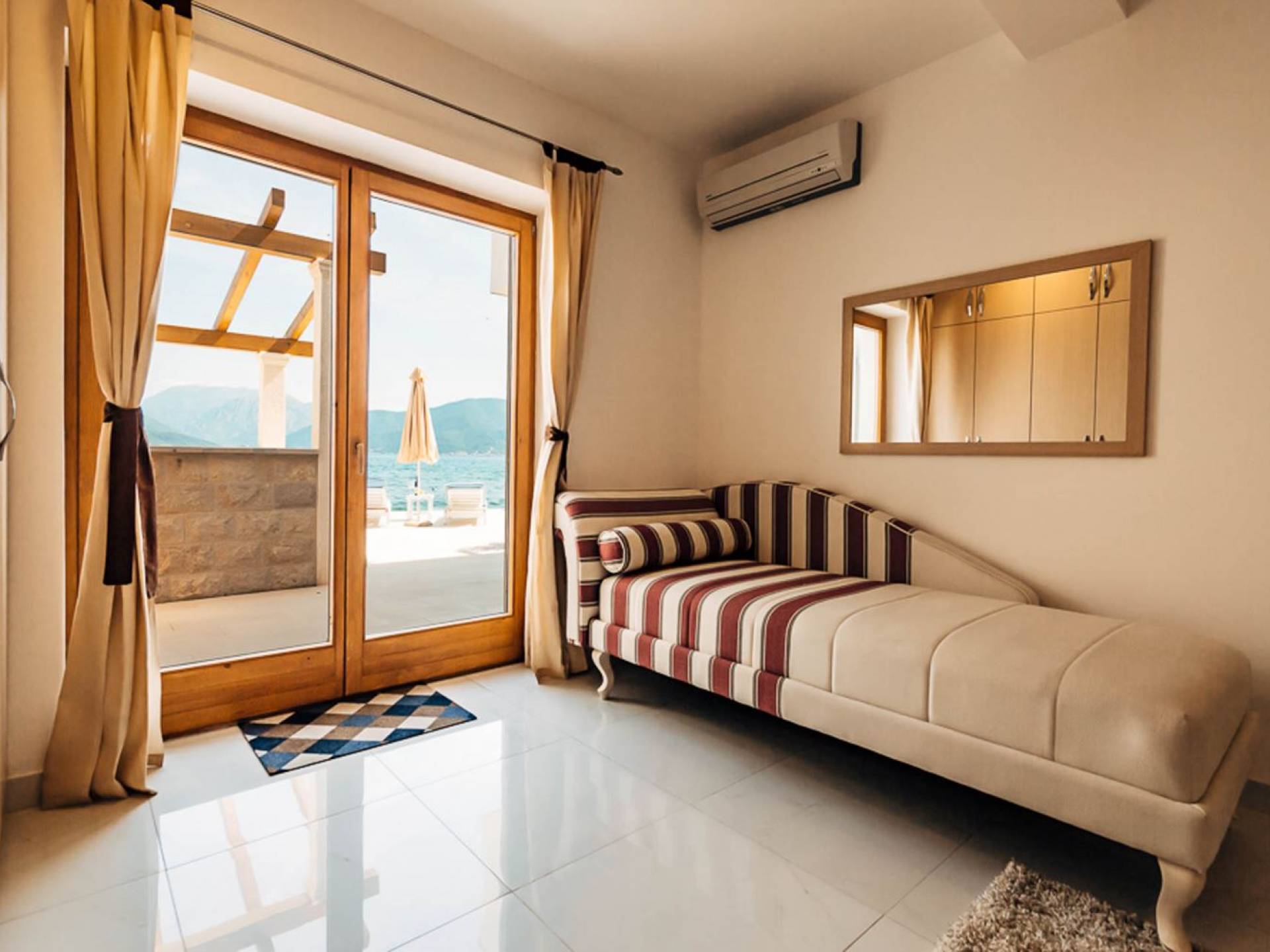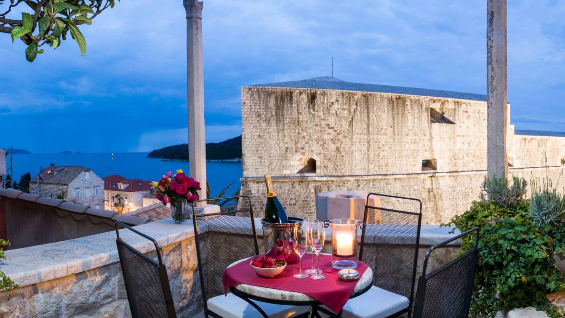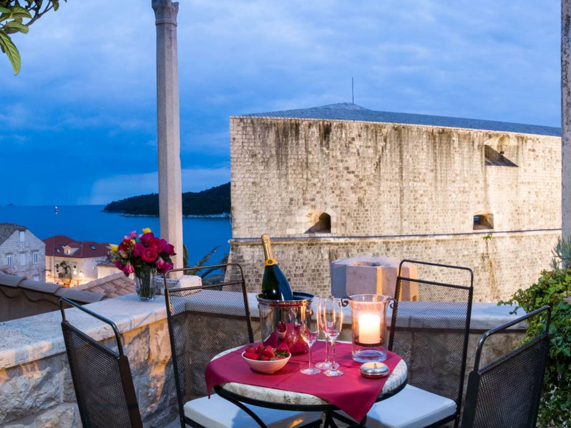 Dalla dependance, salendo alcuni gradini a sinistra, una delle caratteristiche più attraenti di questa Villa: l'intima terrazza da pranzo, con vista sulla fortezza, la punta orientale di Lokrum e una spruzzata dell'azzurro Adriatico. I tratti principali degli interni di Villa Muri di Dubrovnik includono una dose di raffinatezza classica, unita a pezzi d'arte selezionati e dettagli audaci e contemporanei. Quando entri dalla terrazza anteriore nel voluminoso salone con pareti in pietra arida, individua interessanti dipinti e anfore tra gli arredi.