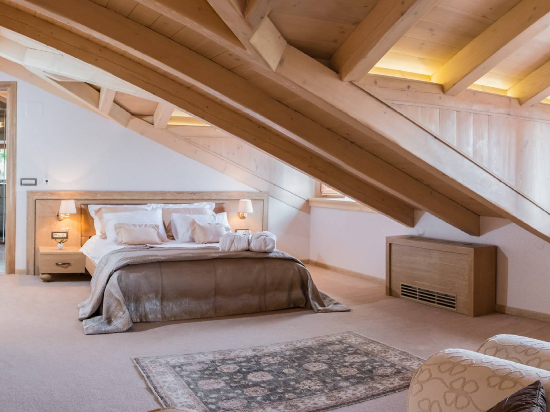 Dall'altro lato del muro del soggiorno, salendo alcuni gradini, c'è una cucina completamente attrezzata e un'interessante zona pranzo separata. Due delle quattro camere da letto, una della padronale, si trovano al piano terra. Tutte le camere sono dotate di bagno privato e sono spaziose. Dotata di un letto e stoviglie di alta qualità, illuminazione sofisticata e decorazioni neutre, questa camera cresce su di te in pochissimo tempo. Le due camere da letto al piano superiore hanno soffitti inclinati integrati nel design.