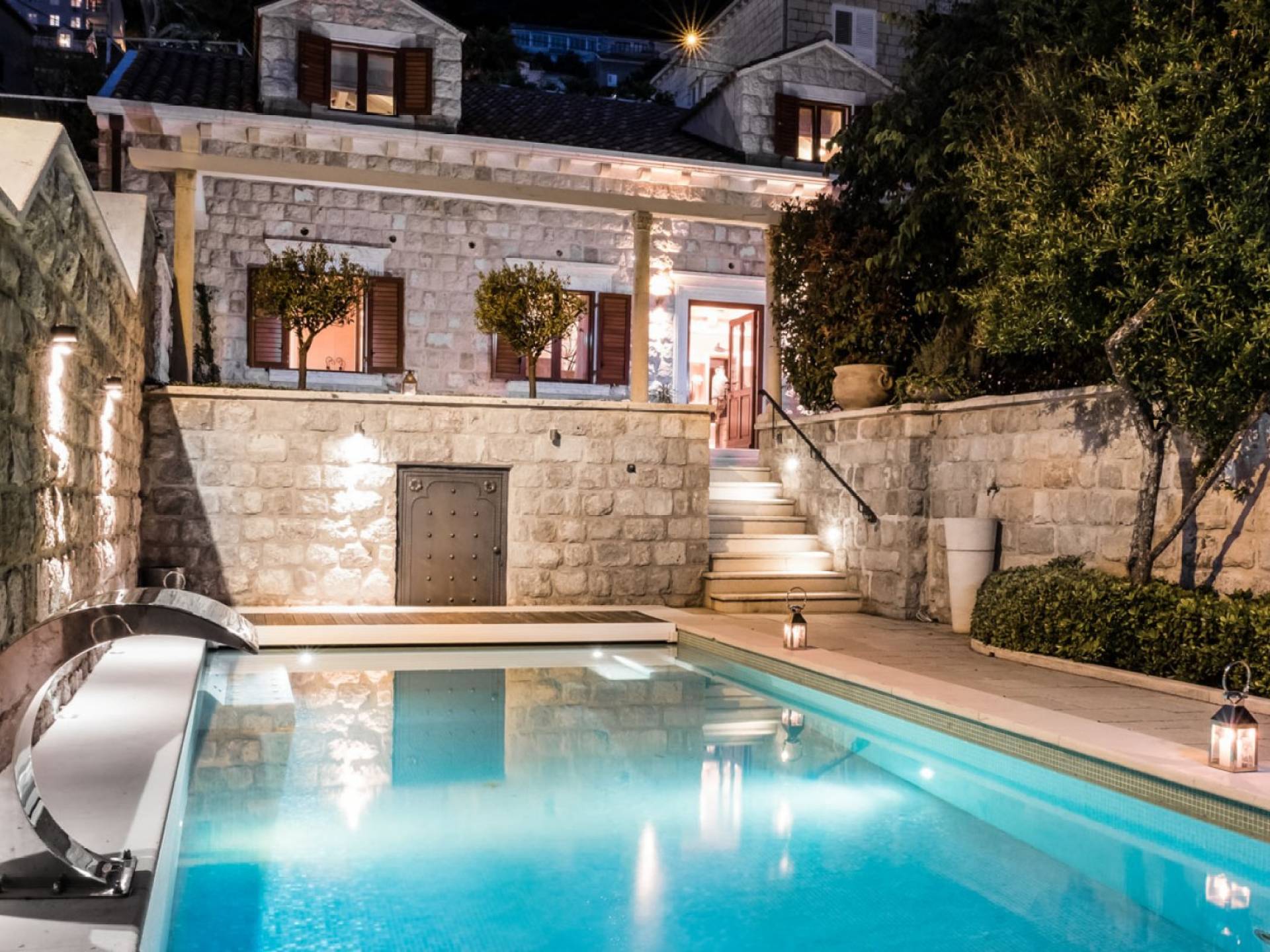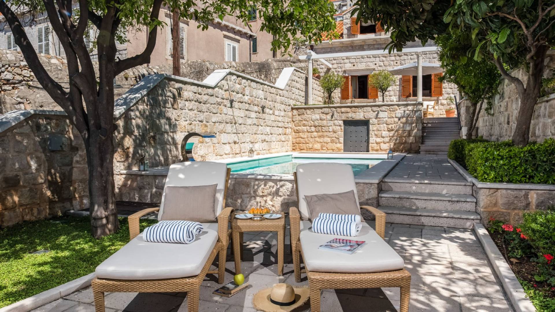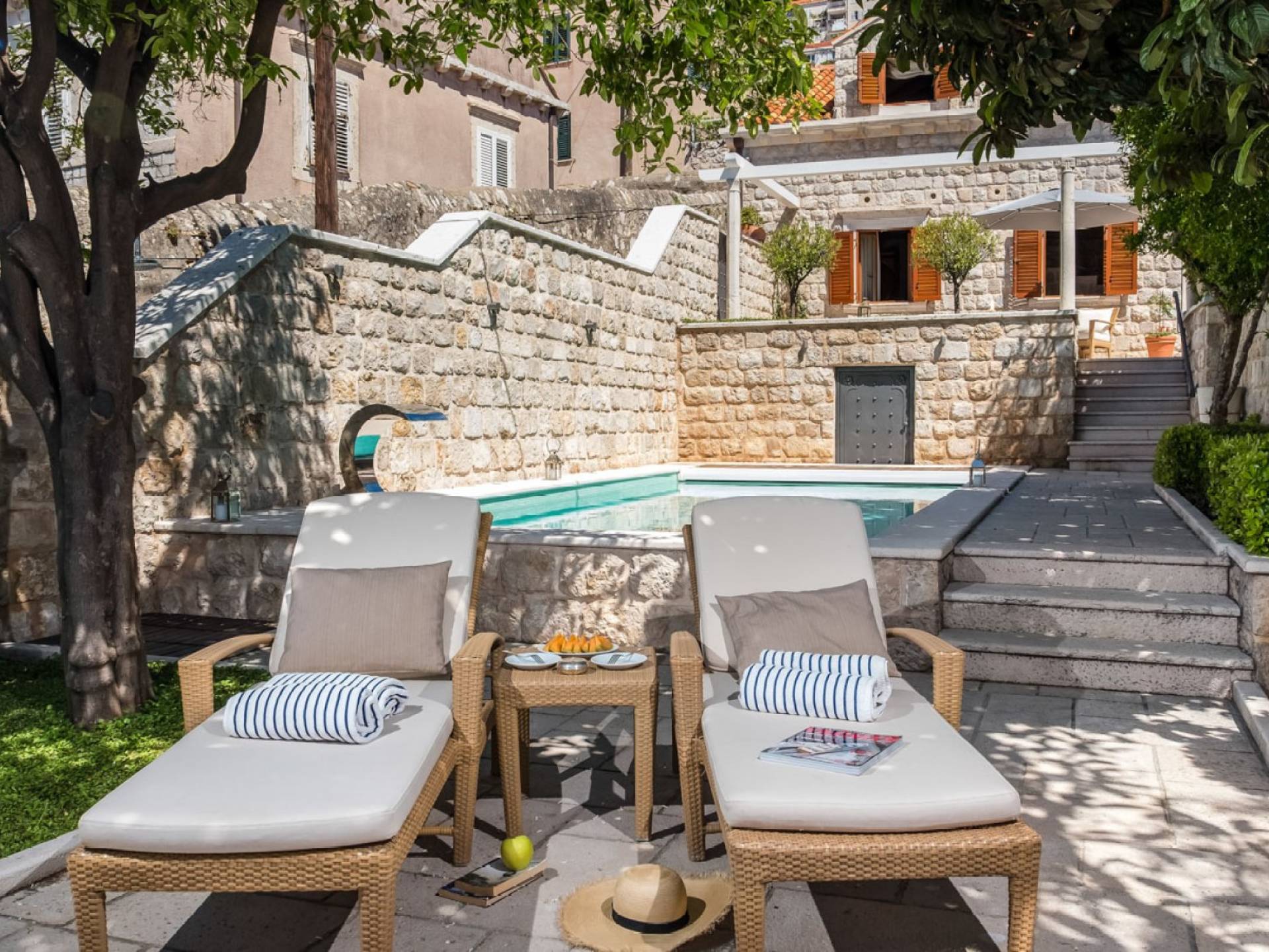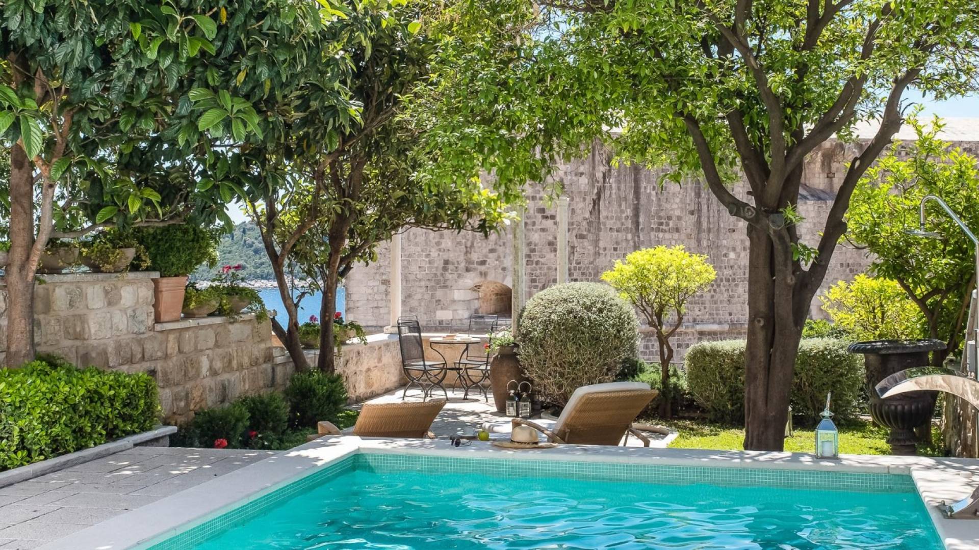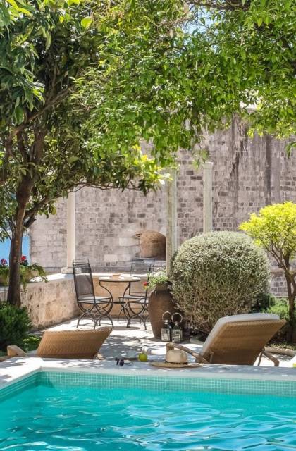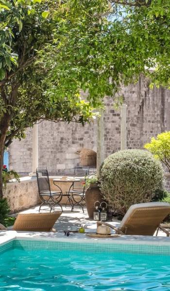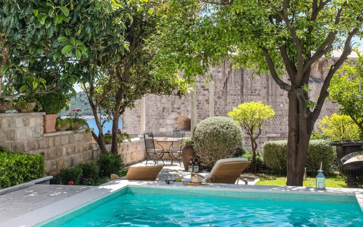 Attraverso il cancello principale, entra in un cortile in pietra ombreggiato centrato su un tavolo da pranzo all'aperto per 8 persone e un angolo lounge, introducendoti all'essenza della vita di Dubrovnik: il tempo libero. L'elemento centrale della terrazza, il pozzo in pietra, accentua la dimensione storica della Villa. Alla vostra destra, il giardino terrazzato scende a una piscina e una terrazza con lettini. La piscina di 7x4 metri è il luogo in cui scambiare il trambusto delle famose spiagge di Dubrovnik con un rilassante pomeriggio a prendere il sole nella quiete. In fondo al cortile antistante, si trova un piccolo annesso, come un angolo di salute e bellezza composto da palestra, vasca idromassaggio, sauna e bagno.