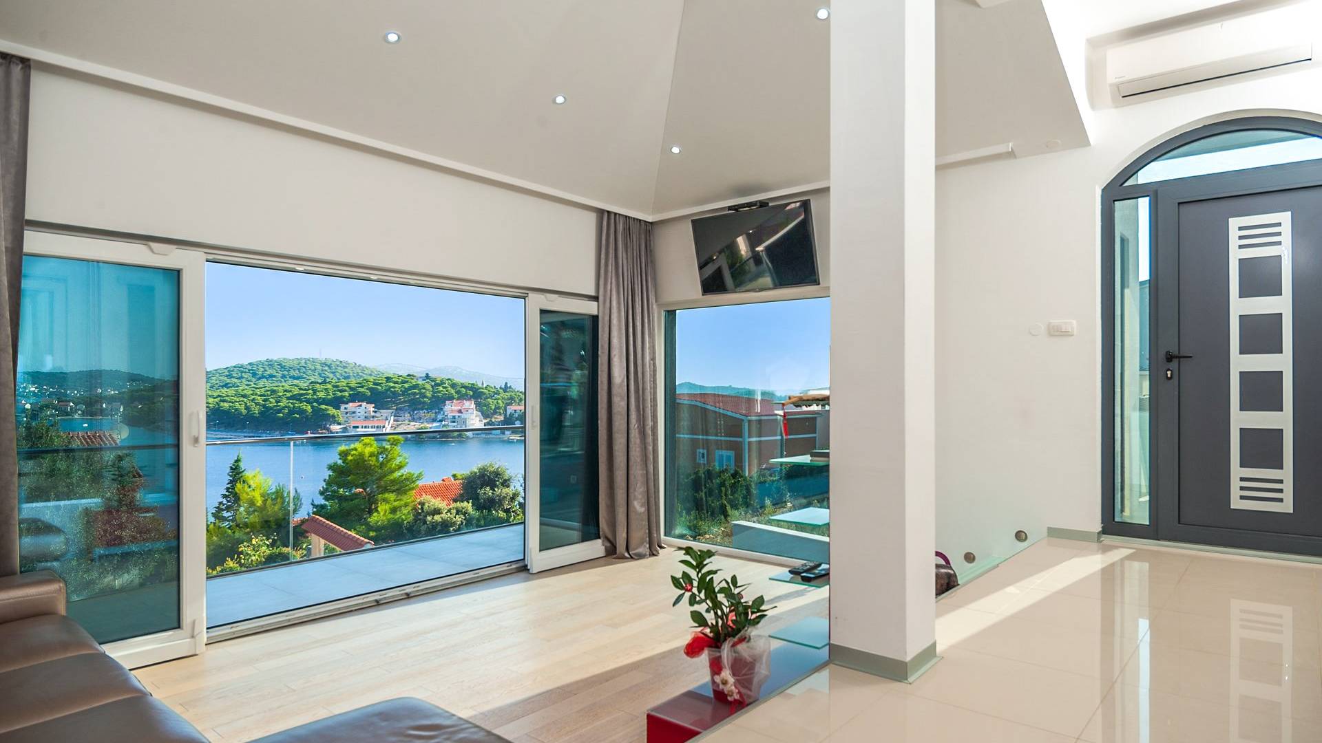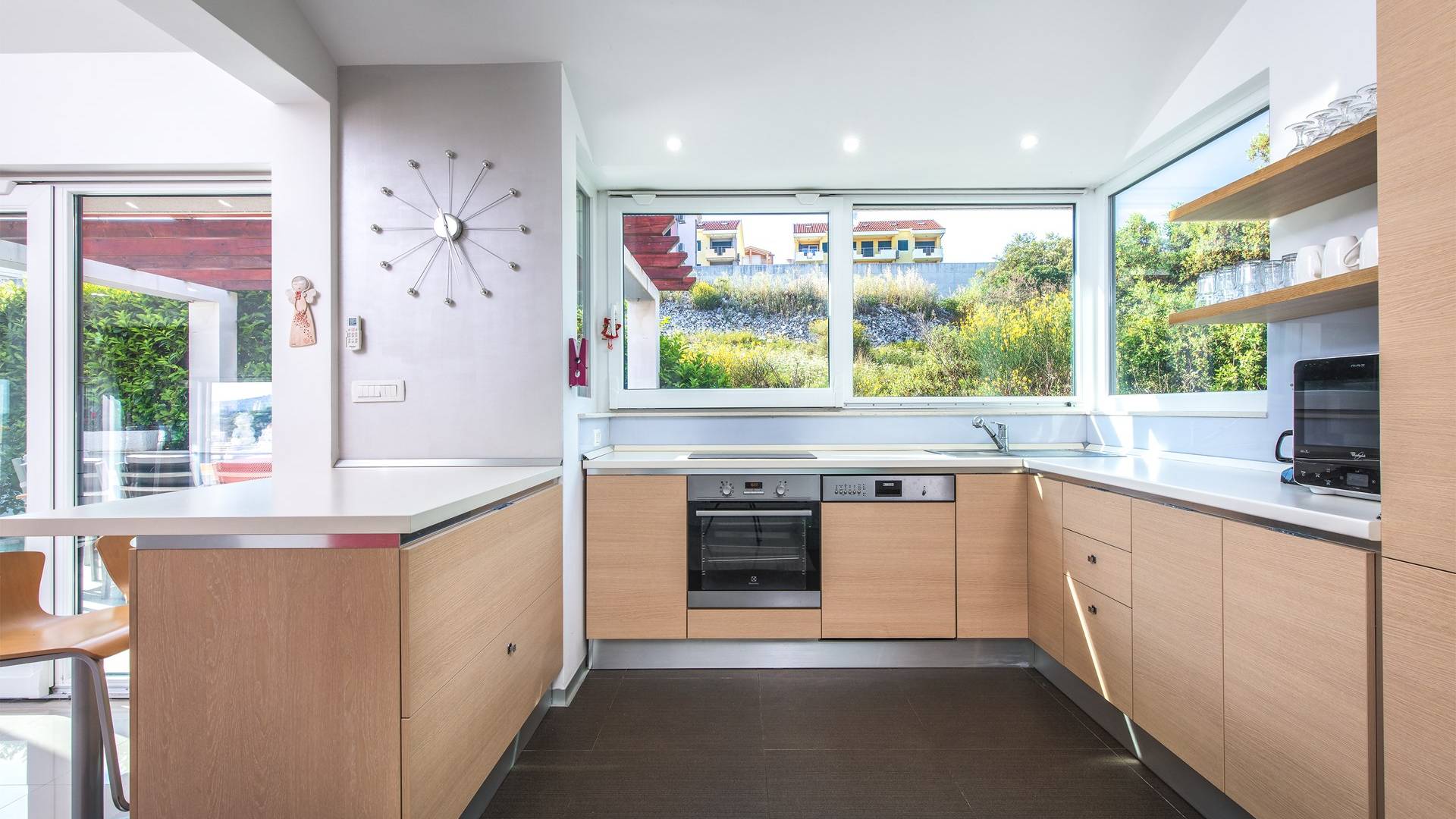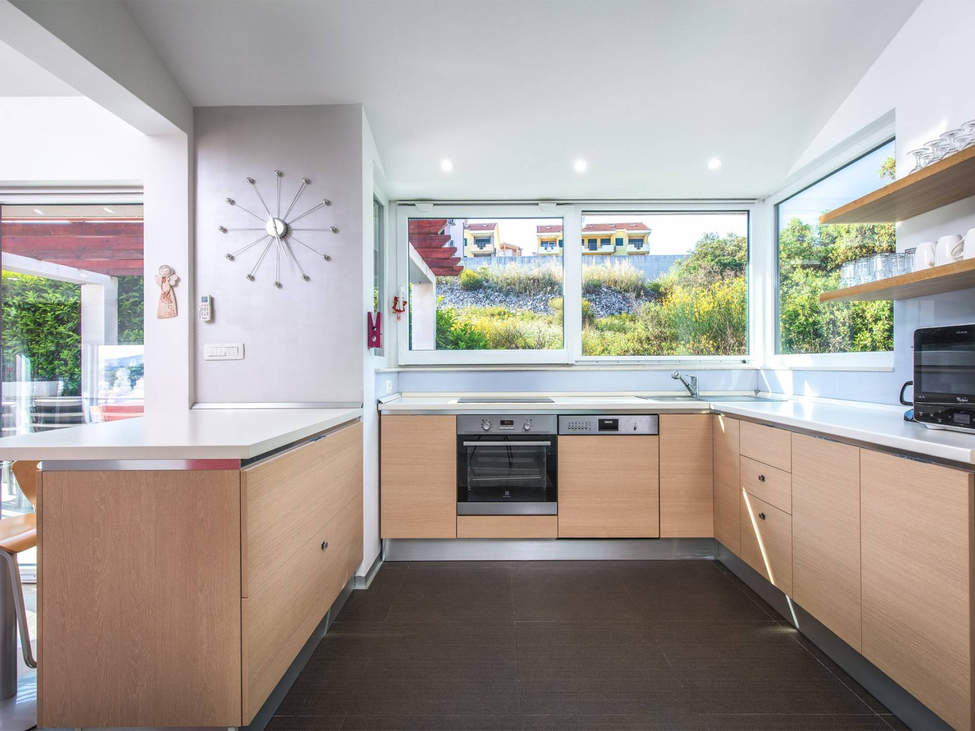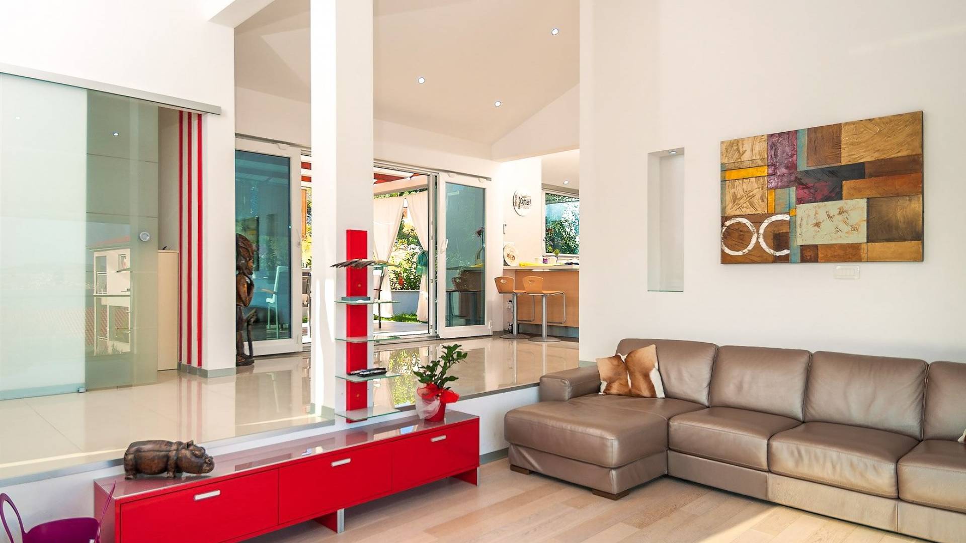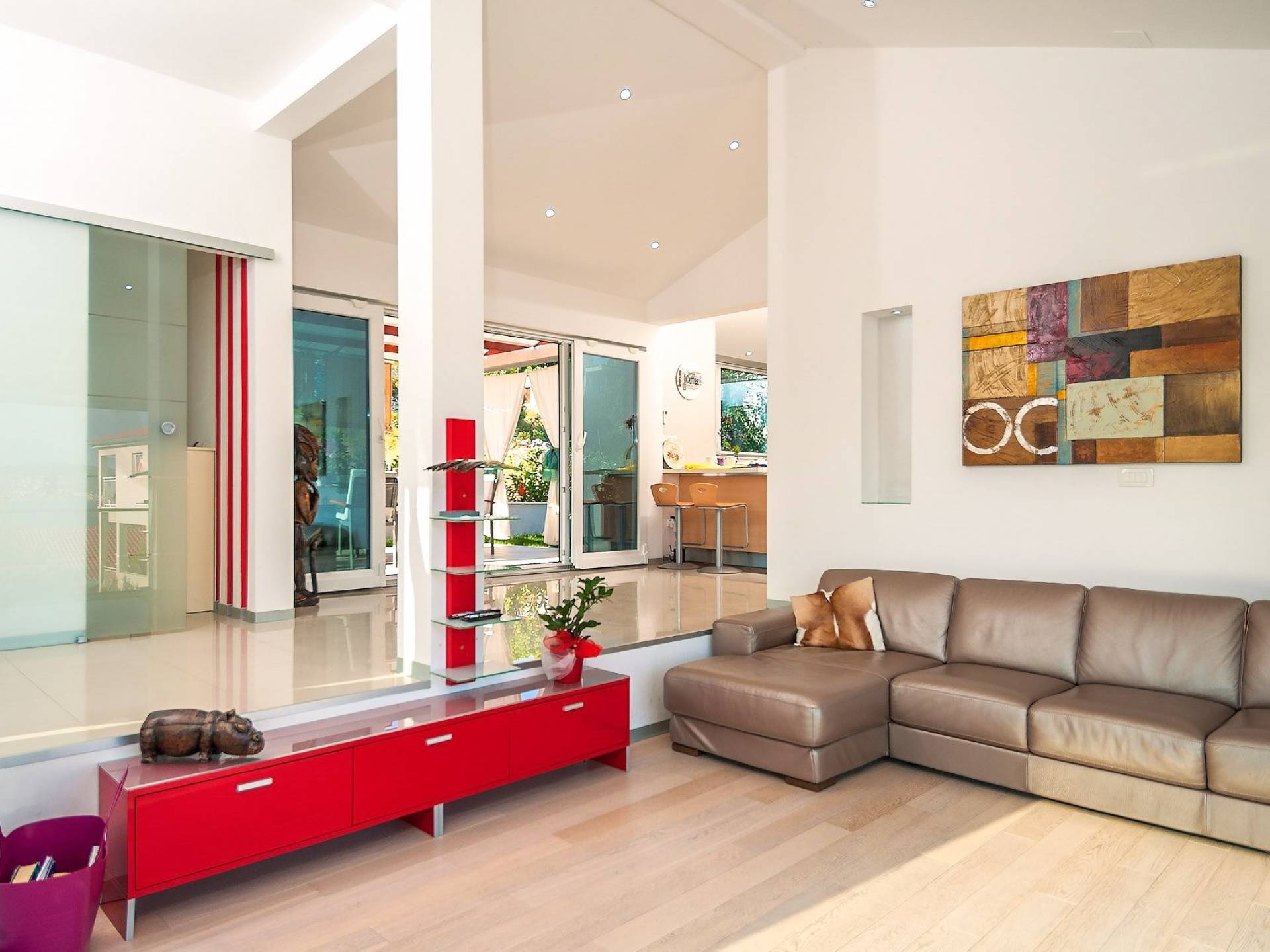 Al primo piano della villa si trova un ampio soggiorno con comodi divani e una splendida vista sul terrazzo. Questo porta in uno spazio cucina moderno, dove troverai tutto il necessario per creare i pasti durante la tua vacanza. Dalla cucina si accede a una zona pranzo riparata, dove è possibile abbracciare i pittoreschi dintorni e godersi il caldo clima mediterraneo.