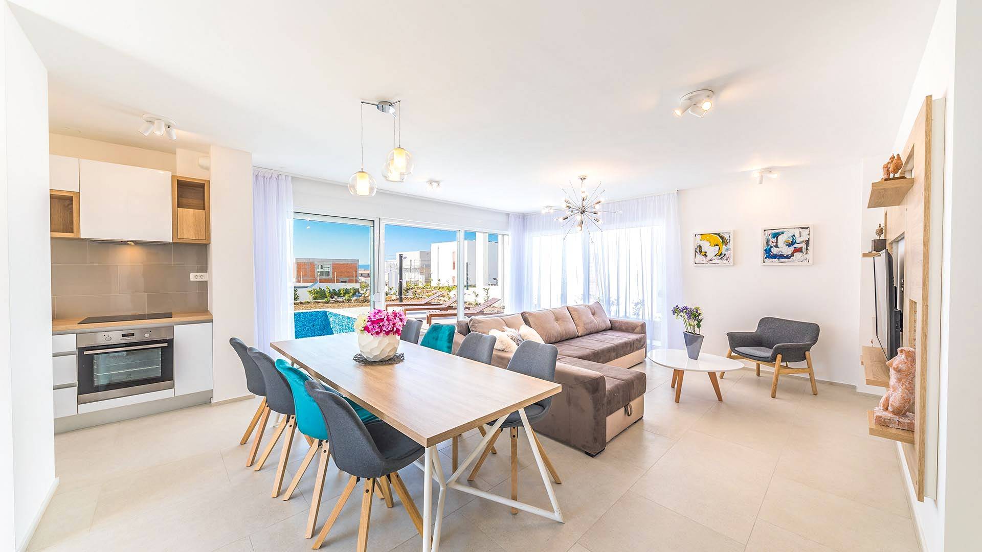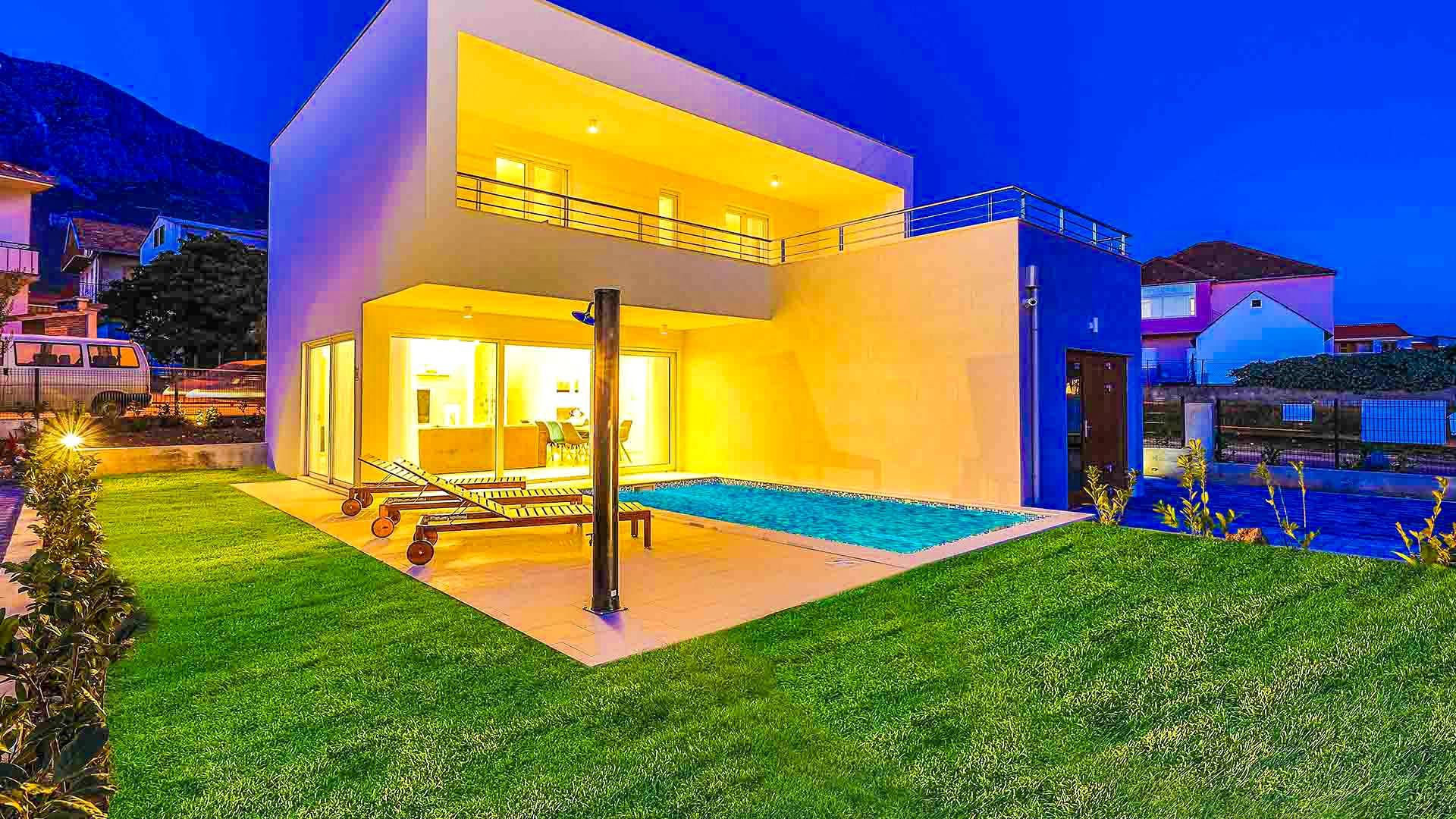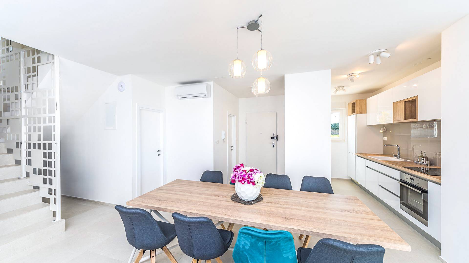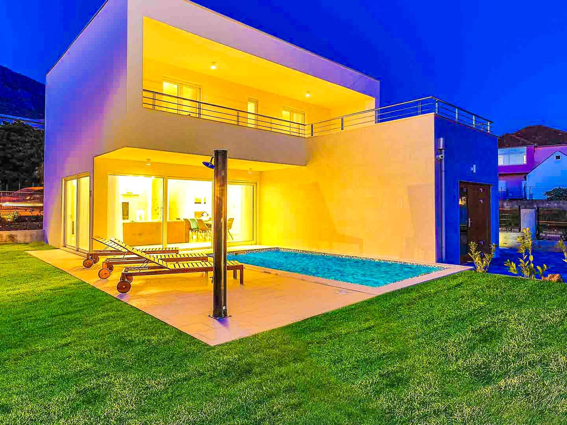 Villa Audrey Split copre un'area di 142 m2 divisi al piano terra e al primo piano ed è composta da 4 camere da letto moderne che possono ospitare comodamente fino a 10 persone, ideali per gruppi di amici o famiglie più numerose. Il piano terra è concepito come un ampio e luminoso soggiorno composto da una moderna cucina completamente attrezzata, un moderno soggiorno con zona pranzo, 1 camera con un letto matrimoniale che può essere separato in 2 letti singoli e 1 bagno con doccia. Il soggiorno ha accesso al giardino e alla zona piscina attraverso una grande porta scorrevole in vetro che permette all'intera area di diventare un concept open.