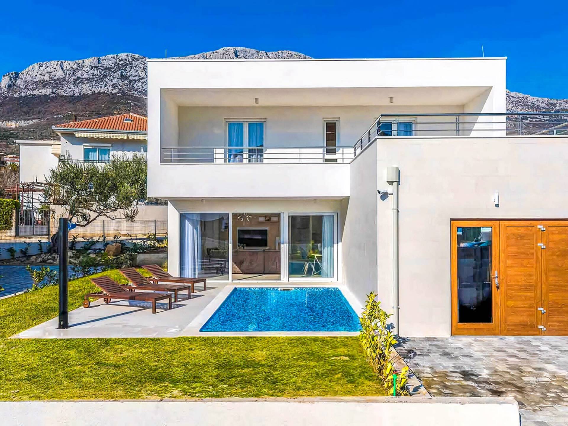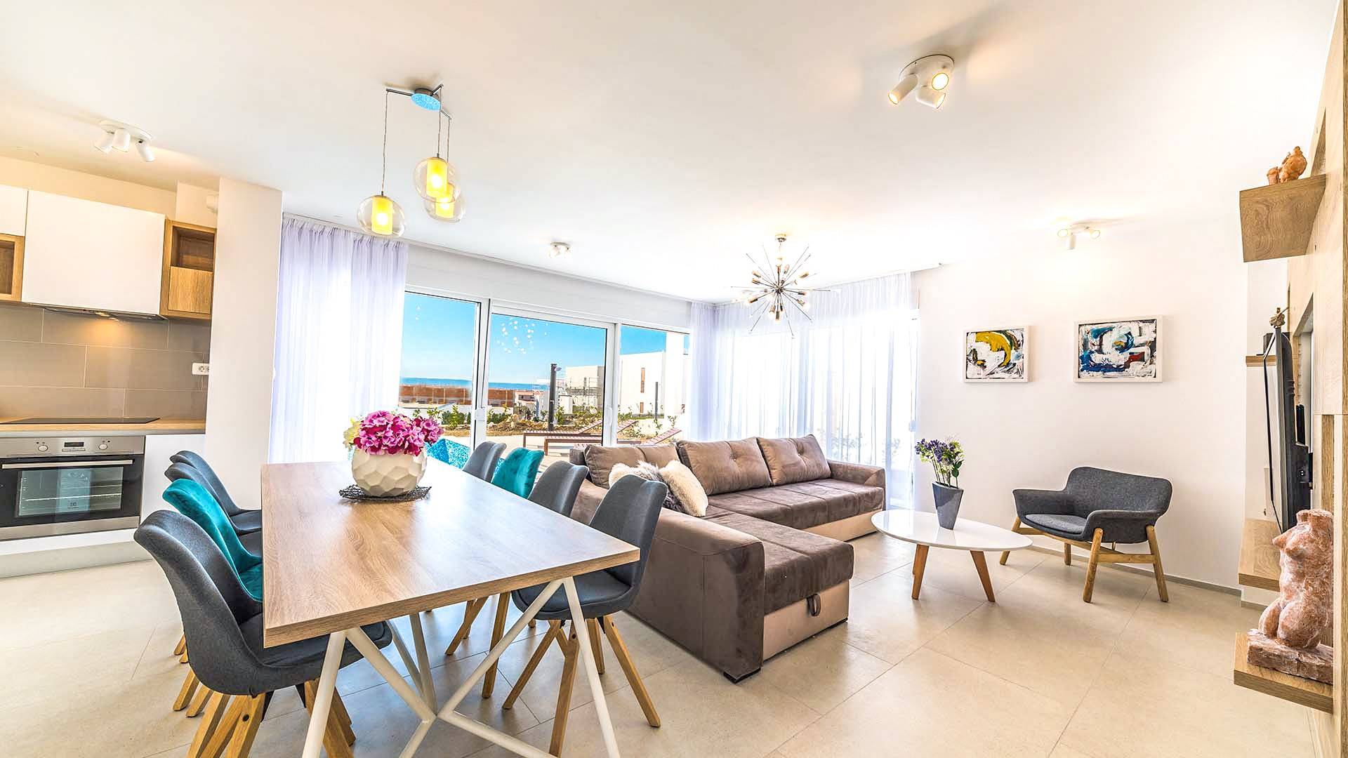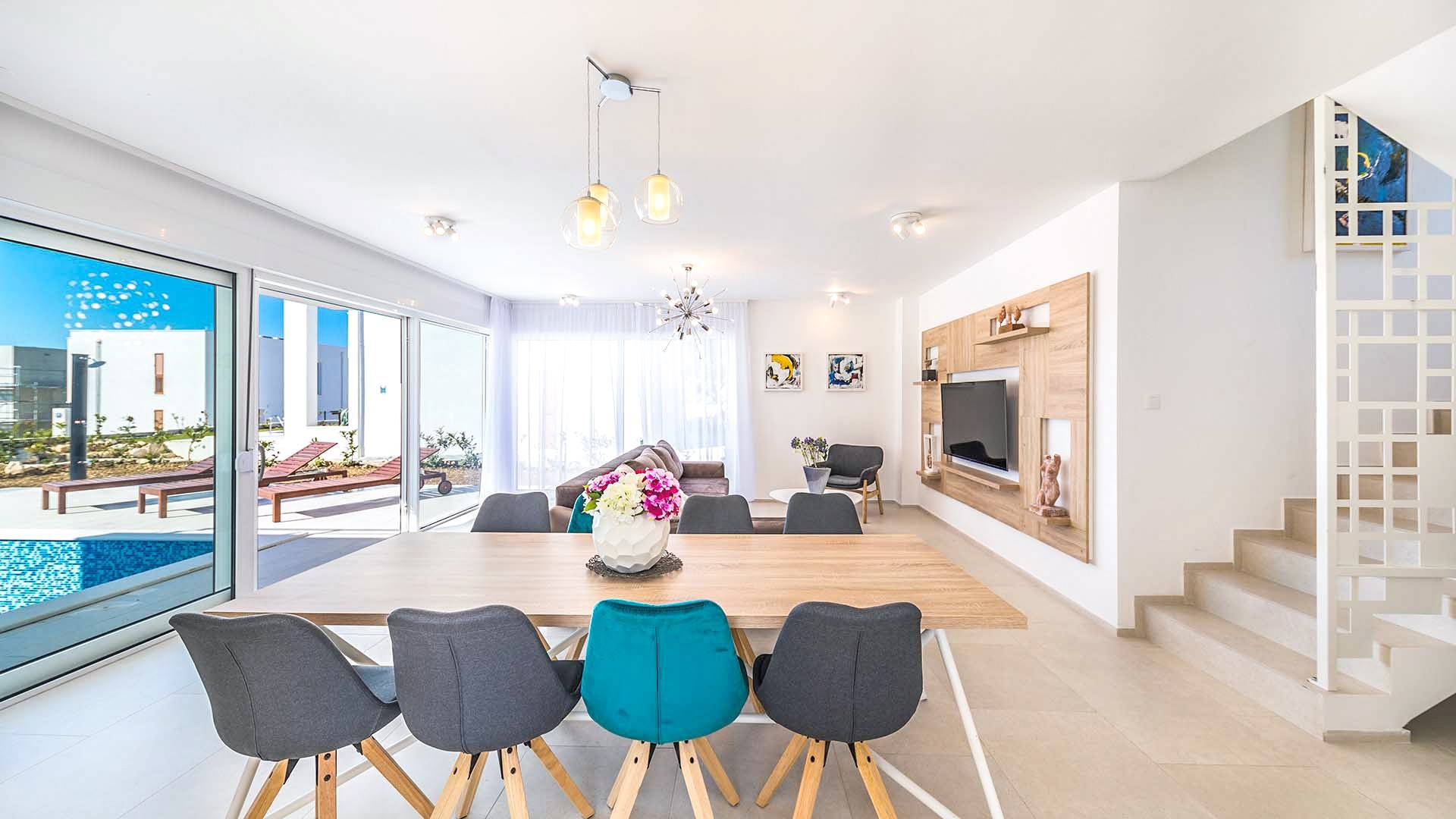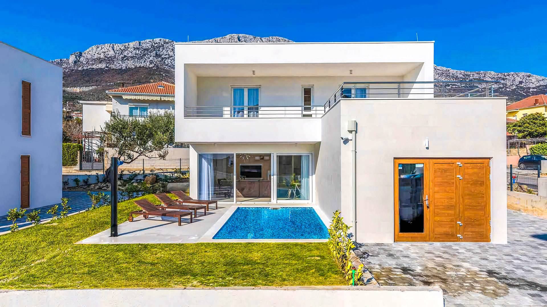 Villa Audrey Split copre un'area di 142 m2 divisi al piano terra e al primo piano ed è composta da 4 camere da letto moderne che possono ospitare comodamente fino a 10 persone, ideali per gruppi di amici o famiglie più numerose. Il piano terra è concepito come un ampio e luminoso soggiorno composto da una moderna cucina completamente attrezzata, un moderno soggiorno con zona pranzo, 1 camera con un letto matrimoniale che può essere separato in 2 letti singoli e 1 bagno con doccia. Il soggiorno ha accesso al giardino e alla zona piscina attraverso una grande porta scorrevole in vetro che permette all'intera area di diventare un concept open.