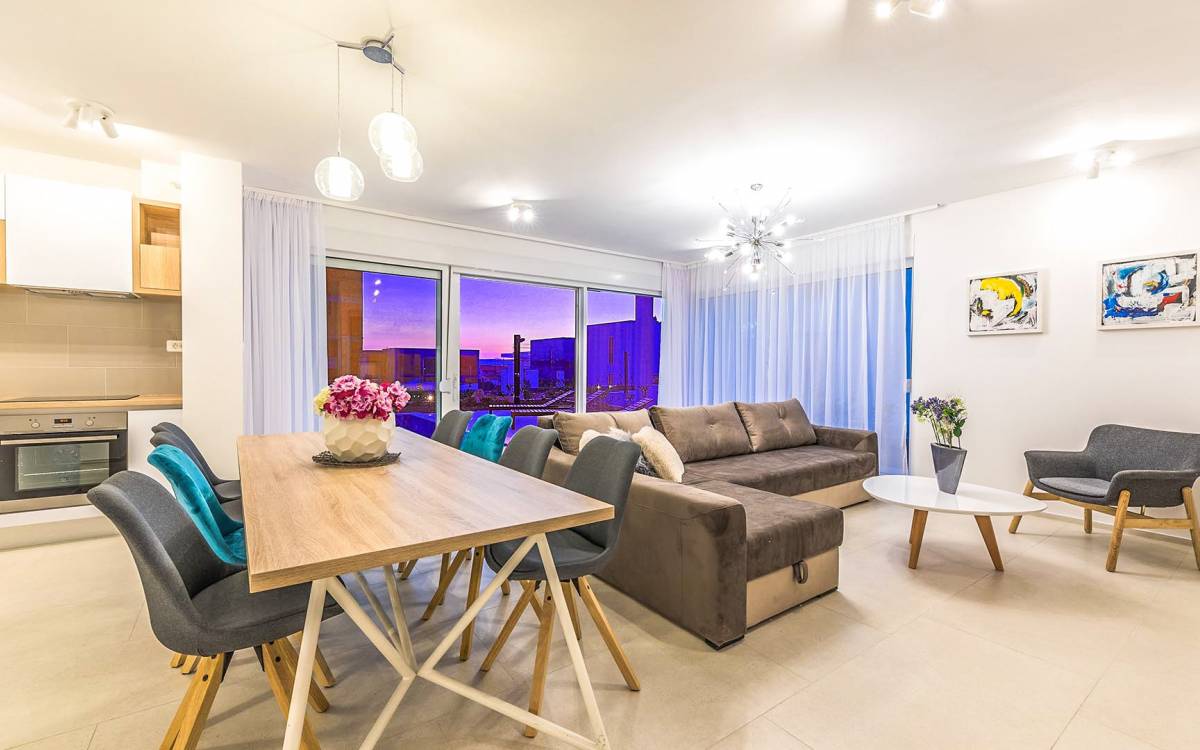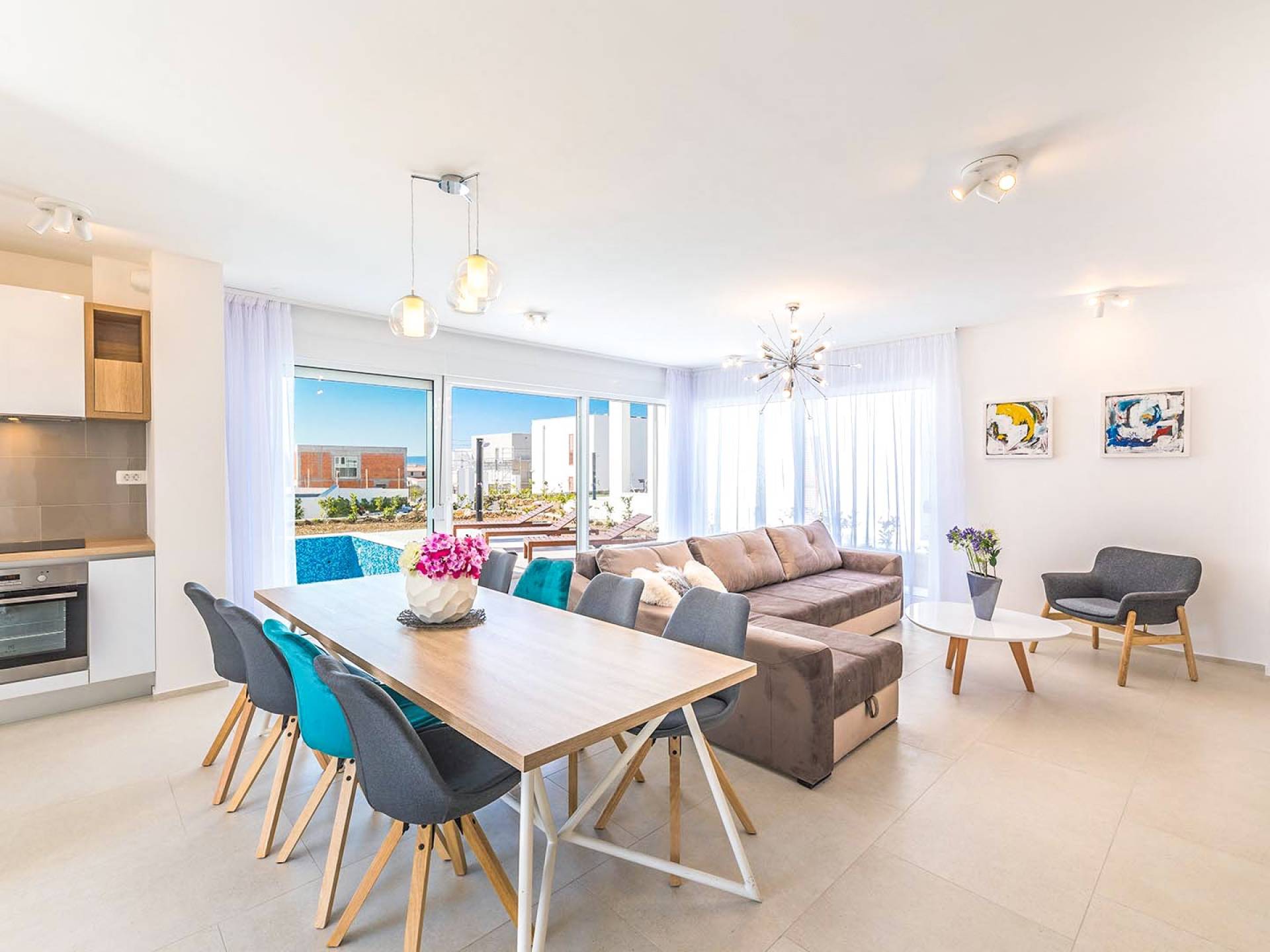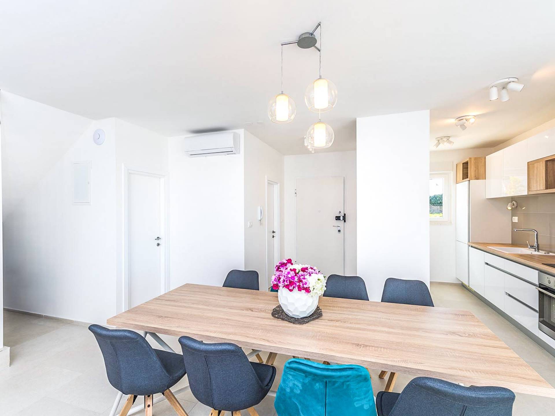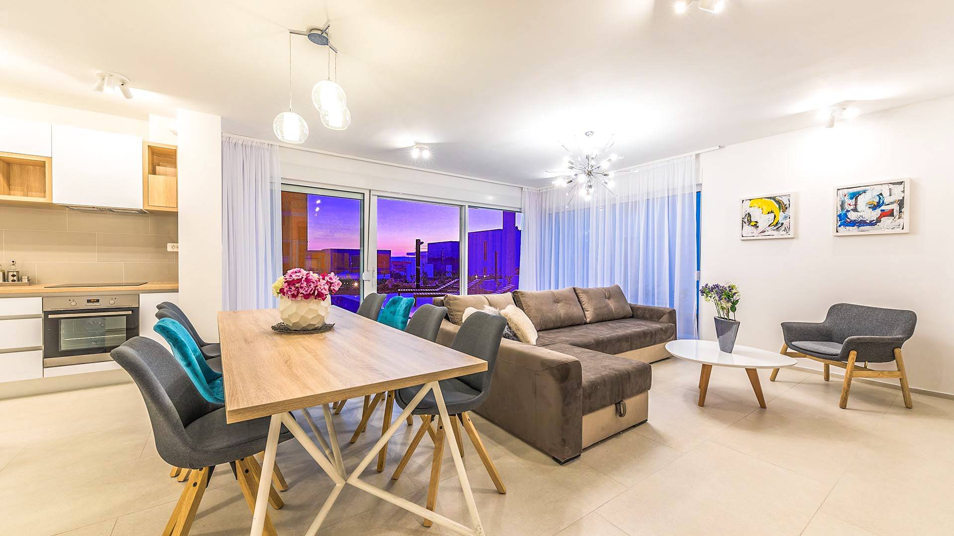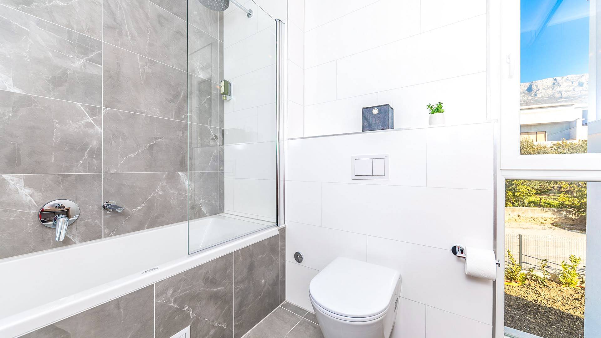 Villa Audrey Split copre un'area di 142 m2 divisi al piano terra e al primo piano ed è composta da 4 camere da letto moderne che possono ospitare comodamente fino a 10 persone, ideali per gruppi di amici o famiglie più numerose. Il piano terra è concepito come un ampio e luminoso soggiorno composto da una moderna cucina completamente attrezzata, un moderno soggiorno con zona pranzo, 1 camera con un letto matrimoniale che può essere separato in 2 letti singoli e 1 bagno con doccia. Il soggiorno ha accesso al giardino e alla zona piscina attraverso una grande porta scorrevole in vetro che permette all'intera area di diventare un concept open.