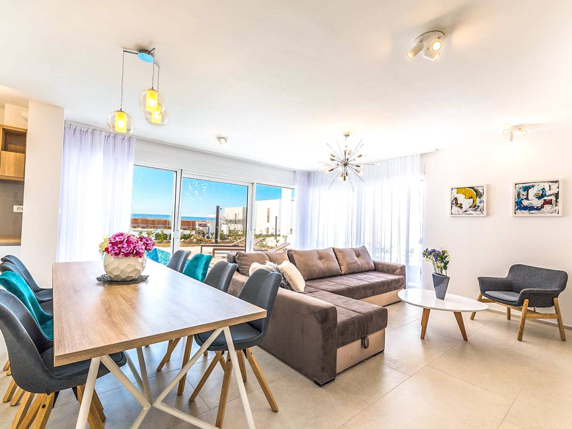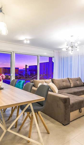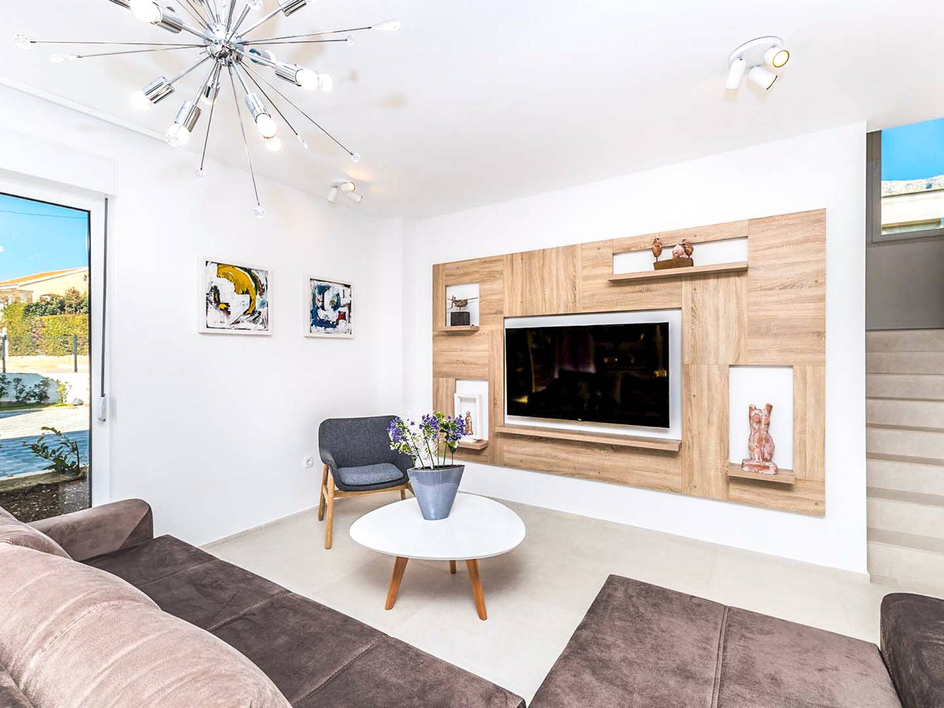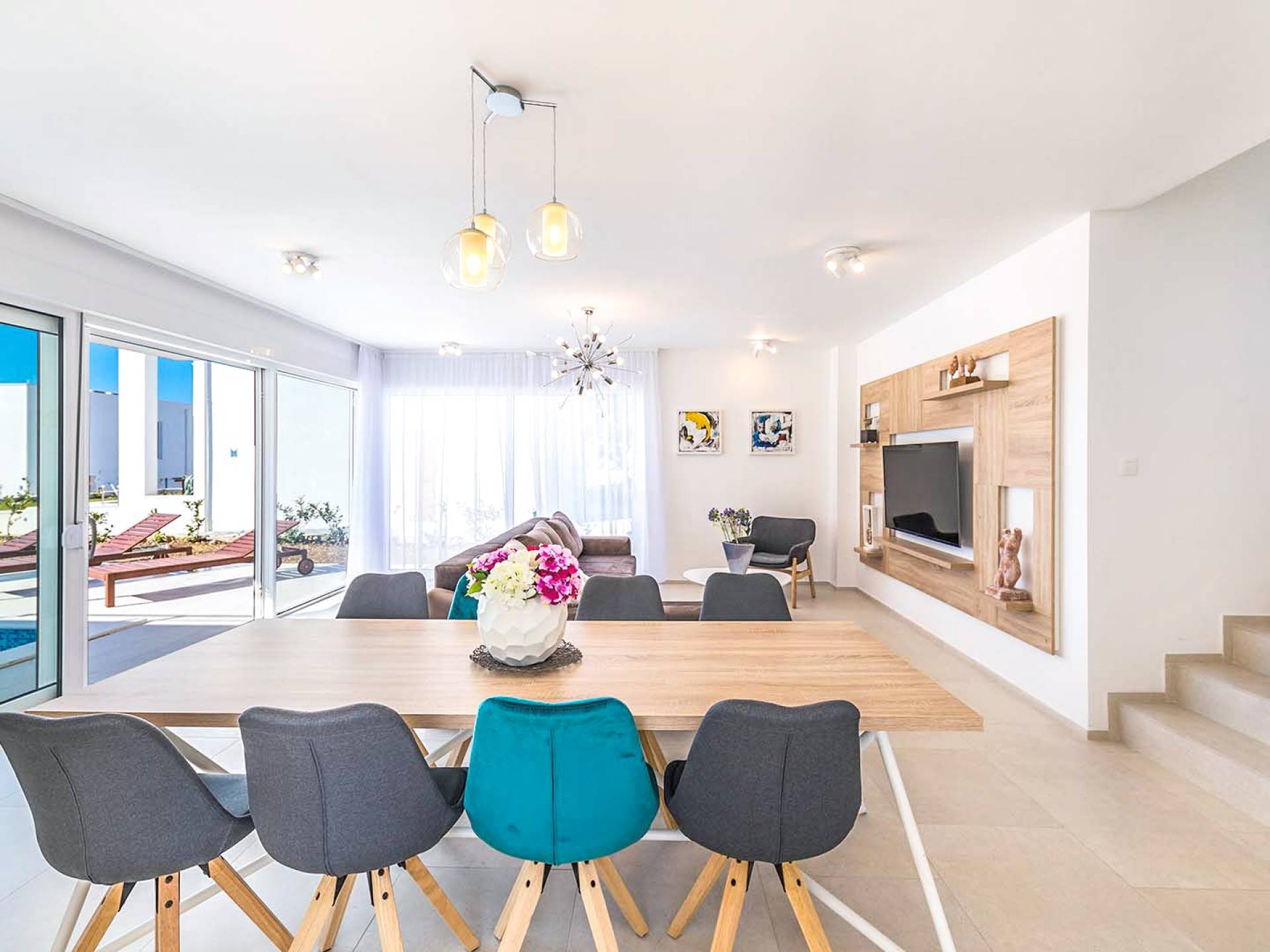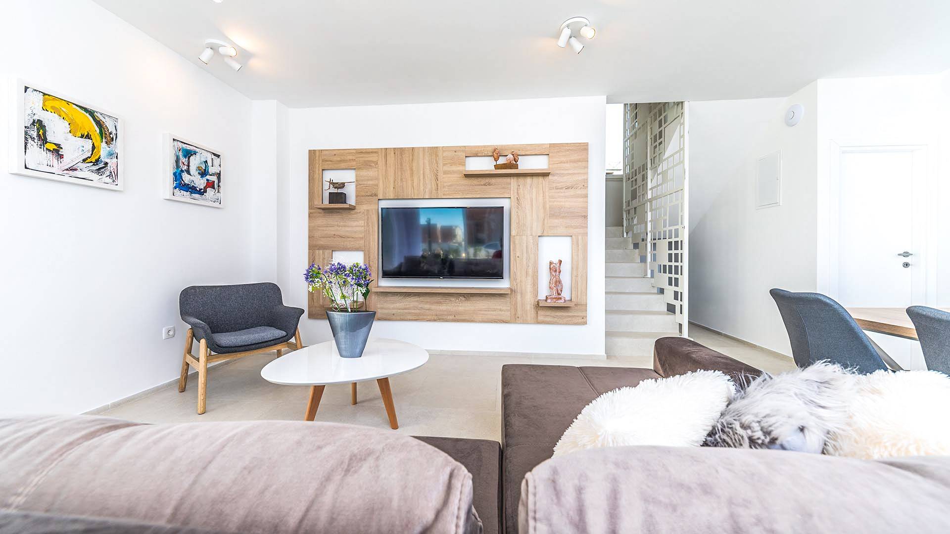 Villa Audrey Split copre un'area di 142 m2 divisi al piano terra e al primo piano ed è composta da 4 camere da letto moderne che possono ospitare comodamente fino a 10 persone, ideali per gruppi di amici o famiglie più numerose. Il piano terra è concepito come un ampio e luminoso soggiorno composto da una moderna cucina completamente attrezzata, un moderno soggiorno con zona pranzo, 1 camera con un letto matrimoniale che può essere separato in 2 letti singoli e 1 bagno con doccia. Il soggiorno ha accesso al giardino e alla zona piscina attraverso una grande porta scorrevole in vetro che permette all'intera area di diventare un concept open.
