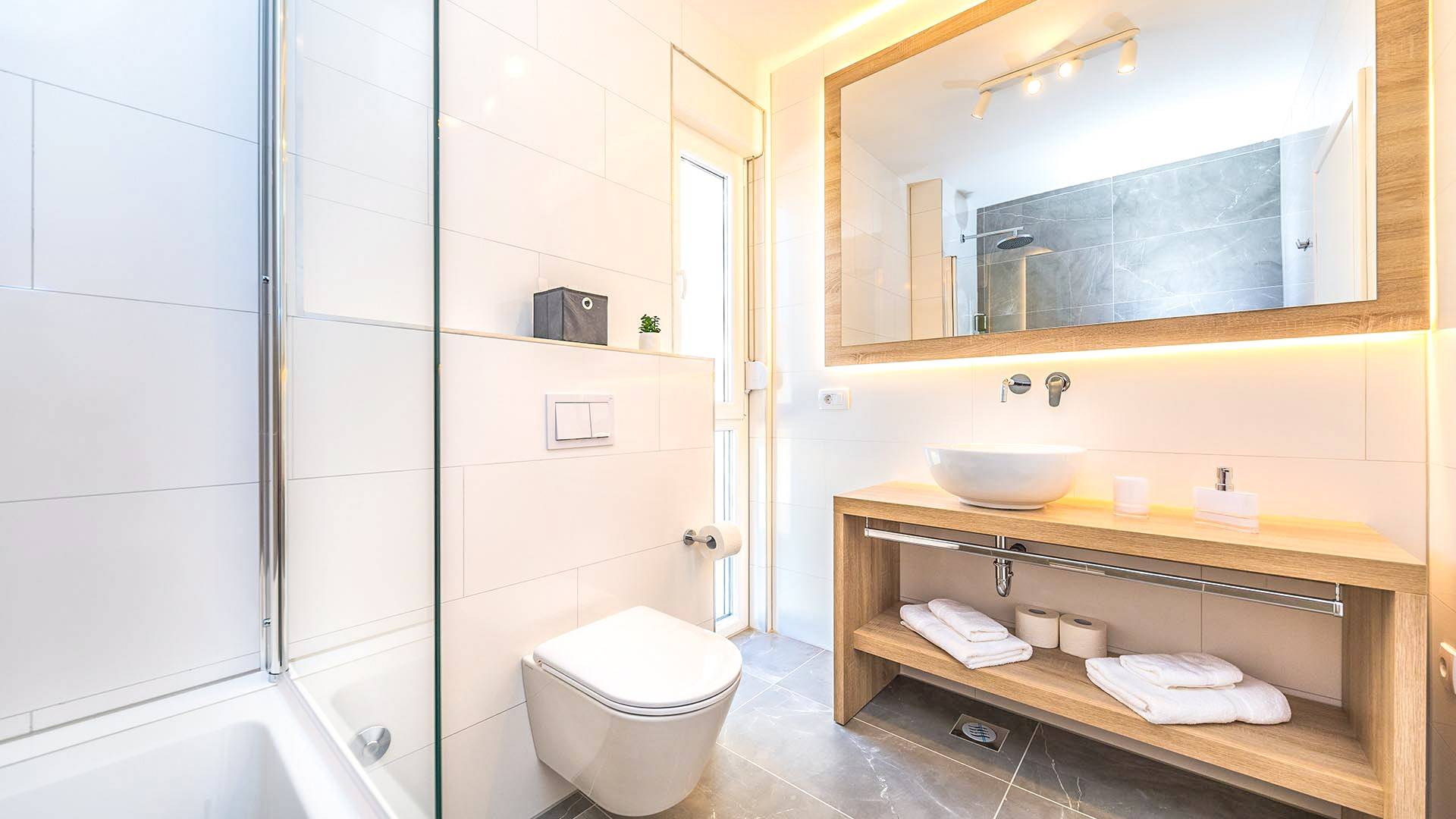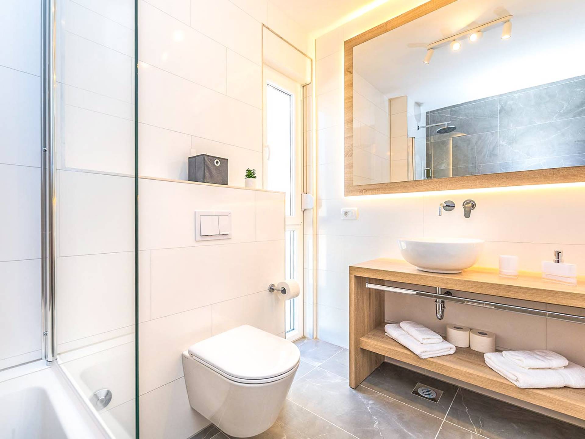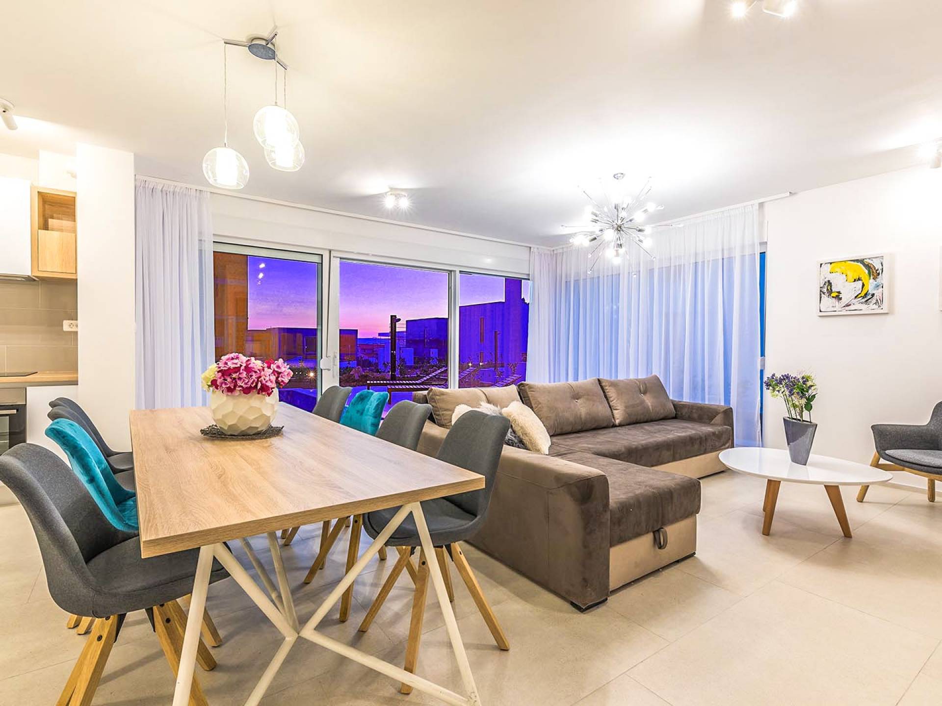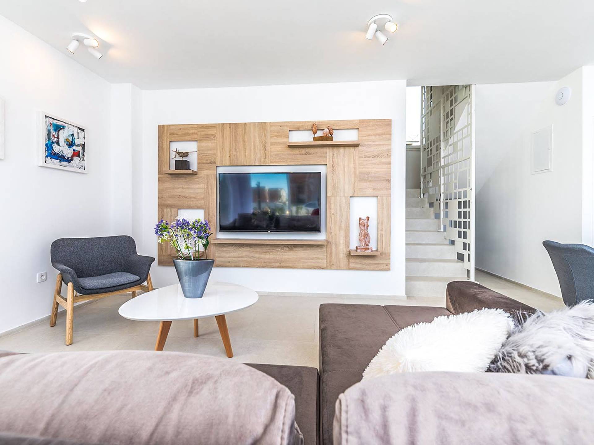 Villa Audrey Split copre un'area di 142 m2 divisi al piano terra e al primo piano ed è composta da 4 camere da letto moderne che possono ospitare comodamente fino a 10 persone, ideali per gruppi di amici o famiglie più numerose. Il piano terra è concepito come un ampio e luminoso soggiorno composto da una moderna cucina completamente attrezzata, un moderno soggiorno con zona pranzo, 1 camera con un letto matrimoniale che può essere separato in 2 letti singoli e 1 bagno con doccia. Il soggiorno ha accesso al giardino e alla zona piscina attraverso una grande porta scorrevole in vetro che permette all'intera area di diventare un concept open.