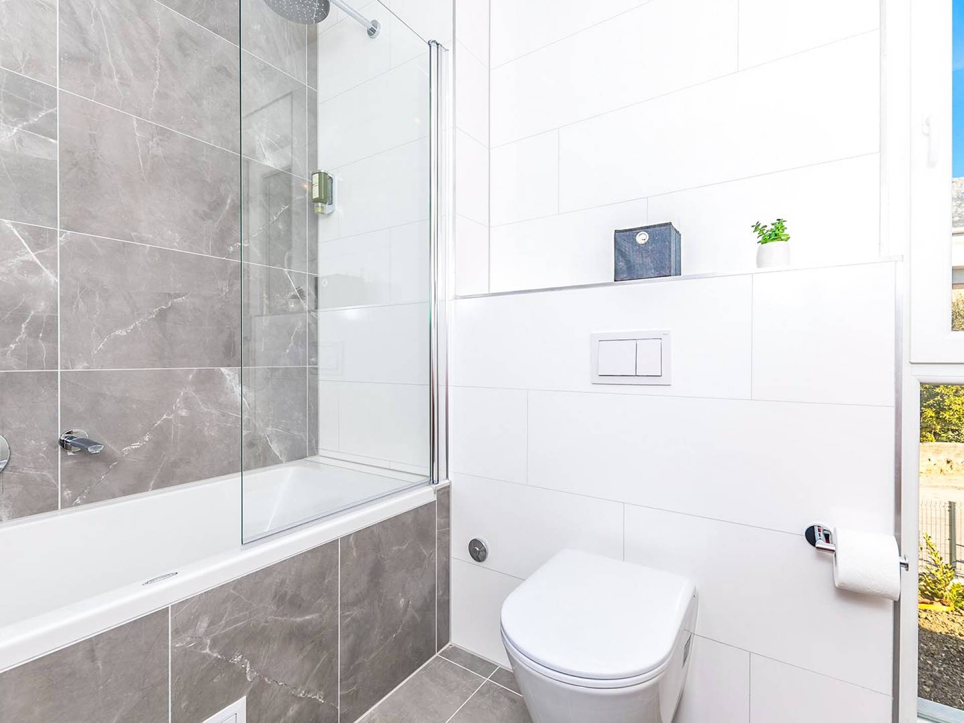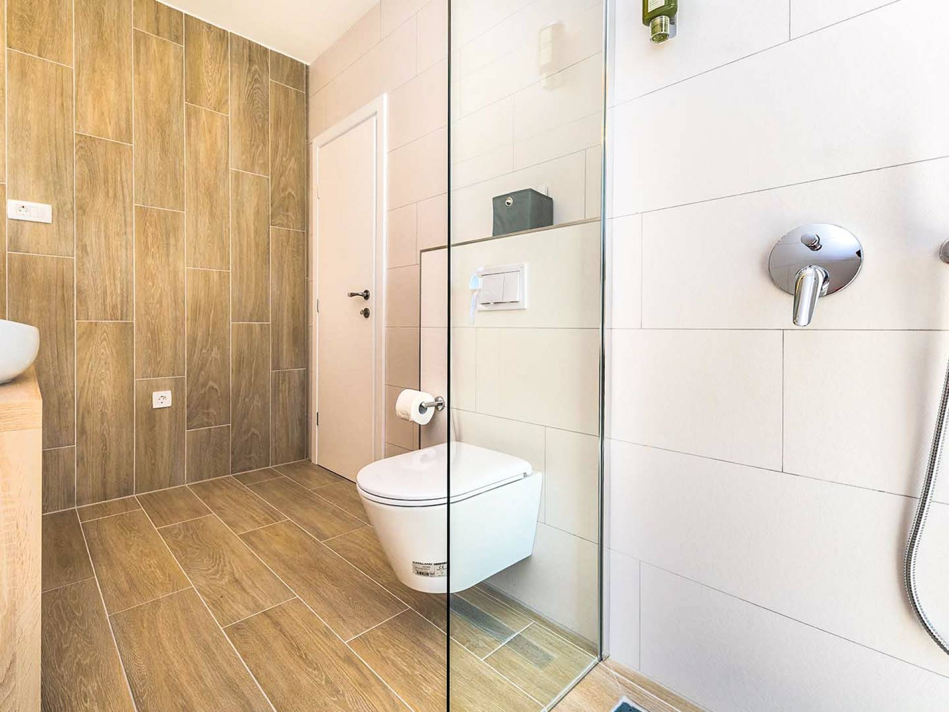 Una scala moderna conduce al primo piano, concepito come una zona relax con 3 camere da letto con letti matrimoniali e bagni en suite. Ogni camera della villa è dotata di aria condizionata e TV satellitare. Due camere condividono un ampio balcone attrezzato con mobili da esterno con vista parziale sul mare. Uno dei punti forti di questa magnifica villa è l'area esterna con una piscina esterna riscaldata (21 m2, 1,70 m di profondità), che utilizza l'elettrolisi come alternativa più sana al sistema di pulizia della piscina standard. Un incantevole giardino ben curato fornirà un rifugio perfetto per rilassarsi e prendere il sole sui lettini intorno alla piscina.