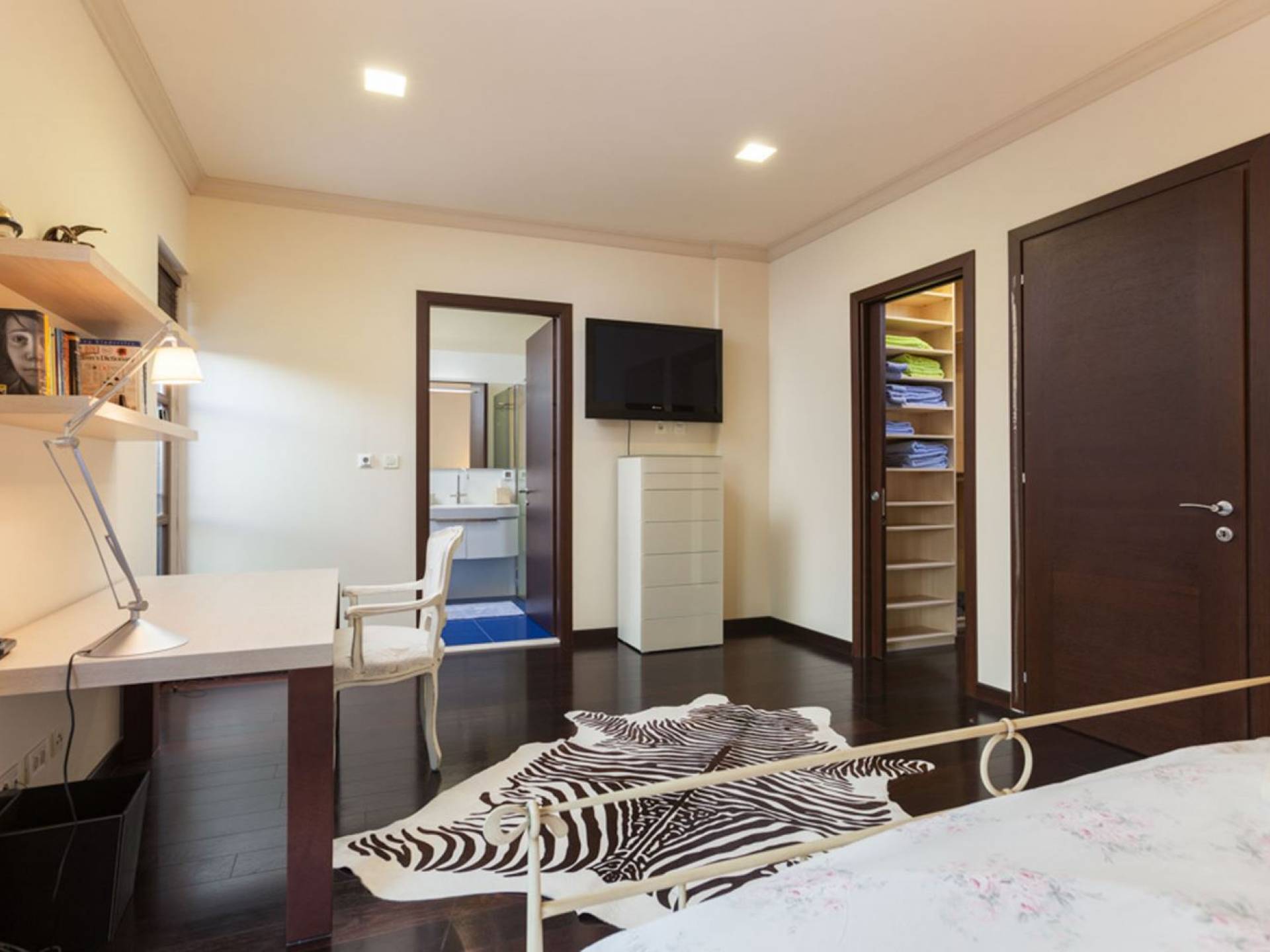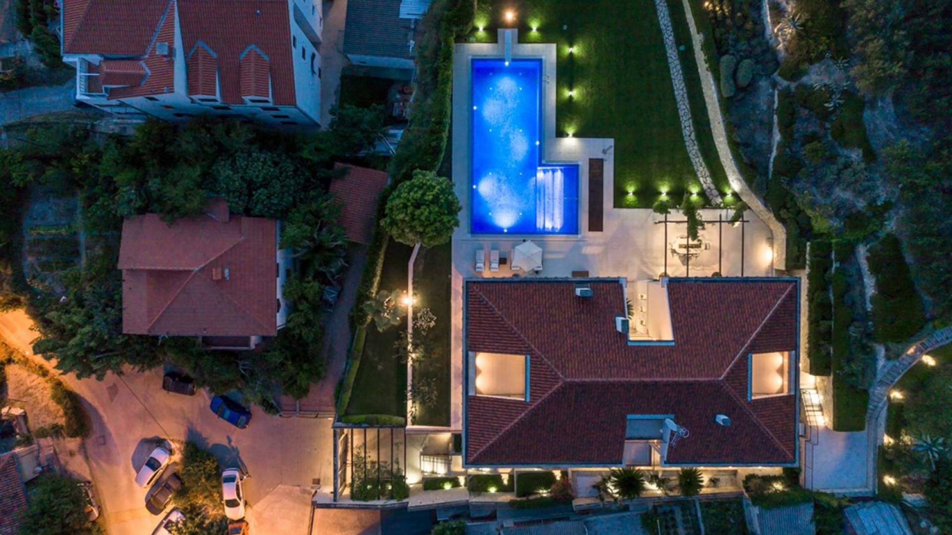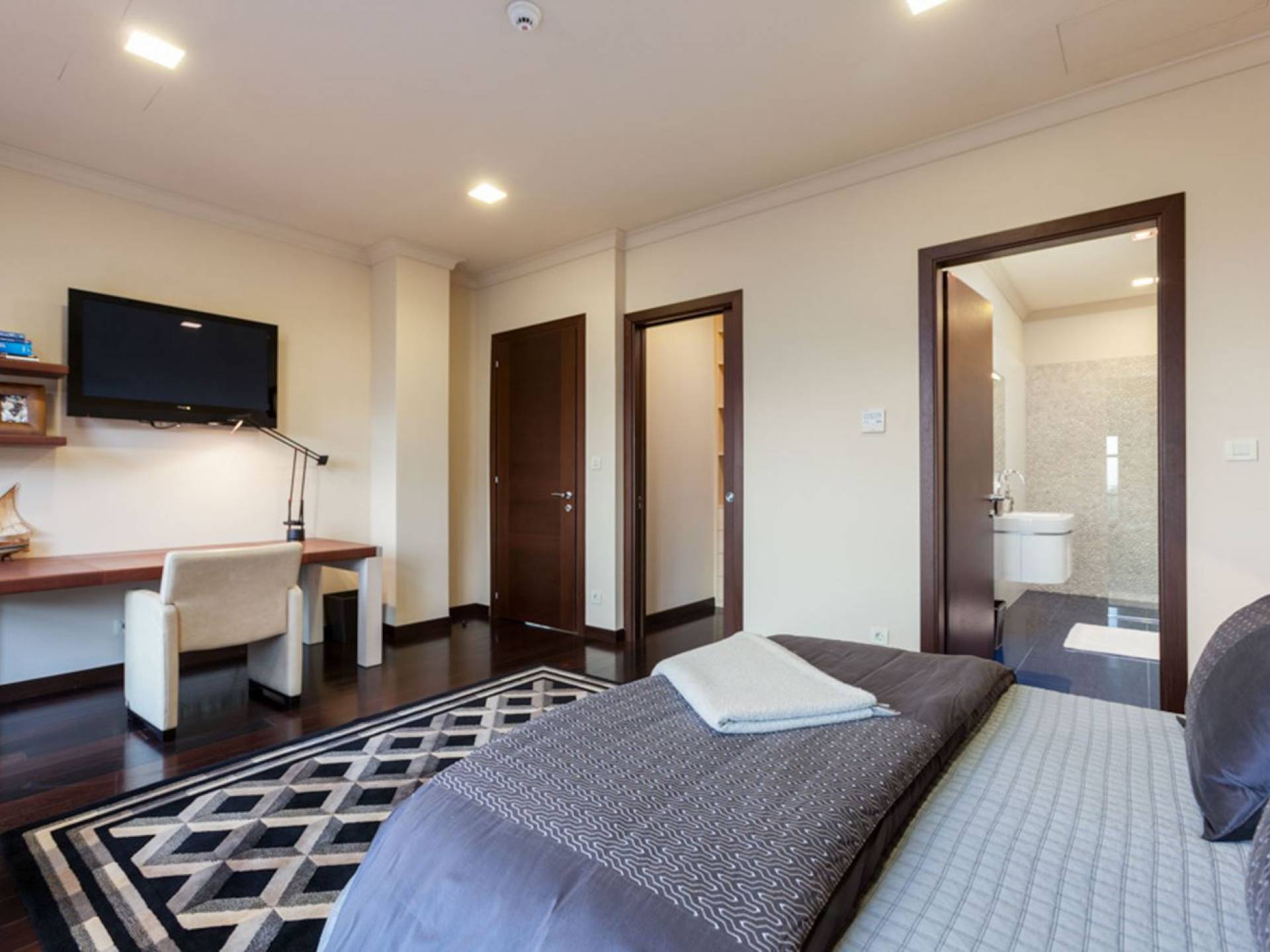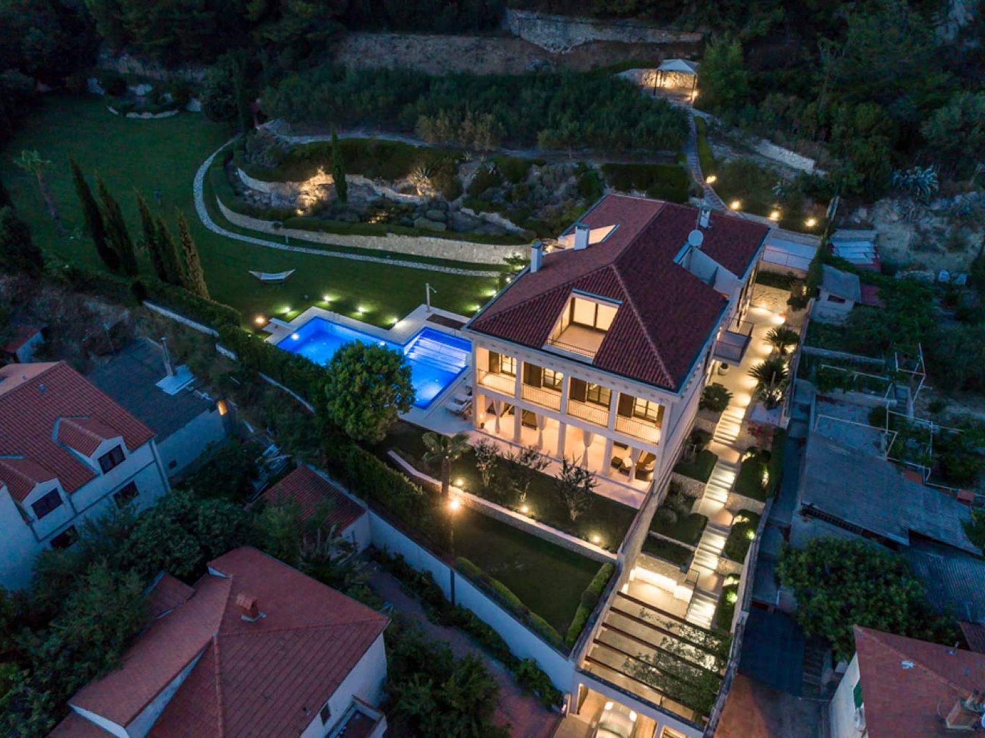La villa di lusso dispone di 4 camere da letto, 5 bagni e una toilette. La struttura a tre piani vanta ampie zone giorno, con molto spazio per socializzare in gruppo, trovando anche momenti privati per se stessi. Al piano terra si trovano due ampie zone giorno, ognuna elegante e confortevole. Una grande biblioteca sembra essere stata sollevata da un set cinematografico. Non potrai resistere a un'opportunità fotografica dietro la maestosa scrivania antica. Su questo piano si trovano anche una zona pranzo e una cucina completamente attrezzata con lavastoviglie, forno a microonde, macchina per il caffè e tutto ciò di cui potresti aver bisogno. Ingresso sud su una bella veranda aperta che si affaccia su una parte sud della città con vista parziale sul mare. Da lì si accede ai due piani superiori, tramite una scala.