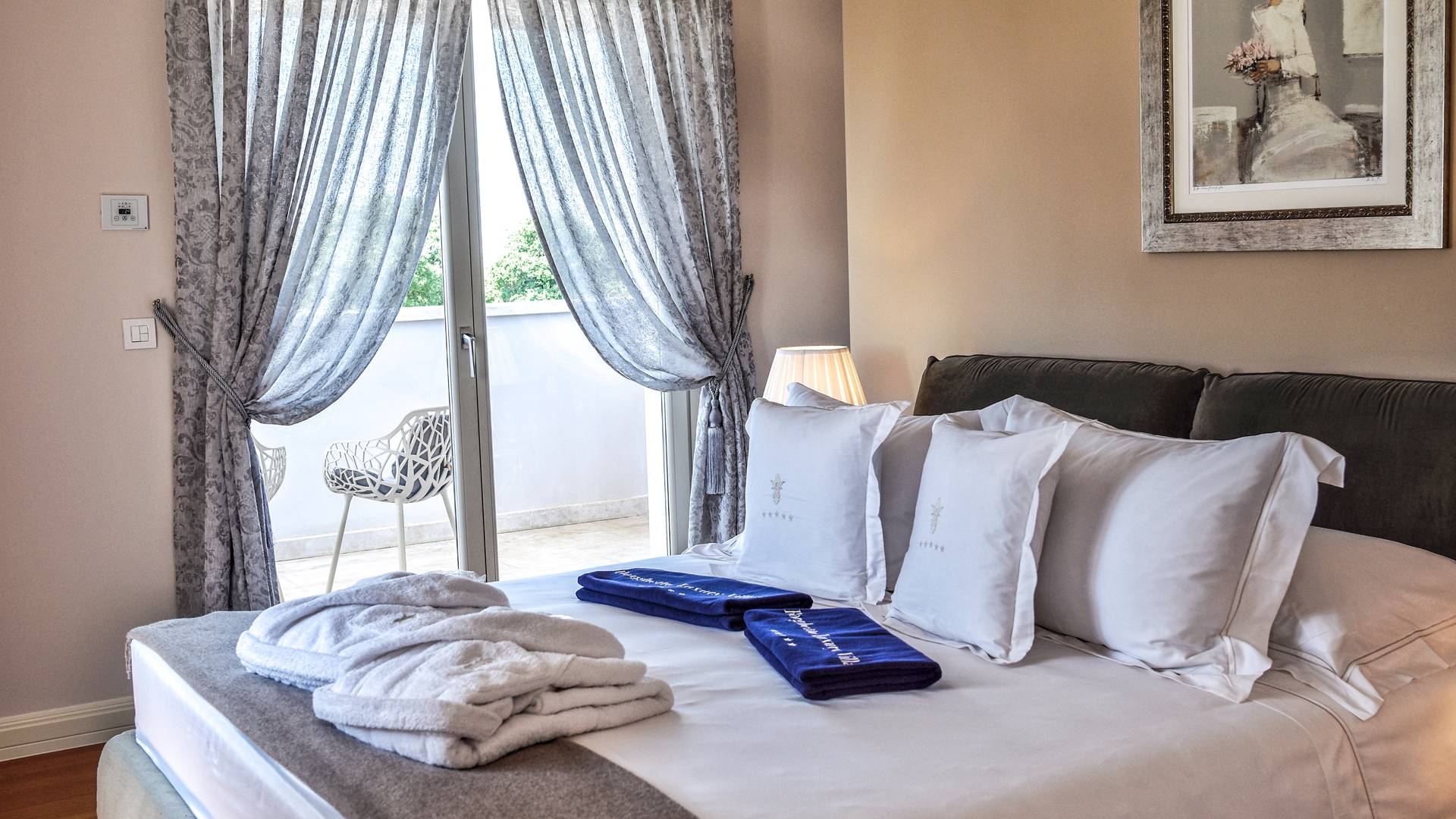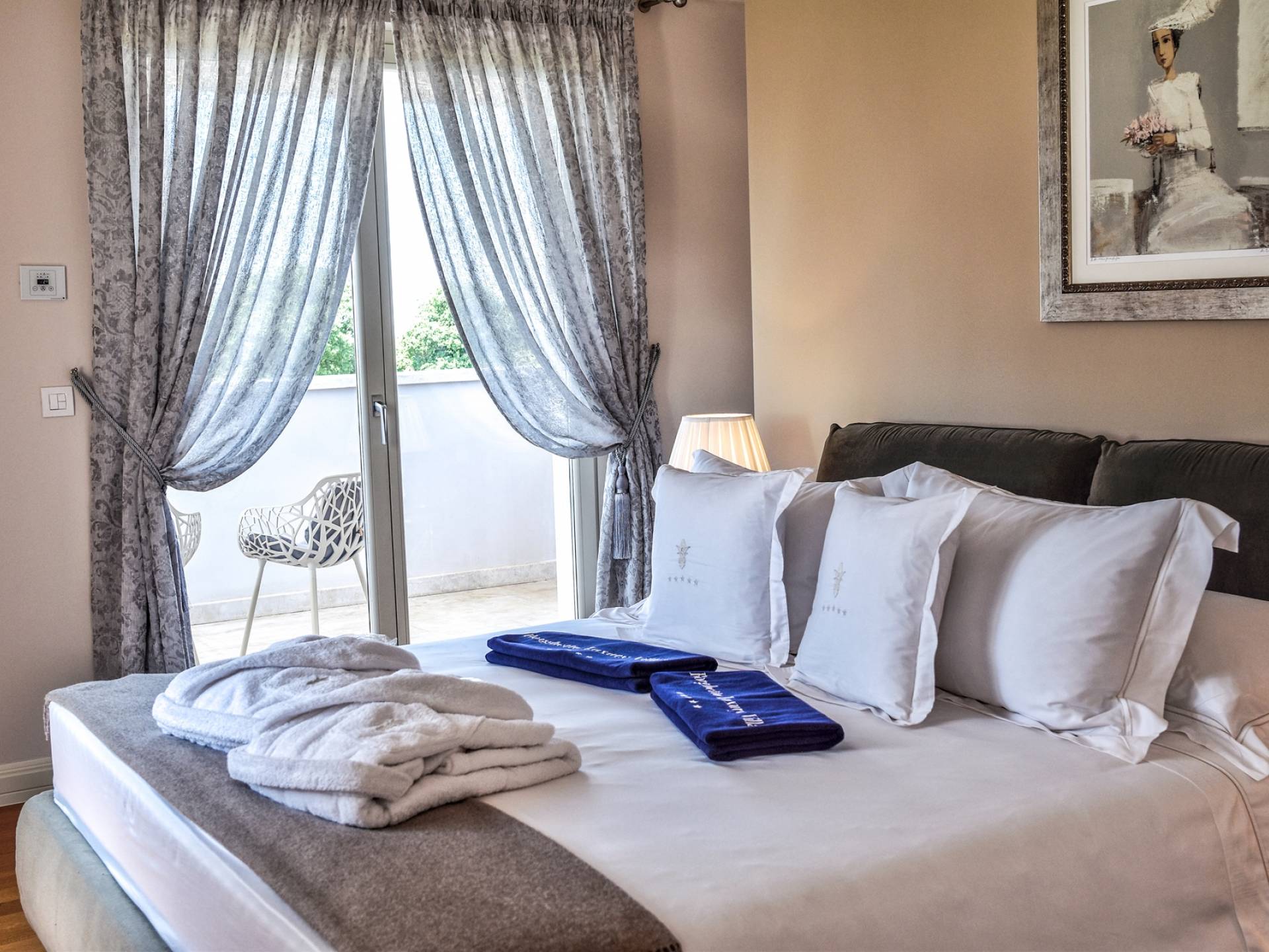 Al piano terra c'è una camera più grande con un letto matrimoniale e una camera più piccola con un letto matrimoniale che condivide un bagno con doccia e bagno turco. Gli ospiti hanno a disposizione un bagno per gli ospiti. L'ampia camera ha accesso diretto alla piscina e al giardino. La camera matrimoniale al 1° piano con letto king size dispone di bagno privato e ampio balcone con vista panoramica e piscina. Al 1° piano c'è un'altra camera da letto con letto matrimoniale, bagno privato e una loggia con vista panoramica sul mare. Un ampio corridoio al piano superiore ti dà lo spazio per rilassarti e goderti il tuo libro preferito sull'accogliente divano.