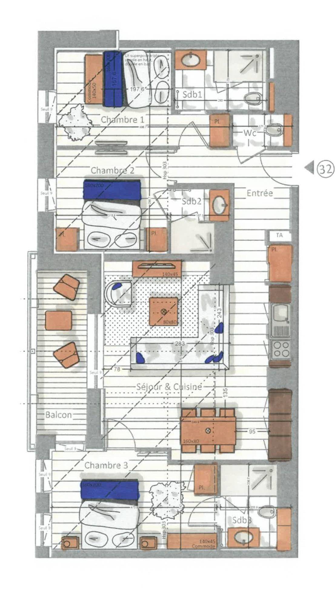 L'appartamento 32, situato al 4° piano del Kinabalu Residence, con una superficie di 85 mq, è perfetto per accogliere fino a 7 persone. Questo appartamento ha due camere da letto con letto matrimoniale, una camera con un letto matrimoniale a castello con un letto singolo e tre bagni privati. Il soggiorno con TV ha anche una cucina completamente attrezzata. Apprezzerete anche il balcone arredato. Questo appartamento dispone di tutti gli elettrodomestici necessari come lavatrice/asciugatrice, lavastoviglie, macchina da caffè Nespresso, utensili da cucina, ecc. Durante le vostre vacanze potrete beneficiare di un posto auto nel parcheggio sotterraneo, un deposito sci e Wi -Accesso Fi.