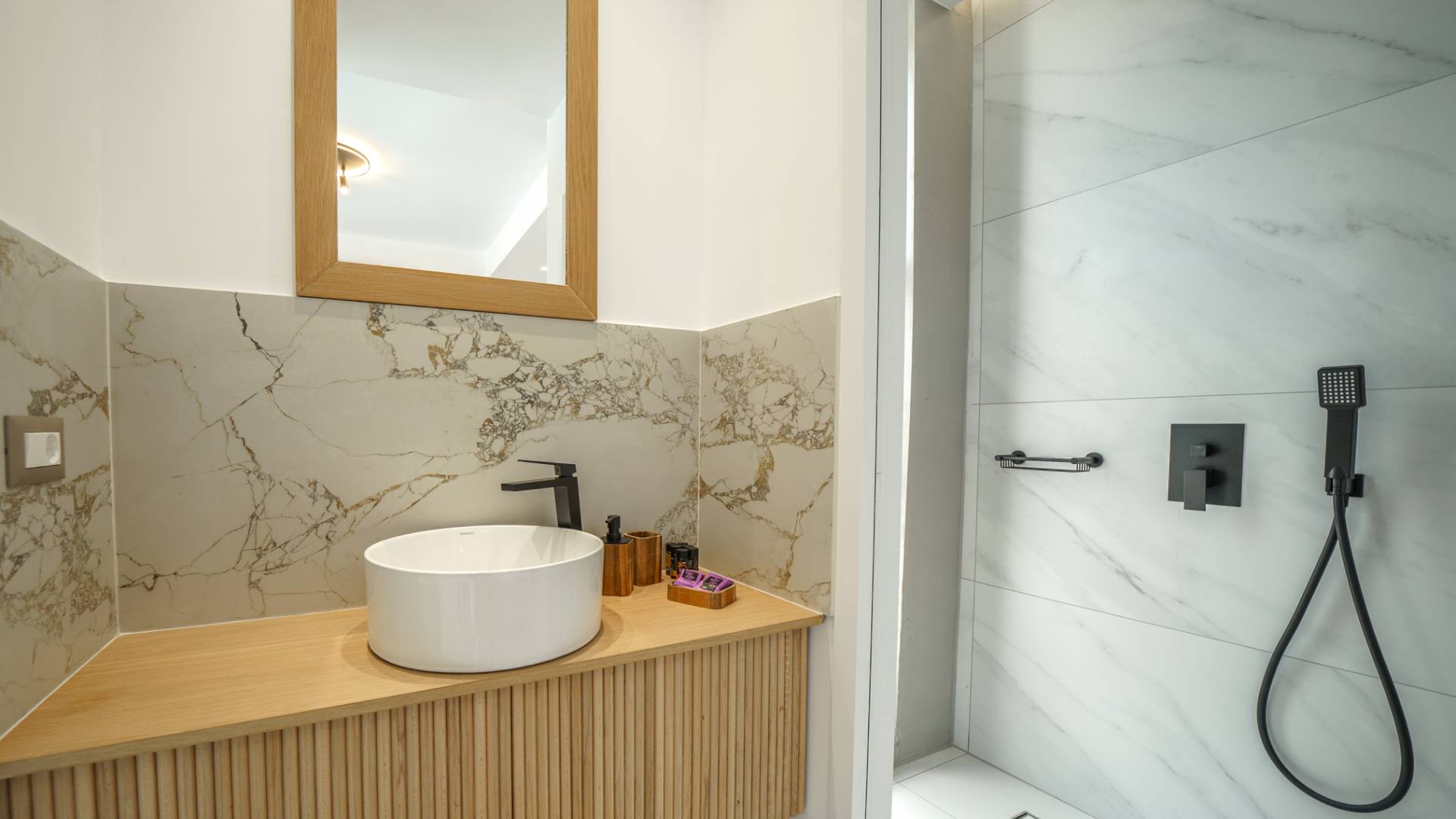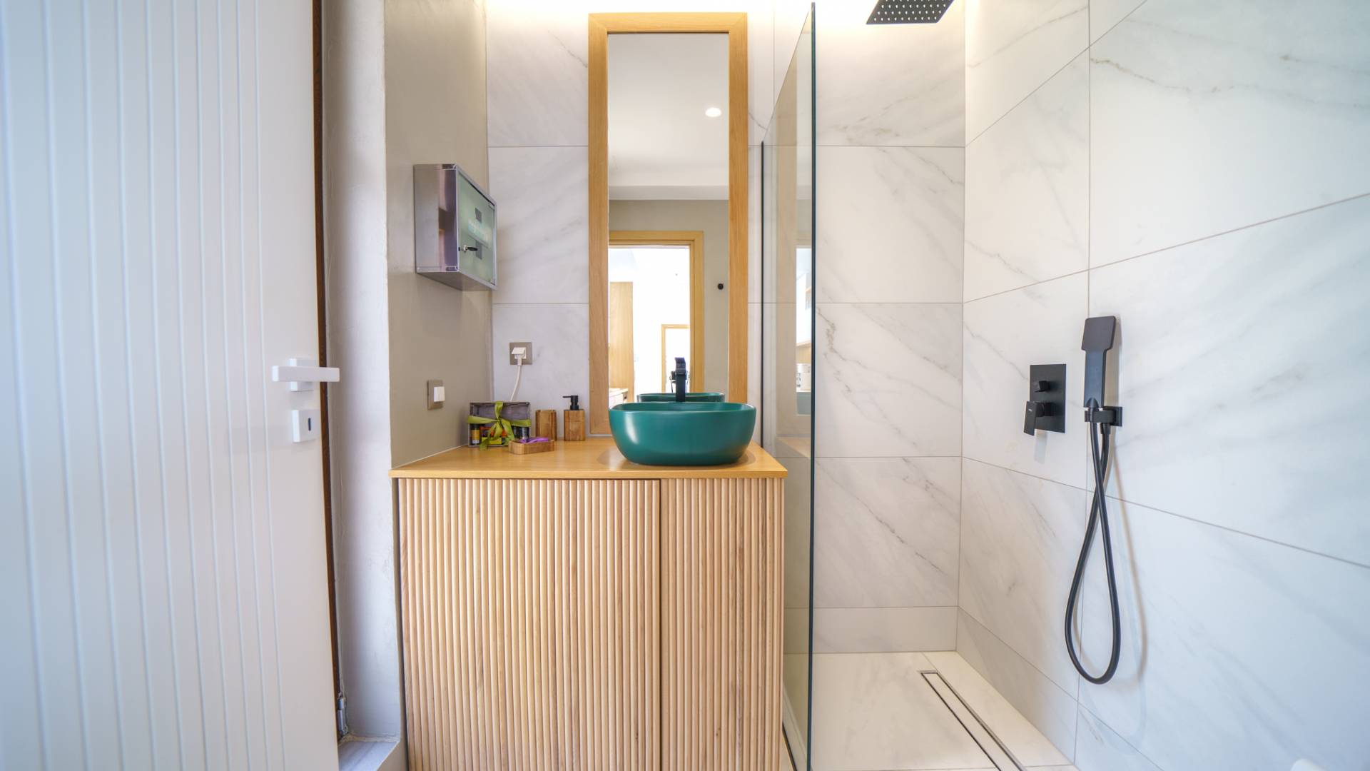 La quarta camera da letto si trova al piano superiore e dispone di un letto queen-size (1,60 mx 2,00 m), Smart TV da 43 pollici, aria condizionata e bagno privato con doccia. doccia. Questa camera offre anche un balcone privato con posti a sedere per godere di viste mozzafiato. Inoltre, il balcone dispone di una sauna a 4 posti con cabina doccia, offrendo un luogo perfetto per il relax.