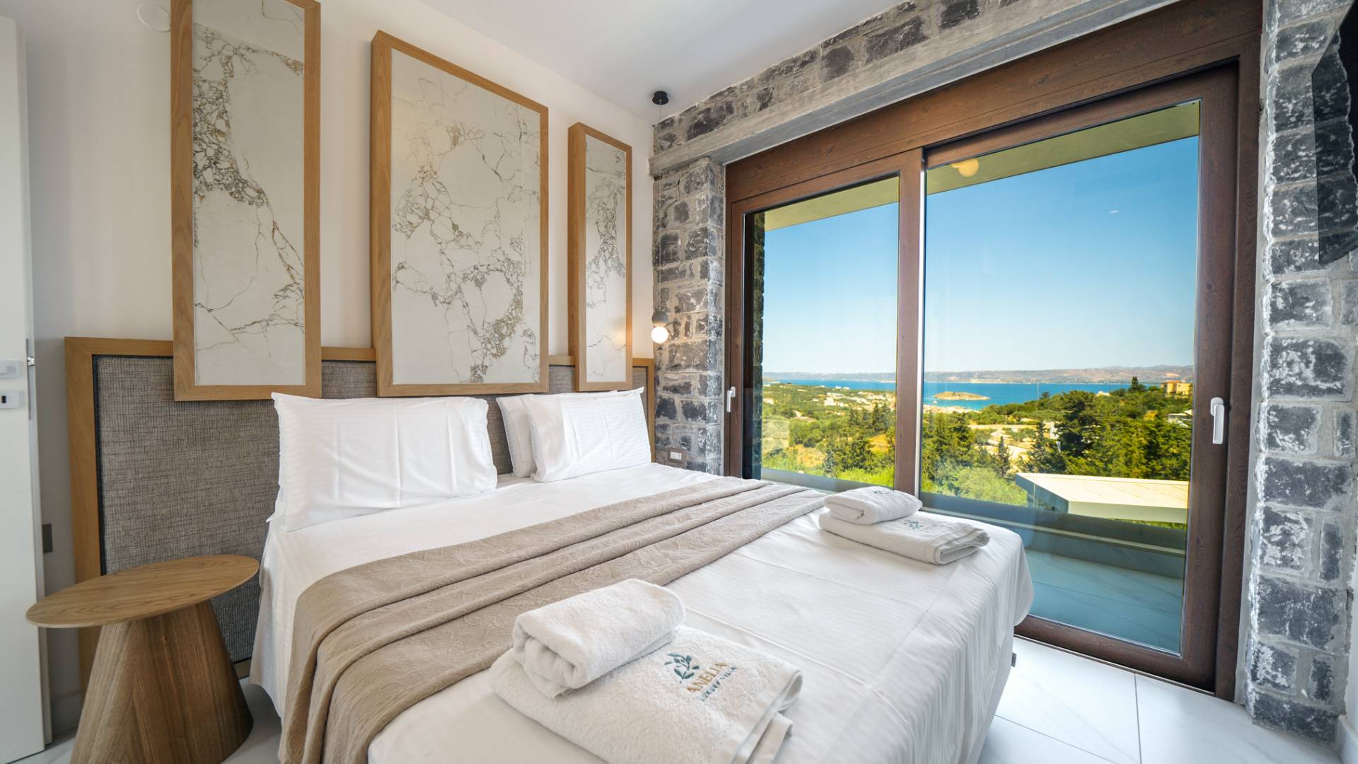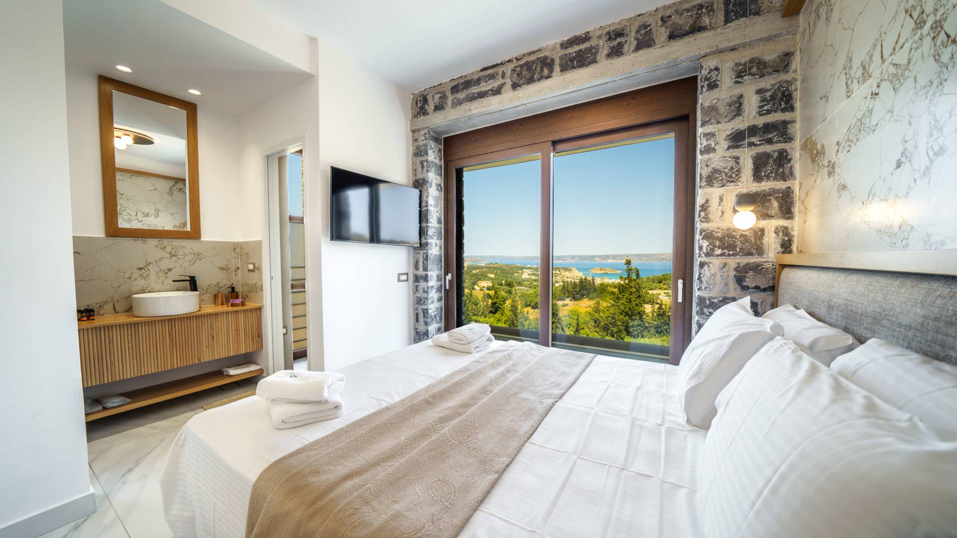 Al piano superiore, la seconda camera offre un letto queen-size (1,60 mx 2,00 m), una Smart TV da 43 pollici, aria condizionata e un bagno privato con doccia. Un balcone privato con comodi posti a sedere offre viste panoramiche sul mare e sul paesaggio circostante.