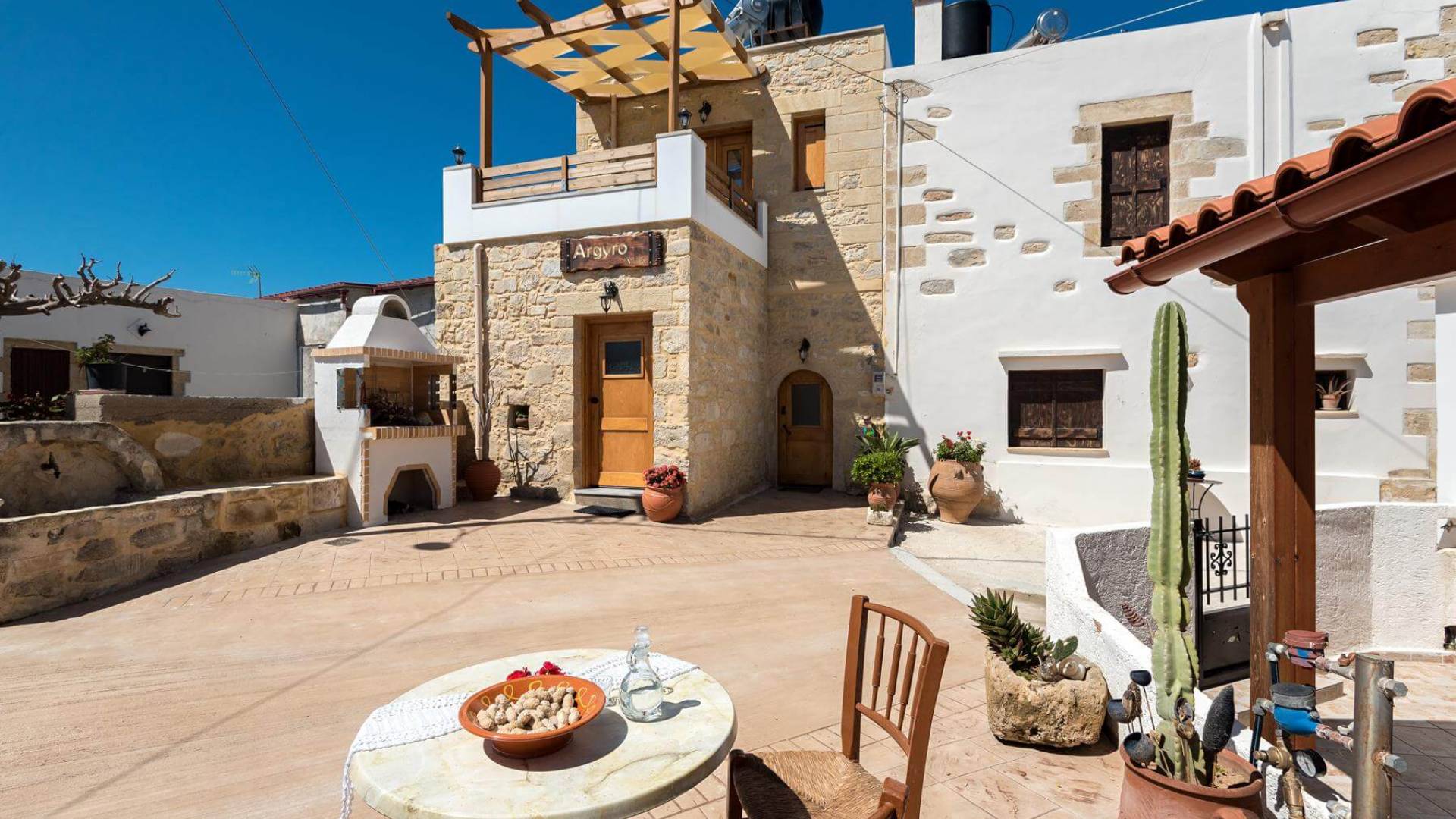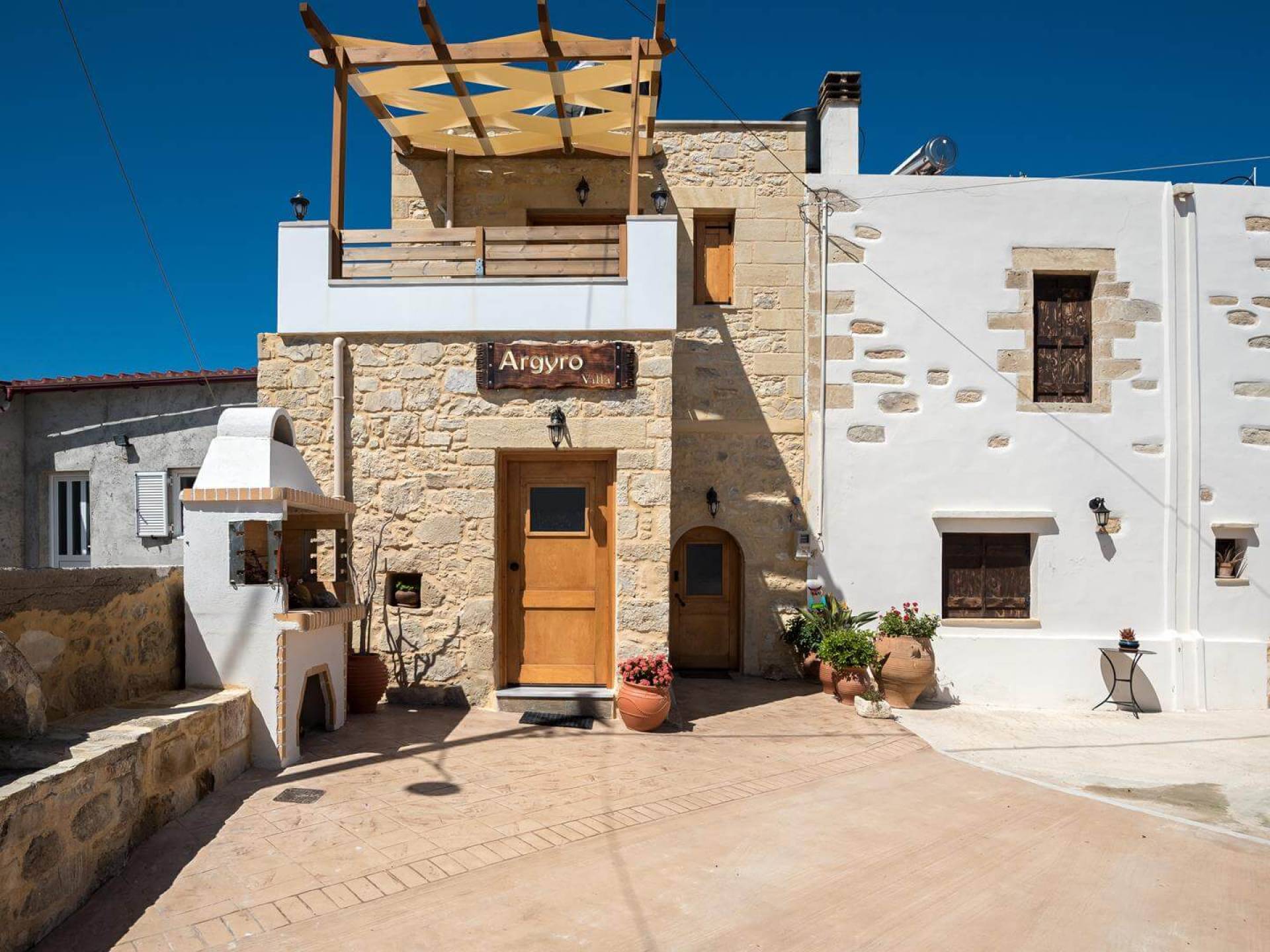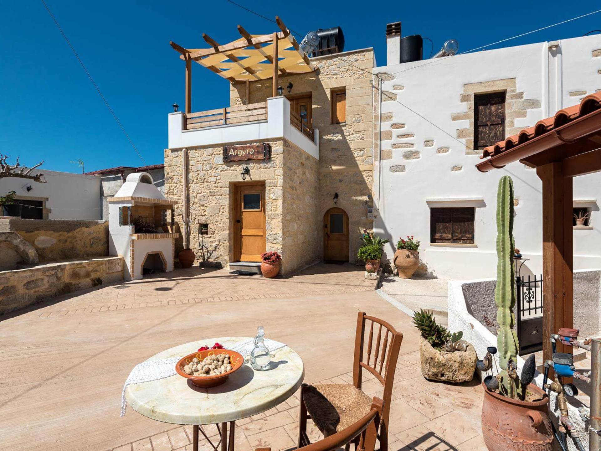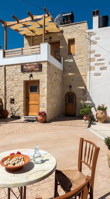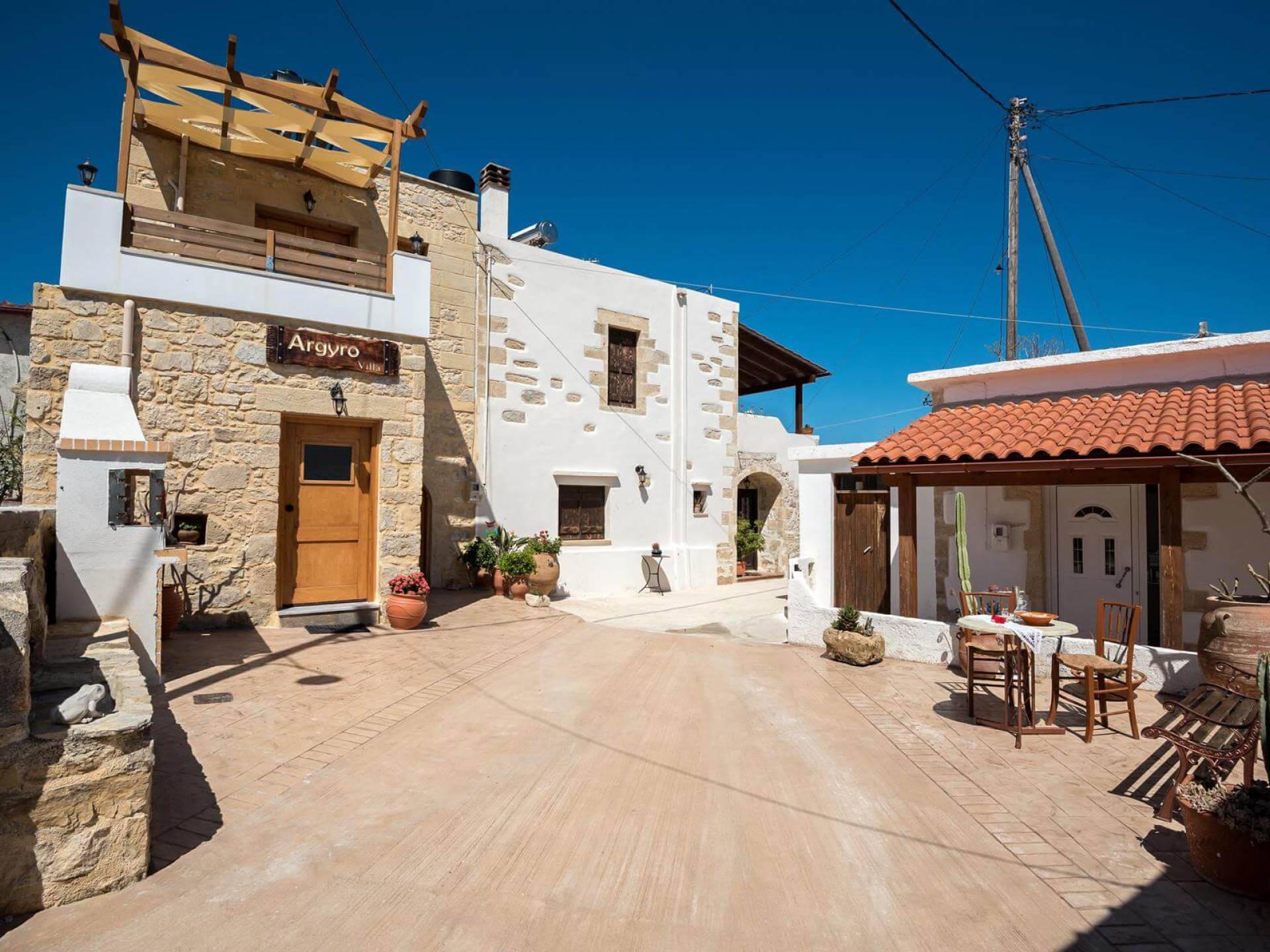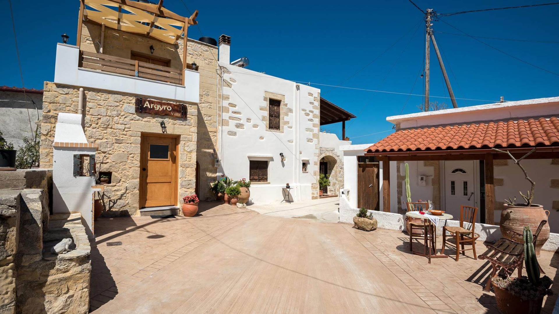 Costruita in una strada tranquilla del villaggio di Azogyras, l'Argyro Villa Chania è un'autentica villa in pietra cretese completamente rinnovata, che consiste in un edificio principale di 90 mq con archi in pietra e alcuni splendidi soffitti in legno. Argyro Villa Chania si trova molto vicino alle spiagge più famose dell'isola, Falasarna e Balos. Argiro Villa Chania si compone di due livelli. Al piano terra si trova un comodo soggiorno con TV e caminetto. Accanto c'è la zona pranzo e un tavolo da pranzo per un massimo di 6 persone.