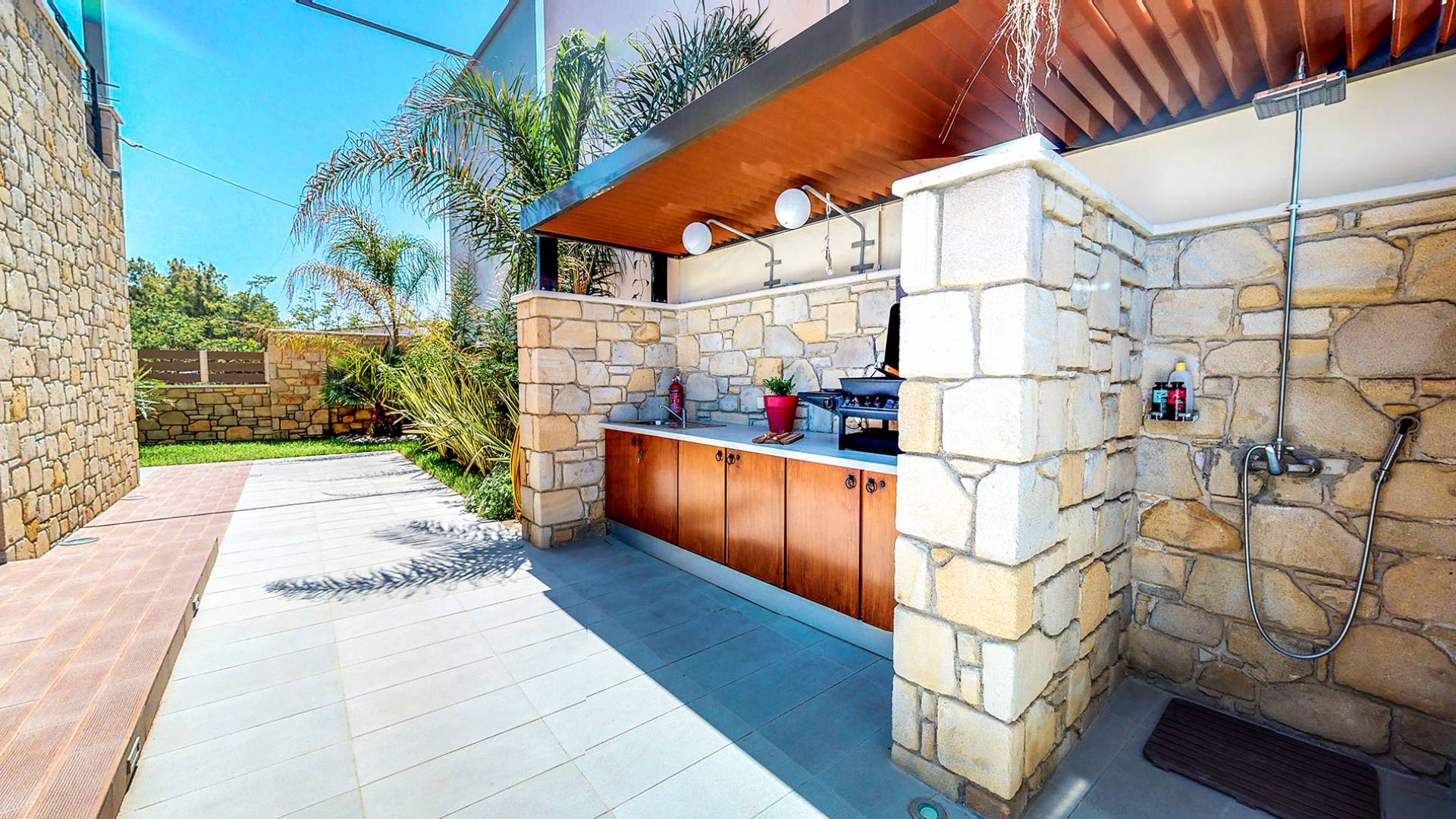 Strada pedonale privata che entra nella villa con piante locali a destra ea sinistra. Recinzione in pietra intorno alla villa armonizzata con dettagli in legno, lasciando il senso di sicurezza e privacy. Una piscina privata traboccante di 50 m2 con sezione per bambini. Inoltre, l'intera piscina è ricoperta da un materiale leggermente ruvido che la rende meno scivolosa e lascia una sensazione naturale di sabbia. (Facoltativo riscaldamento della piscina con supplemento di 350 Euro a settimana). 6 comodi lettini. Un barbecue a gas all'ombra del moderno pergolato e delle necessarie attrezzature da cucina.