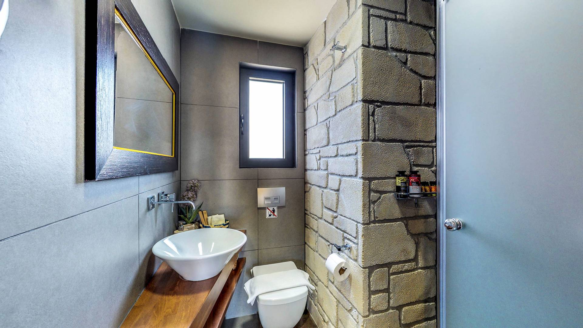 Un capiente soggiorno con comodi mobili moderni e un camino a doppia faccia che guarda sia all'interno che all'esterno della villa. Una cucina completamente attrezzata e dotata di tutti i servizi (microonde, lavastoviglie, tostapane, bollitore, forno, grill, piastre elettriche, frigorifero, frigorifero, tv, macchina per il caffè americano). Una camera con 2 letti singoli che possono essere uniti con un ampio letto matrimoniale. La camera dispone inoltre di un terrazzino privato con tavolino e comode poltroncine. Un bagno con cabina doccia. Servizi di lavanderia.