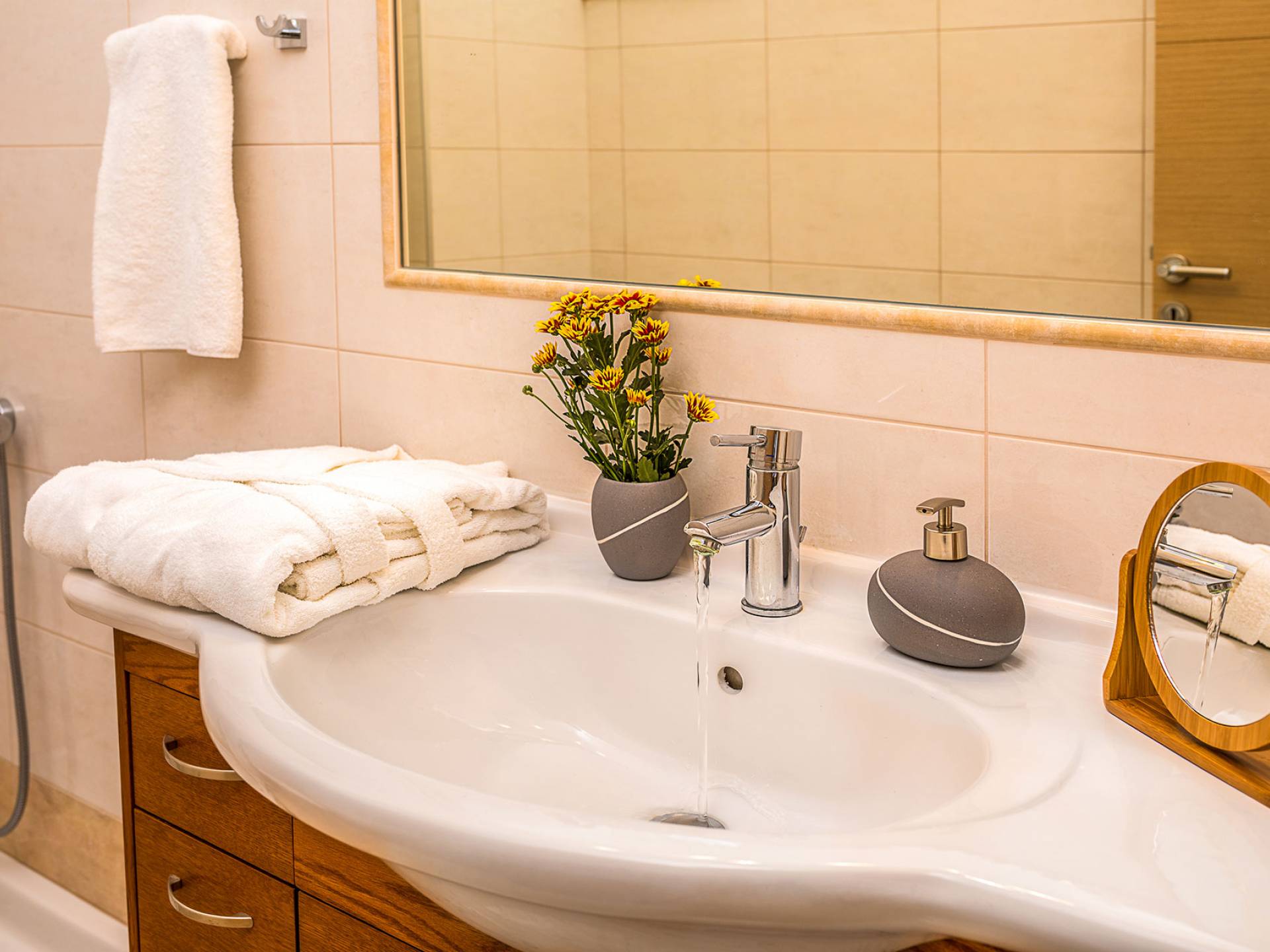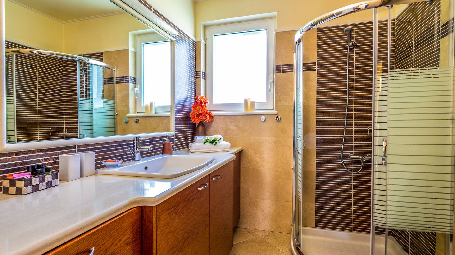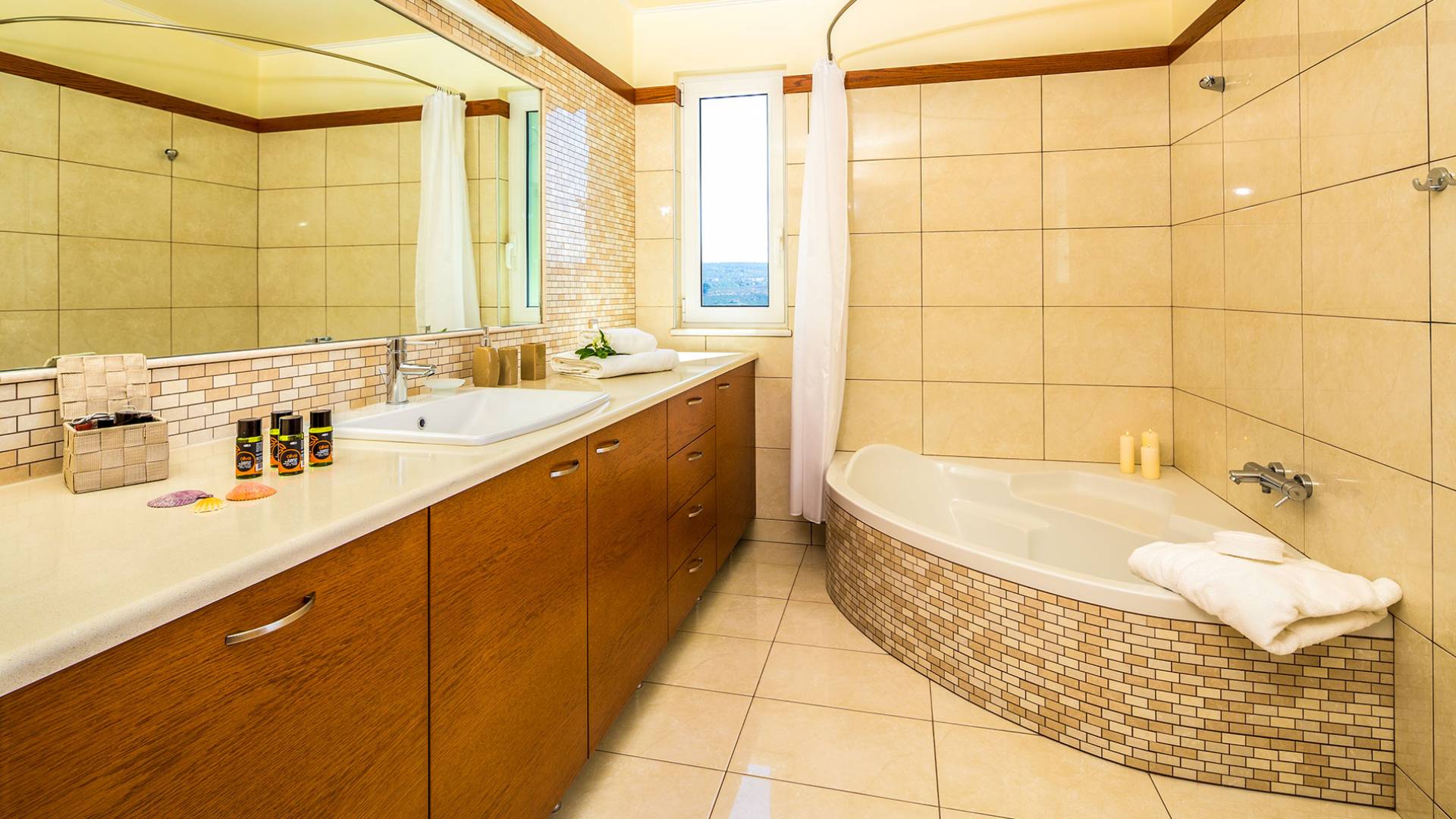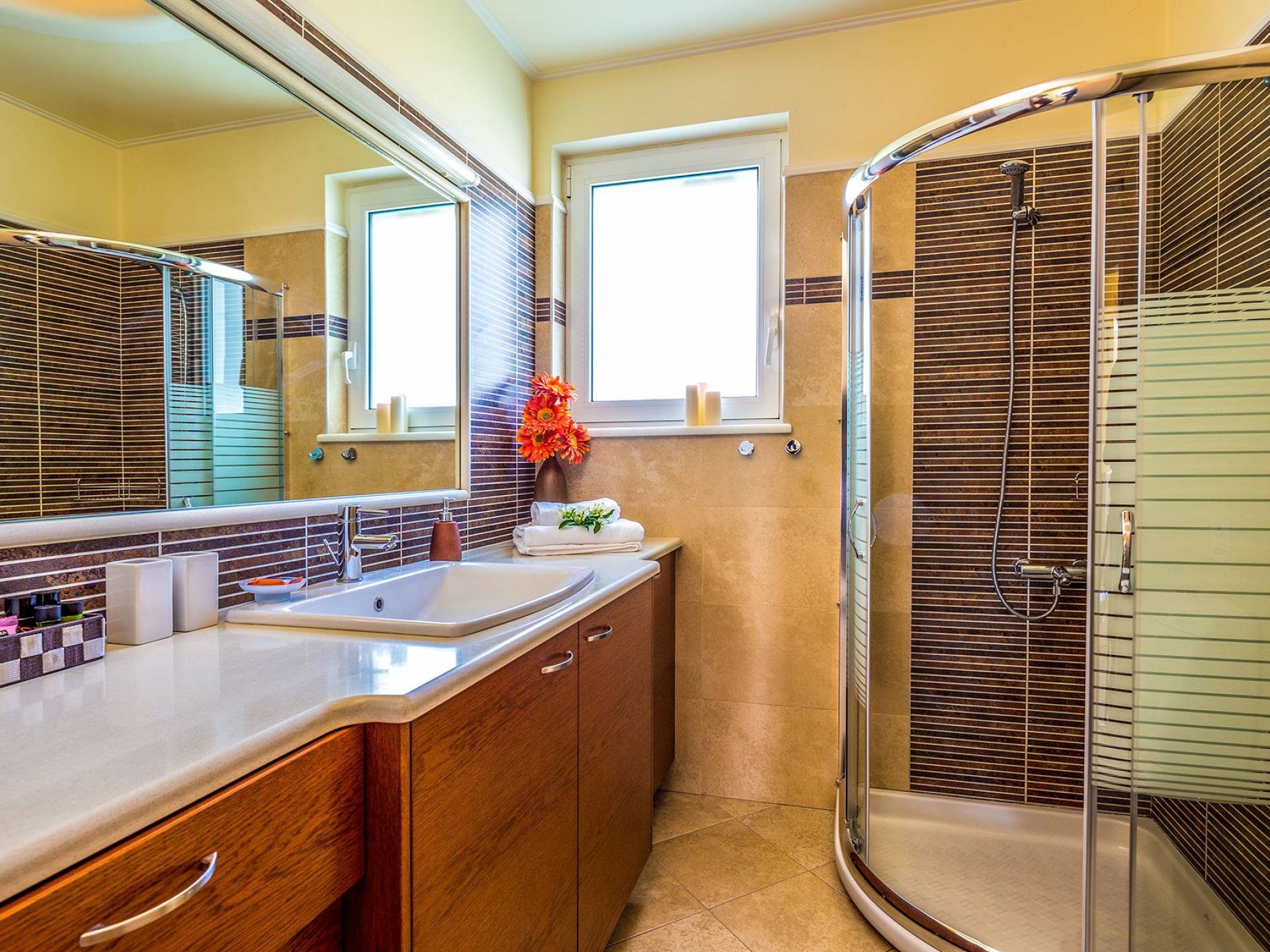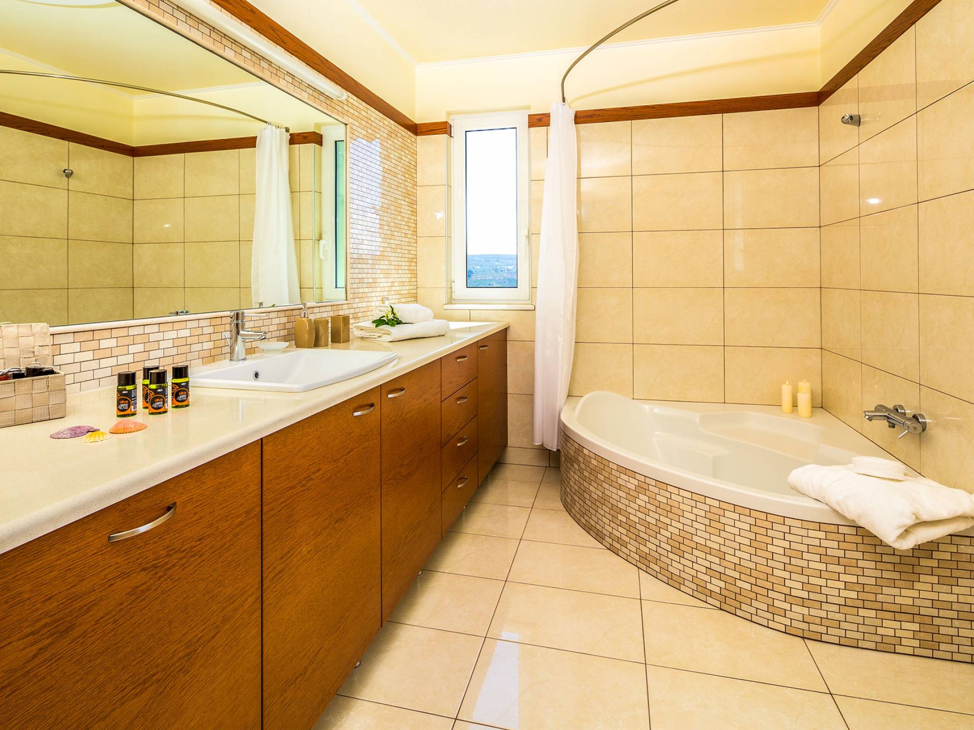 Bagno al primo piano: non poteva esserci qualcosa di più grande. Piastrelle abbinate a mosaico che ricoprono le pareti e la vasca da bagno. La grande vasca angolare semicircolare con seduta, può essere molto godibile. C'è una grande panca con un lavandino inserito. Un enorme specchio con una forte illuminazione può soddisfare tutte le tue esigenze. Questo bagno è dotato di lavatrice. L'acqua calda è fornita da un riscaldatore. Particolare eleganza aggiunge alla stanza il soffitto a cupola circolare con illuminazione nascosta.