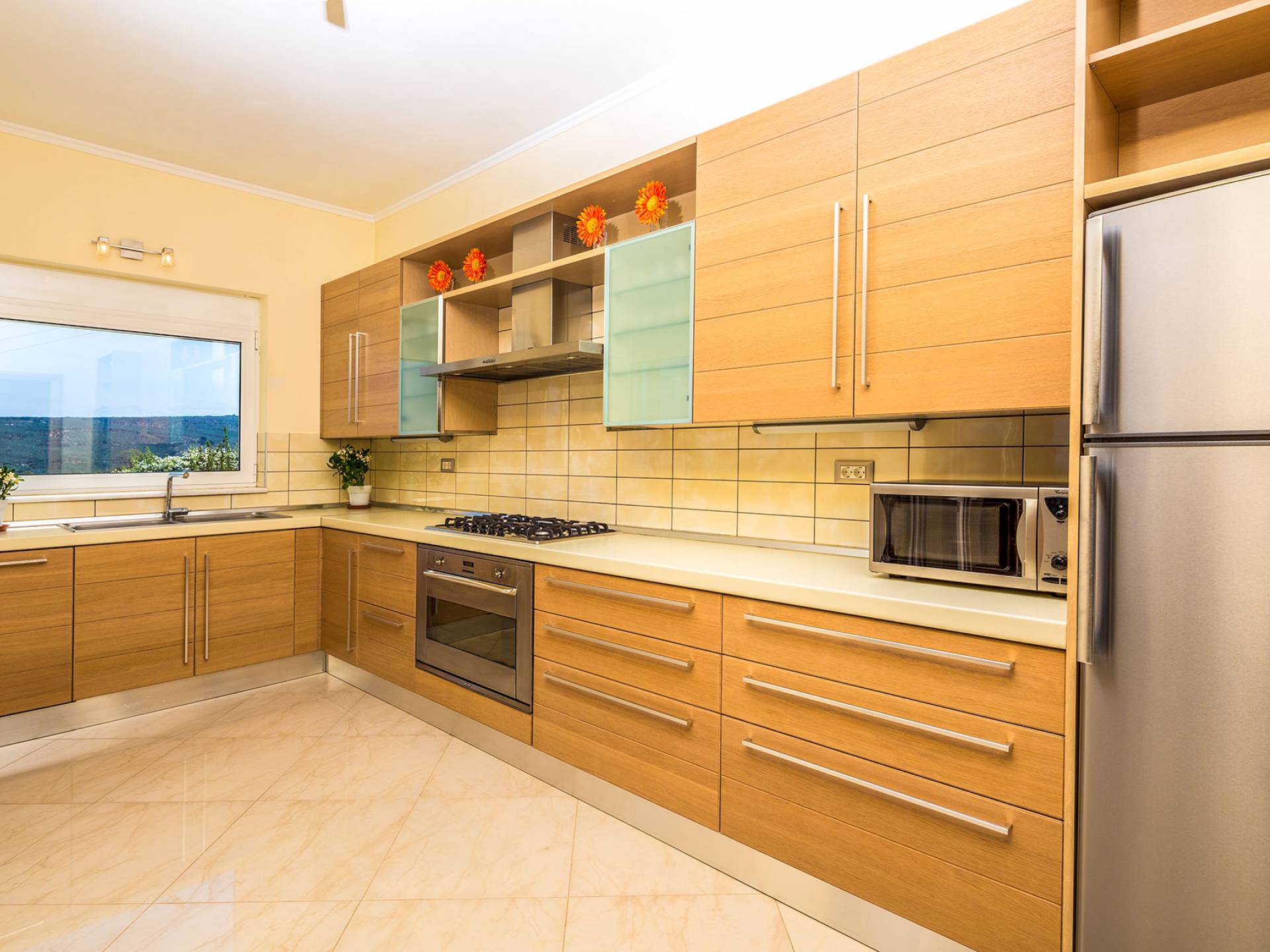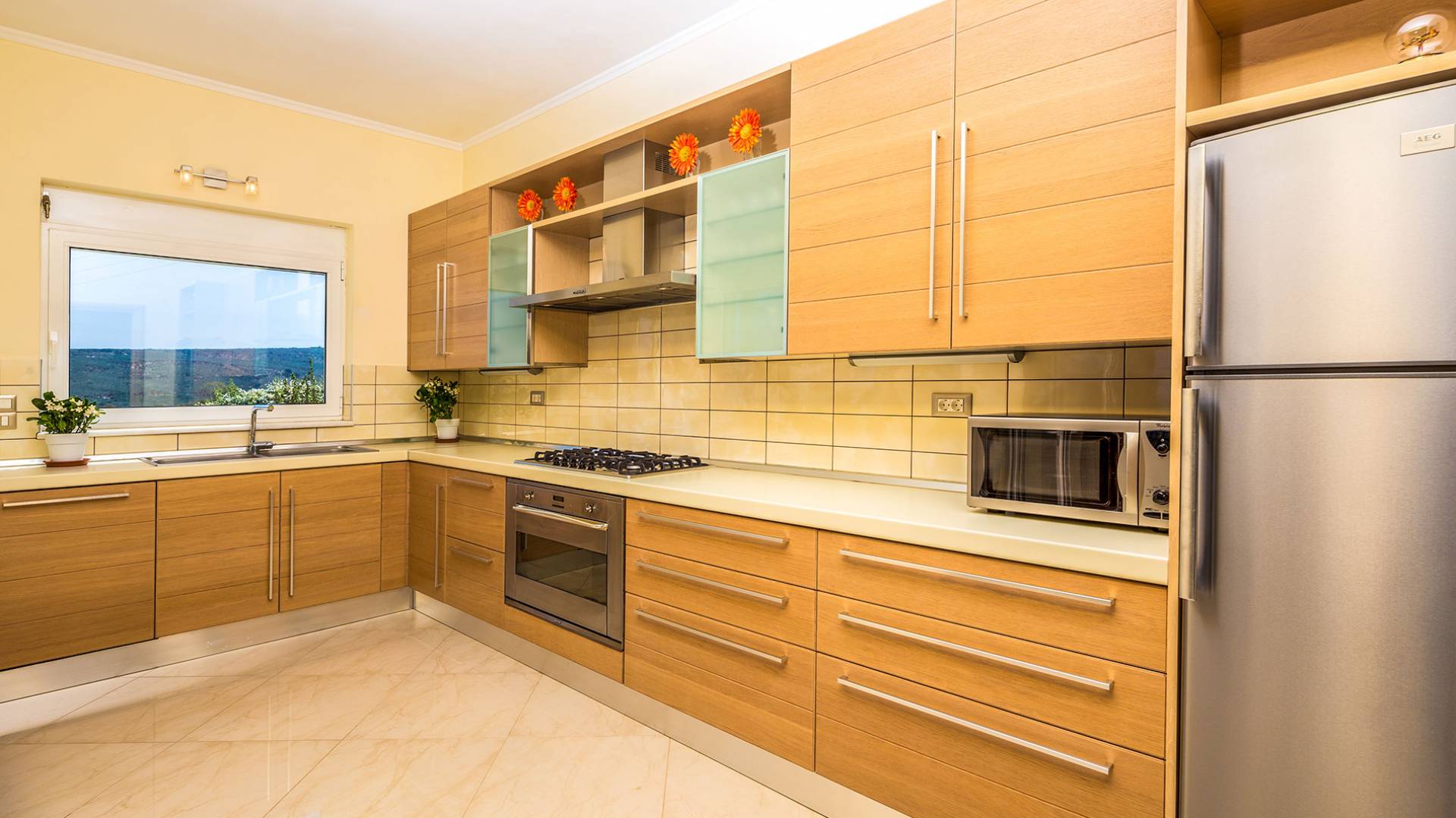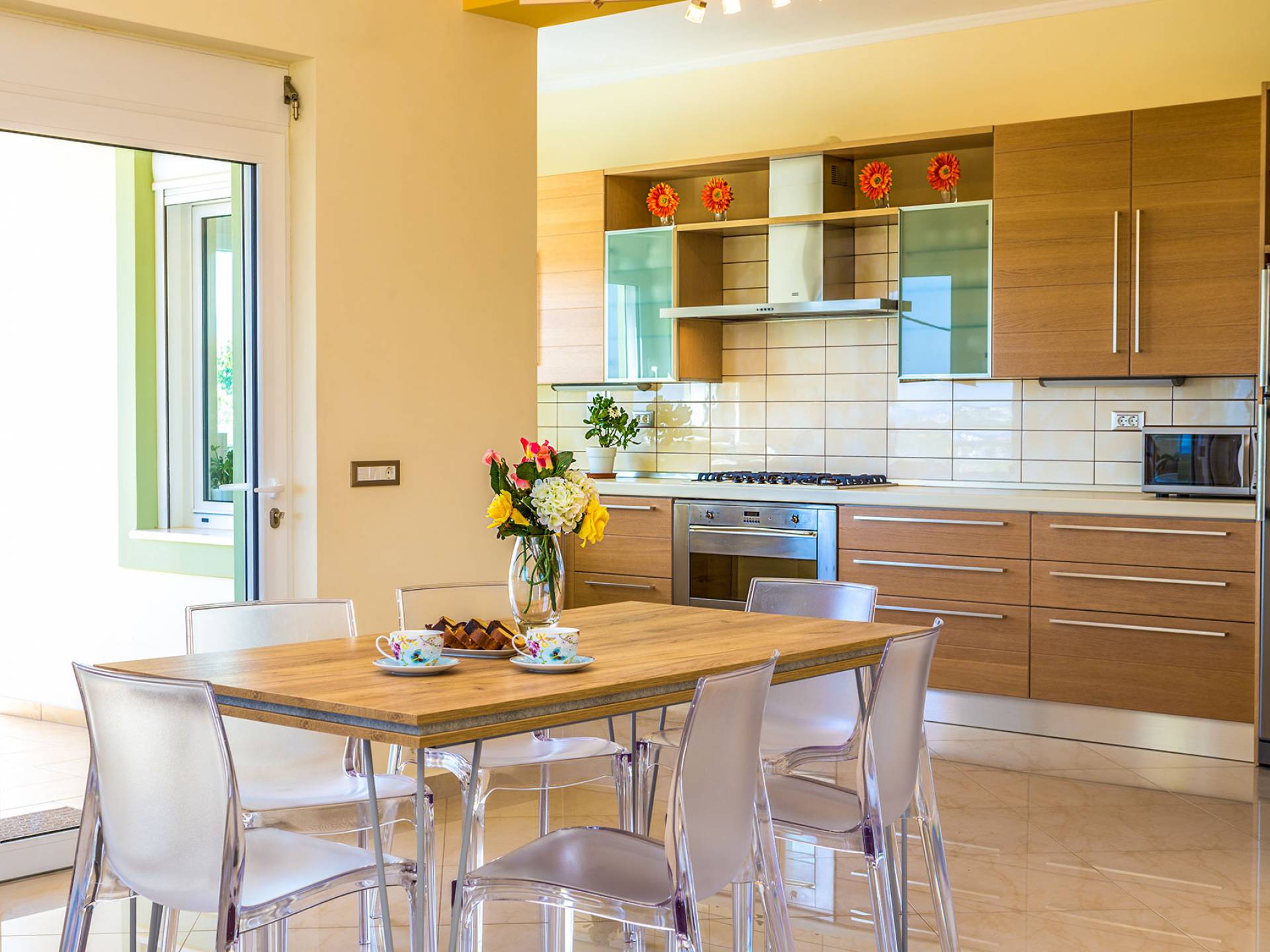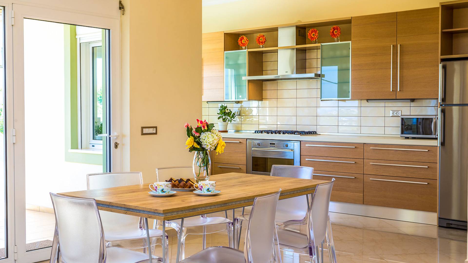 Cucina: Piani cottura a gas con 5 posizioni di cottura, Forno elettrico, Frigorifero, Lavastoviglie (super silenzioso), Forno a microonde, Tostapane, Macchine da caffè (Frappe, Espresso, Francese), Sbattitore, Spremiagrumi elettrico, Attrezzatura completa per cucinare e mangiare utensili.