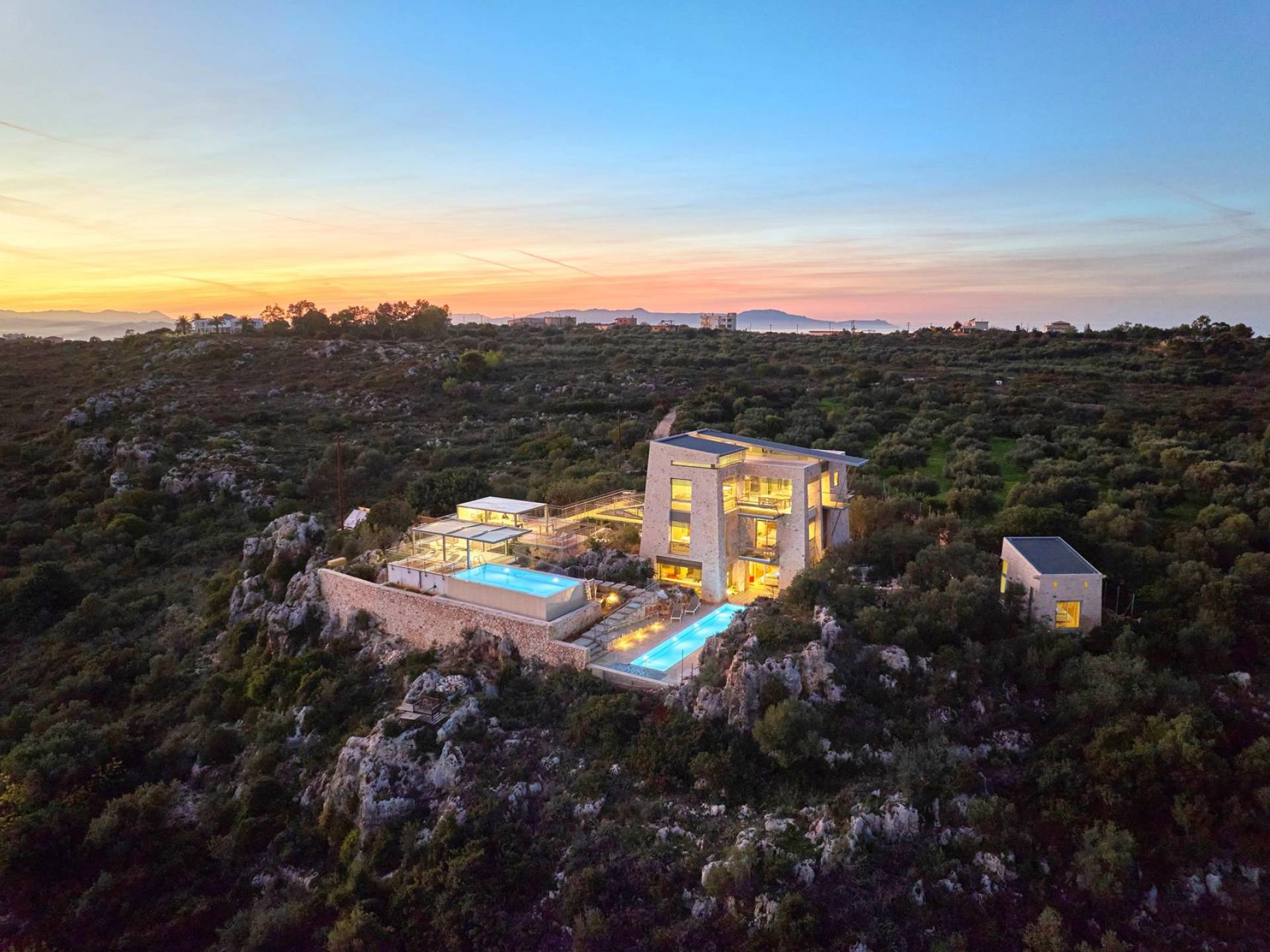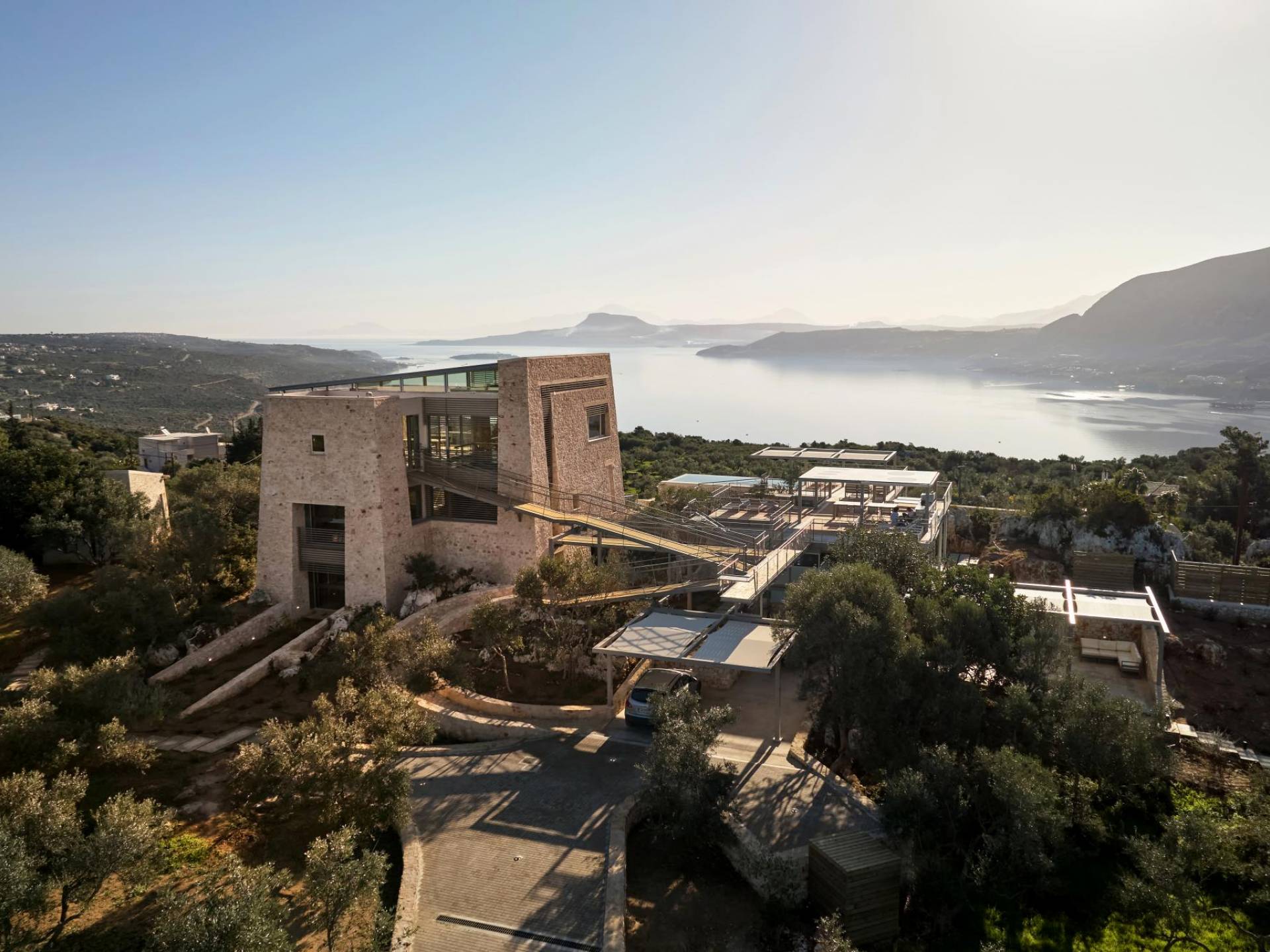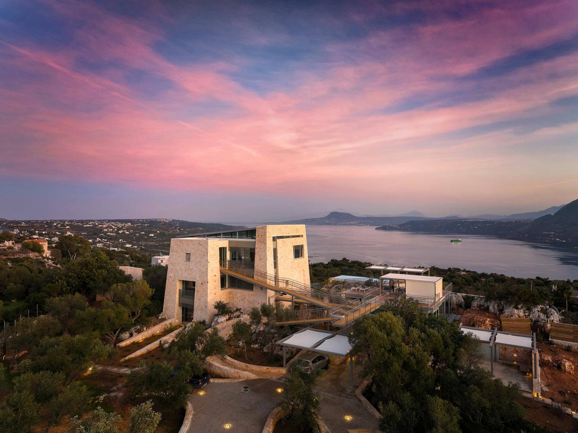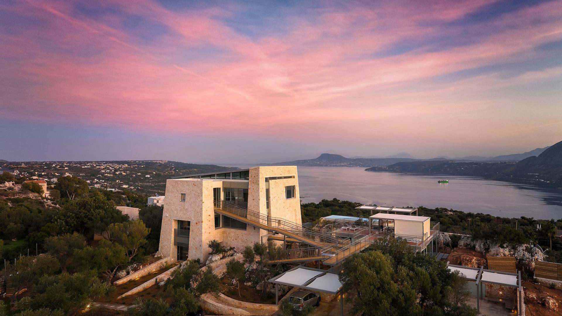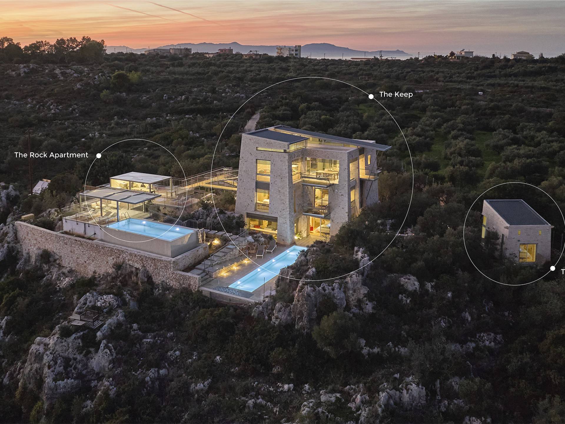Benvenuti a Olives and Thyme Retreat, uno spazio unico totalmente privato a cui si accede solo da una strada, senza che nessuno si affaccia su di esso. Arroccato sul bordo di una scogliera che domina la baia di Souda e attraverso le maestose Montagne Bianche e sopra la strada da Souda ad Akrotiri, Olives and Thyme offre la sua posizione unica. Il suo mix di pietra, legno, vetro e metallo crea uno stile newyorkese-svedese seduto in un uliveto cretese. Il complesso è costituito dall'edificio principale a forma di torre ''The Keep'', con un cottage in pietra separato sulla sinistra.