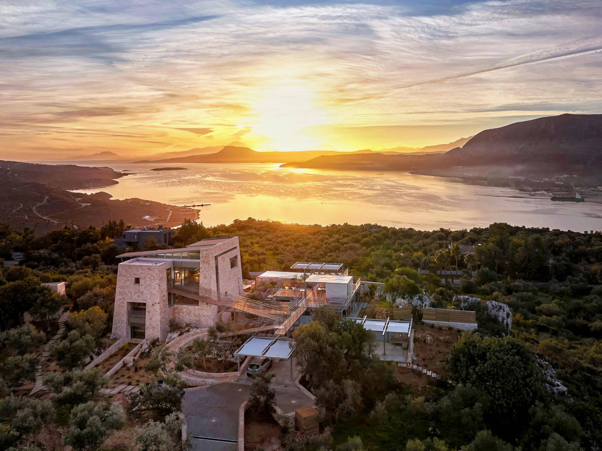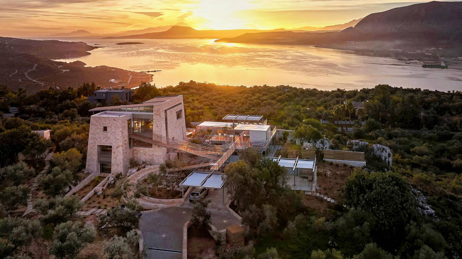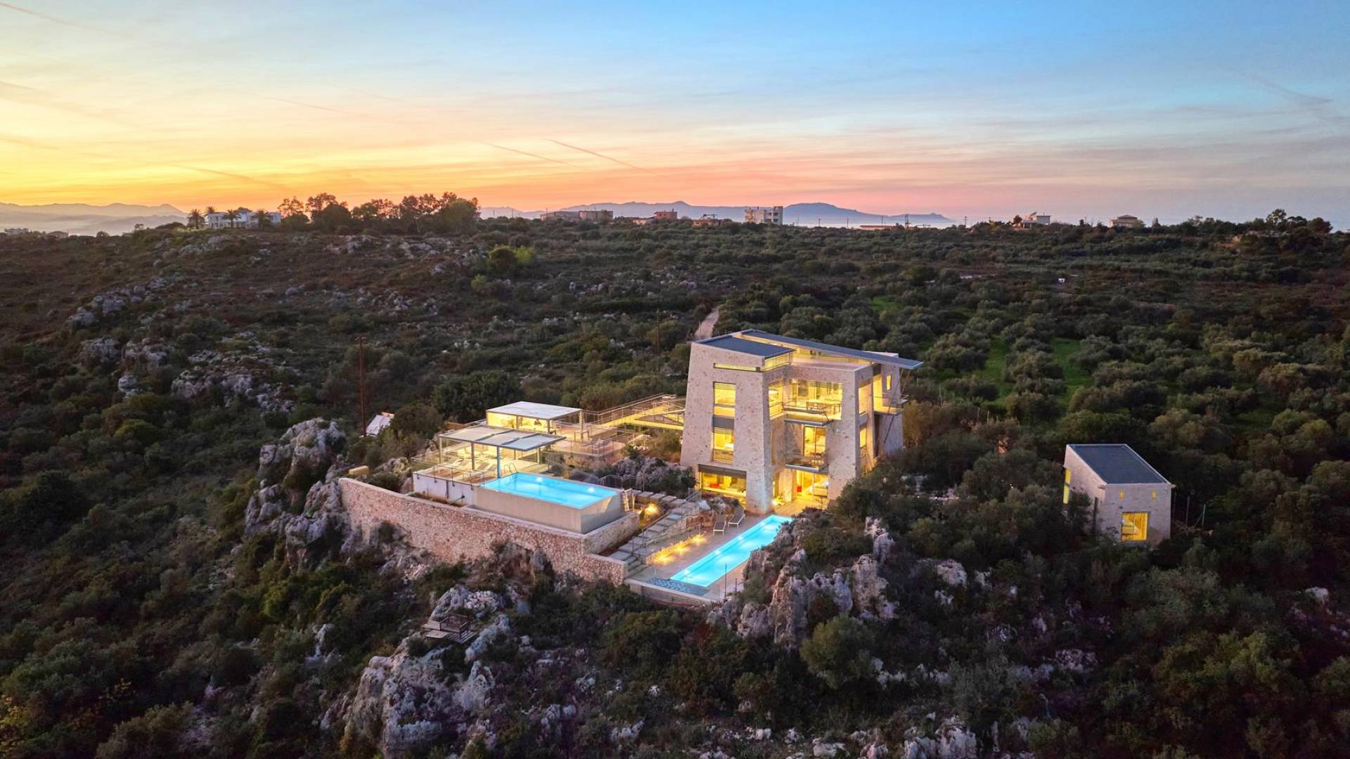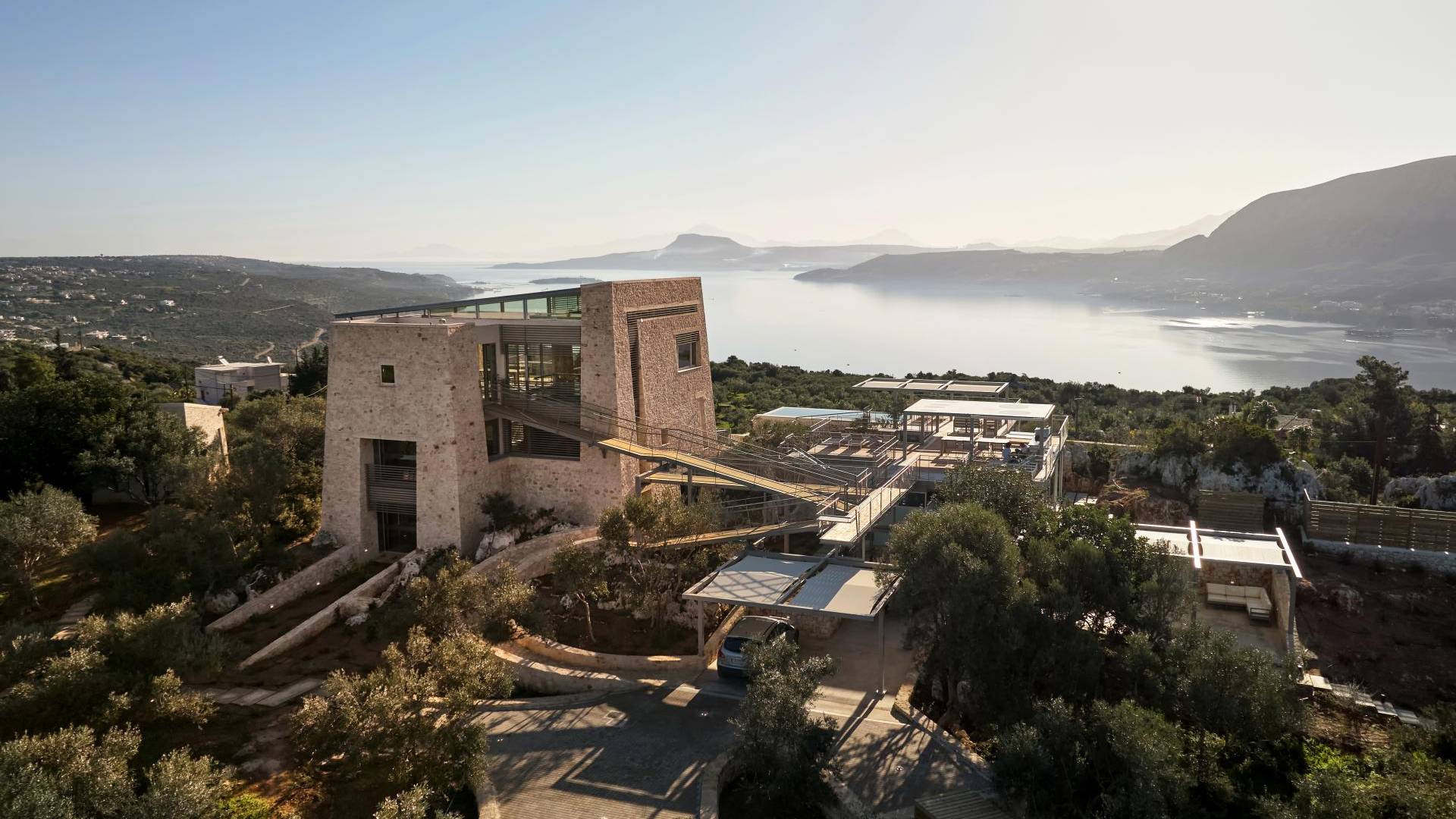 Benvenuti a Olives and Thyme Retreat, uno spazio unico totalmente privato a cui si accede solo da una strada, senza che nessuno si affaccia su di esso. Arroccato sul bordo di una scogliera che domina la baia di Souda e attraverso le maestose Montagne Bianche e sopra la strada da Souda ad Akrotiri, Olives and Thyme offre la sua posizione unica. Il suo mix di pietra, legno, vetro e metallo crea uno stile newyorkese-svedese seduto in un uliveto cretese. Il complesso è costituito dall'edificio principale a forma di torre ''The Keep'', con un cottage in pietra separato sulla sinistra.