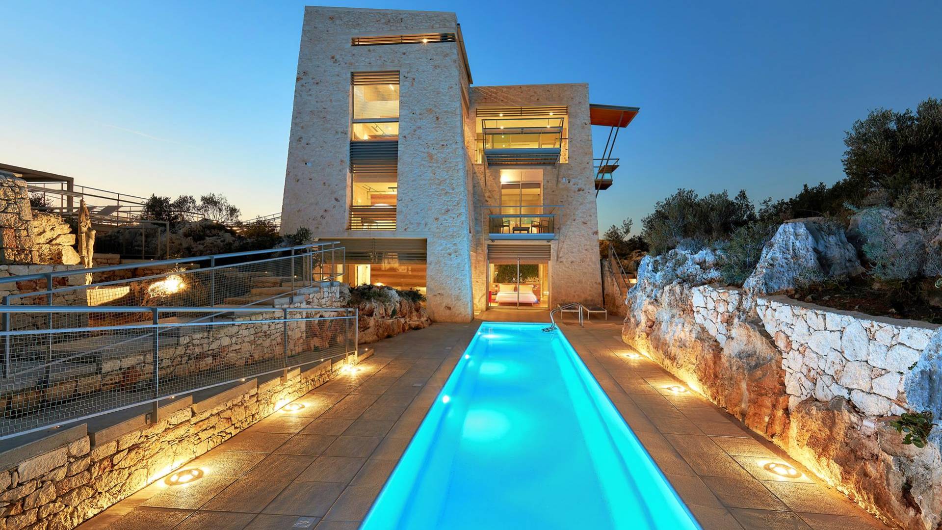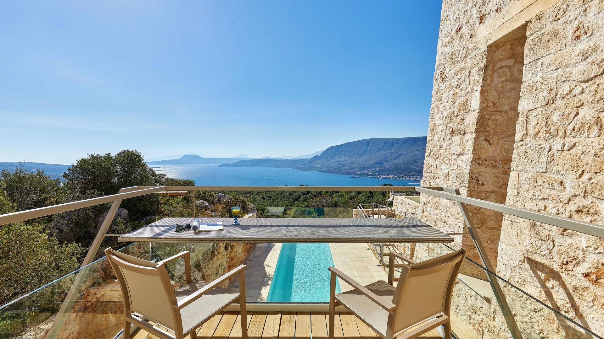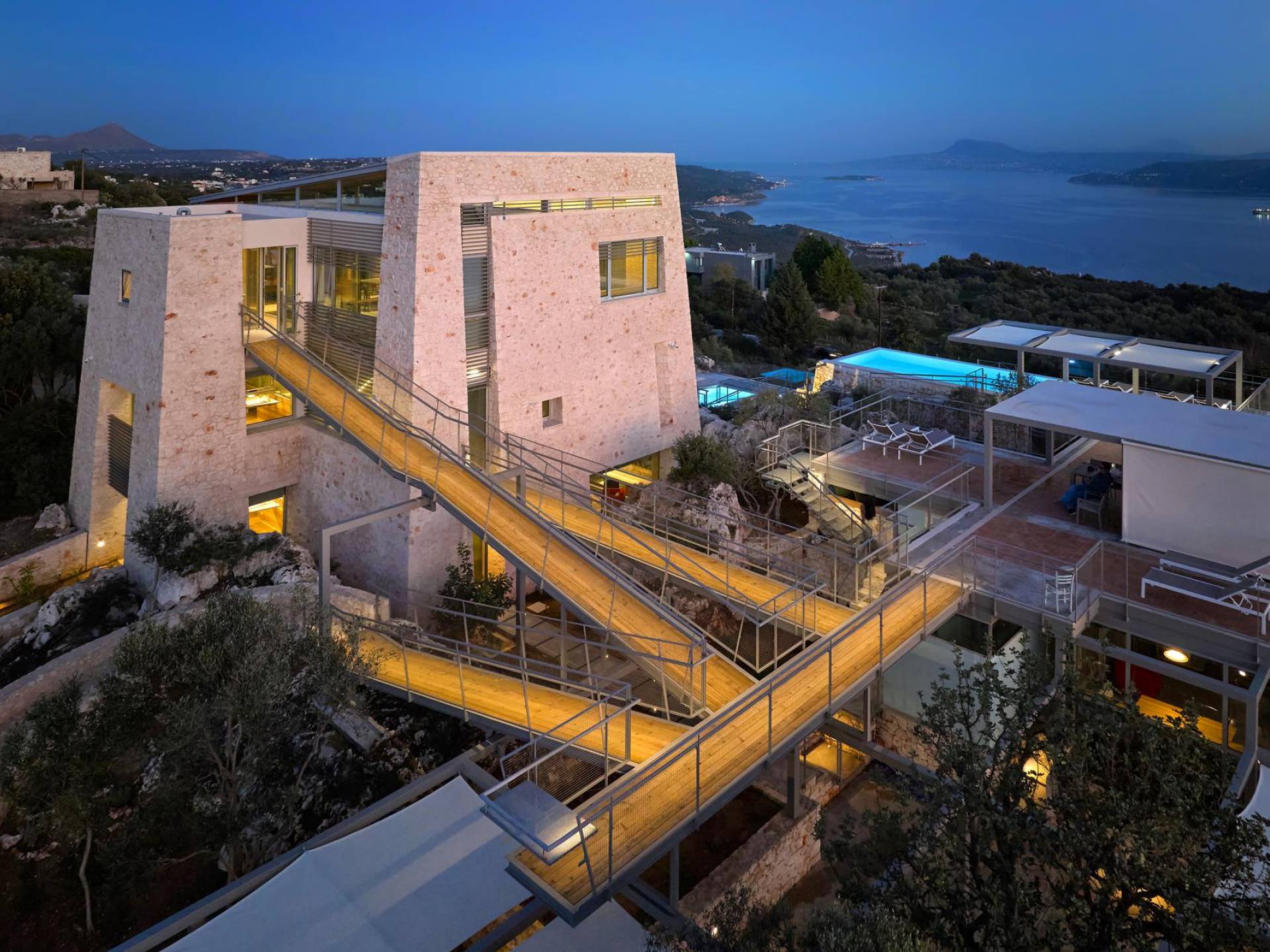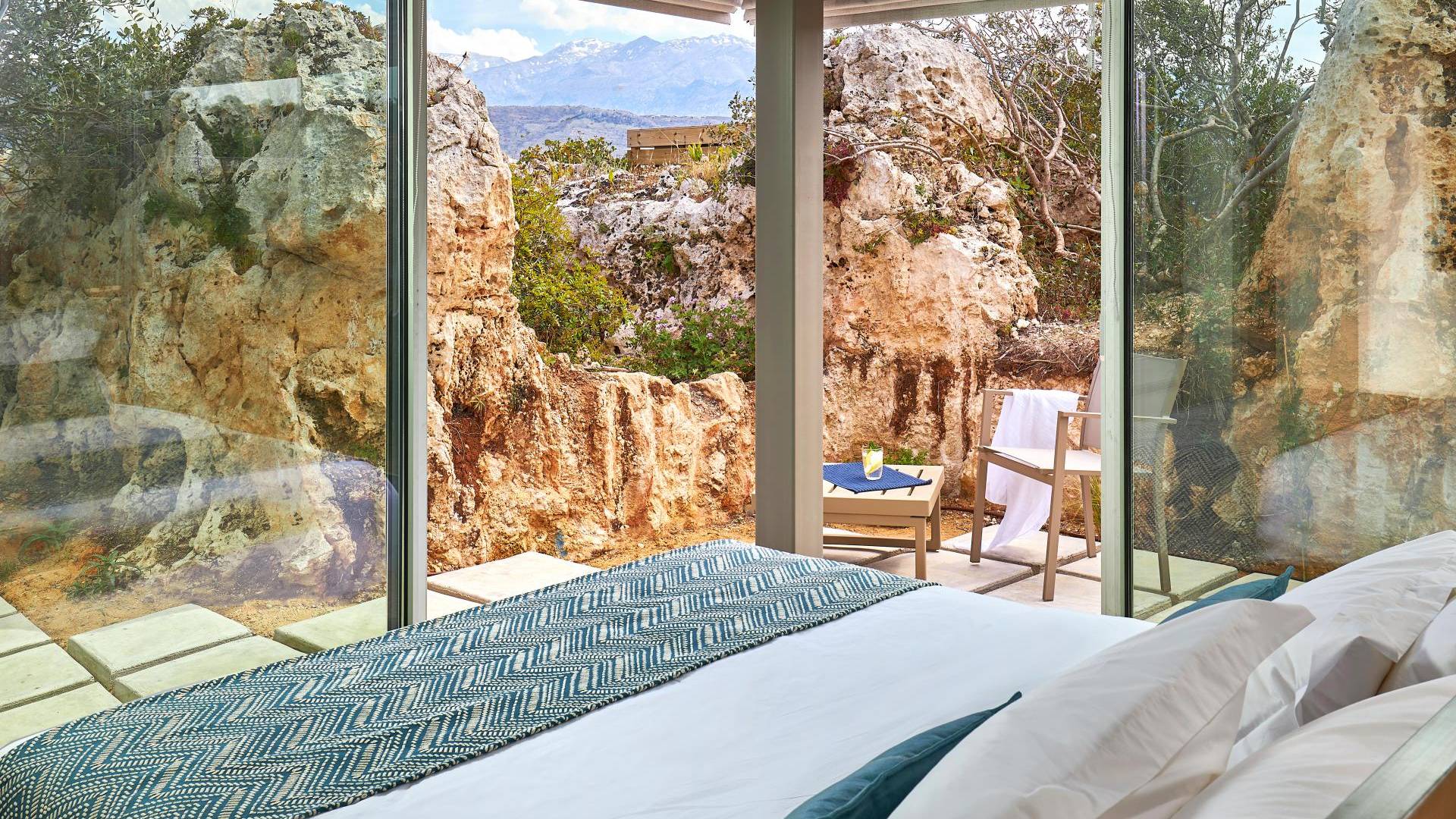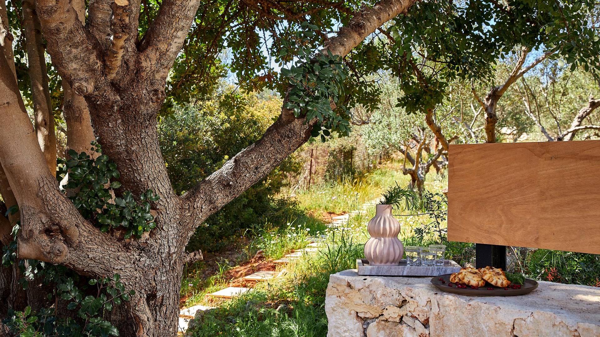 Benvenuti a Olives and Thyme Retreat, uno spazio unico totalmente privato a cui si accede solo da una strada, senza che nessuno si affaccia su di esso. Arroccato sul bordo di una scogliera che domina la baia di Souda e attraverso le maestose Montagne Bianche e sopra la strada da Souda ad Akrotiri, Olives and Thyme offre la sua posizione unica. Il suo mix di pietra, legno, vetro e metallo crea uno stile newyorkese-svedese seduto in un uliveto cretese. Il complesso è costituito dall'edificio principale a forma di torre ''The Keep'', con un cottage in pietra separato sulla sinistra.
